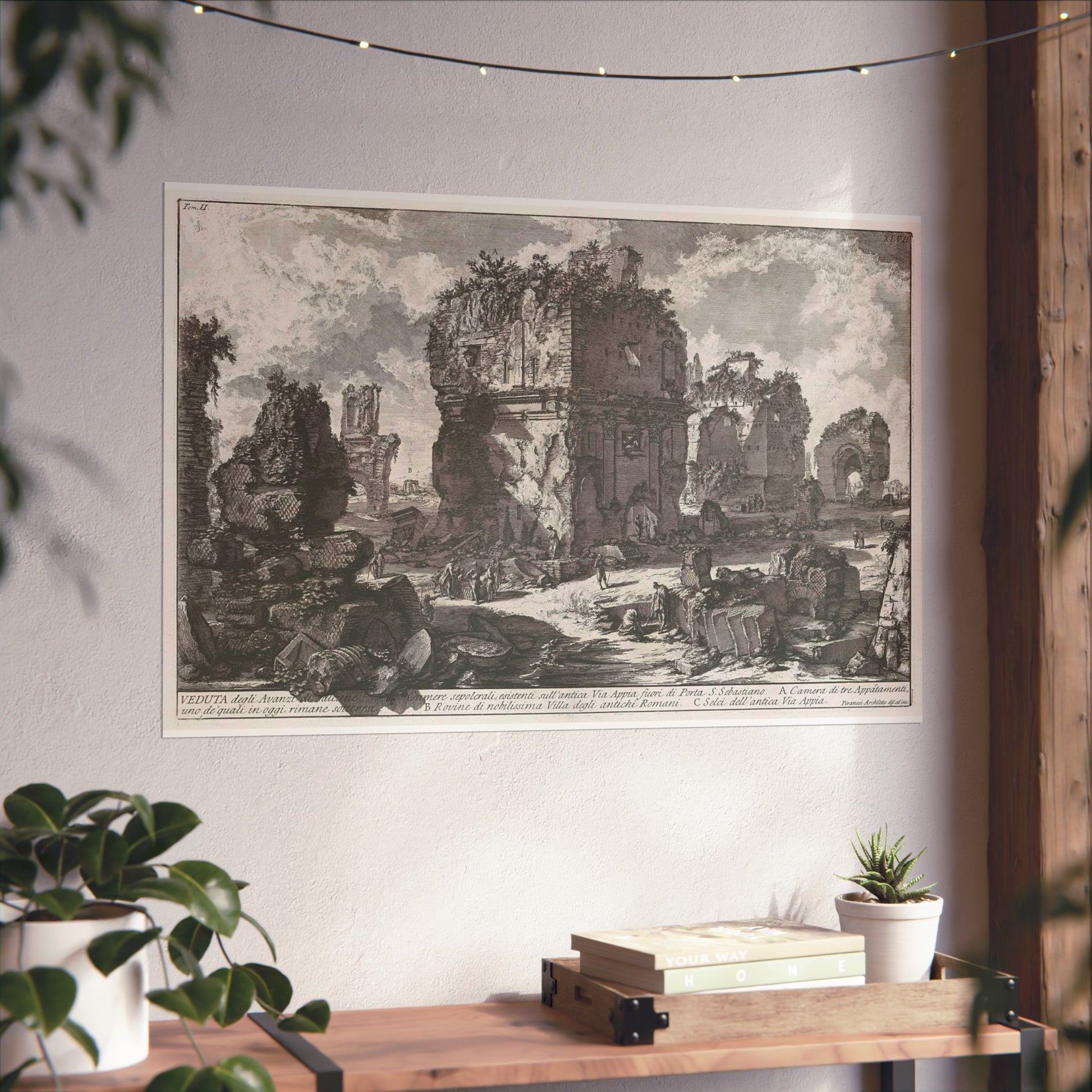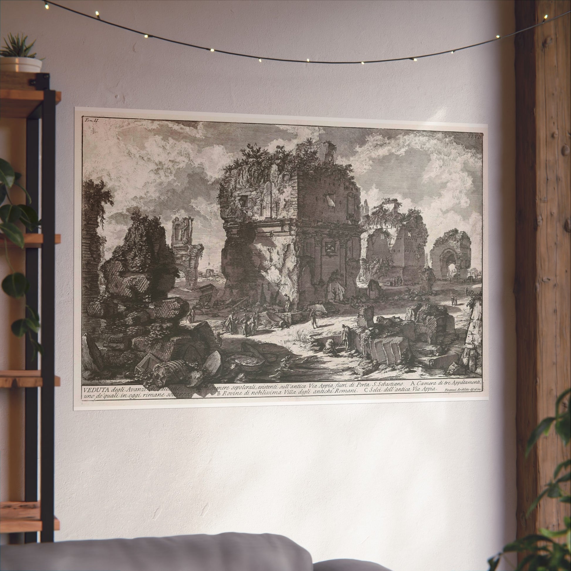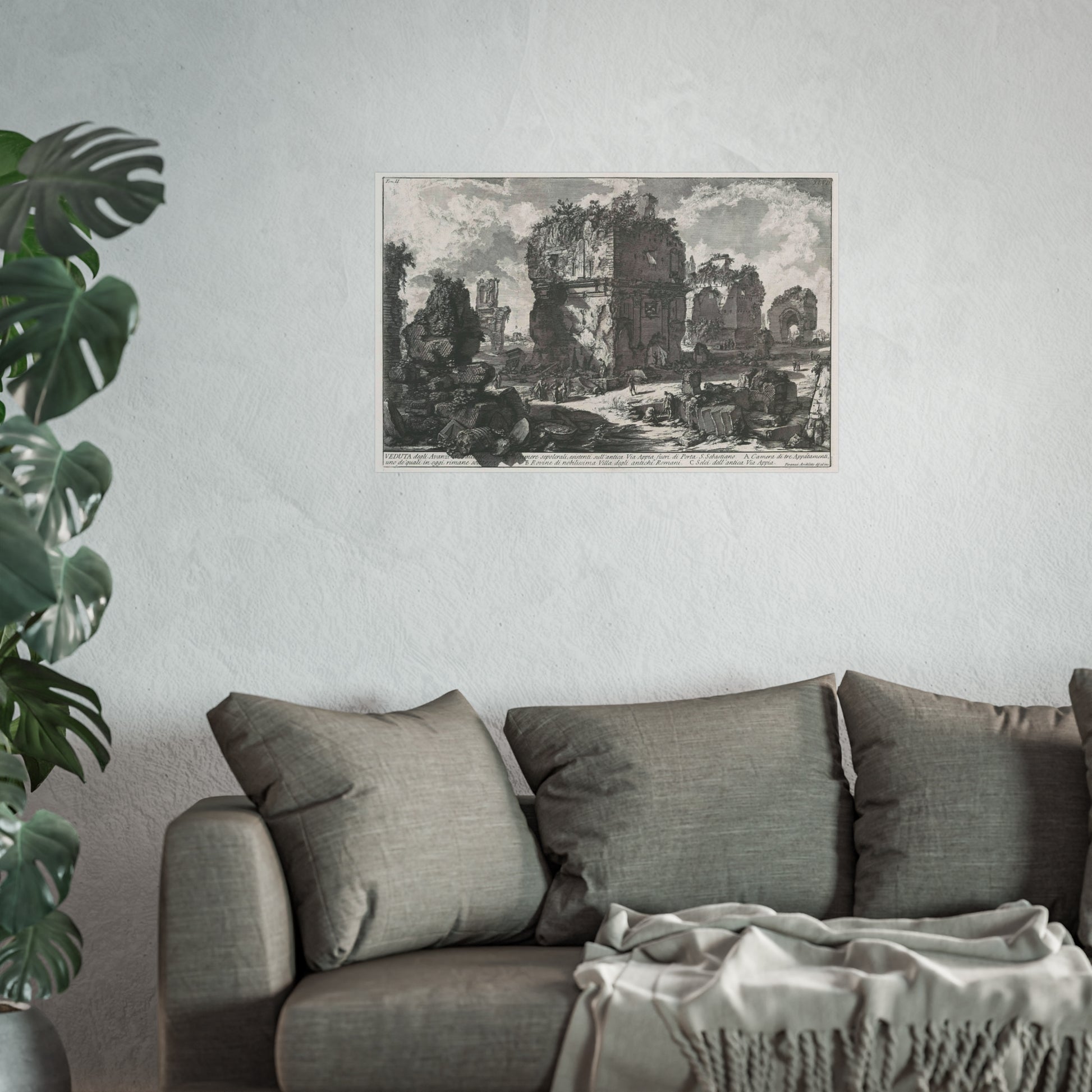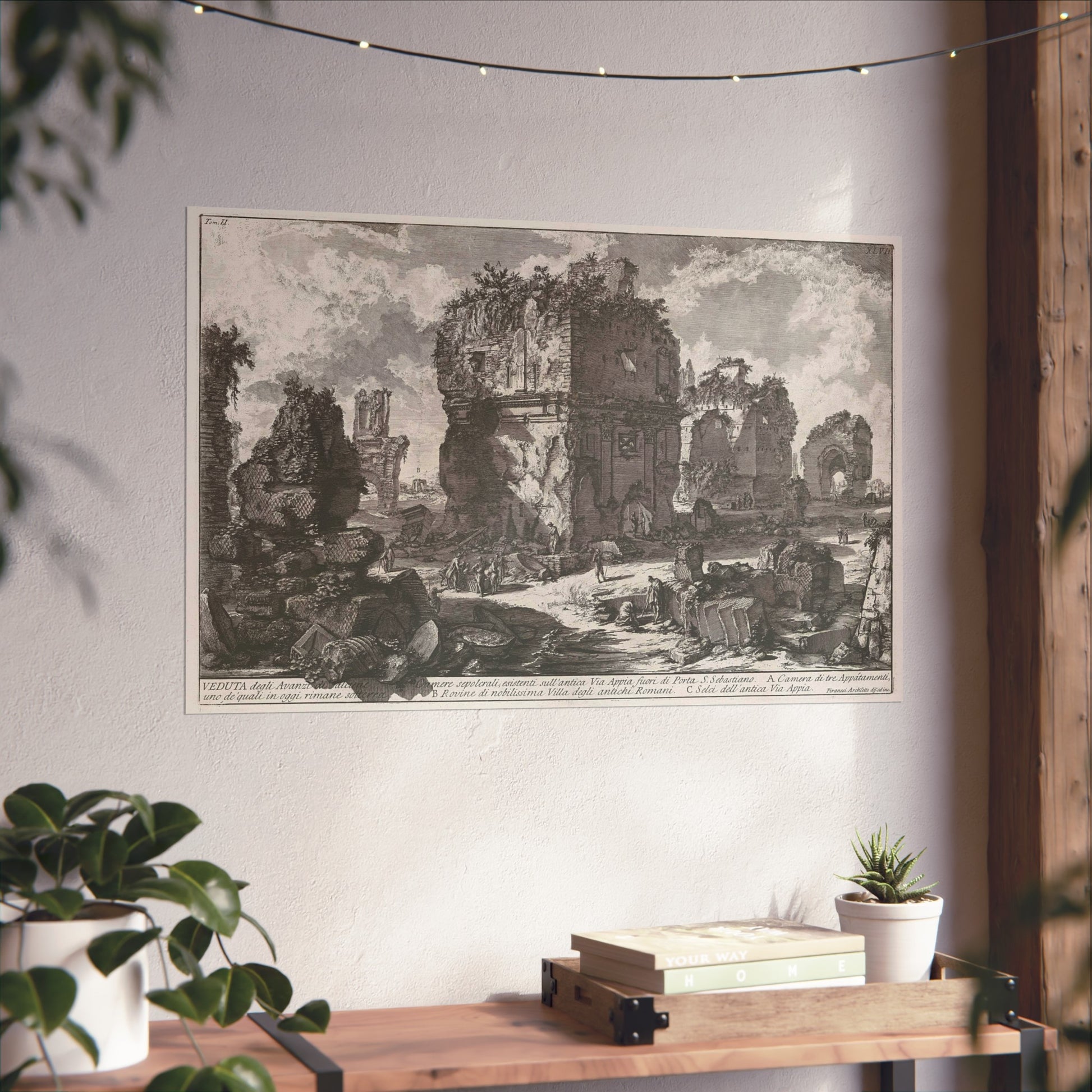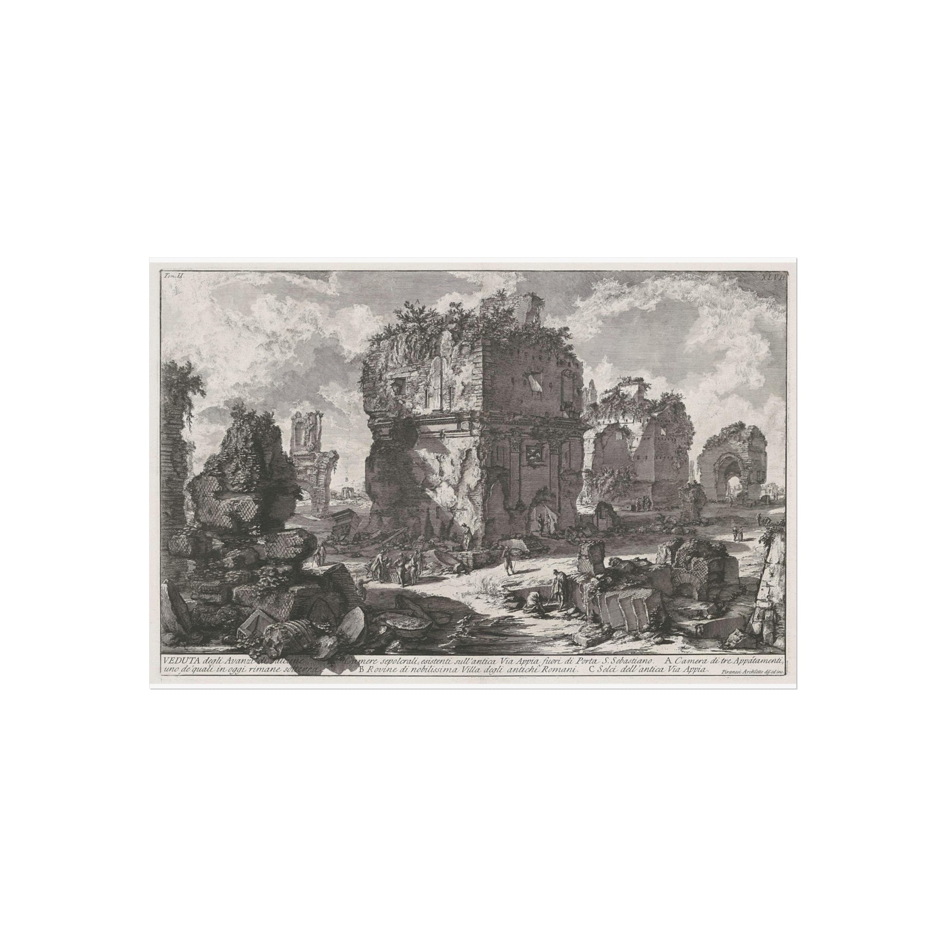 This captivating piece showcases the remnants of ancient tombs along the Via Appia Antica. The title and explanatory letters are subtly placed in the lower margin, while it is numbered at the top as Tom. II. / XLVII.