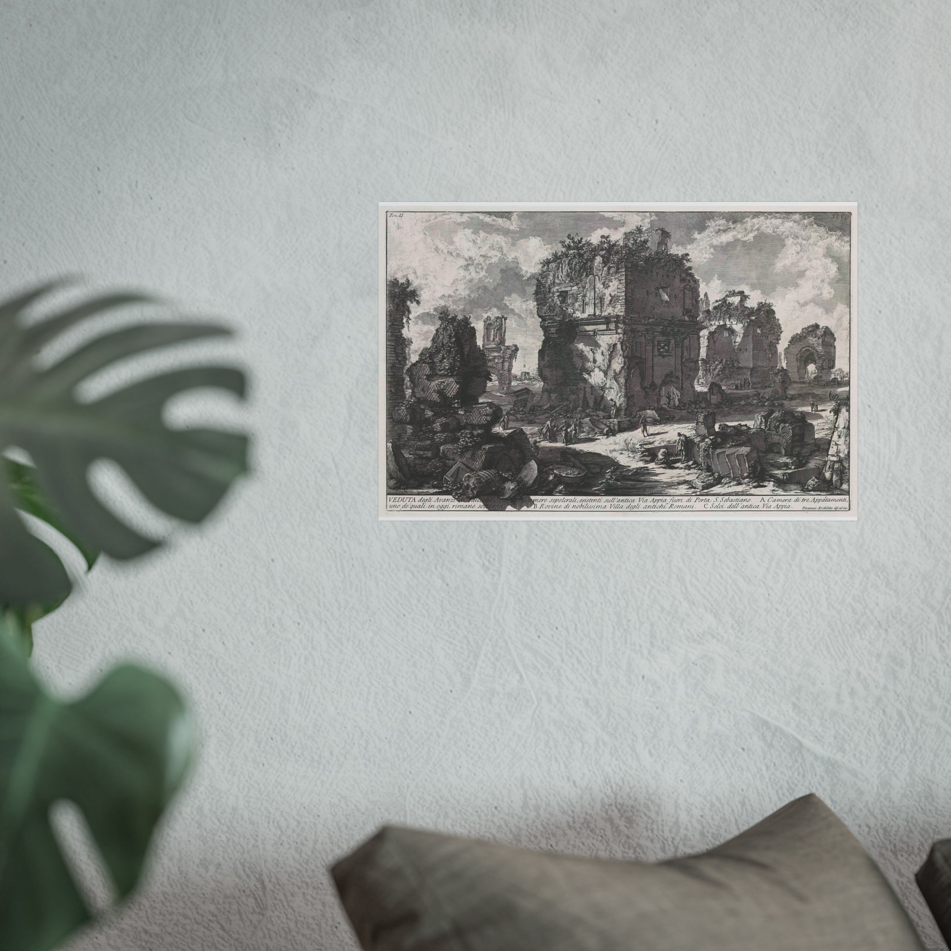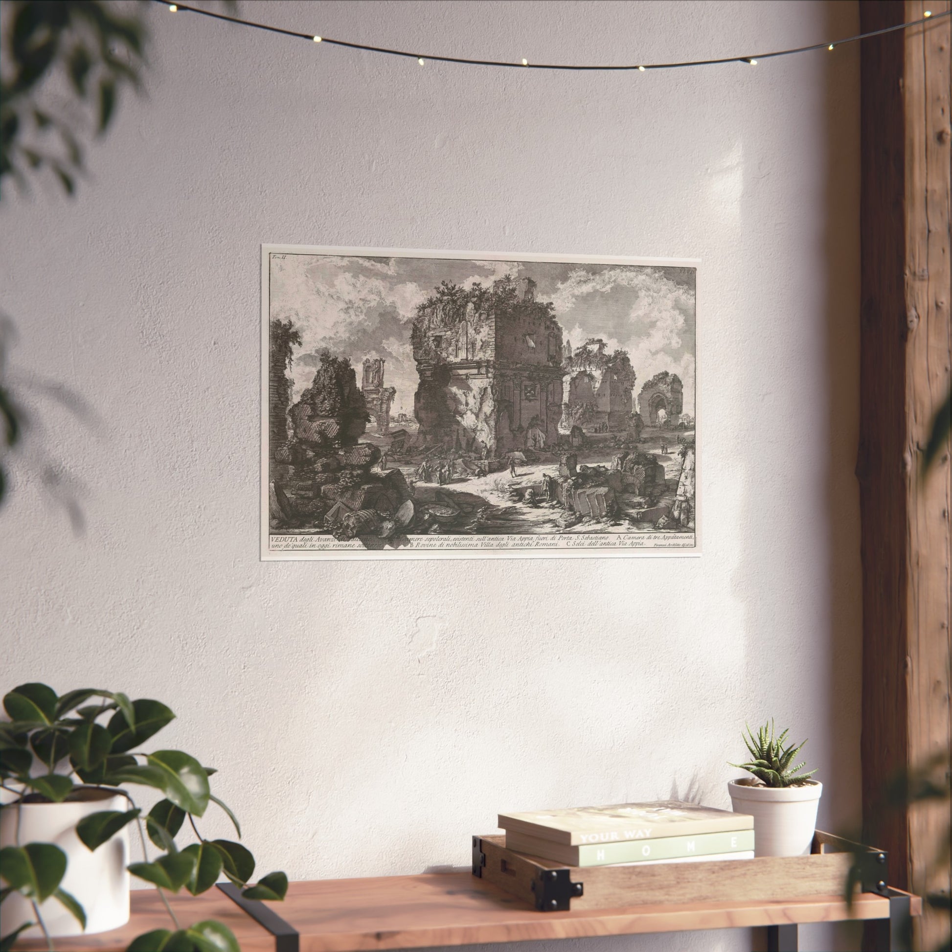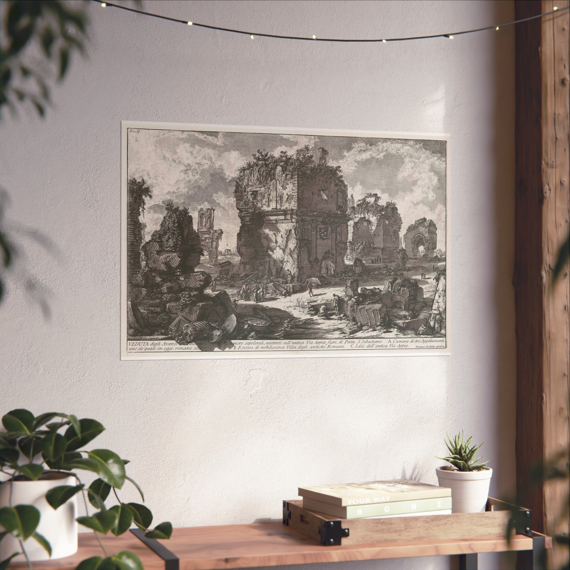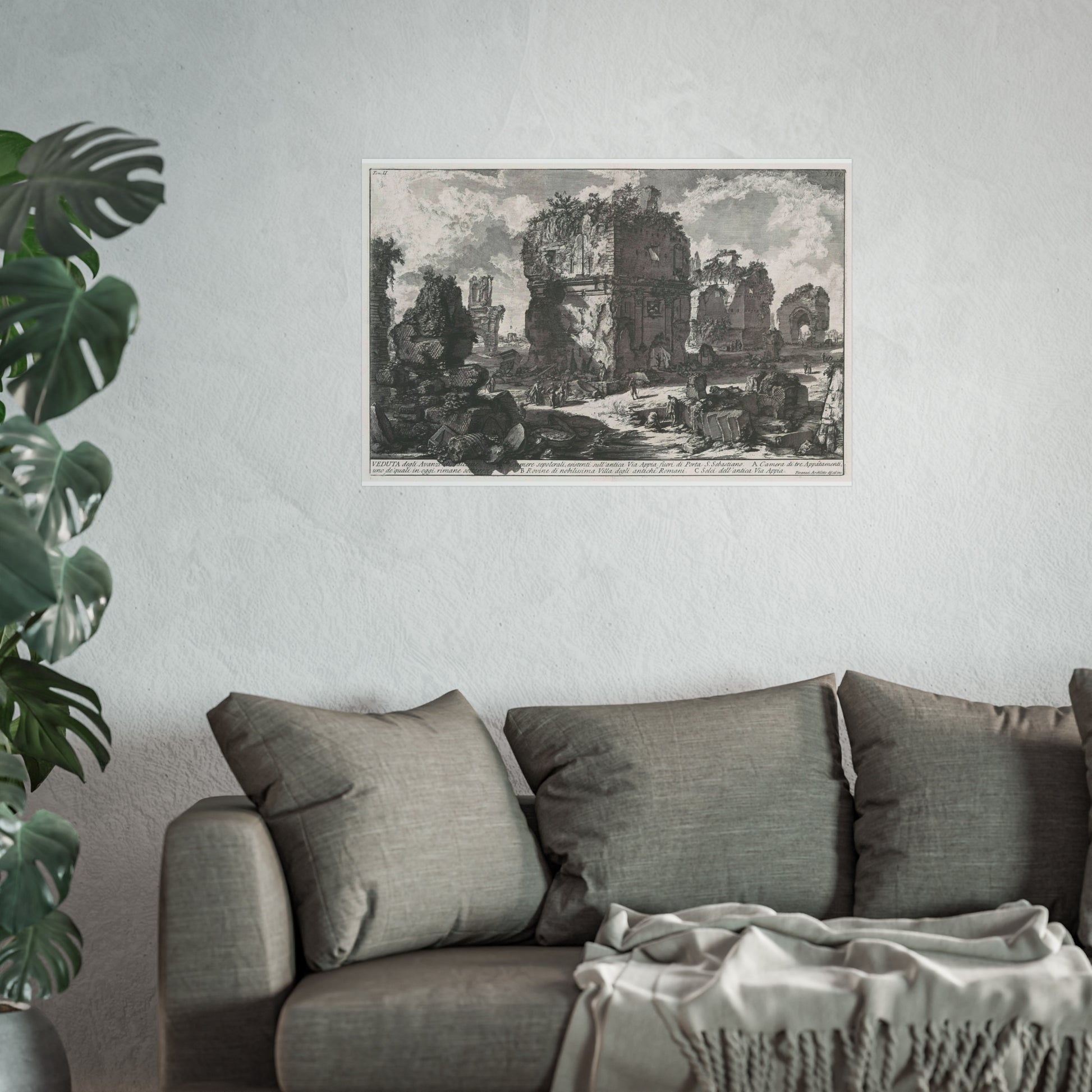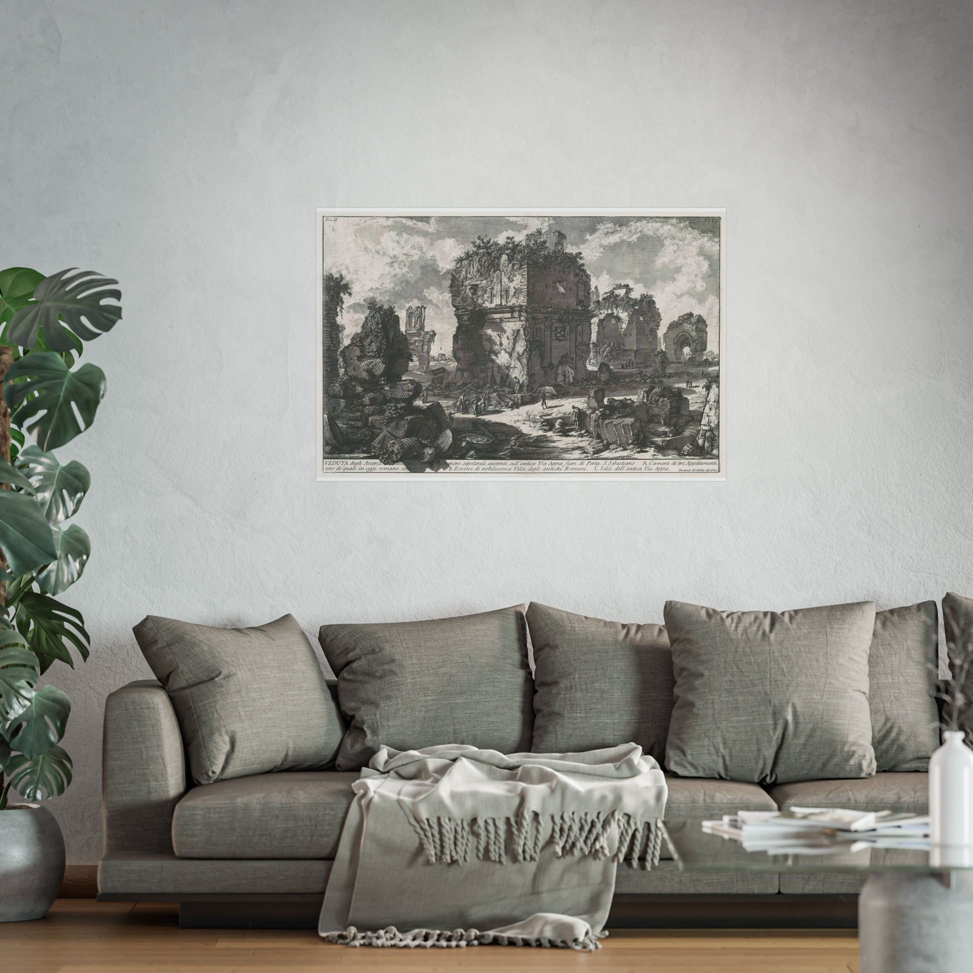 This captivating piece showcases the remnants of ancient tombs along the Via Appia Antica. The title and explanatory letters are subtly placed in the lower margin, while it is numbered at the top as Tom. II. / XLVII.
