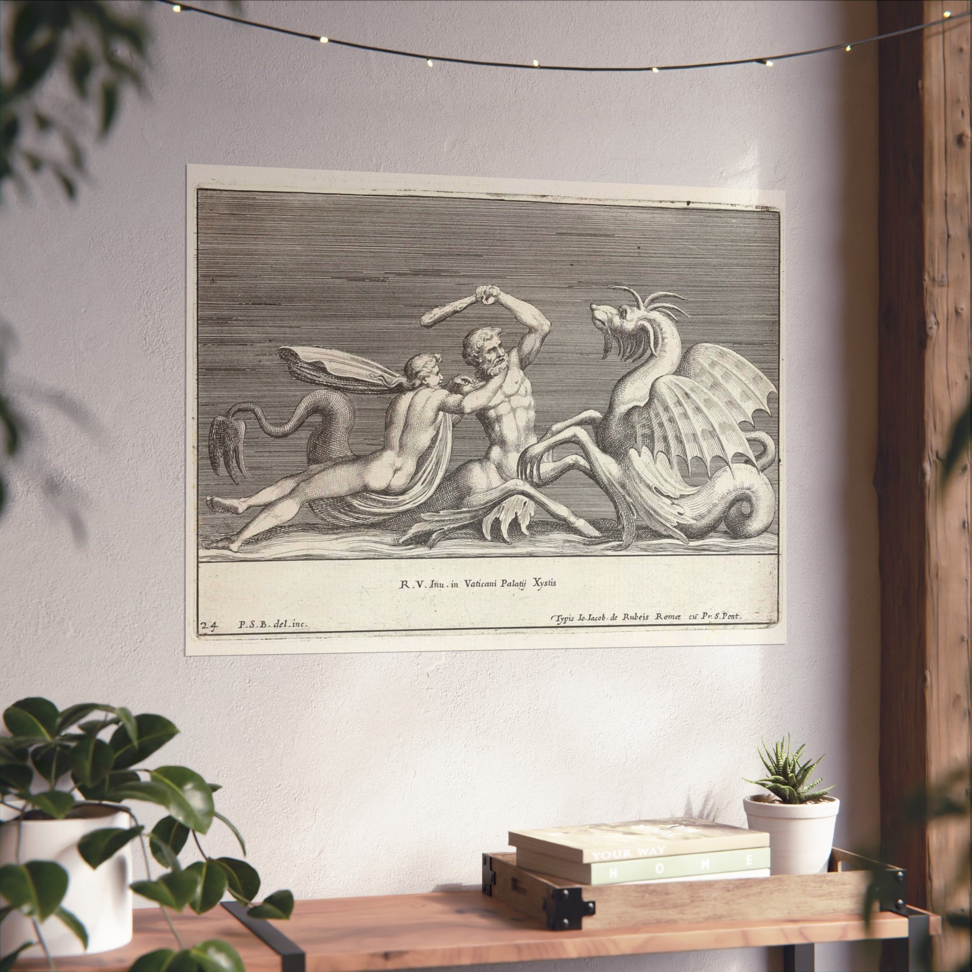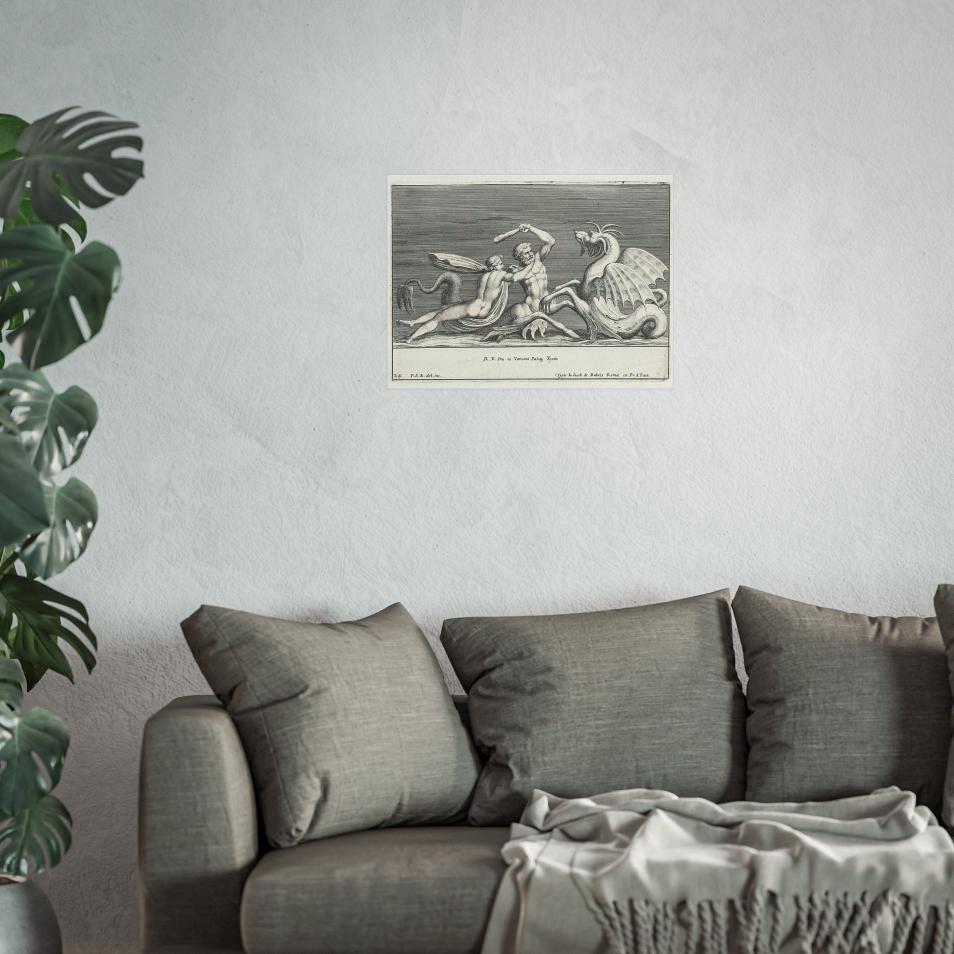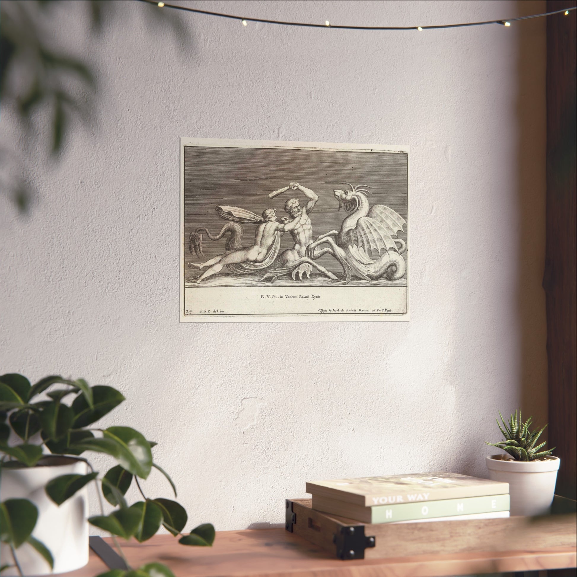 This captivating artwork showcases the mythical Triton, with a bare female figure gracefully perched on his back, in a fierce battle with a sea monster. The intensity of the fight is palpably depicted, immersing the viewer in this epic struggle between beings of ancient lore.