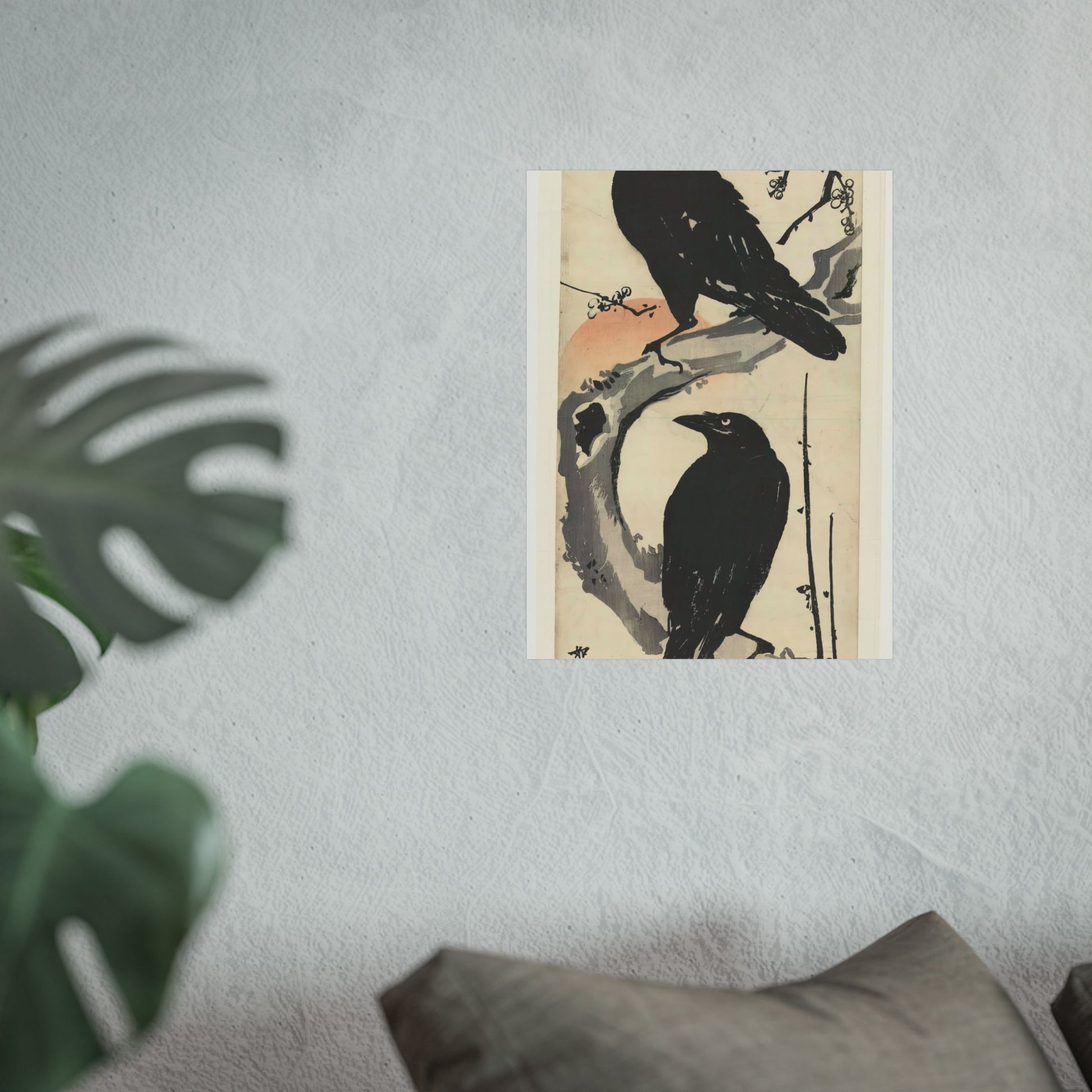 Title: Two Crows on a Plum Tree Branch at Sunset