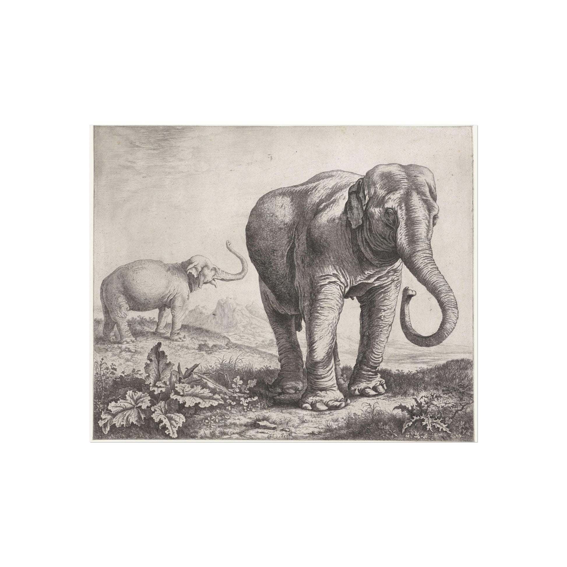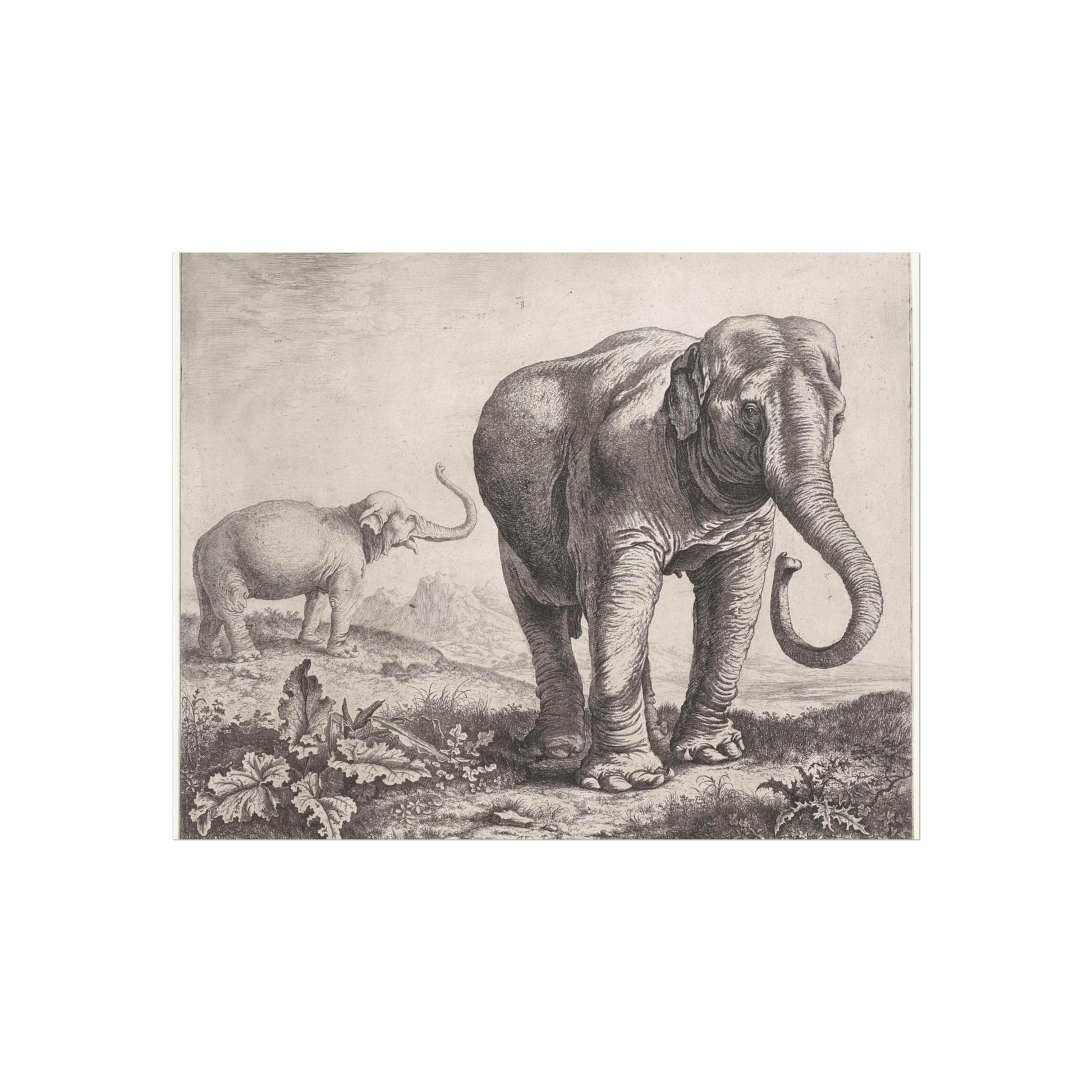 Behold a breathtaking landscape, where two majestic elephants command the foreground. In the distance, the silhouette of towering mountains completes this awe-inspiring scene.