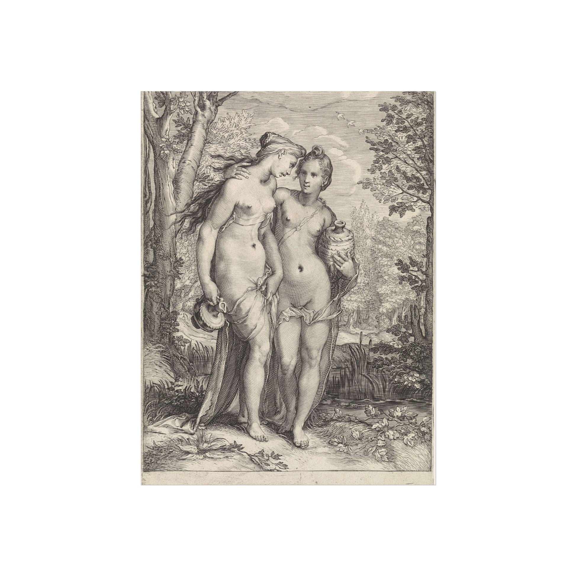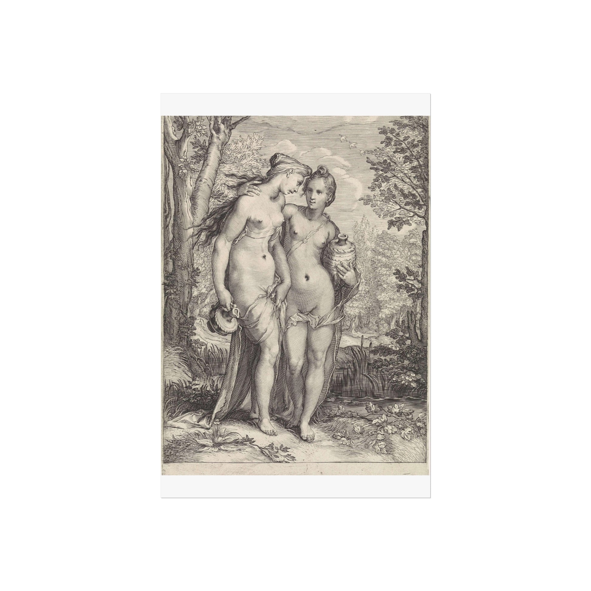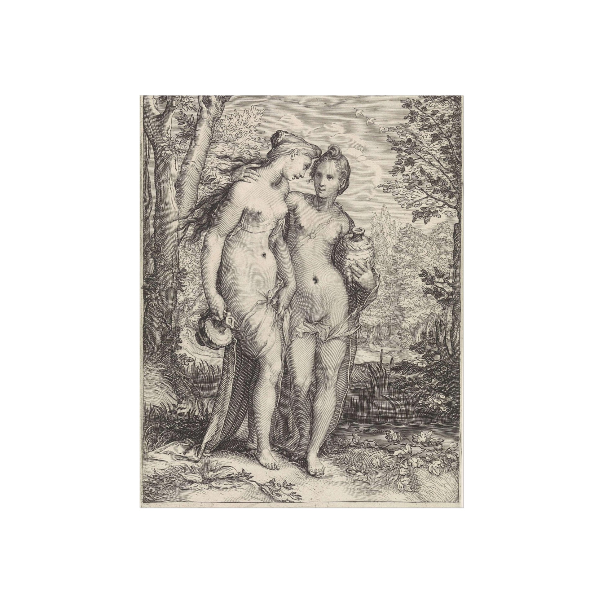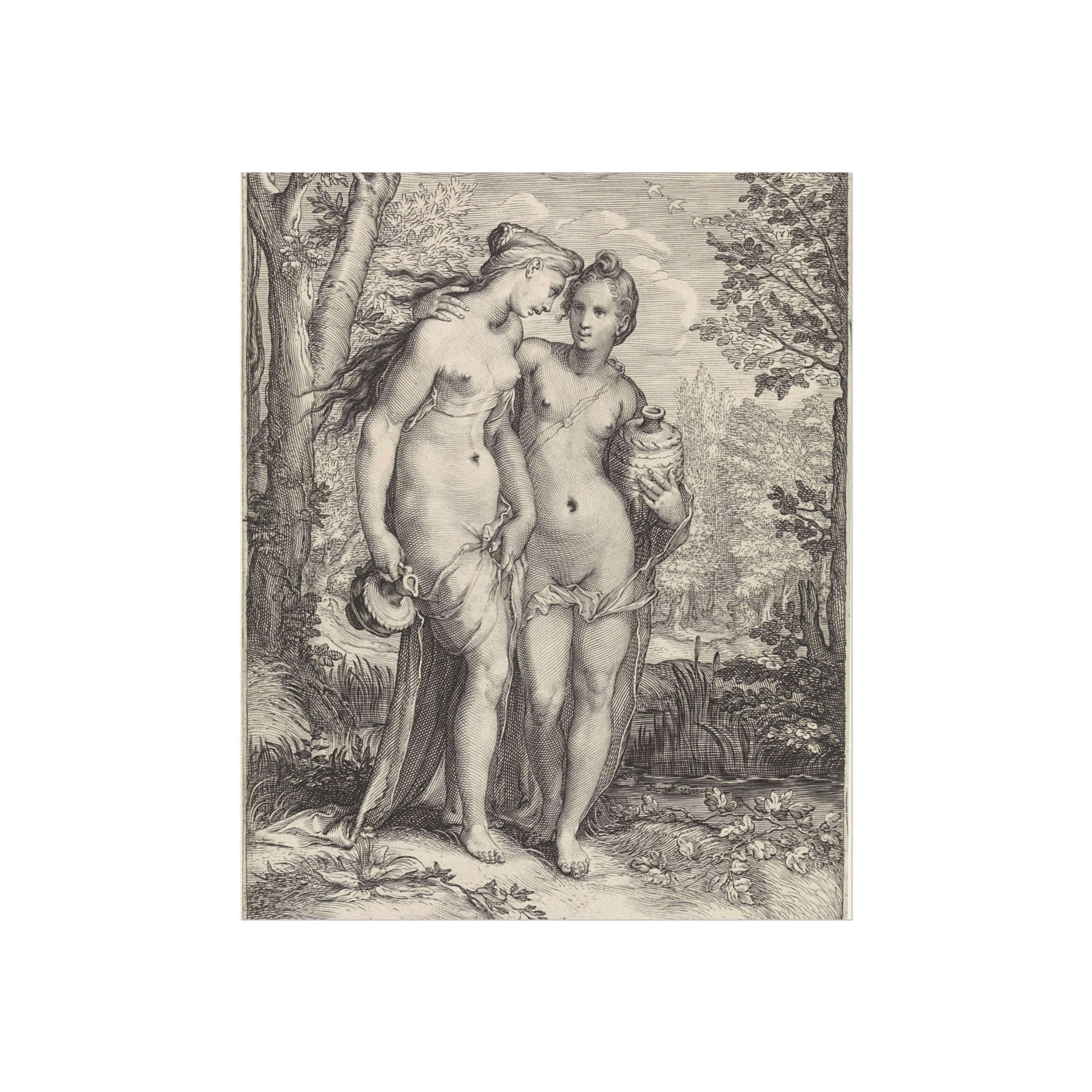 This captivating piece showcases two nymphs from Diana's entourage, intimately embracing each other while holding water jugs. The artwork is part of a fascinating triptych dedicated to Diana.