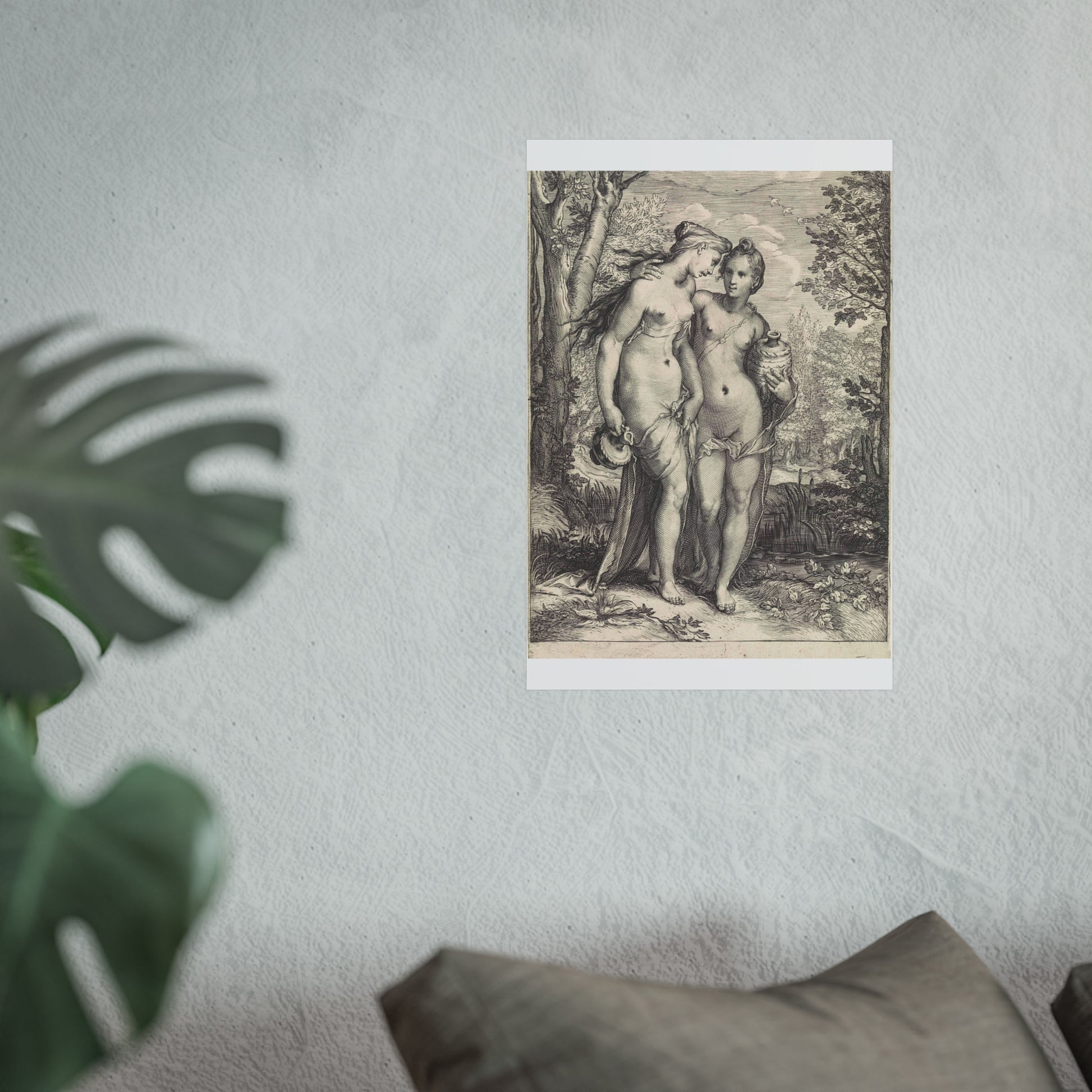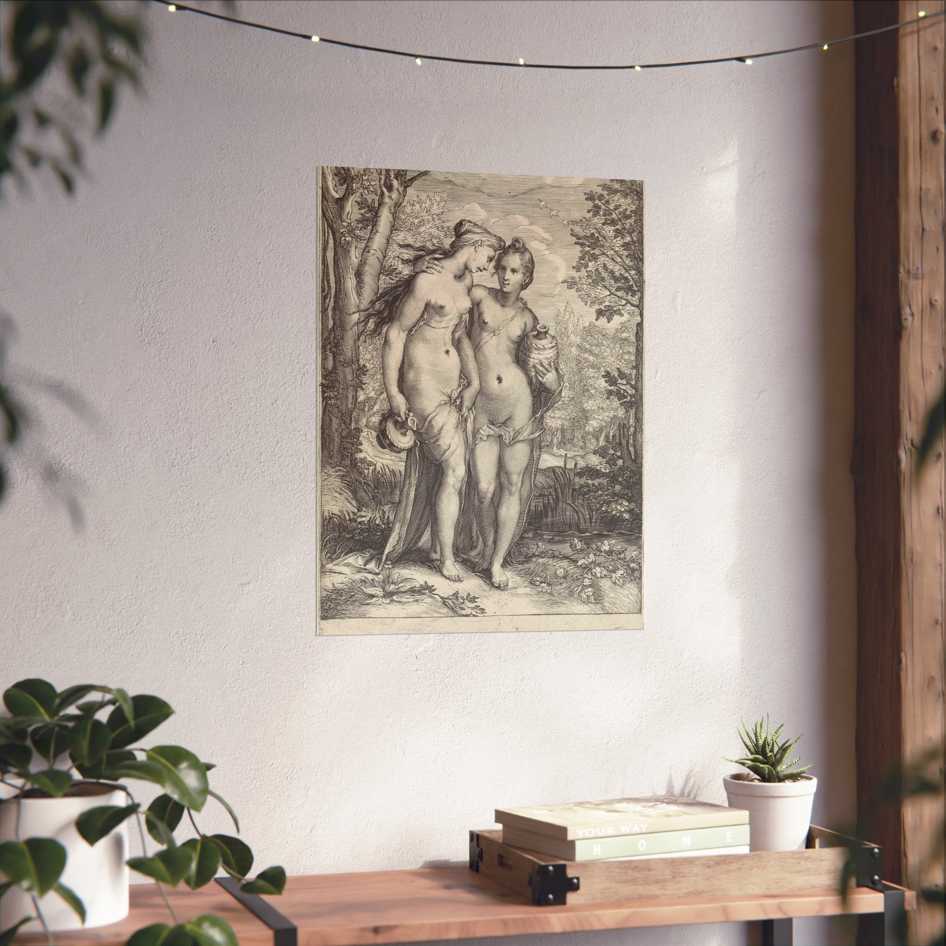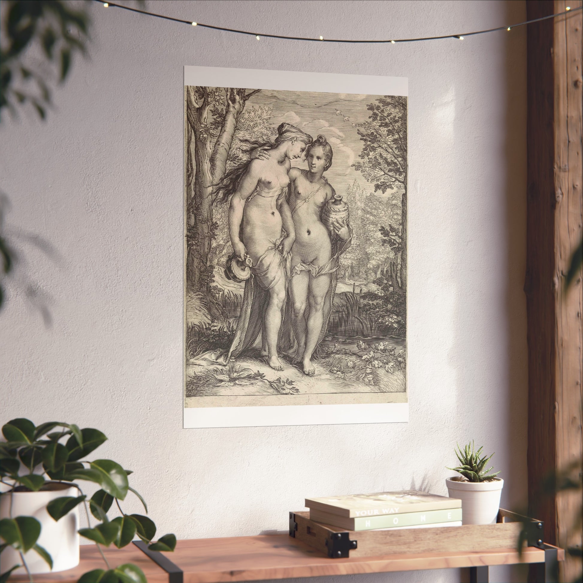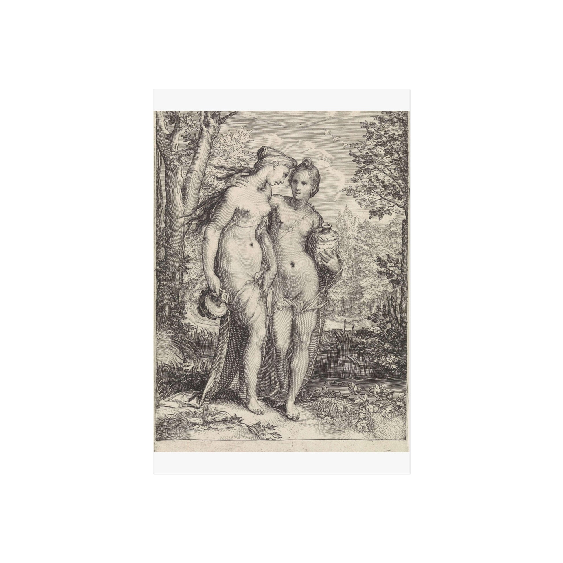 This captivating piece showcases two nymphs from Diana's entourage, intimately embracing each other while holding water jugs. The artwork is part of a fascinating triptych dedicated to Diana.