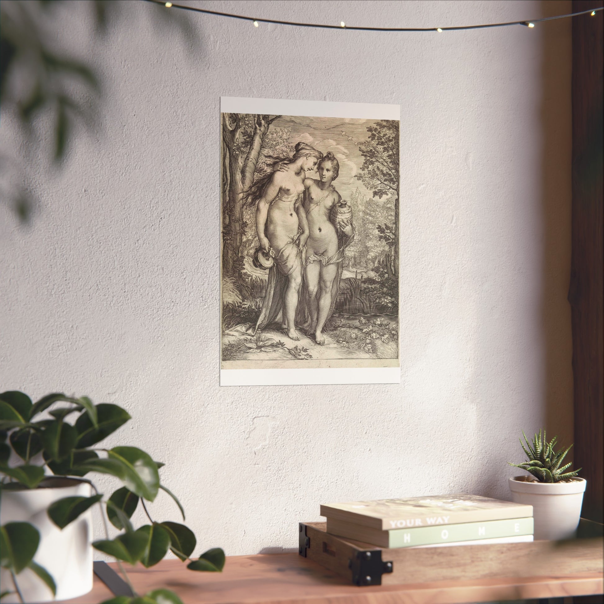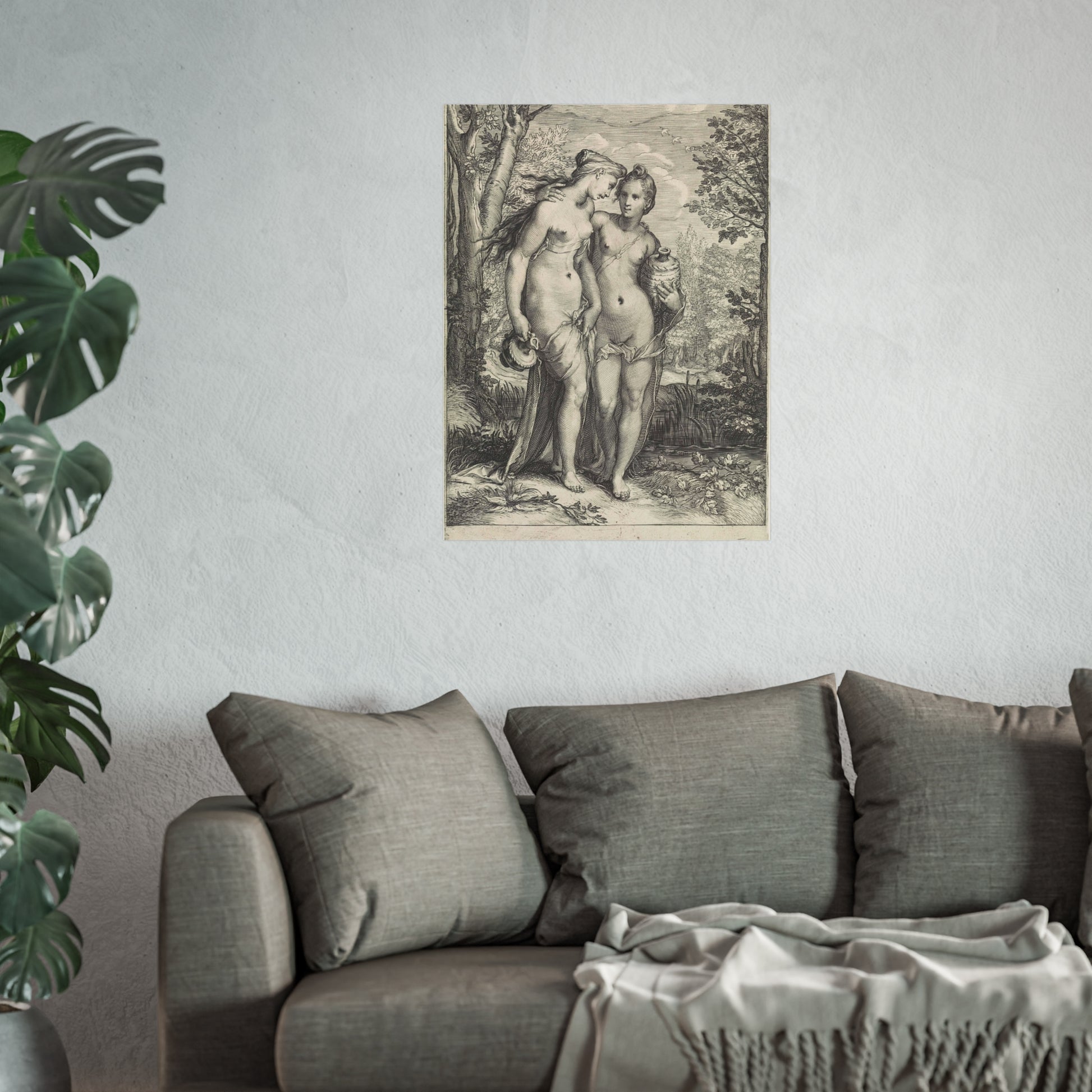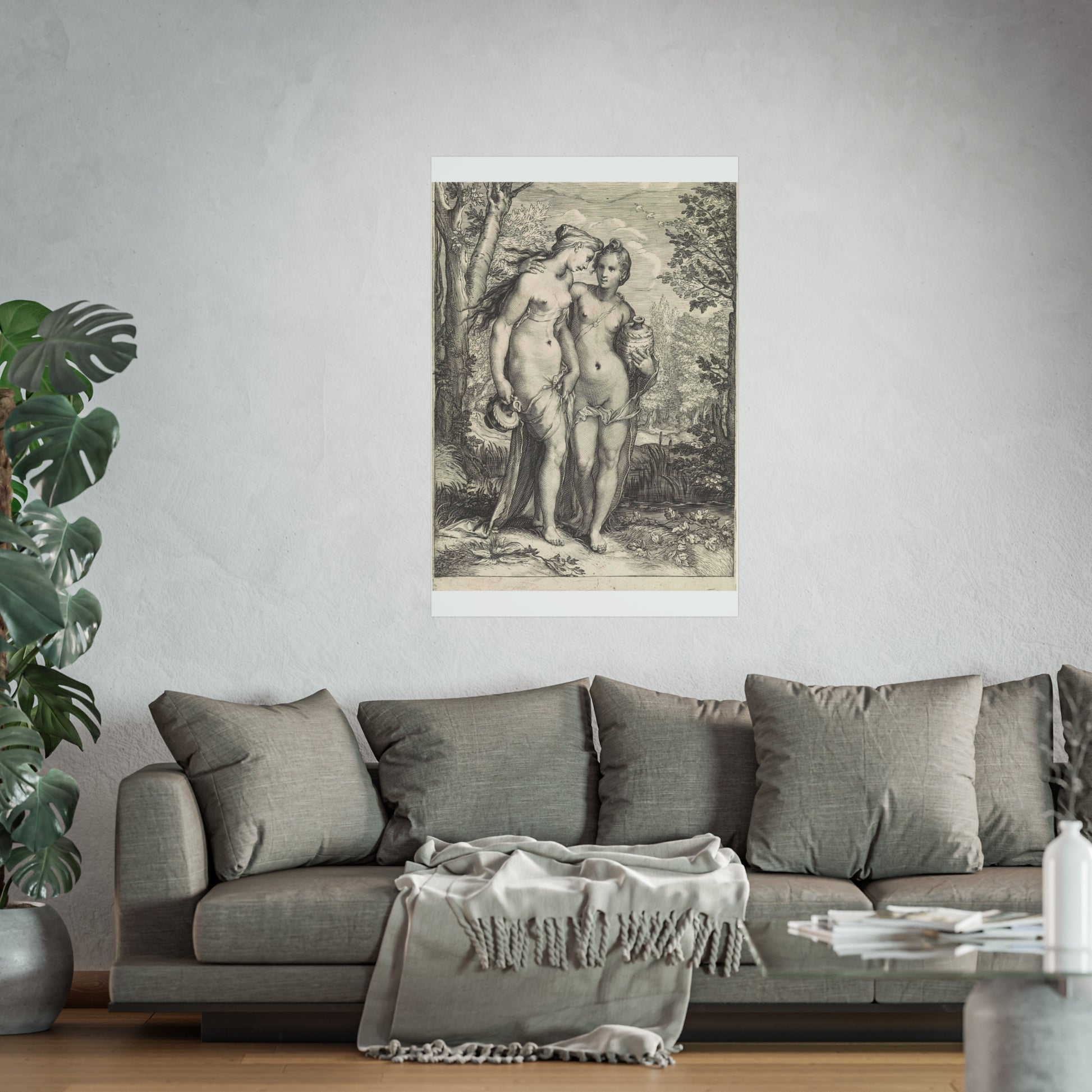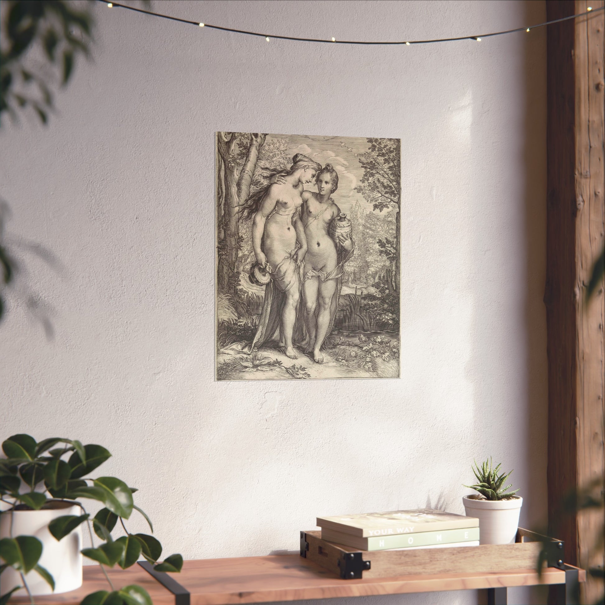 This captivating piece showcases two nymphs from Diana's entourage, intimately embracing each other while holding water jugs. The artwork is part of a fascinating triptych dedicated to Diana.