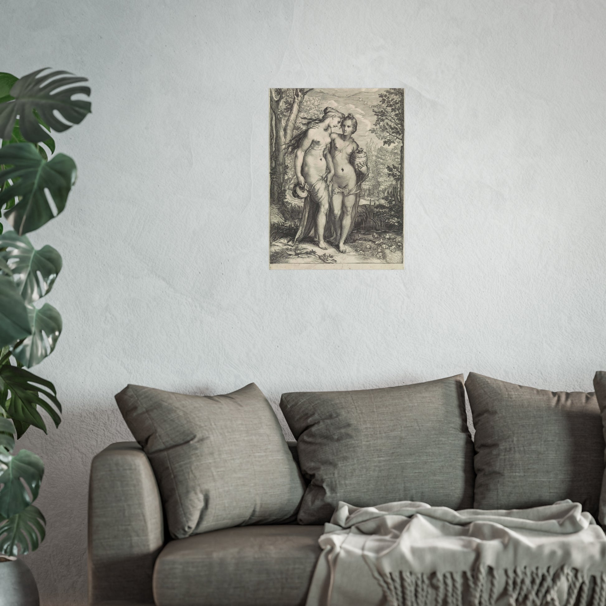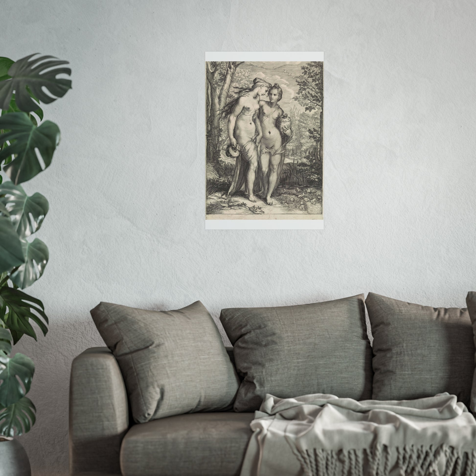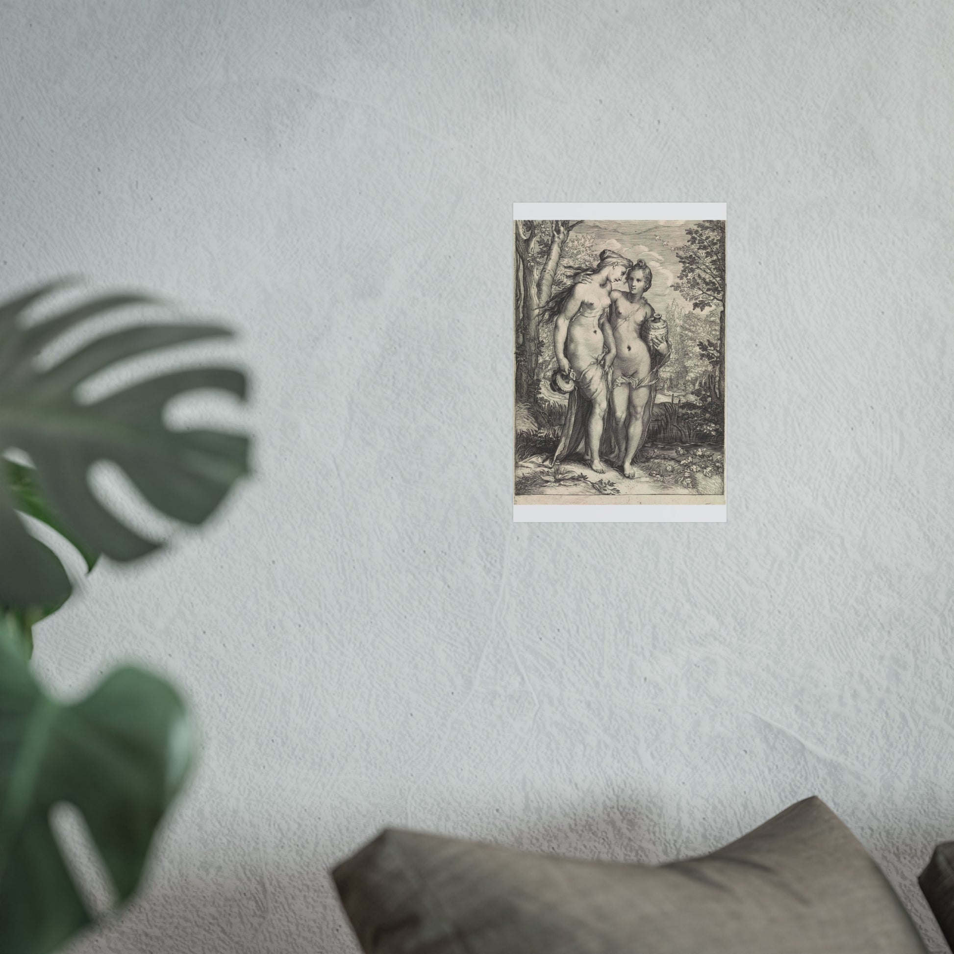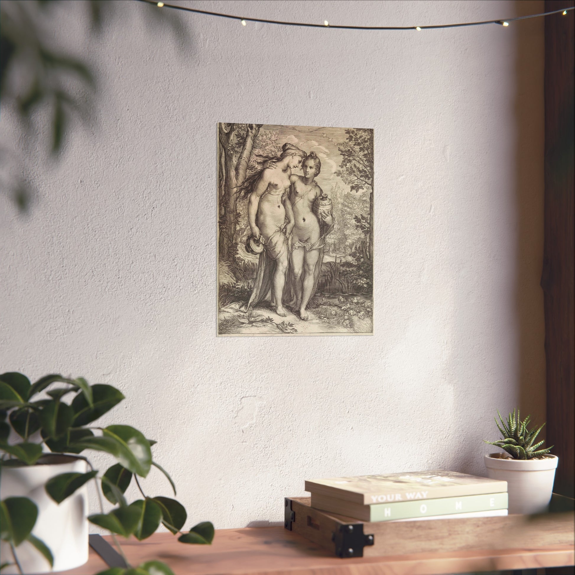 This captivating piece showcases two nymphs from Diana's entourage, intimately embracing each other while holding water jugs. The artwork is part of a fascinating triptych dedicated to Diana.