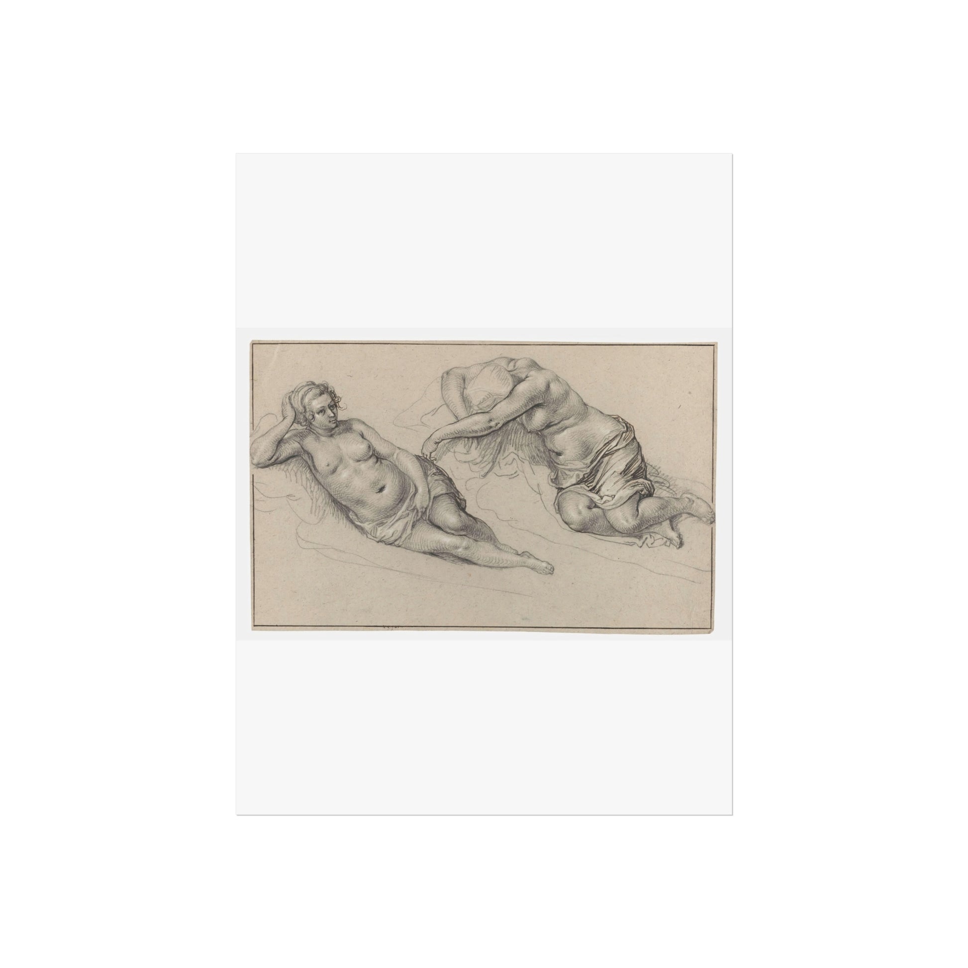 Two reclining nude women, each draped with a cloth over their legs. The woman on the left supports her head with her right hand, while the woman on the right rests her head on her crossed arms.