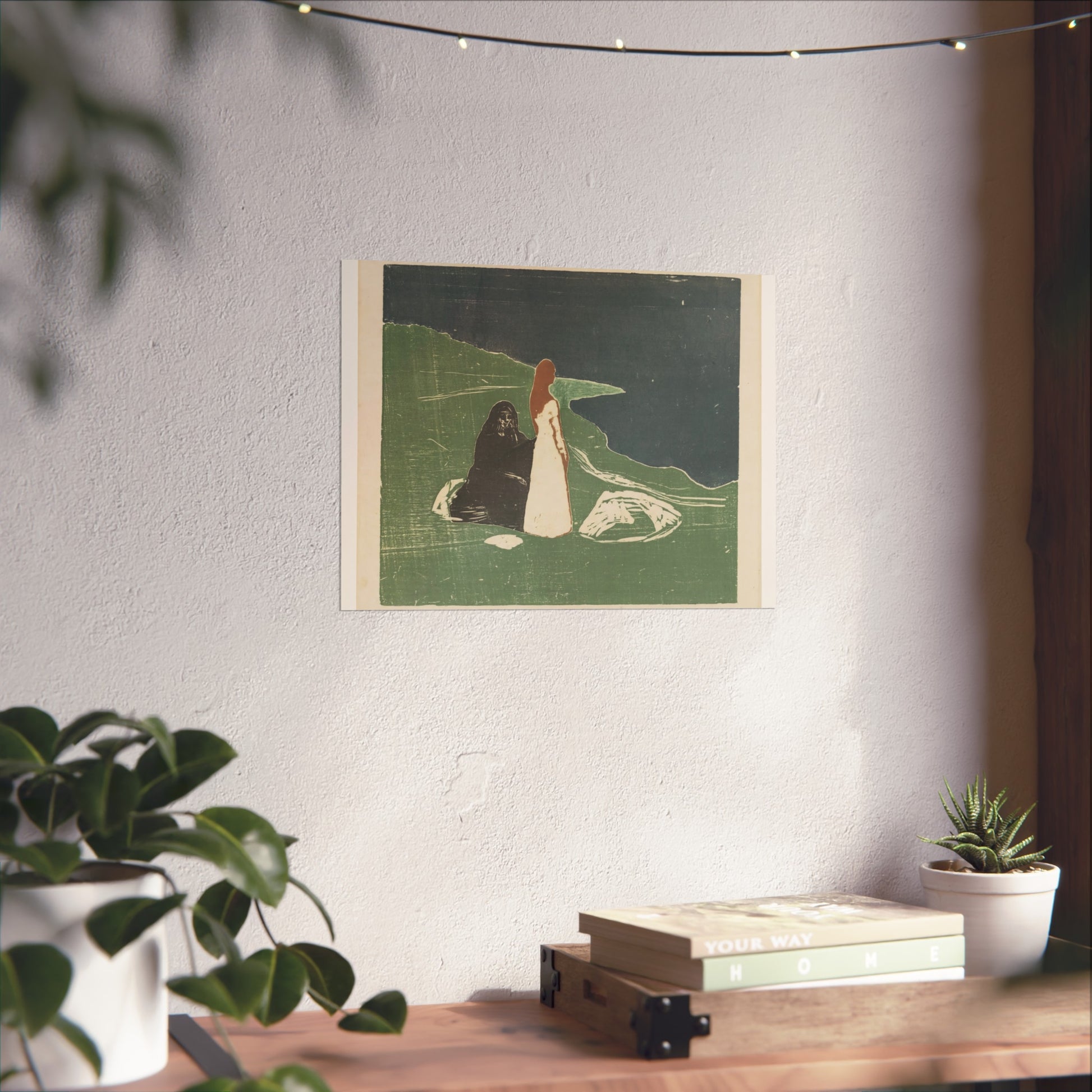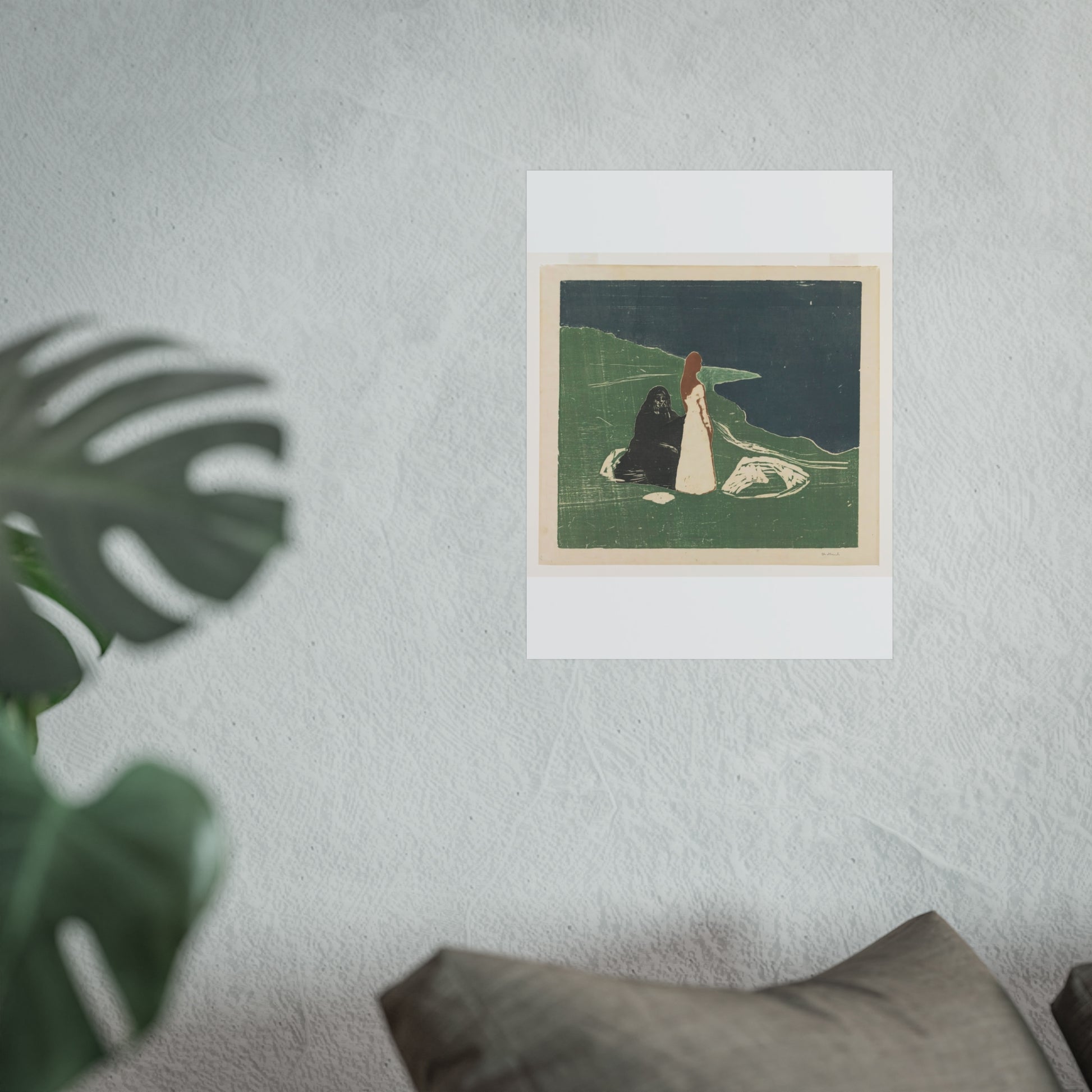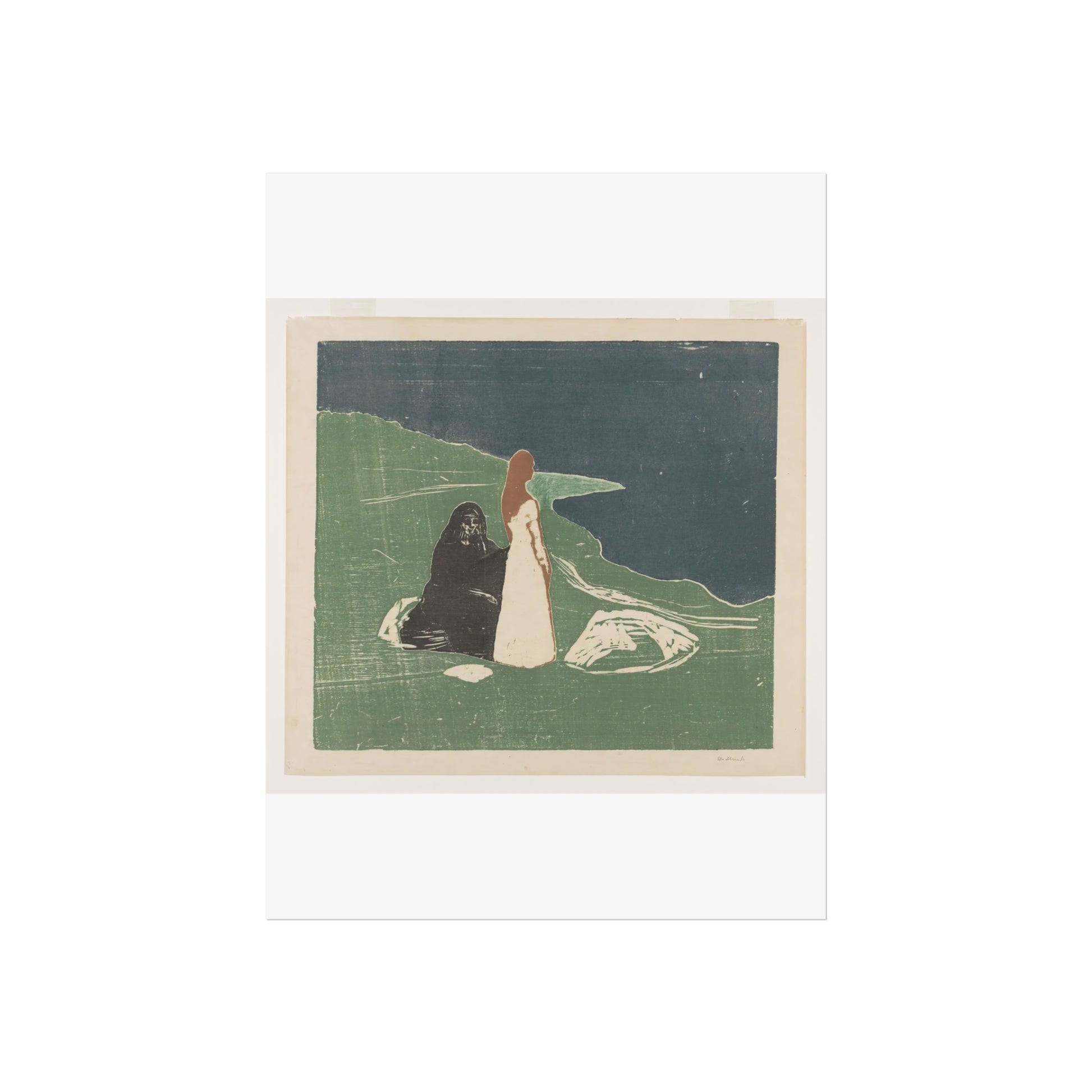 Experience the haunting beauty of Edvard Munch's 'Two Women on the Shore.' This evocative painting captures two women standing by the water, their faces reflecting a mix of contemplation and melancholy. The use of dark, brooding colors and expressive brushstrokes creates a powerful sense of emotion and atmosphere. As you gaze upon this masterpiece, you'll be drawn into the mysterious and poignant world that Munch so masterfully depicts.