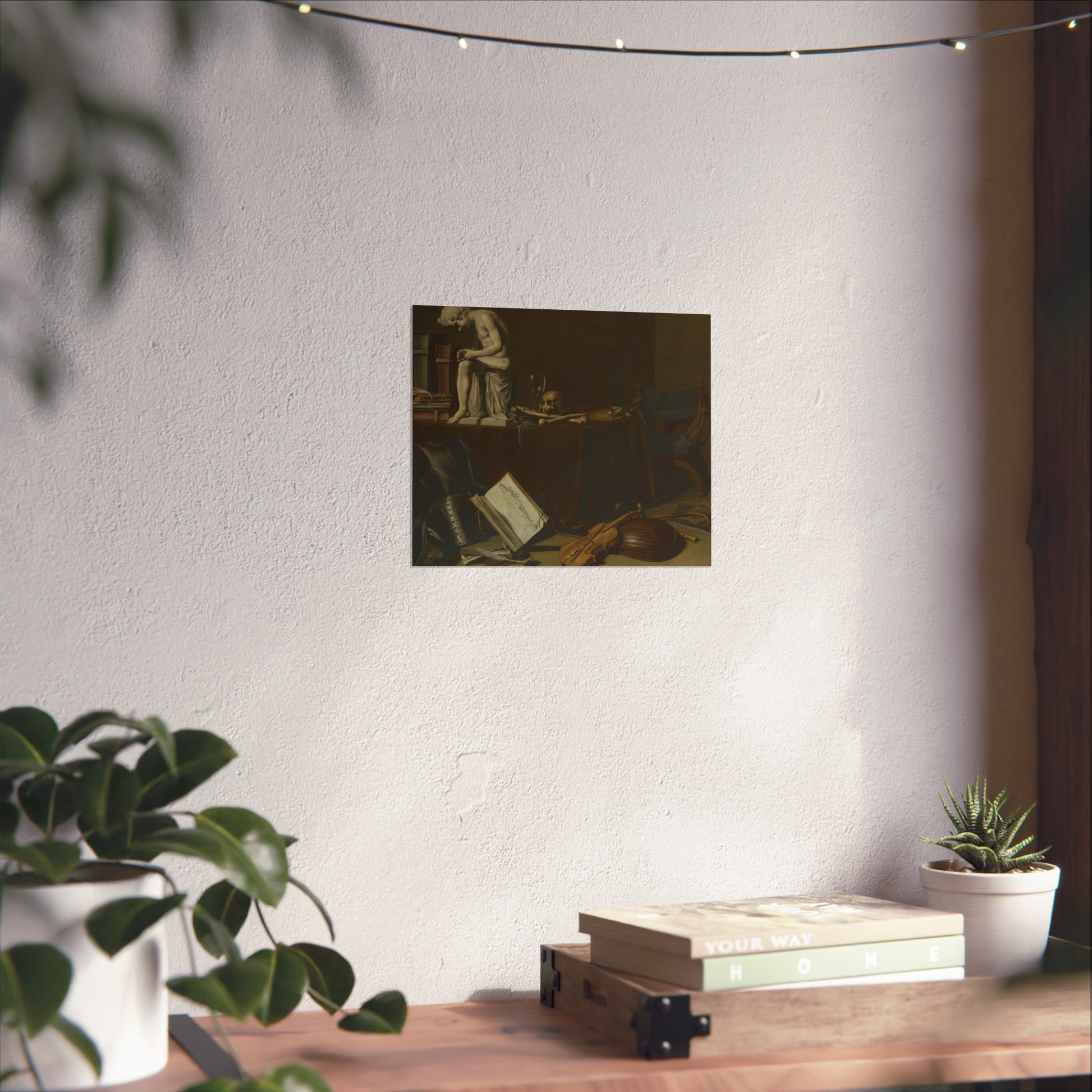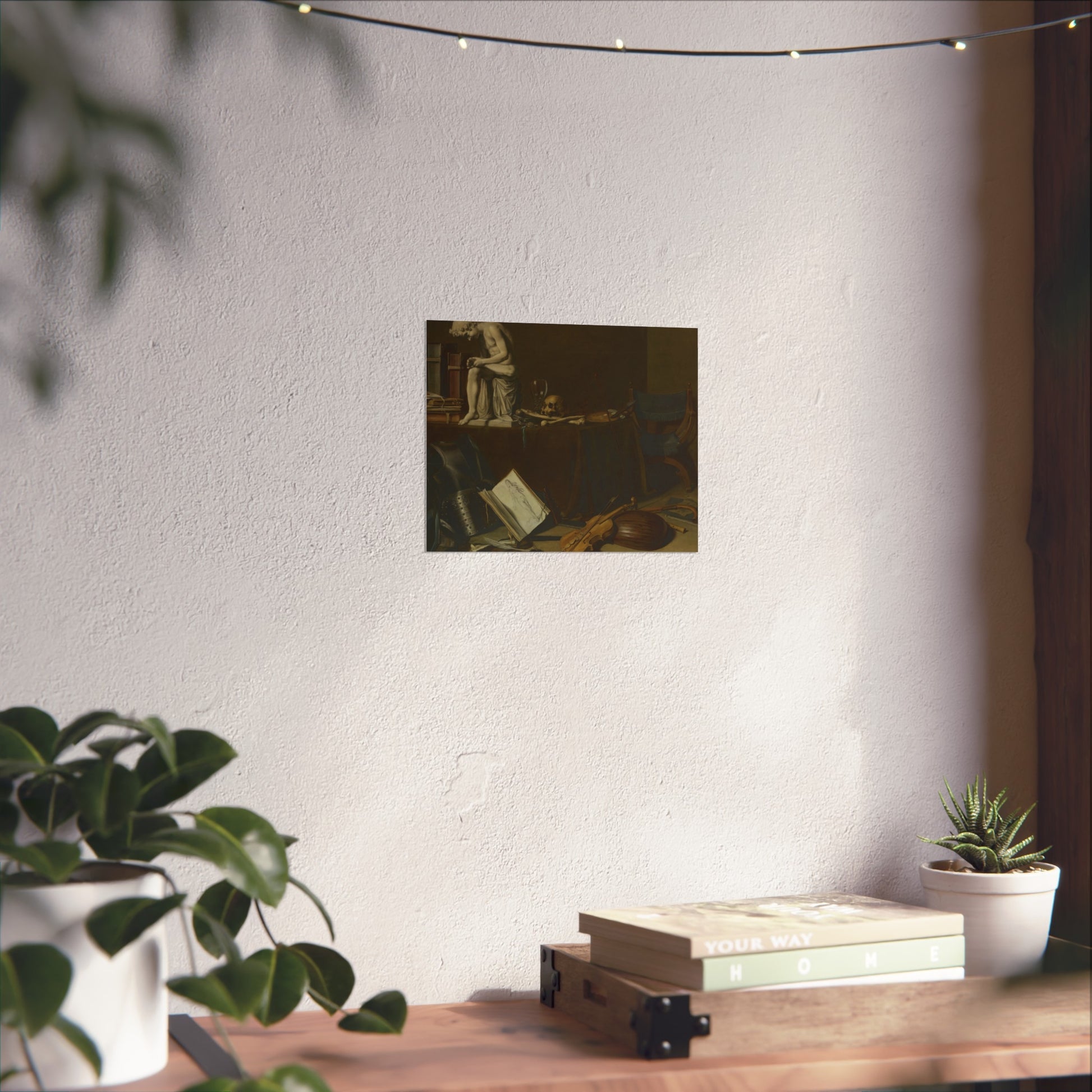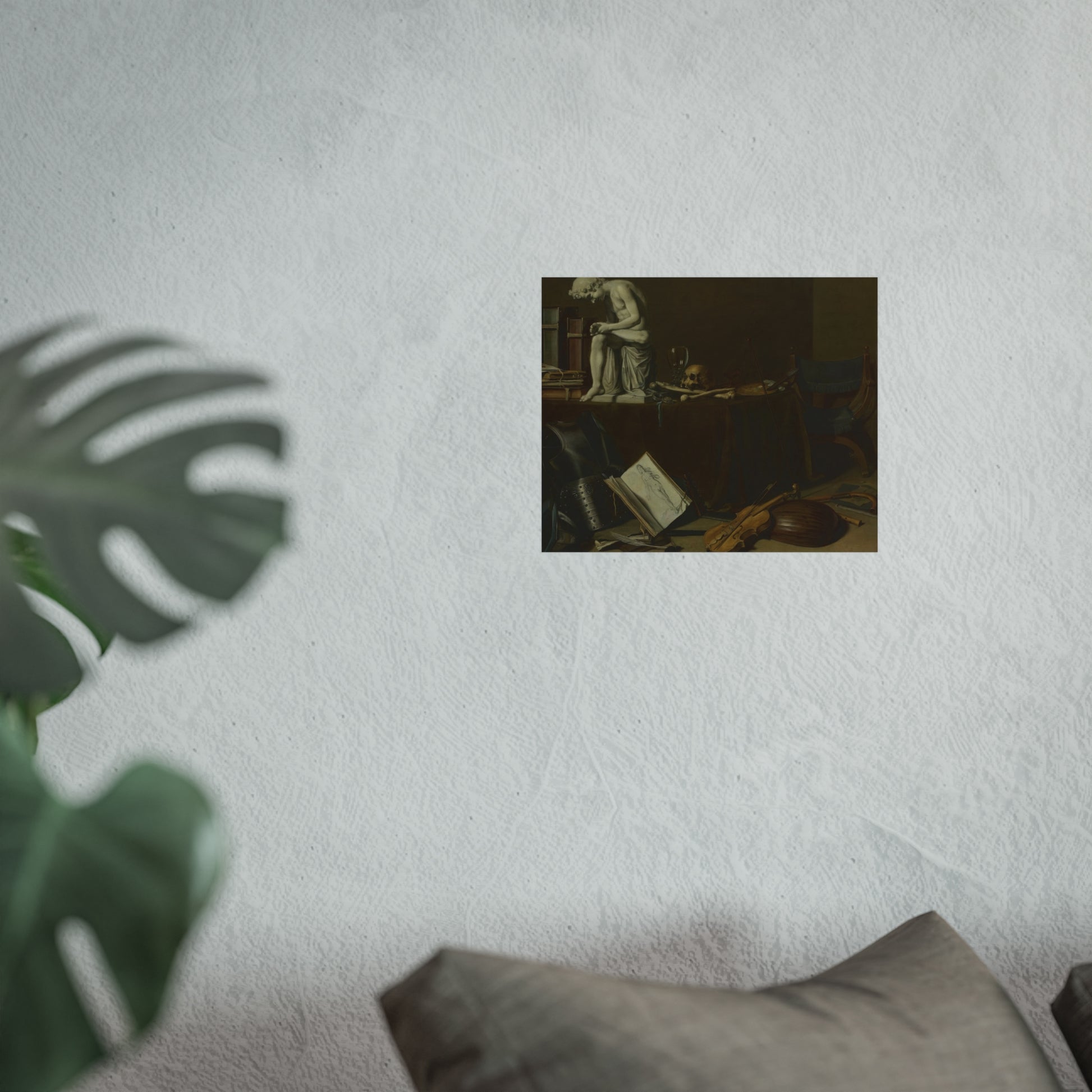 This captivating Vanitas still life painting showcases a variety of intriguing objects. On a table, we see a plaster statue of the Spinario, a skull with bones, a roemer (a type of Dutch drinking glass), a watch, books, and scattered papers. There is also an extinguished oil lamp and an artist's palette with brushes. The floor beneath is adorned with musical instruments: a lute, a violin, and a type of flute. To the left, there is an armor and helmet, as well as an open art book displaying a drawing of a nude woman.