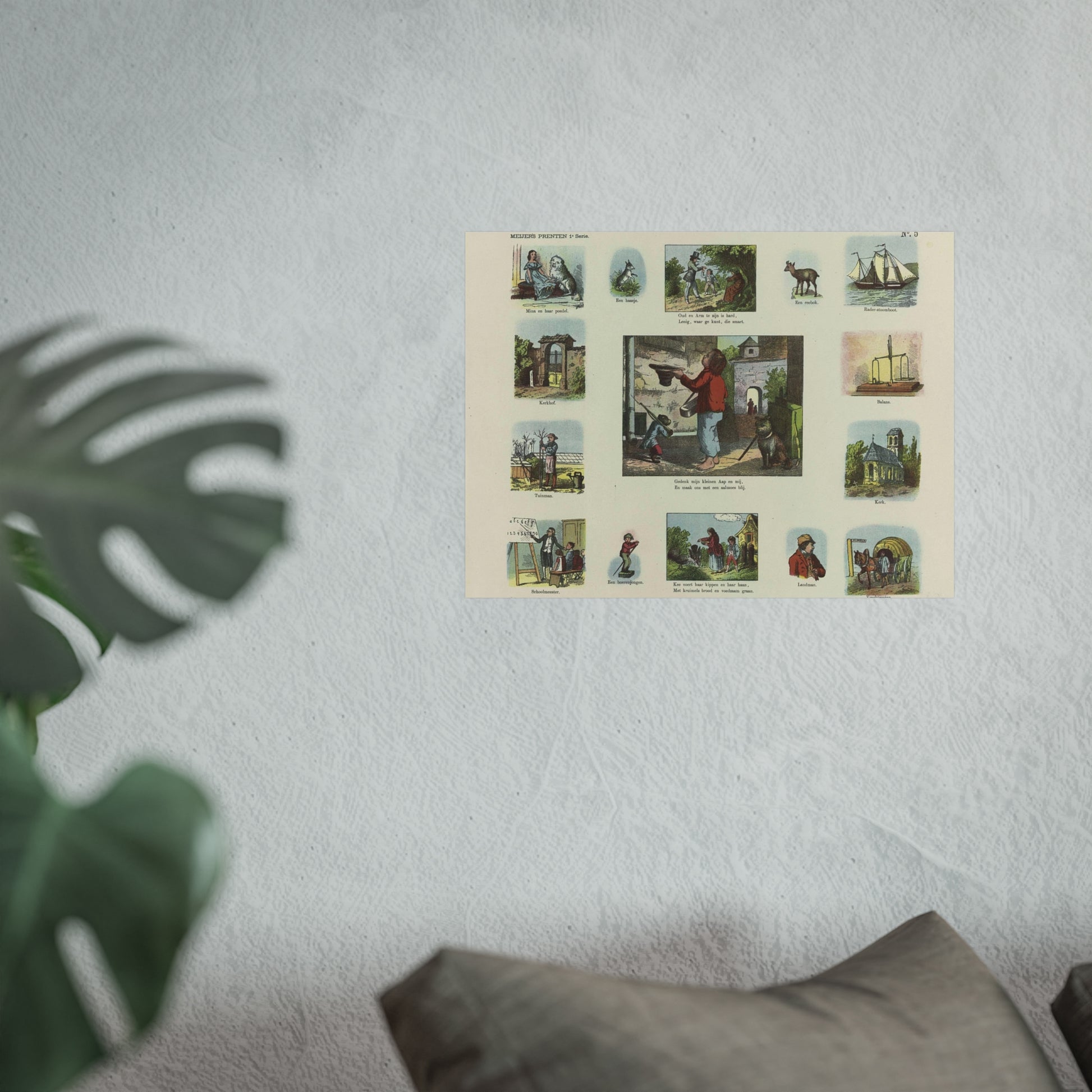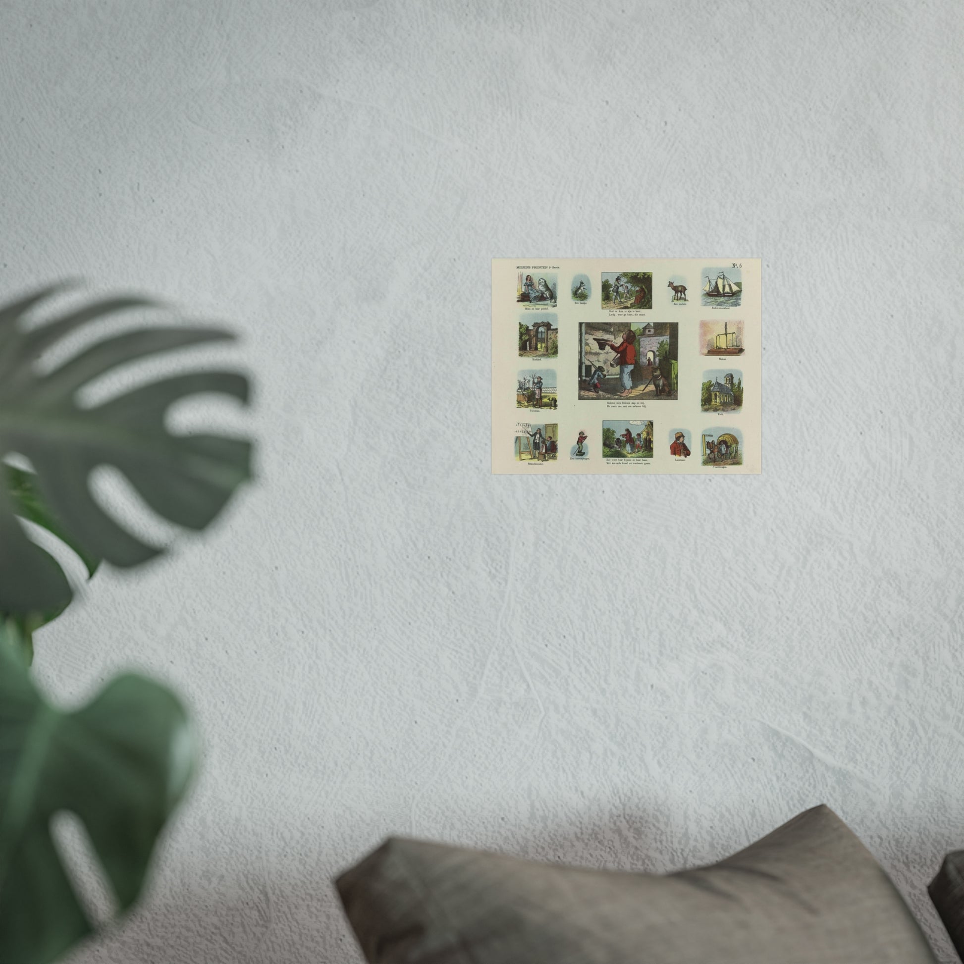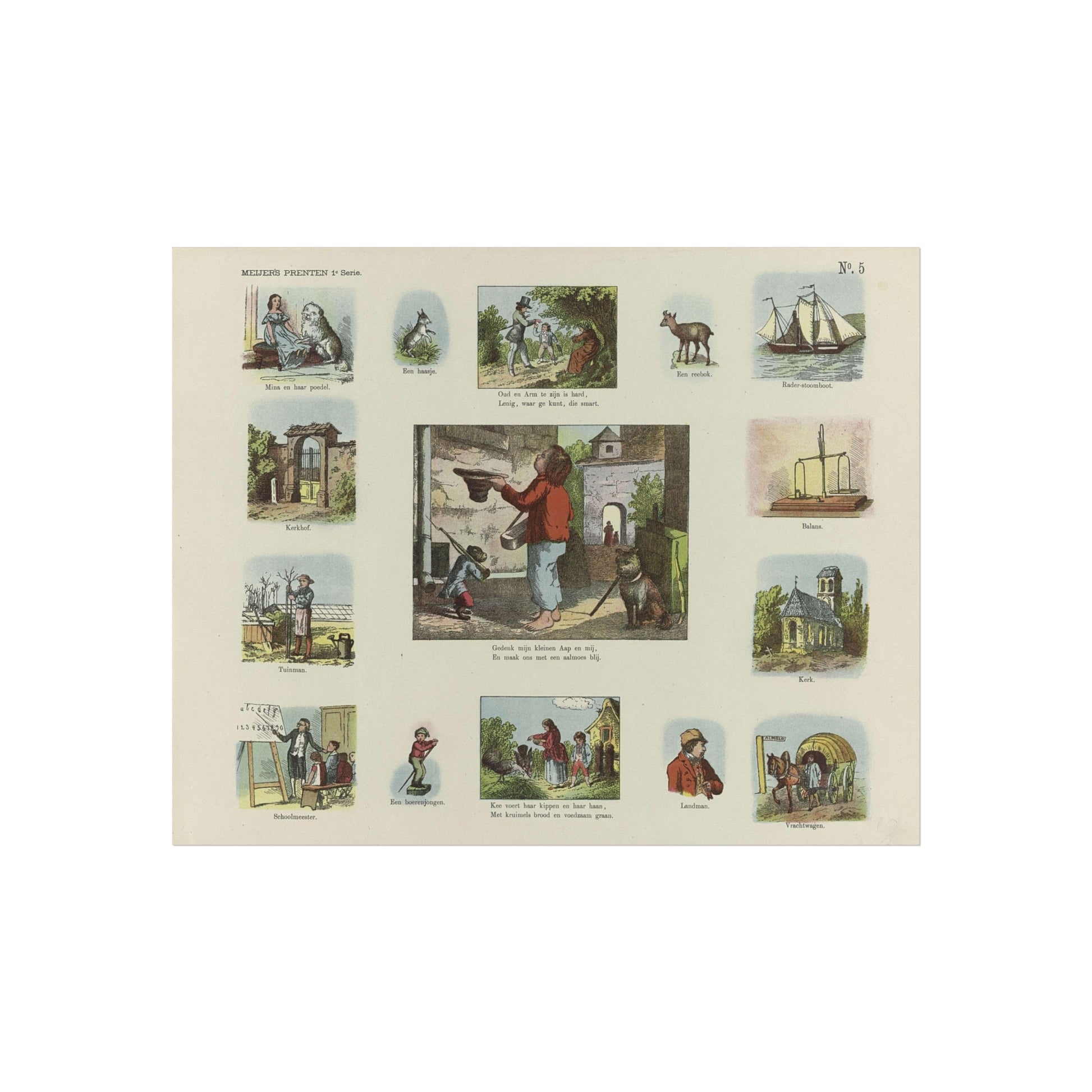 This captivating piece, numbered 5 in the top right corner, showcases 15 distinct scenes that capture a diverse range of subjects. The viewer's eye is drawn to the depictions of a tranquil graveyard, a diligent gardener at work, a playful monkey, a majestic church, and a finely balanced scale. Each image is accompanied by an intriguing caption that adds depth and context to the artwork.