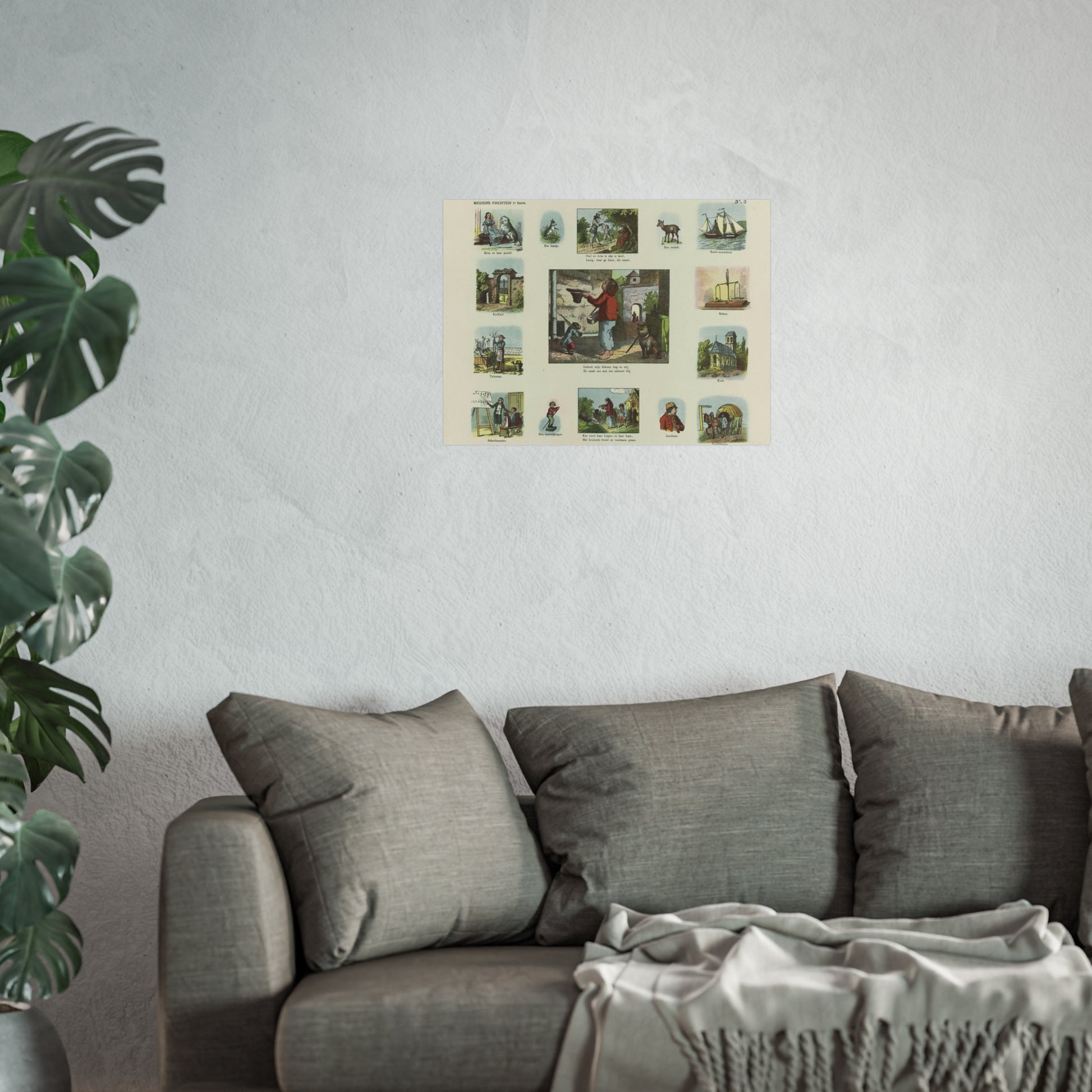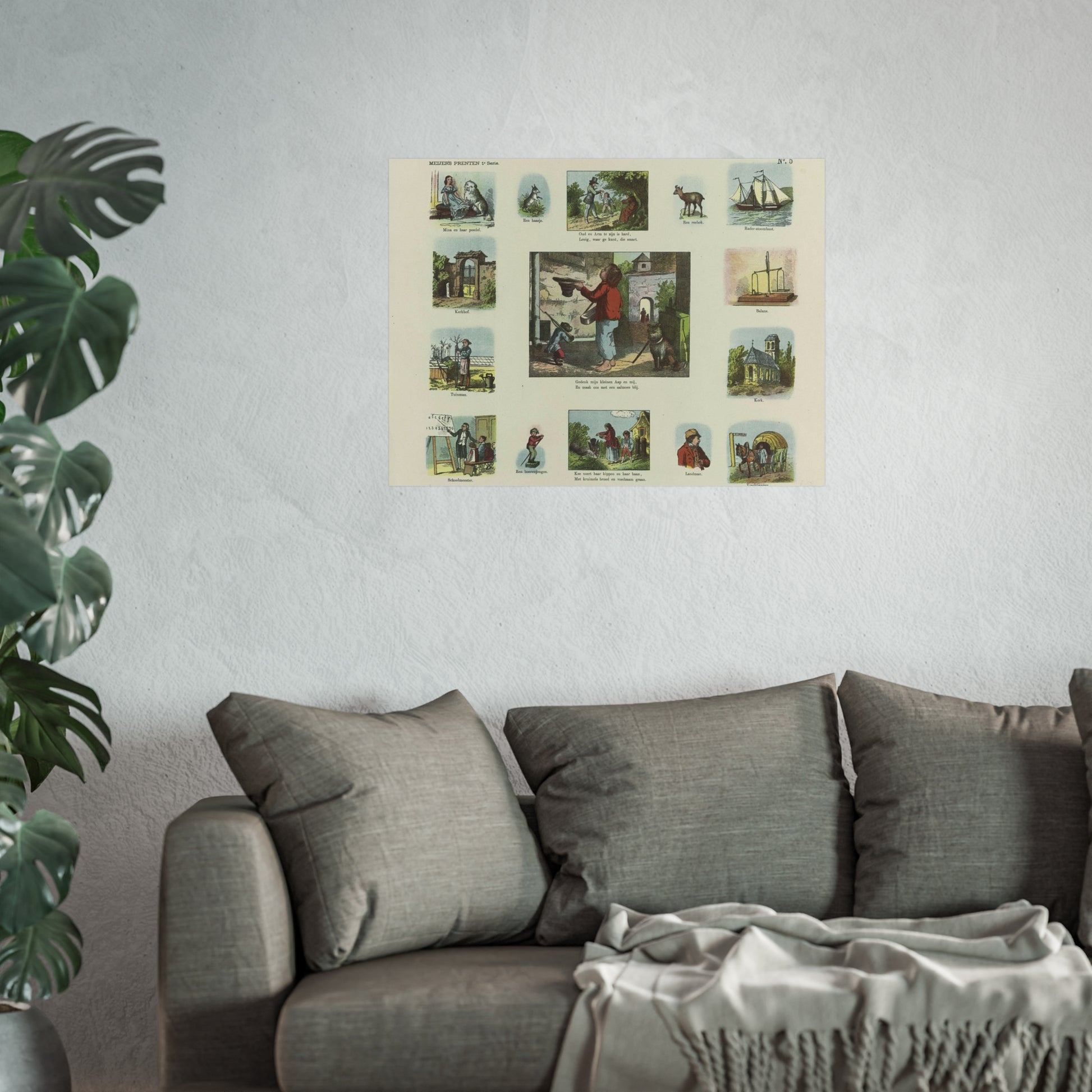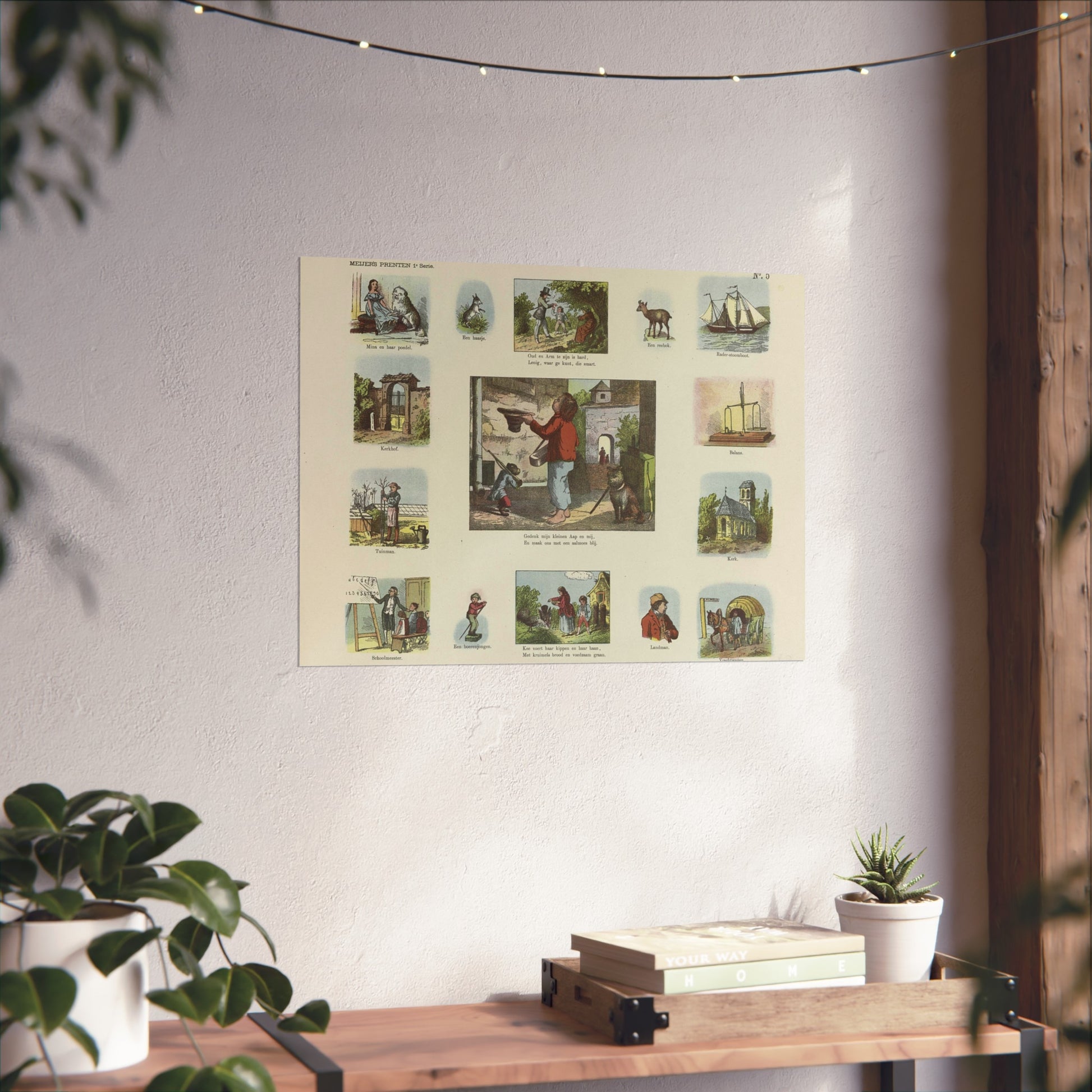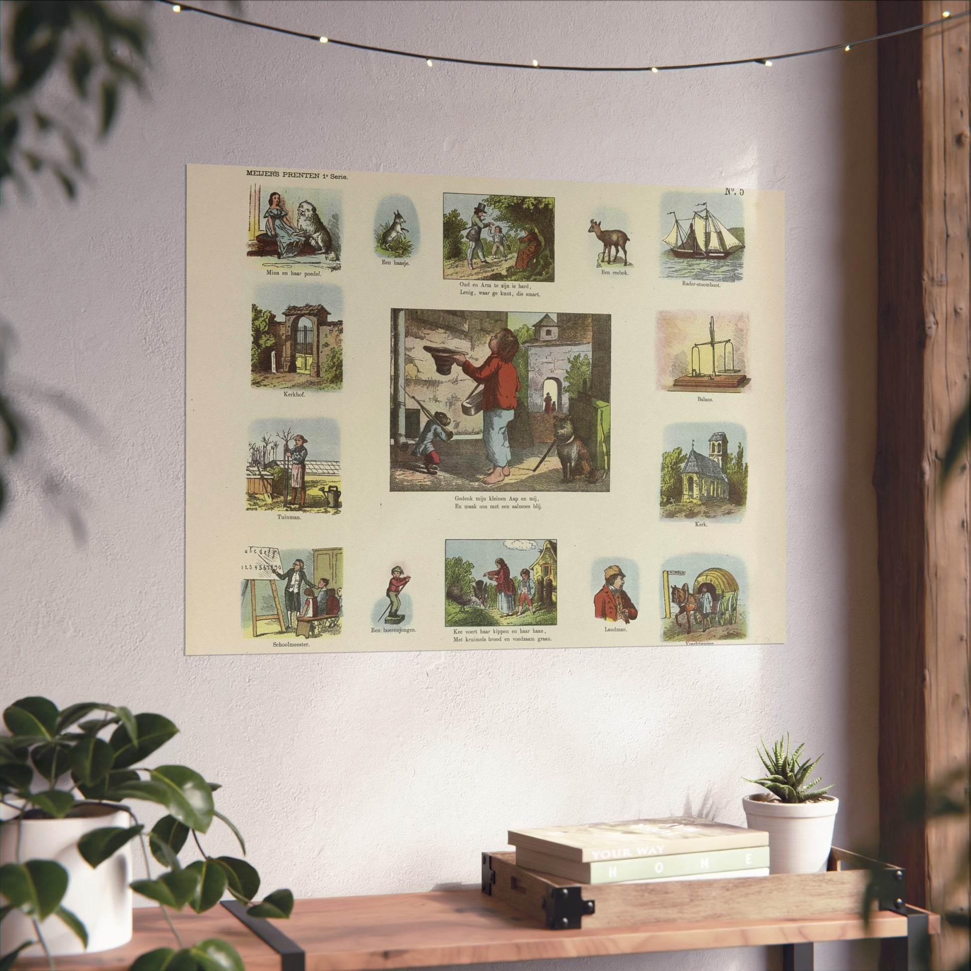 This captivating piece, numbered 5 in the top right corner, showcases 15 distinct scenes that capture a diverse range of subjects. The viewer's eye is drawn to the depictions of a tranquil graveyard, a diligent gardener at work, a playful monkey, a majestic church, and a finely balanced scale. Each image is accompanied by an intriguing caption that adds depth and context to the artwork.