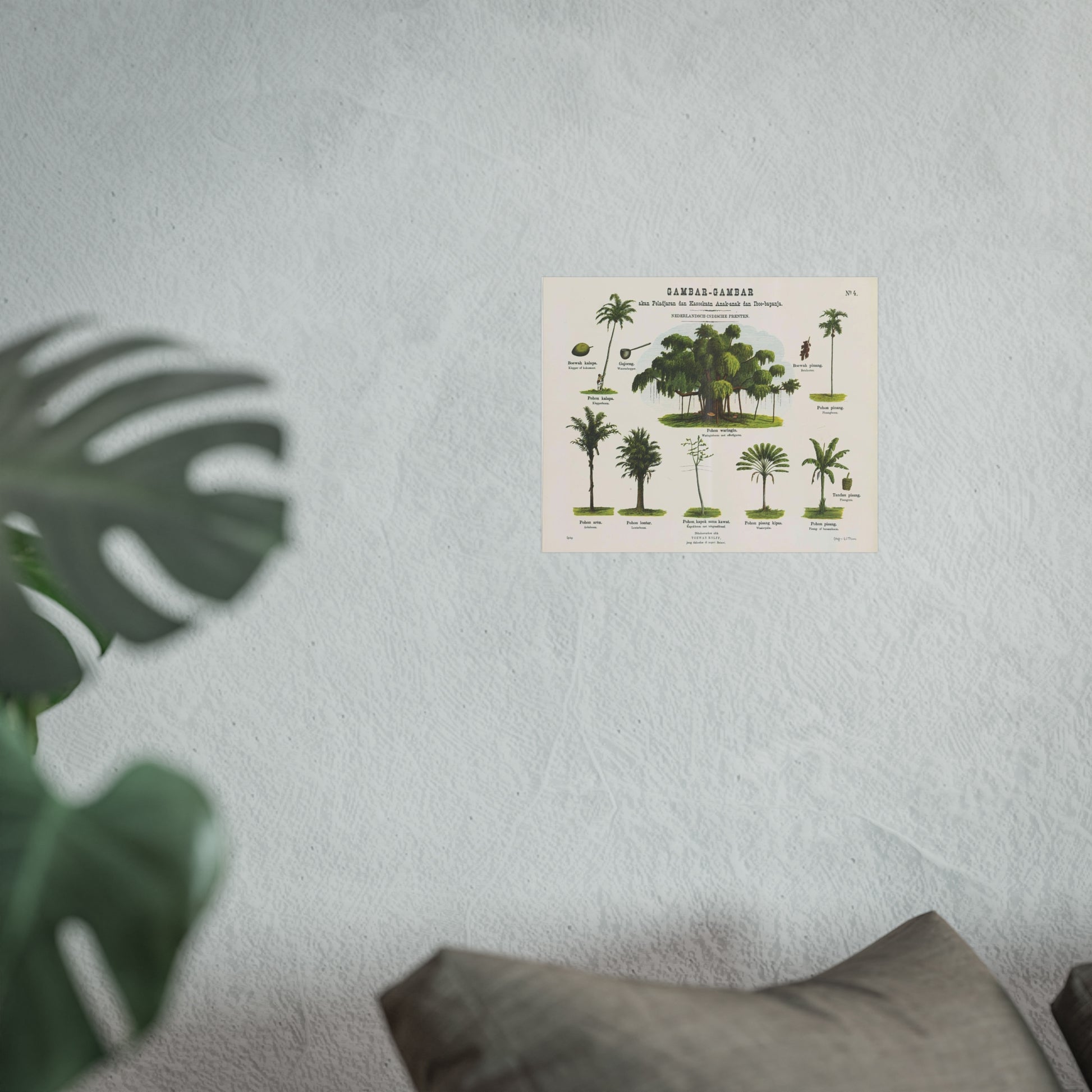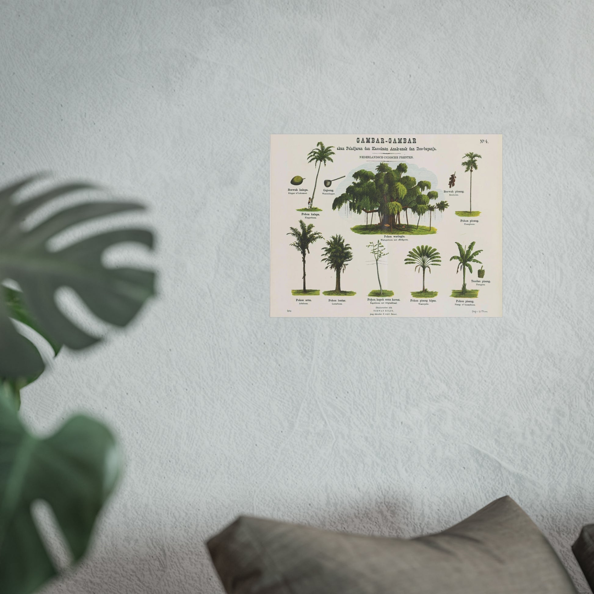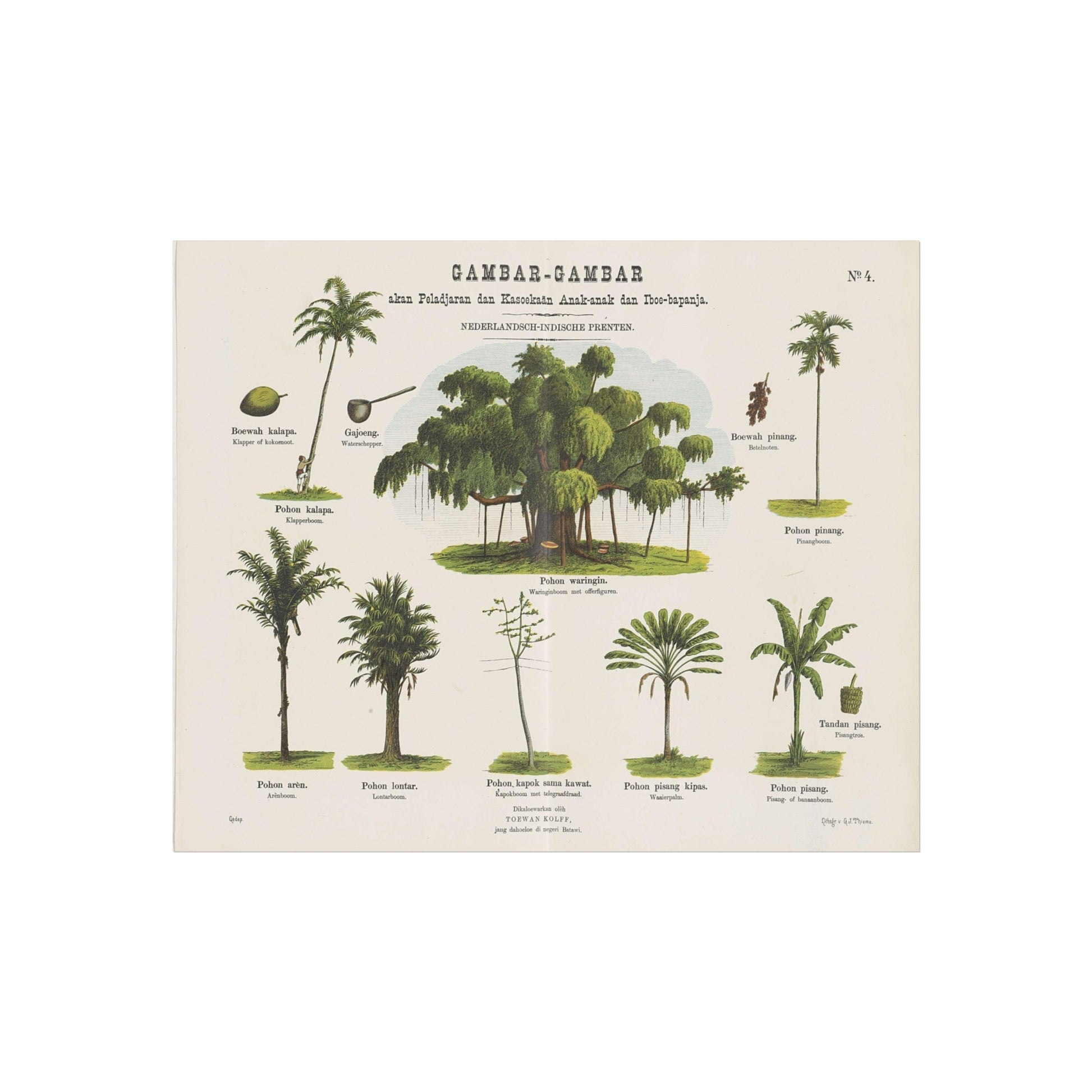 This captivating piece showcases ten scenes from a bamboo forest, along with furniture and various other objects crafted from bamboo in the erstwhile Dutch colony of the Dutch East Indies. Each image is accompanied by a caption in both Malay and Dutch languages. The artwork is labeled at the top right as No. 3.