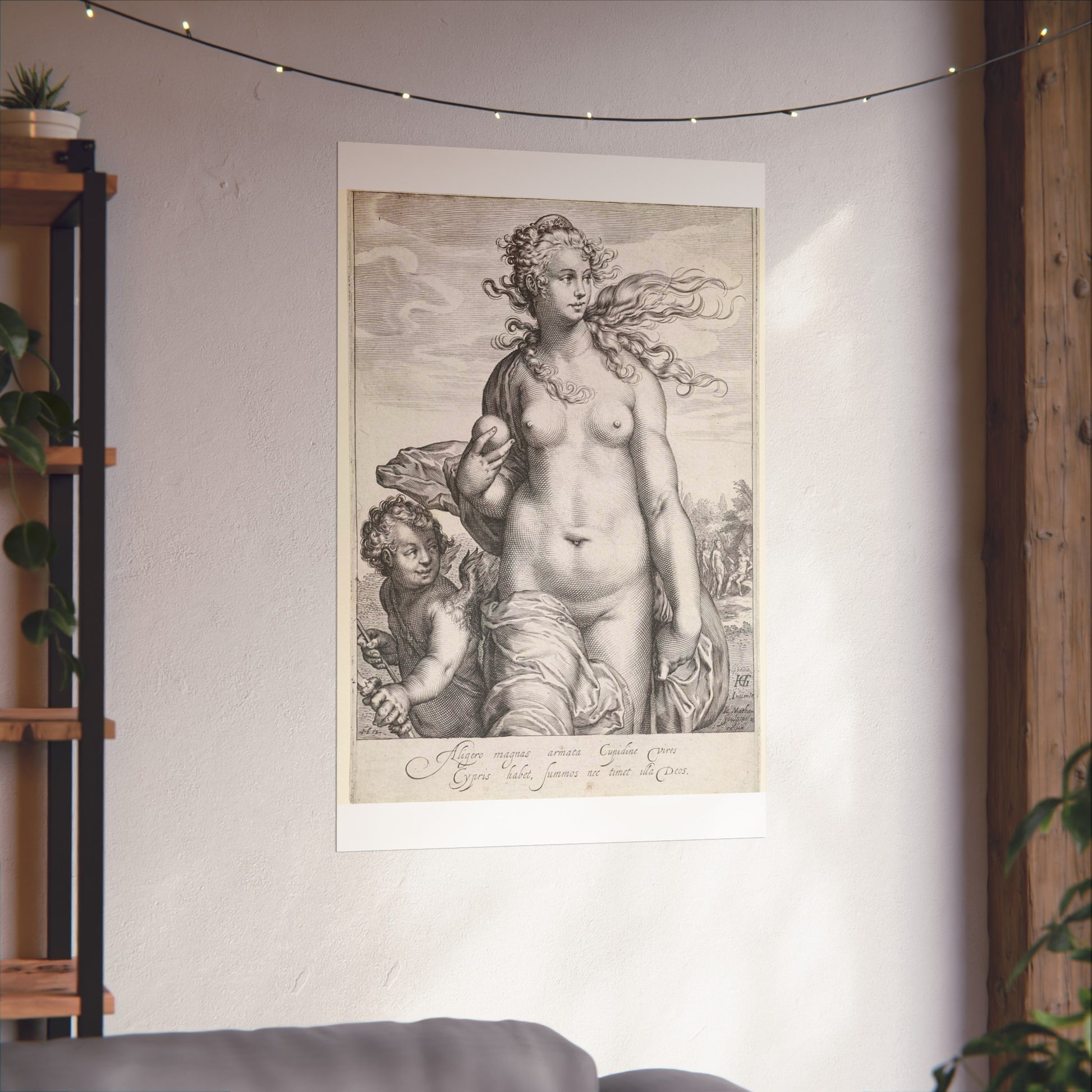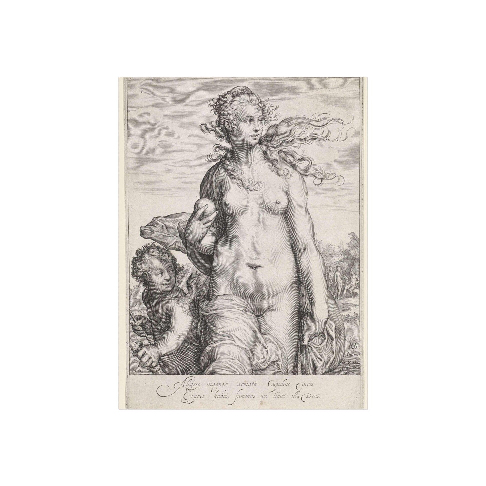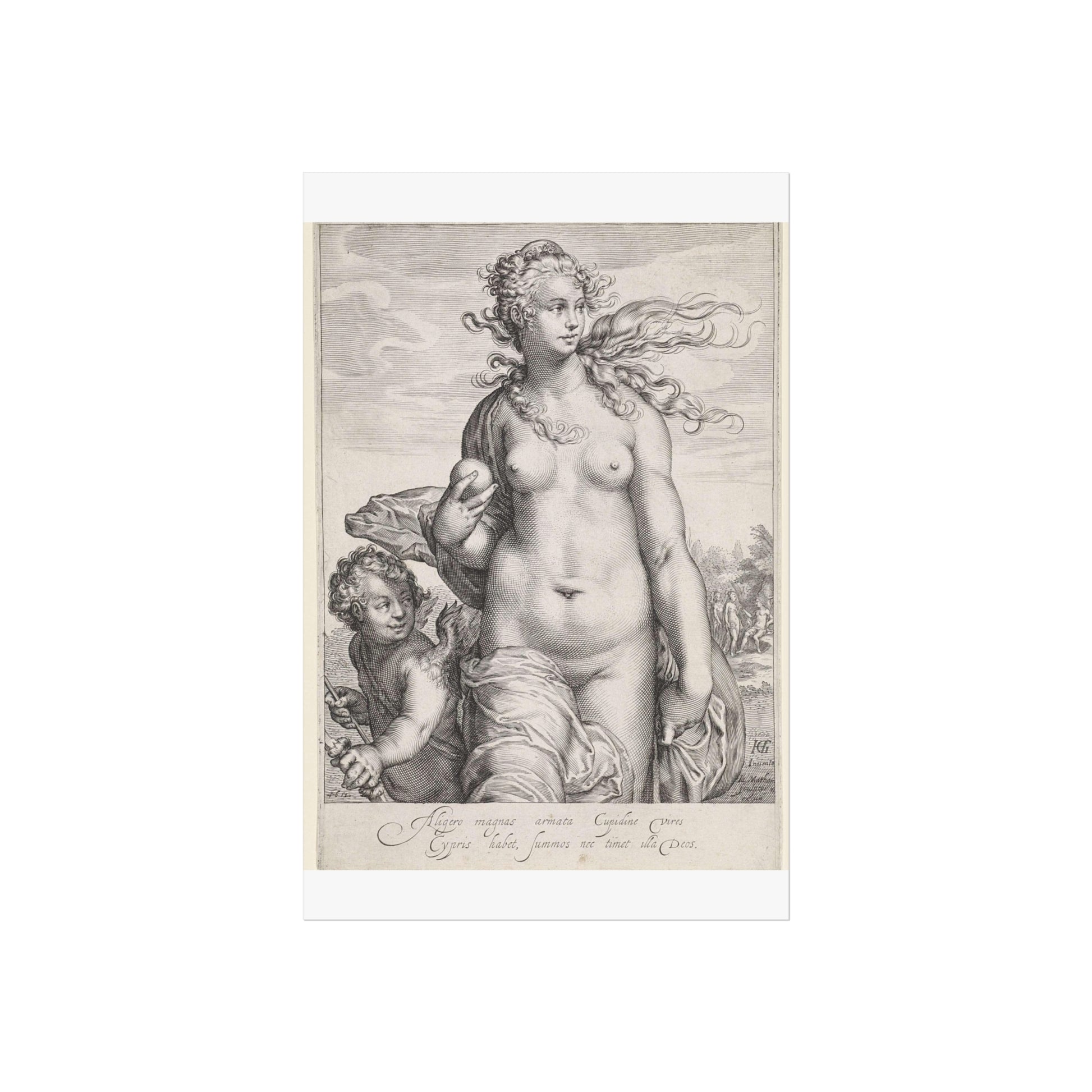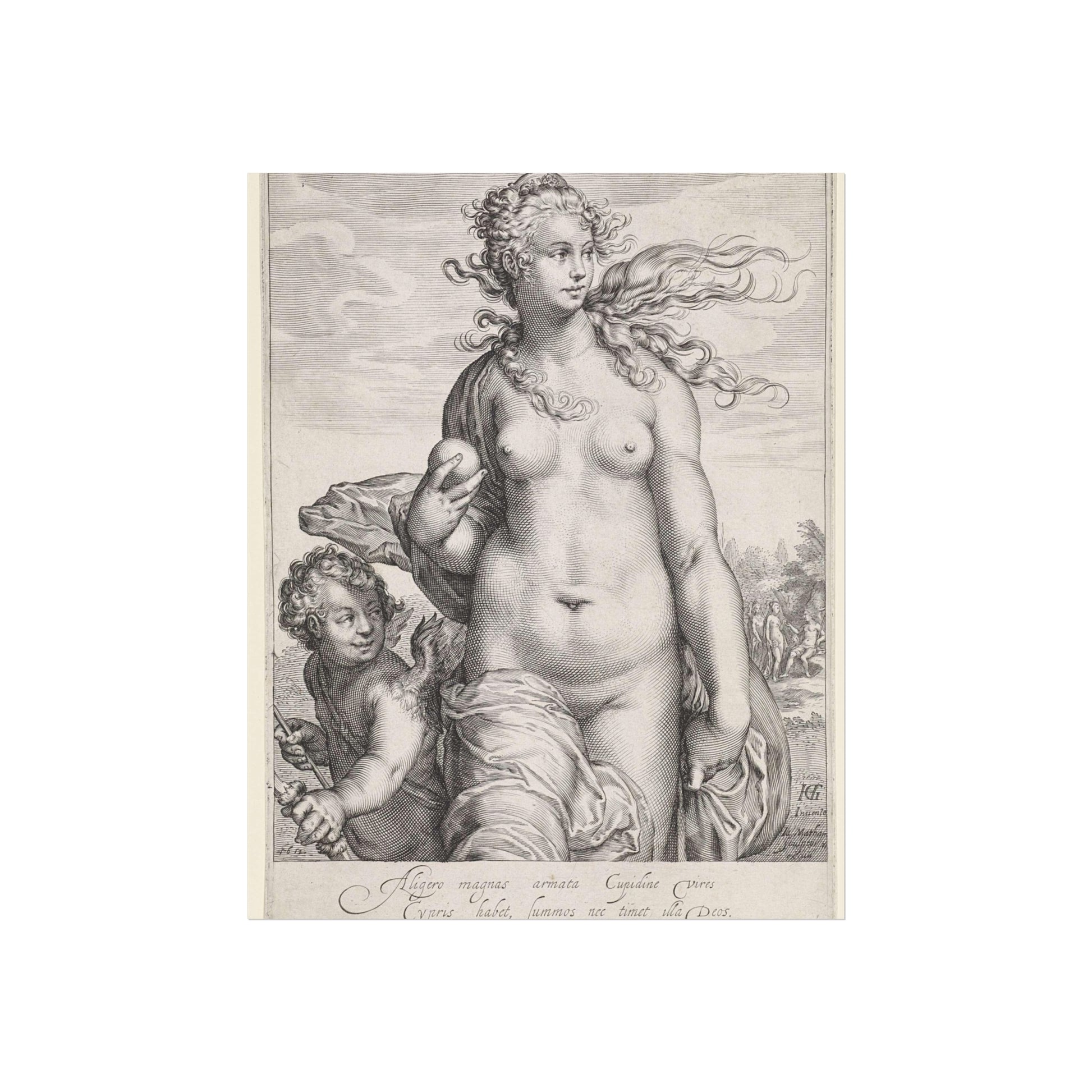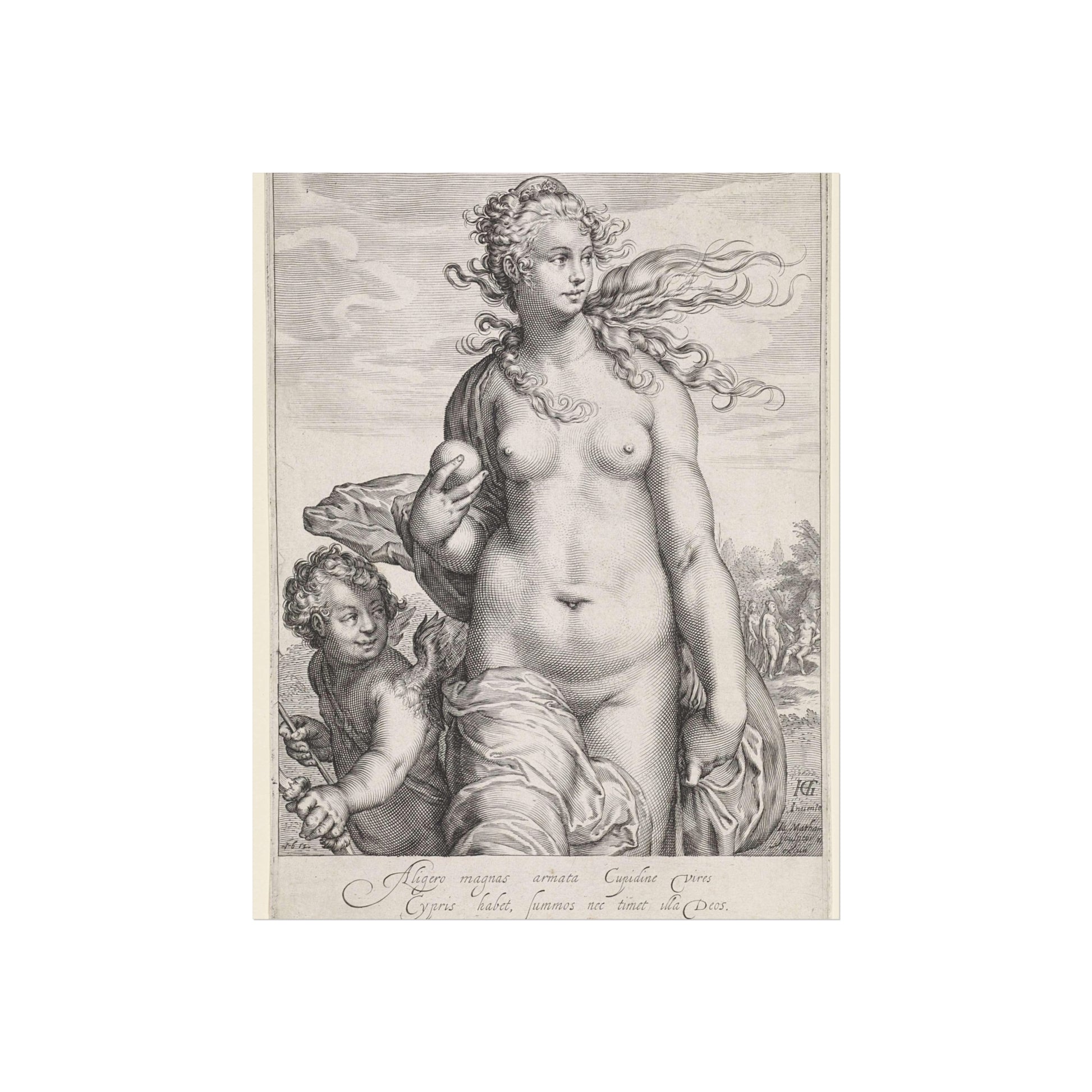In this captivating artwork, Venus, the goddess of love, is depicted holding the golden apple she received as a prize from Paris for being the most beautiful woman. By her side is Cupid, armed with his signature bow and arrow. In the backdrop is the judgment of Paris, a pivotal event in mythology. The scene is beautifully rendered by Jacob Matham, immersing viewers into a world of divine beauty and celestial judgment.