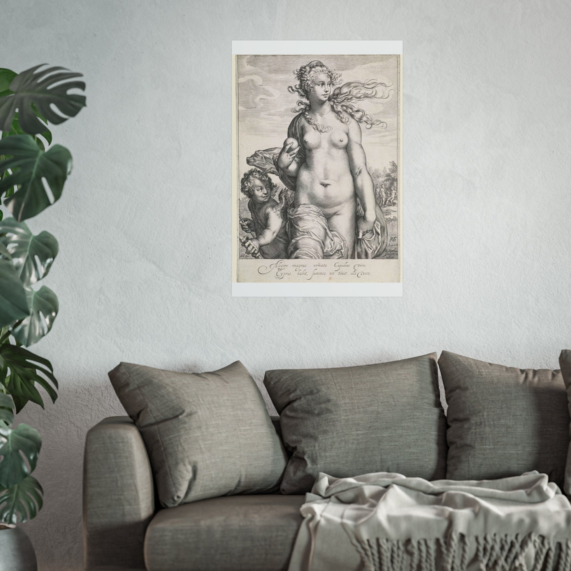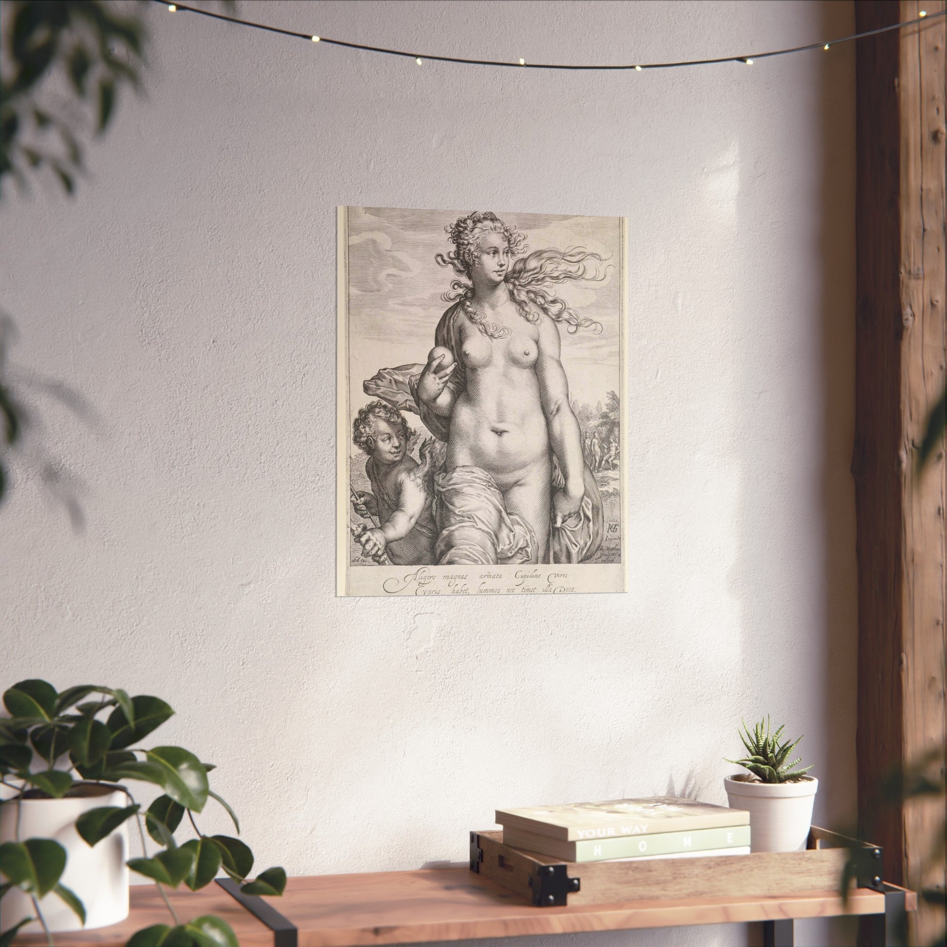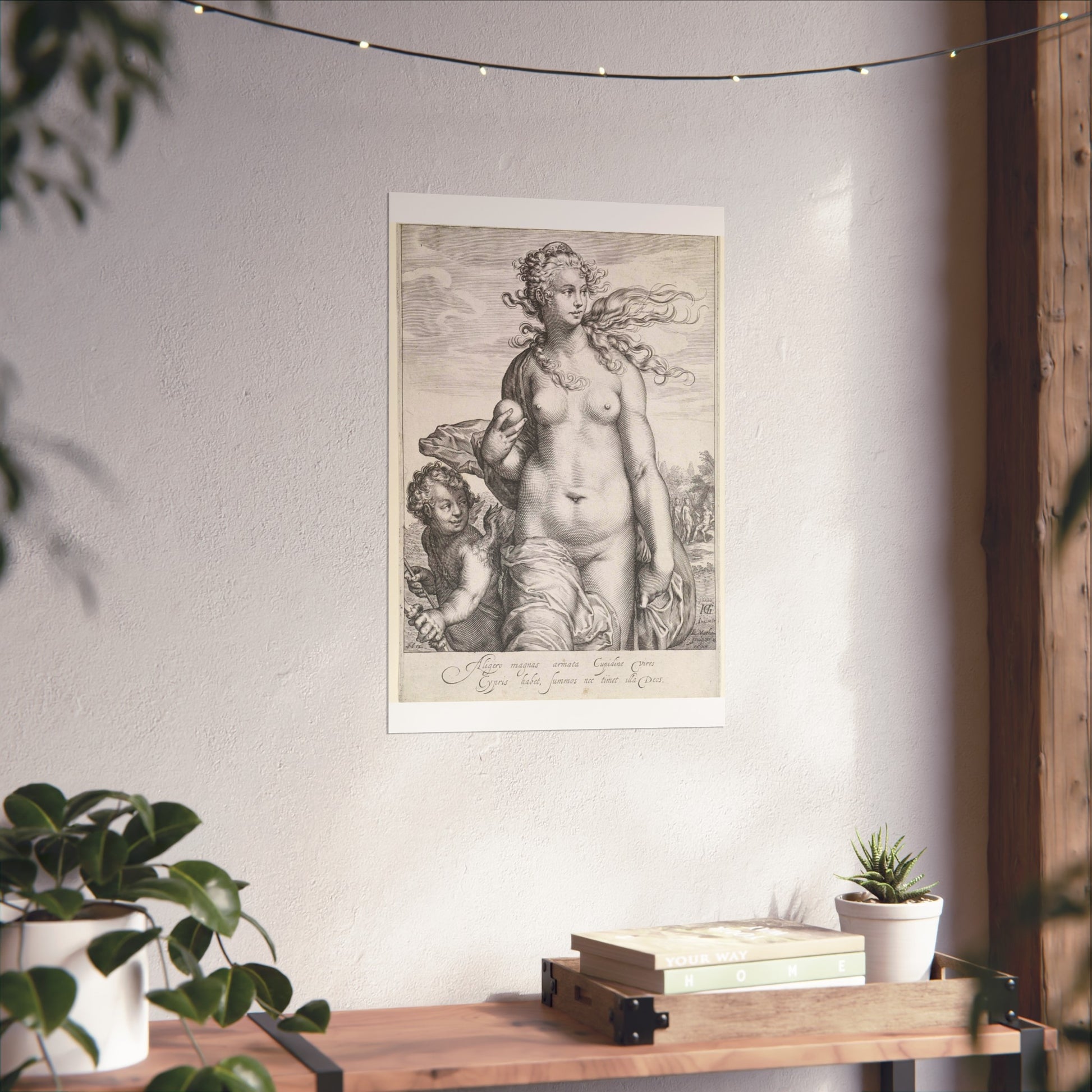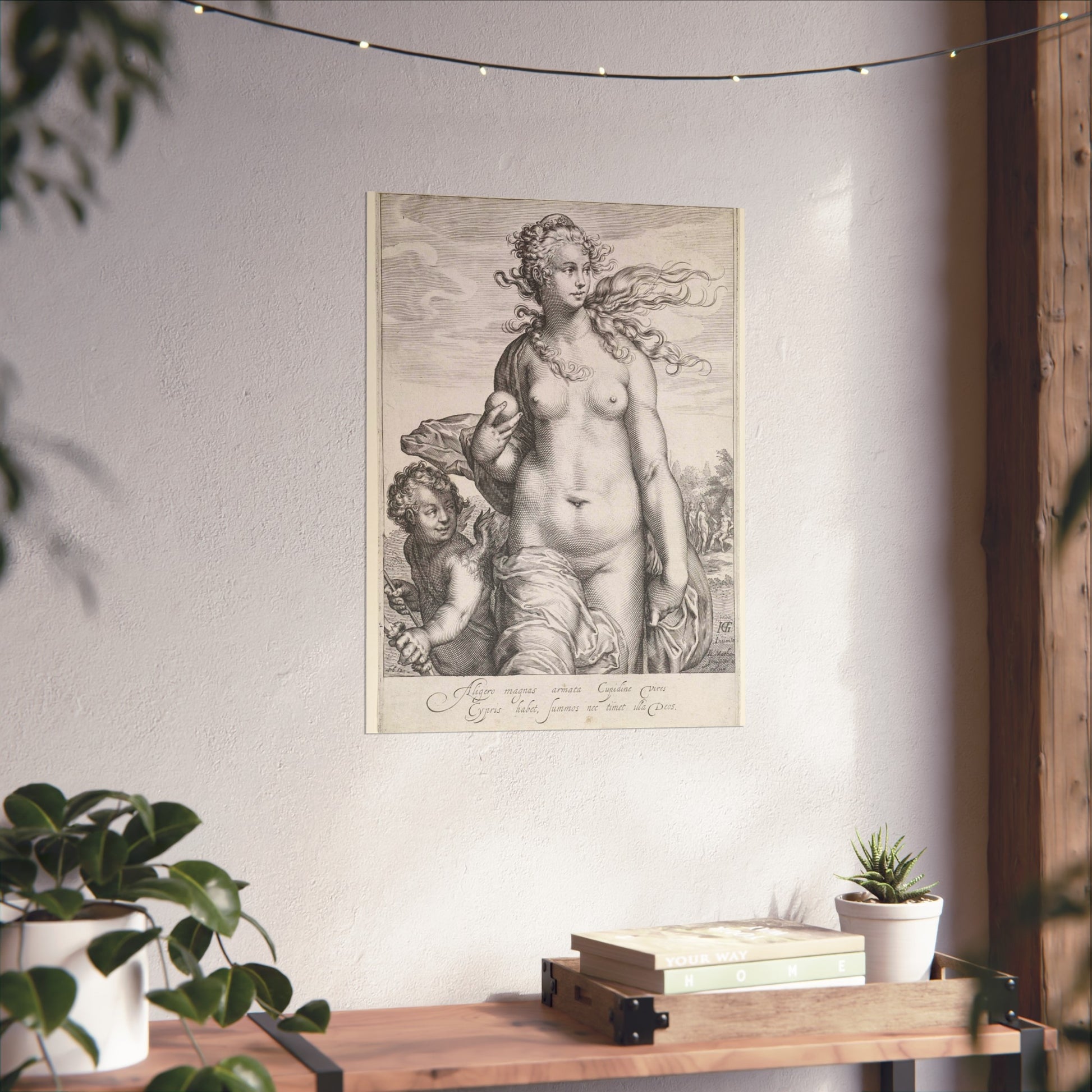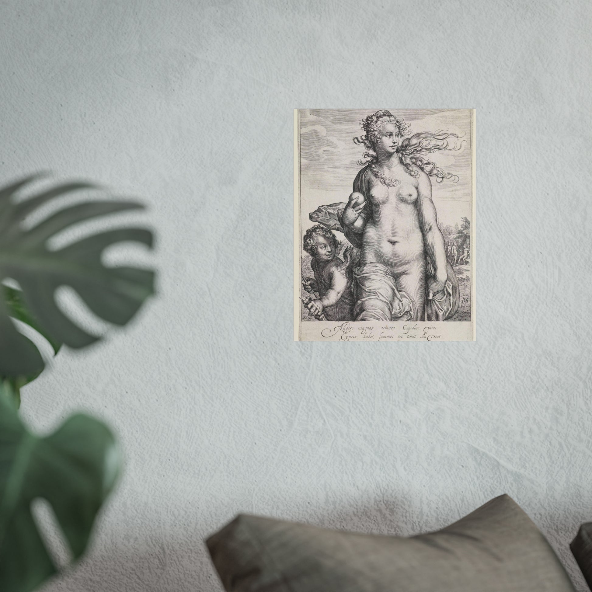 In this captivating artwork, Venus, the goddess of love, is depicted holding the golden apple she received as a prize from Paris for being the most beautiful woman. By her side is Cupid, armed with his signature bow and arrow. In the backdrop is the judgment of Paris, a pivotal event in mythology. The scene is beautifully rendered by Jacob Matham, immersing viewers into a world of divine beauty and celestial judgment.