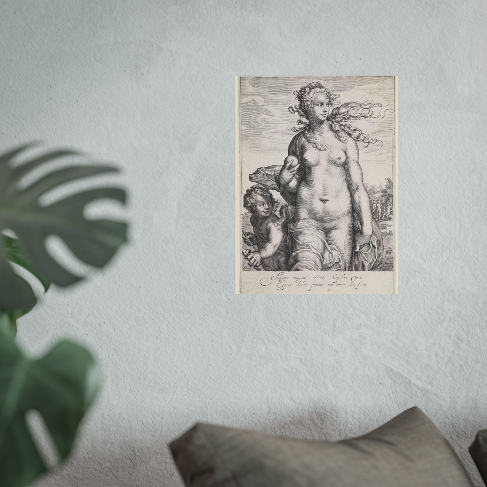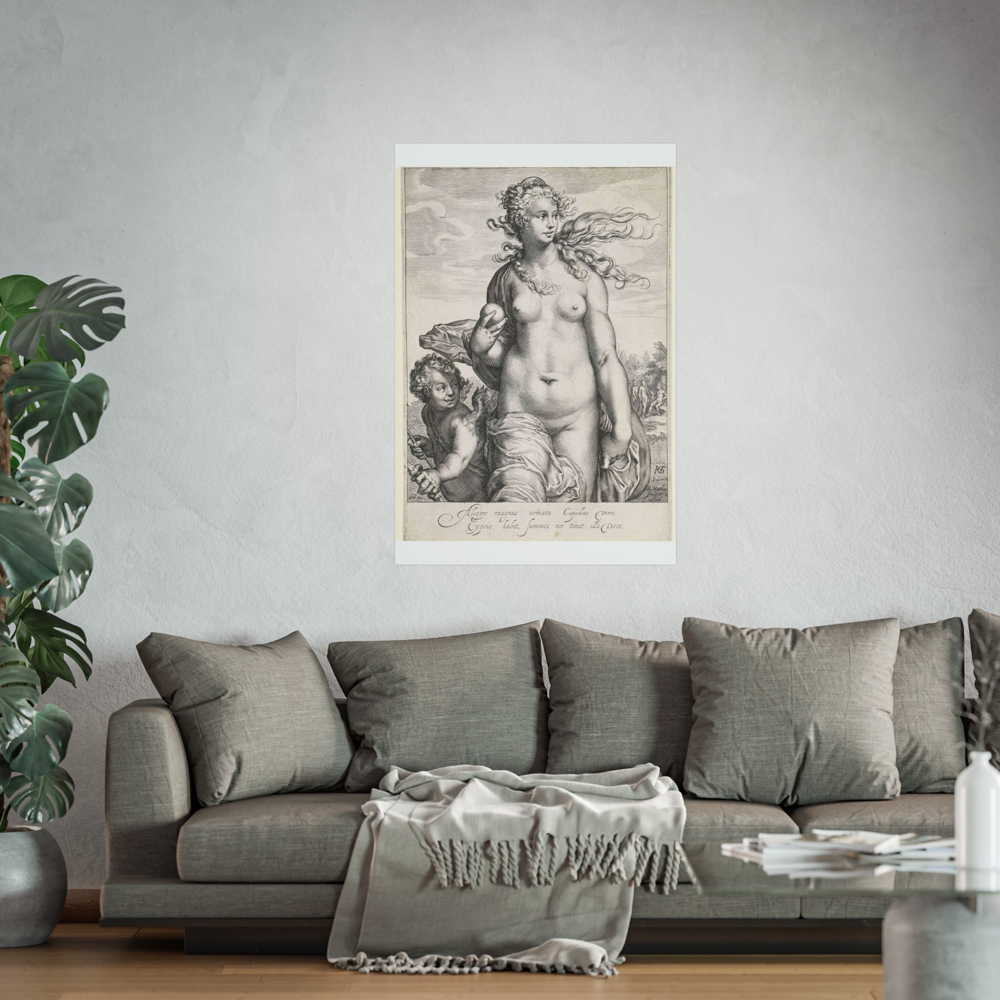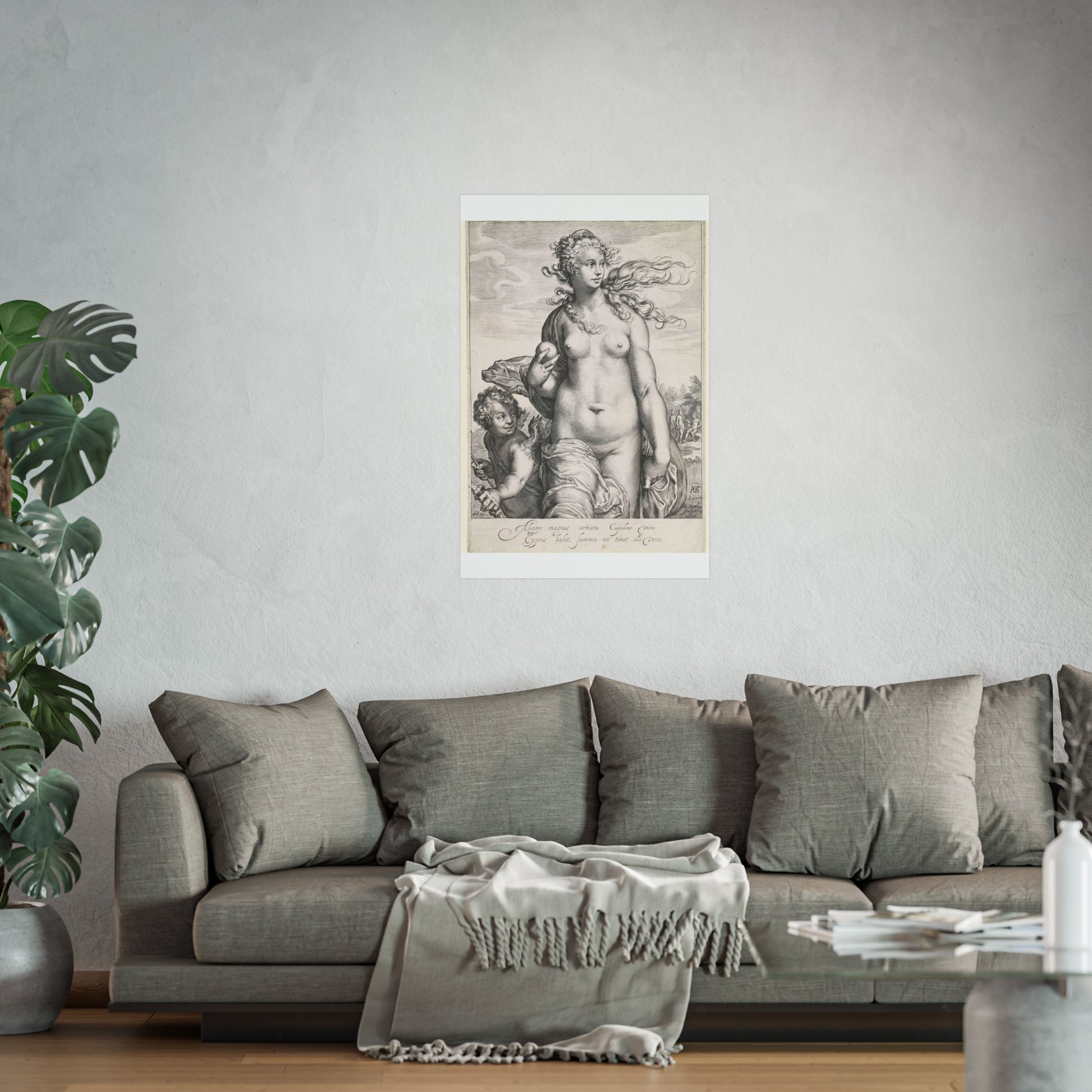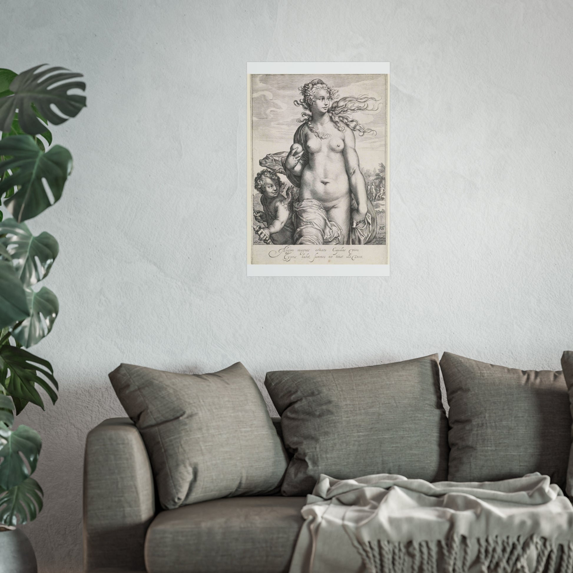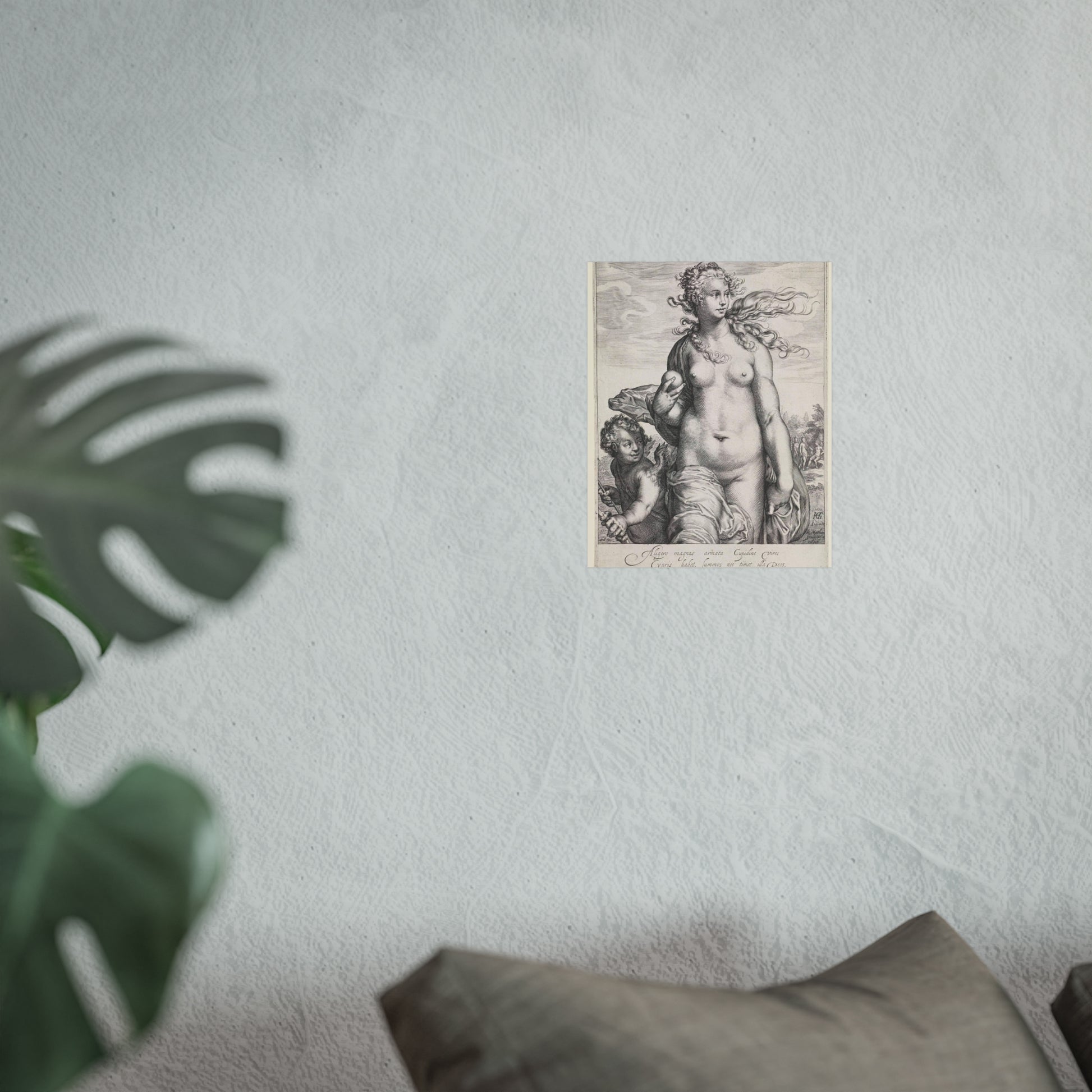 In this captivating artwork, Venus, the goddess of love, is depicted holding the golden apple she received as a prize from Paris for being the most beautiful woman. By her side is Cupid, armed with his signature bow and arrow. In the backdrop is the judgment of Paris, a pivotal event in mythology. The scene is beautifully rendered by Jacob Matham, immersing viewers into a world of divine beauty and celestial judgment.