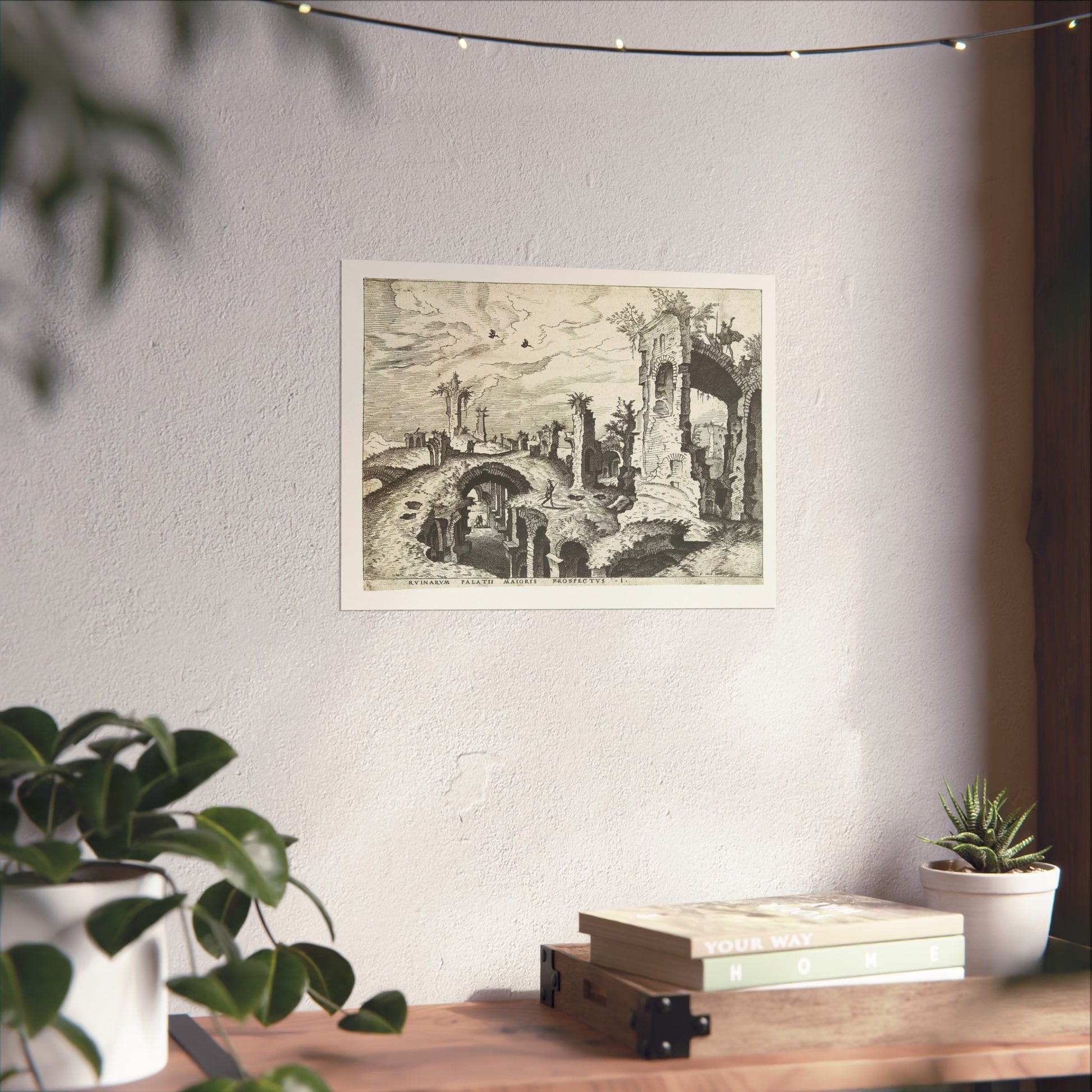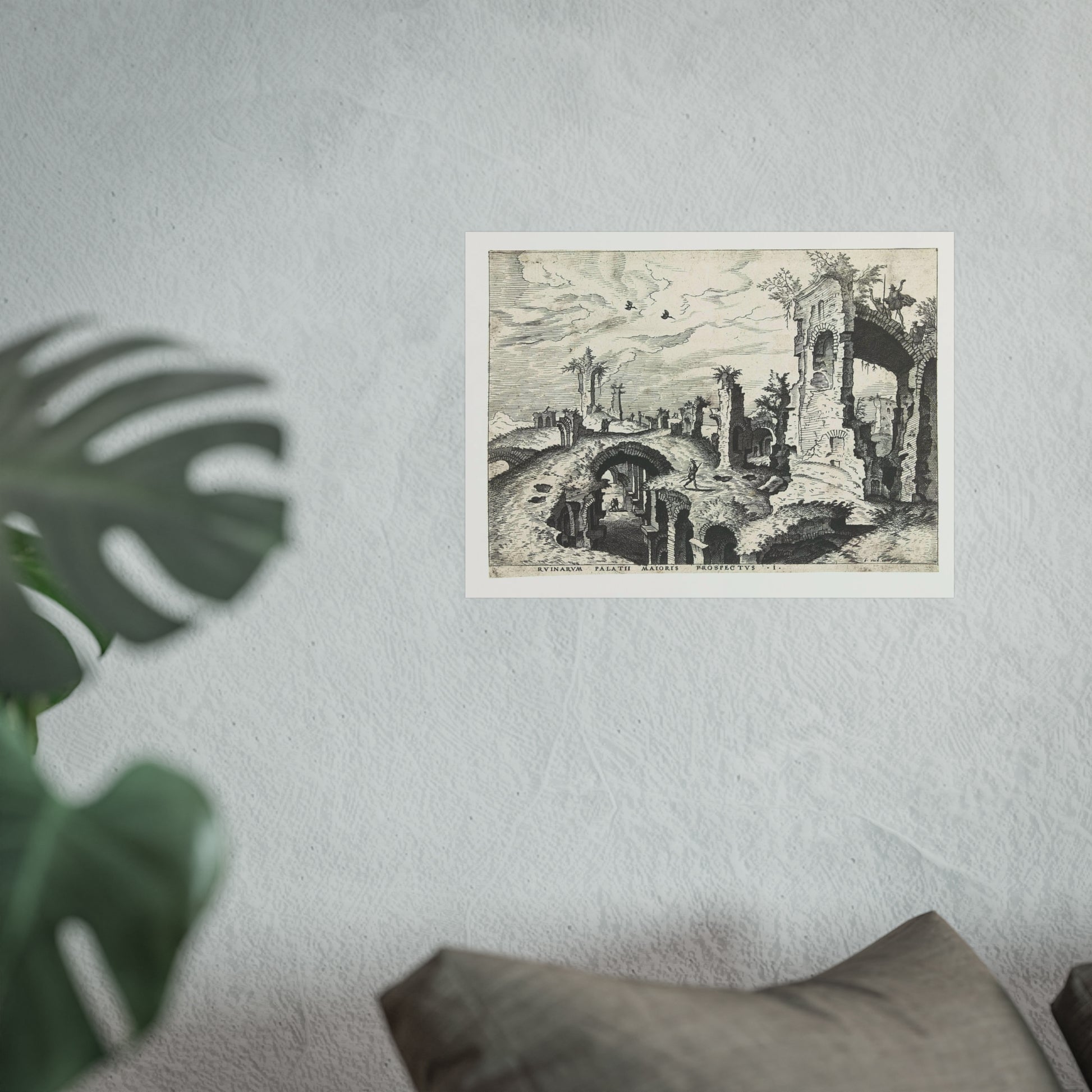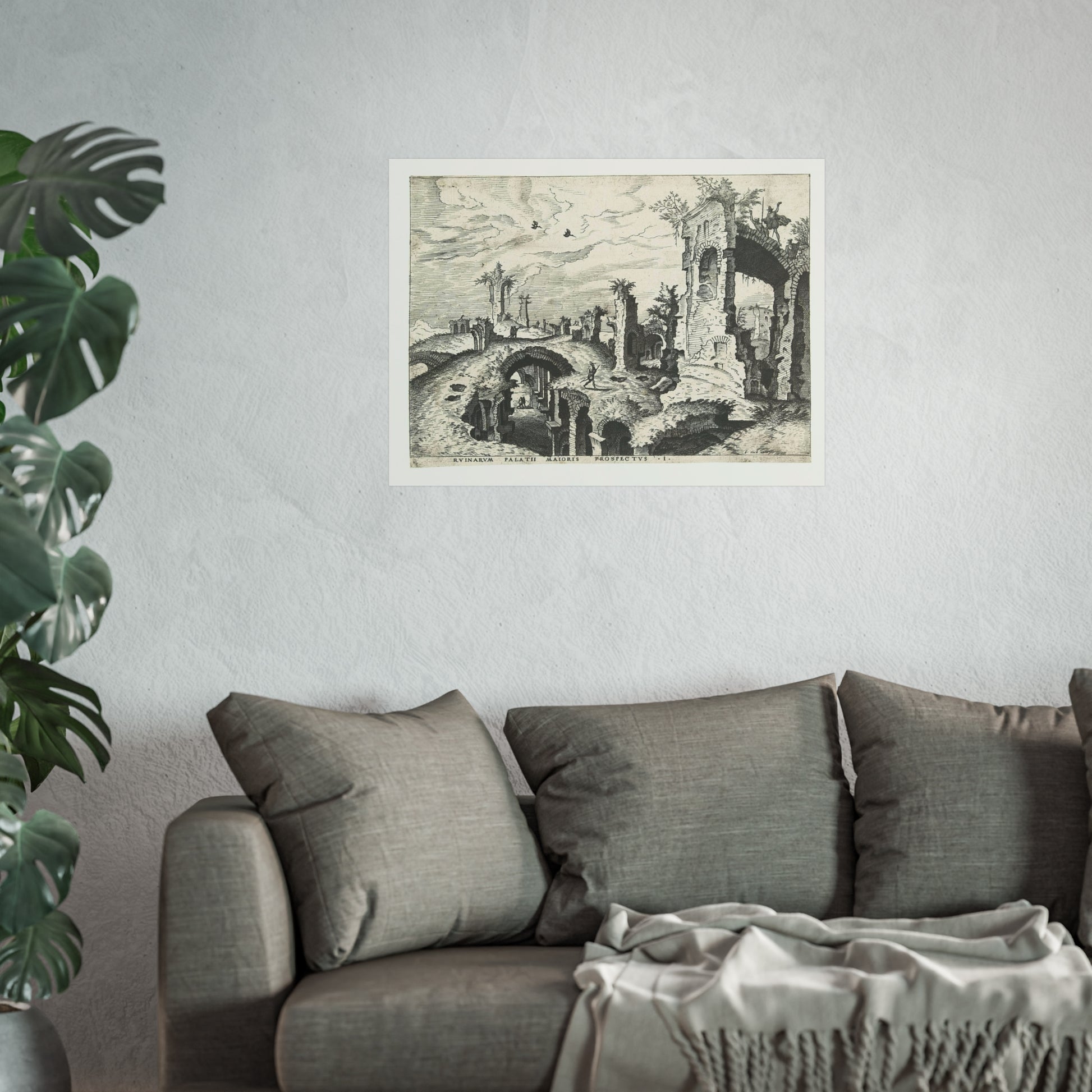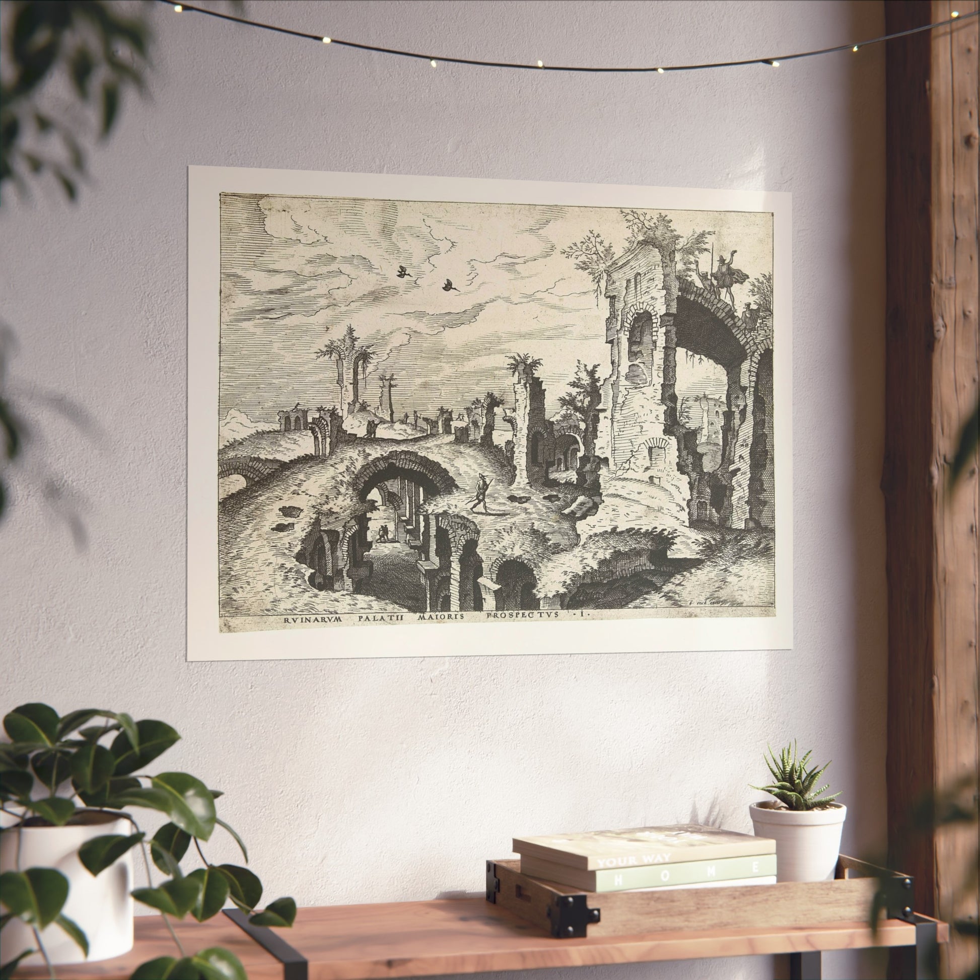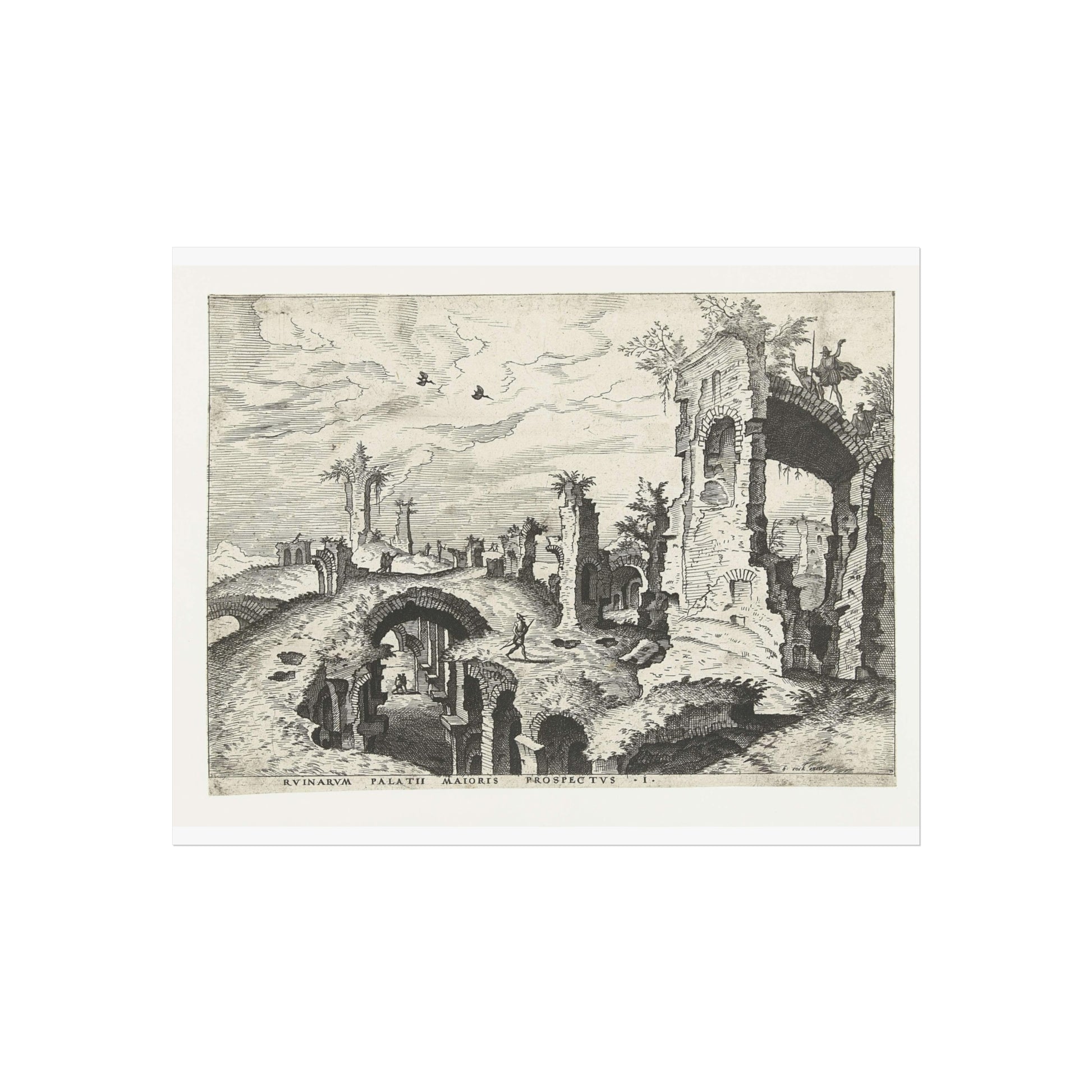 Experience the majestic remnants of Roman architecture on the Palatine Hill in Rome through this captivating artwork. Men are seen meandering between these historic structures, while a group daringly ascends a barrel vault to the right. The scene encapsulates the allure of ancient ruins and human curiosity.