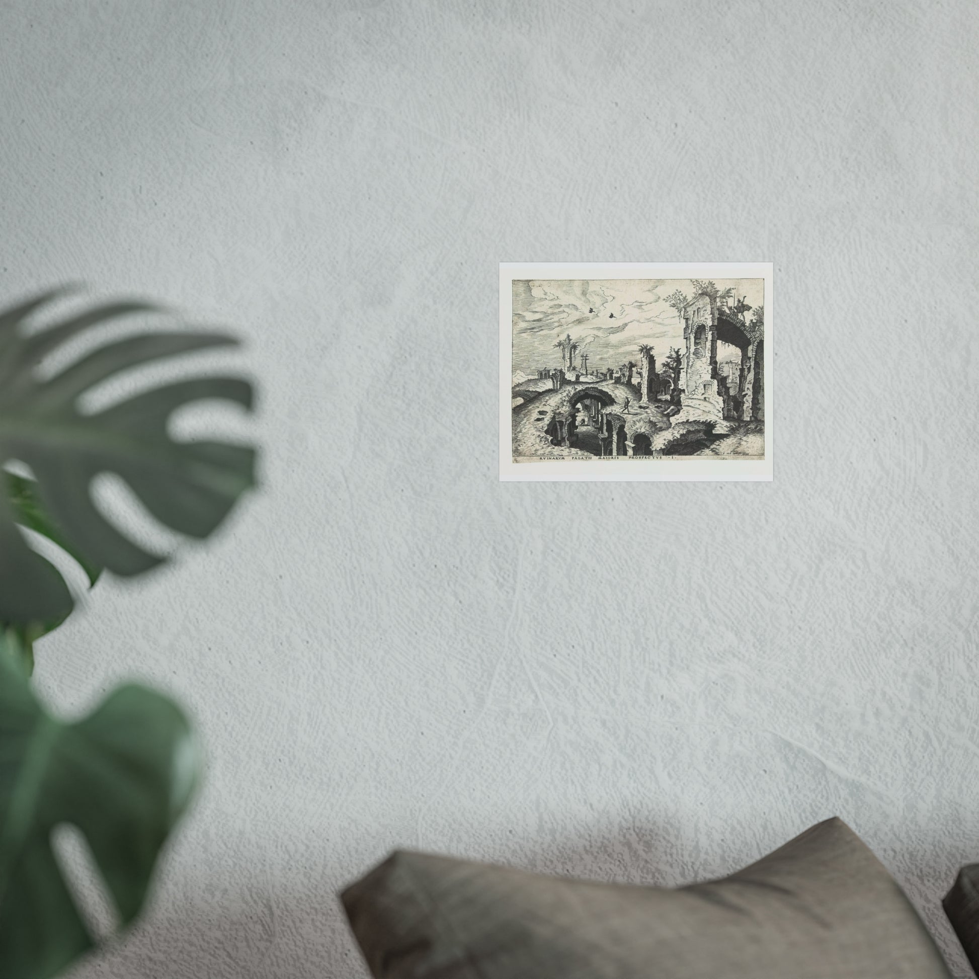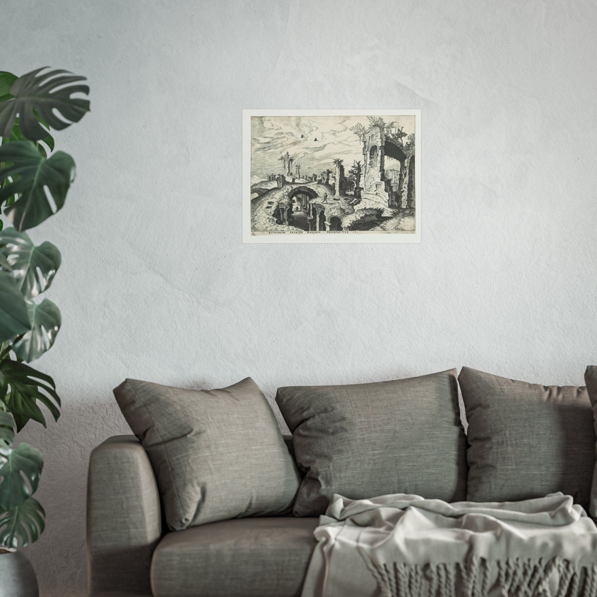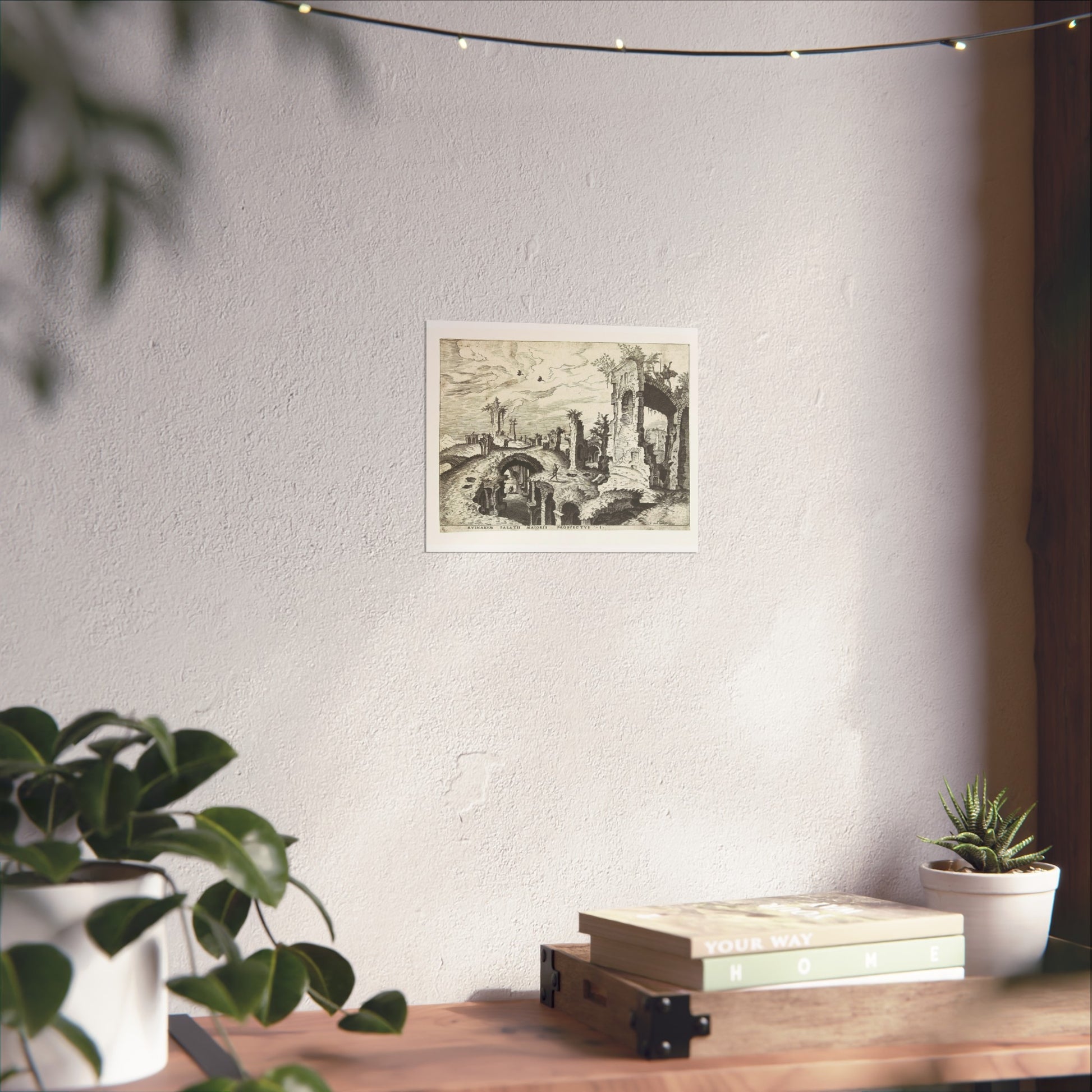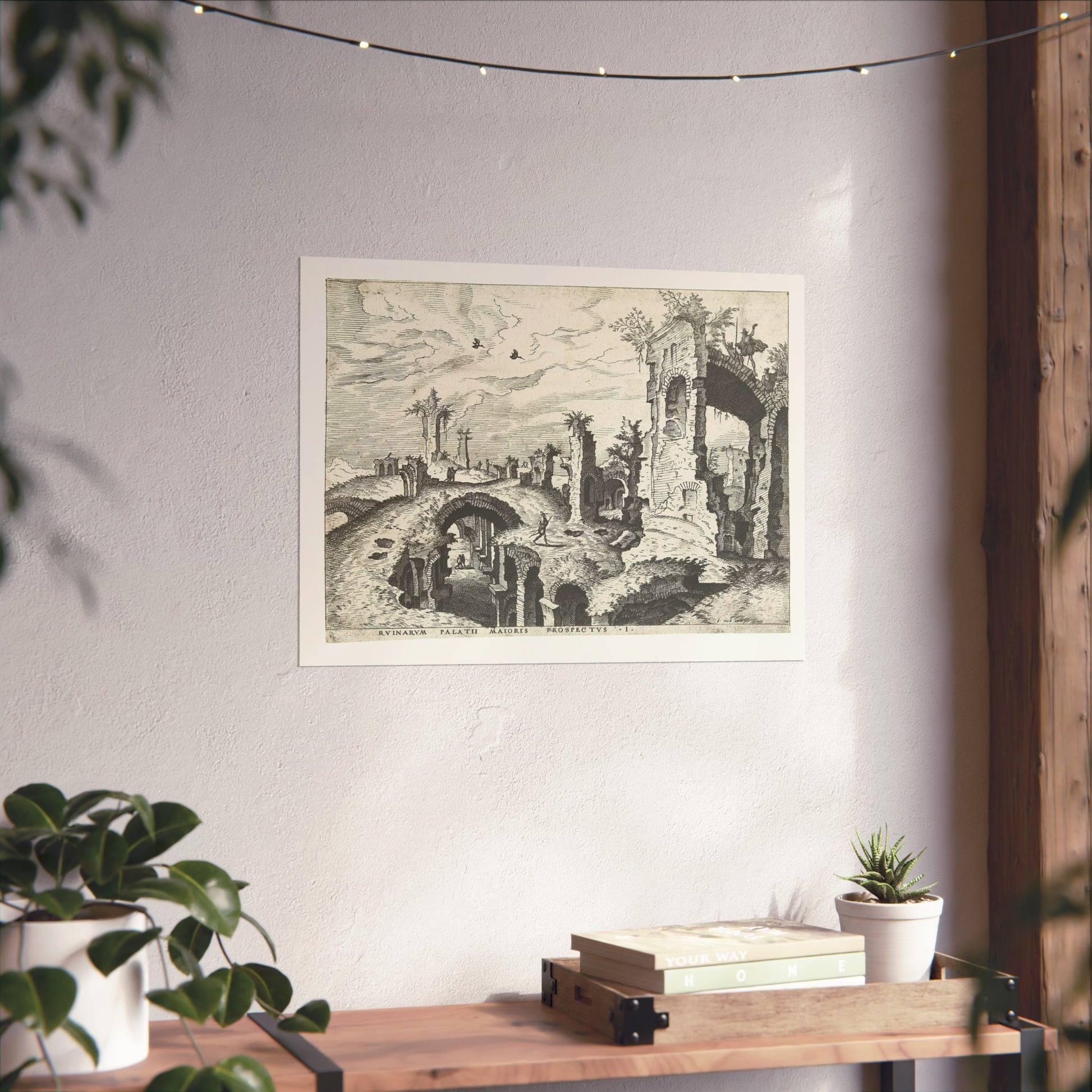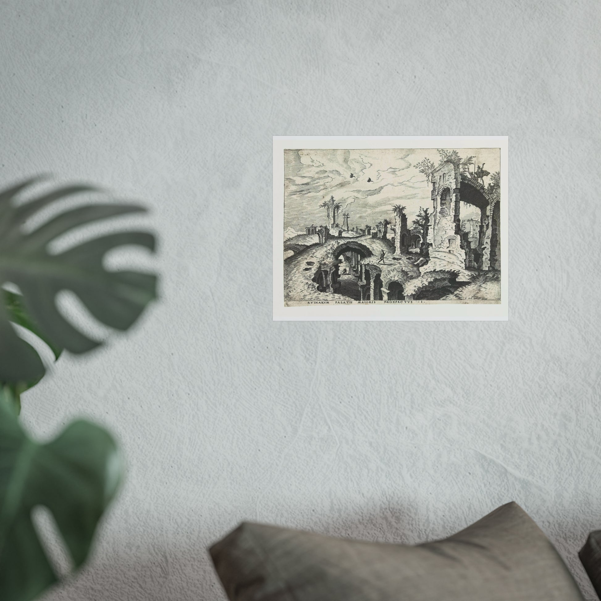 Experience the majestic remnants of Roman architecture on the Palatine Hill in Rome through this captivating artwork. Men are seen meandering between these historic structures, while a group daringly ascends a barrel vault to the right. The scene encapsulates the allure of ancient ruins and human curiosity.