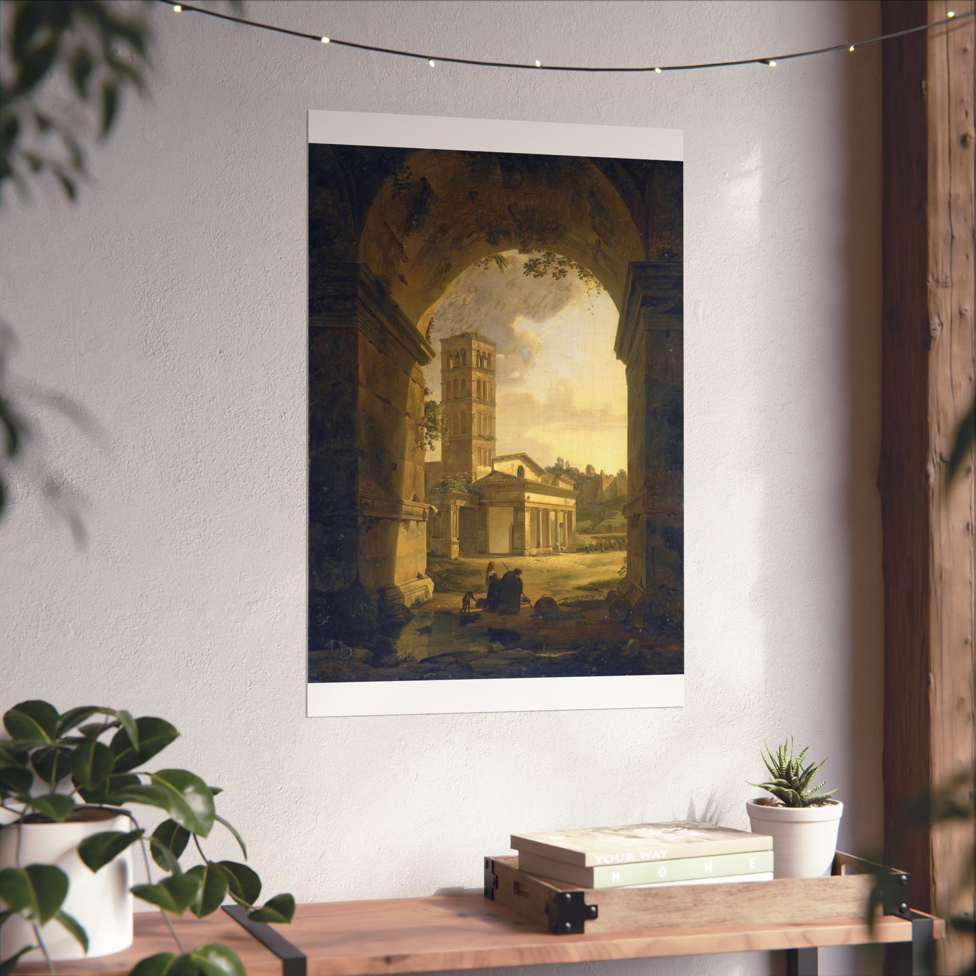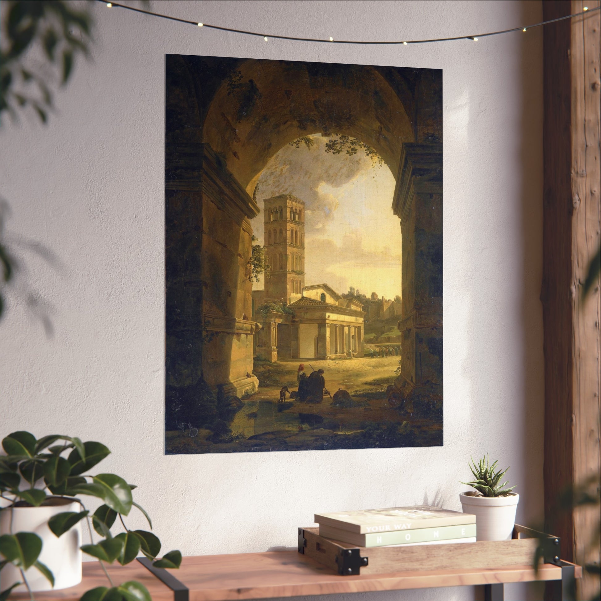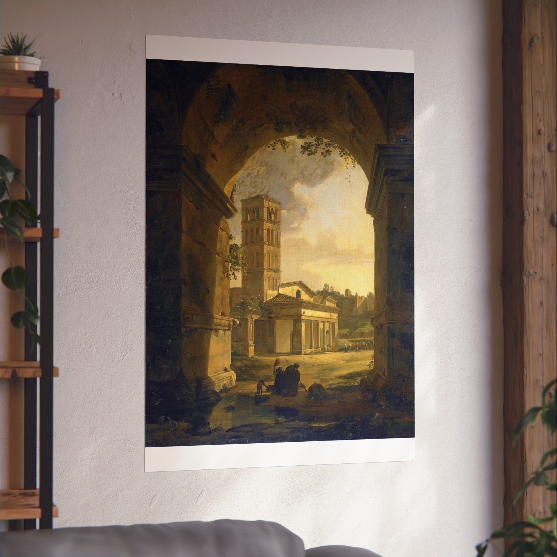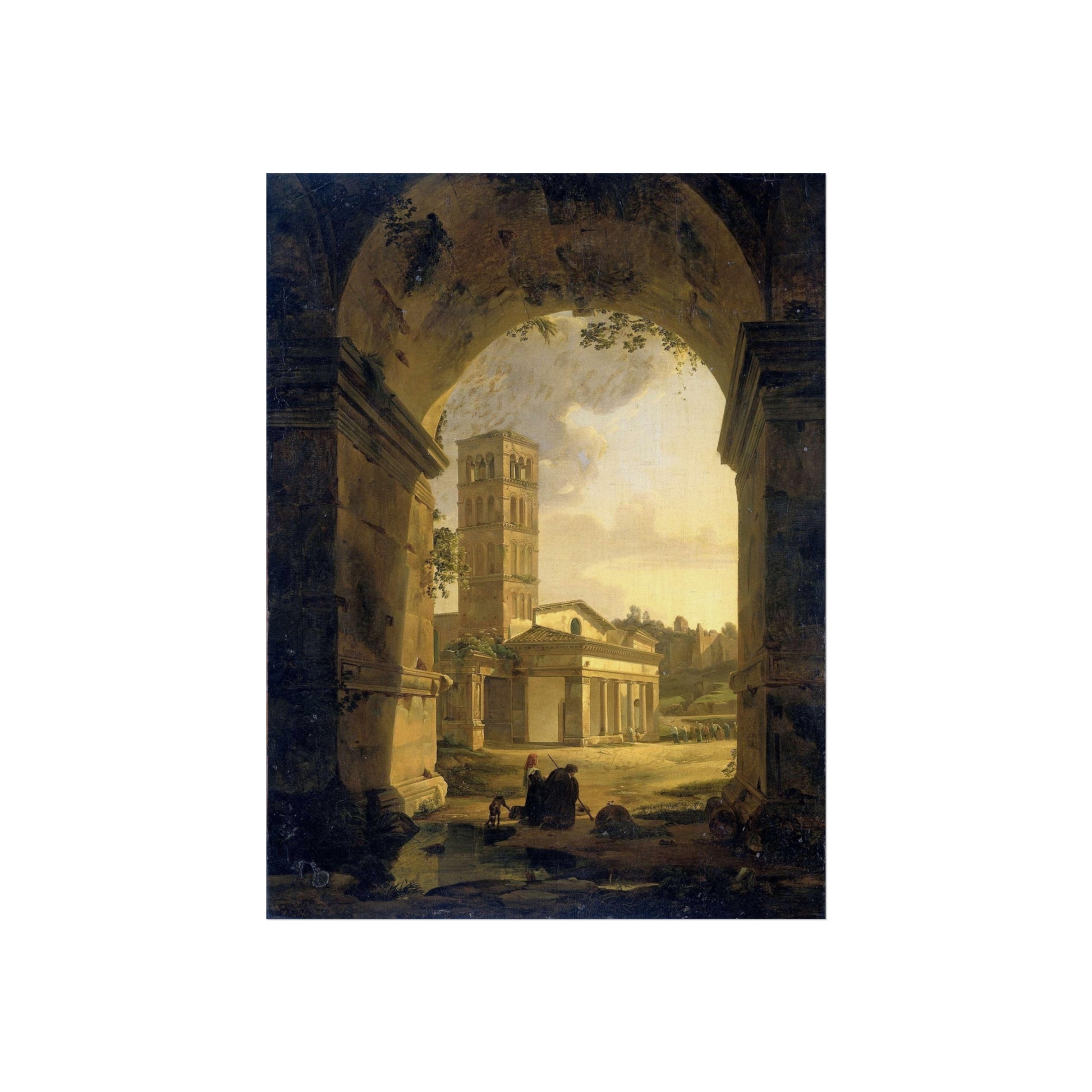 This captivating piece captures a view through the ancient Roman arch of Janus Quadrifrons, focusing on the church of San Giorgio in Velabro in Rome. In the archway, two figures are seen kneeling before a priest who is leading a procession toward the church. The painting beautifully illustrates a moment of reverence and devotion in the heart of Rome.