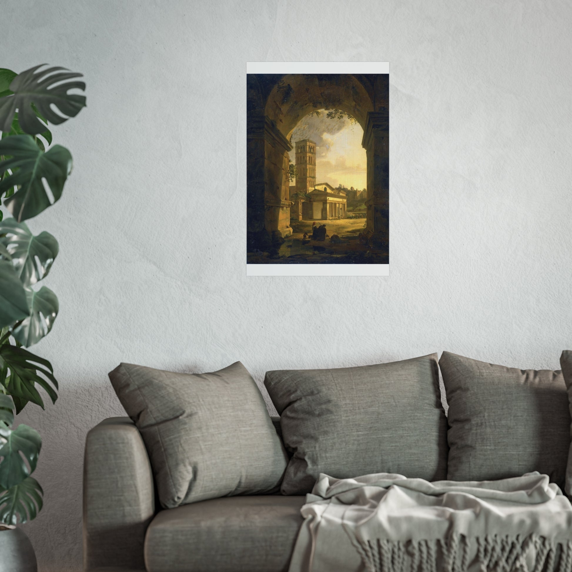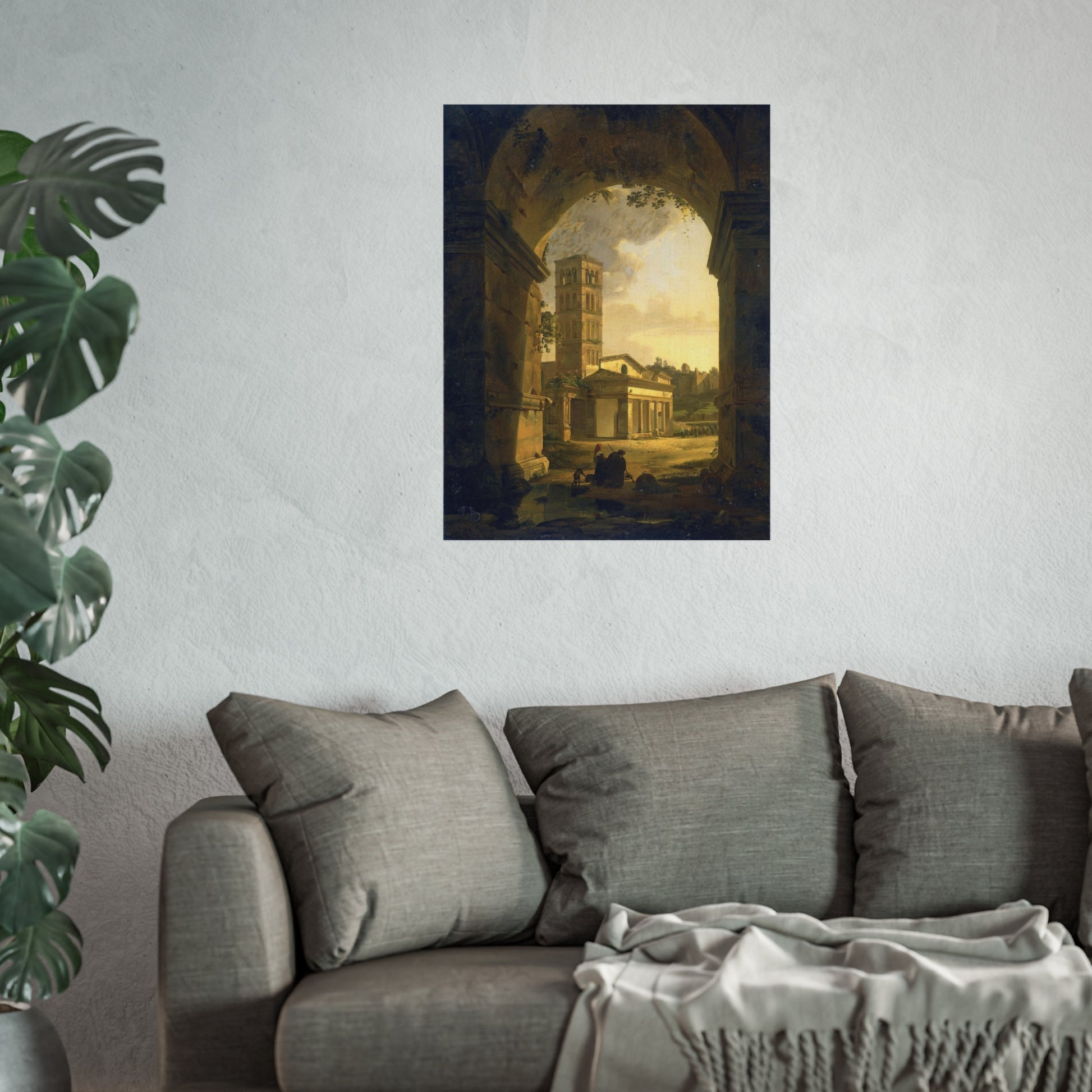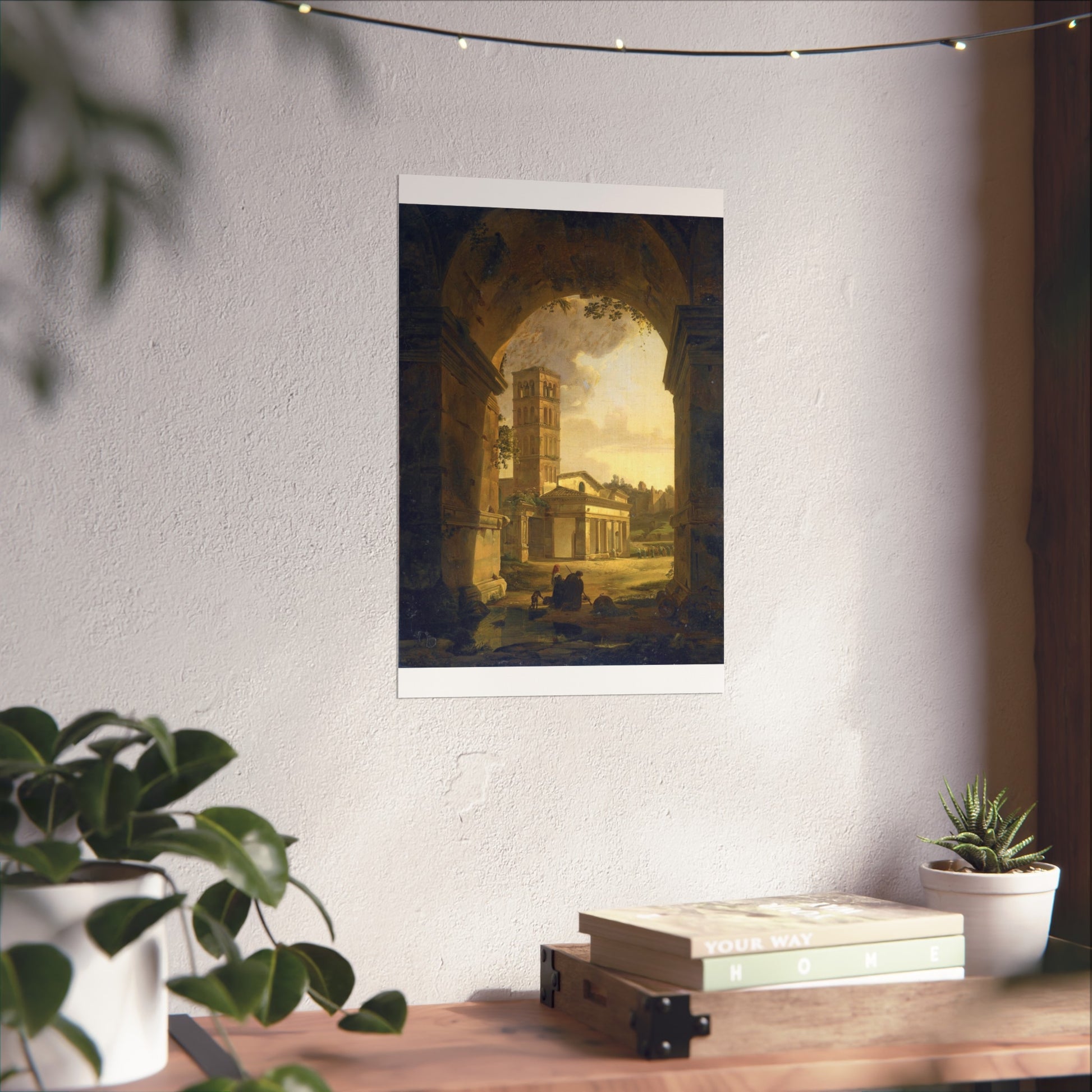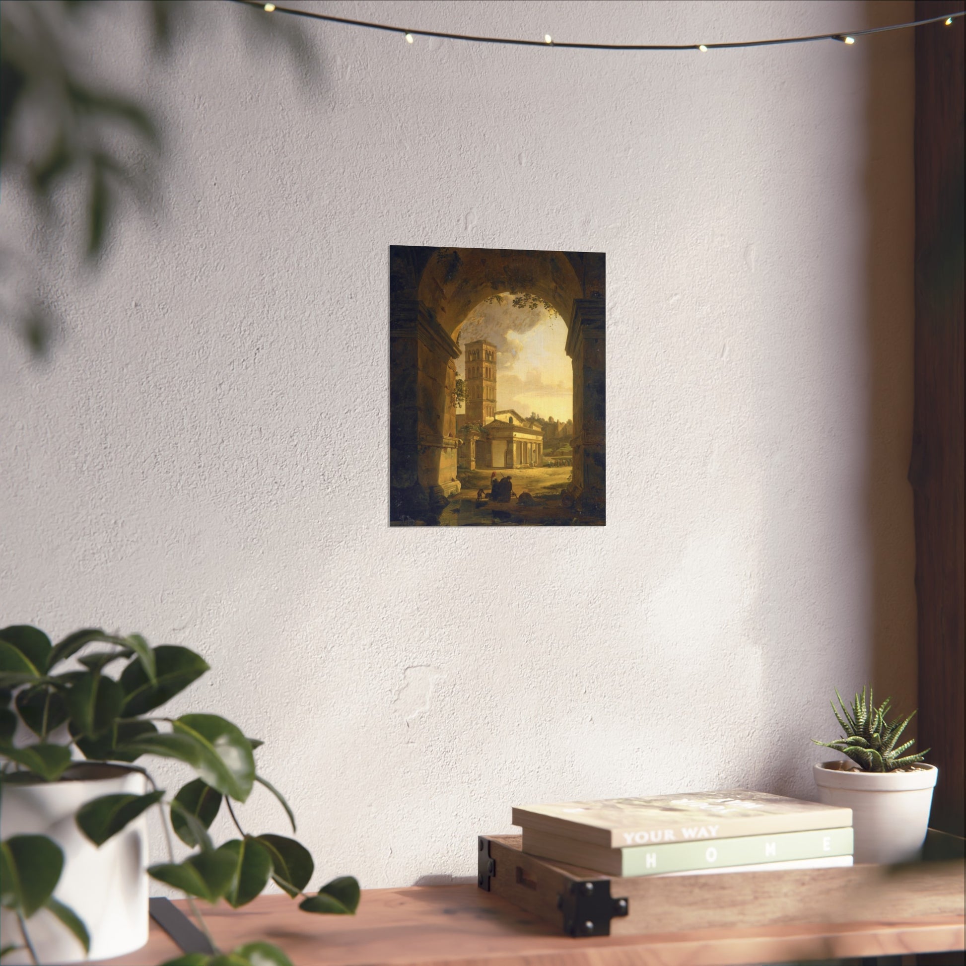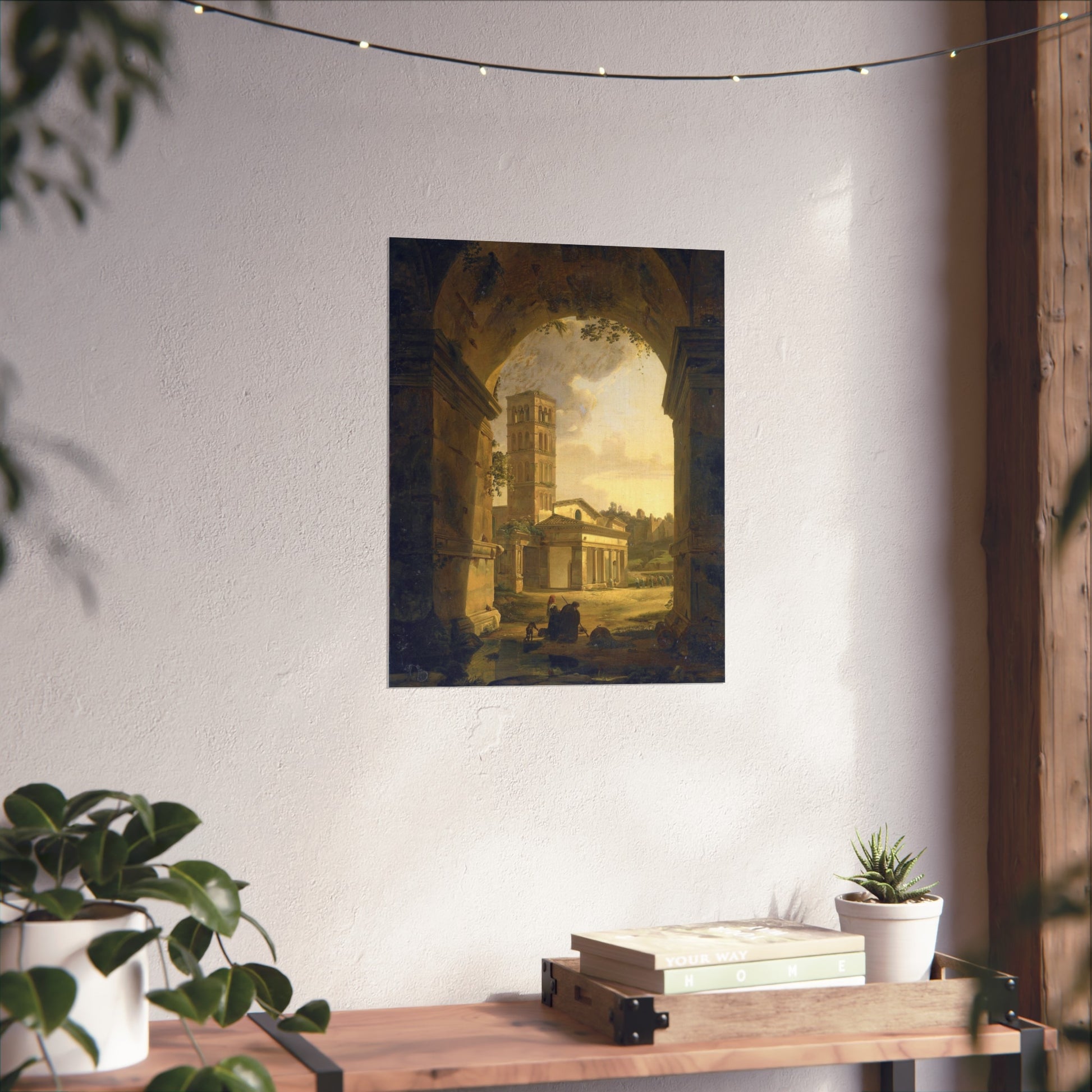 This captivating piece captures a view through the ancient Roman arch of Janus Quadrifrons, focusing on the church of San Giorgio in Velabro in Rome. In the archway, two figures are seen kneeling before a priest who is leading a procession toward the church. The painting beautifully illustrates a moment of reverence and devotion in the heart of Rome.