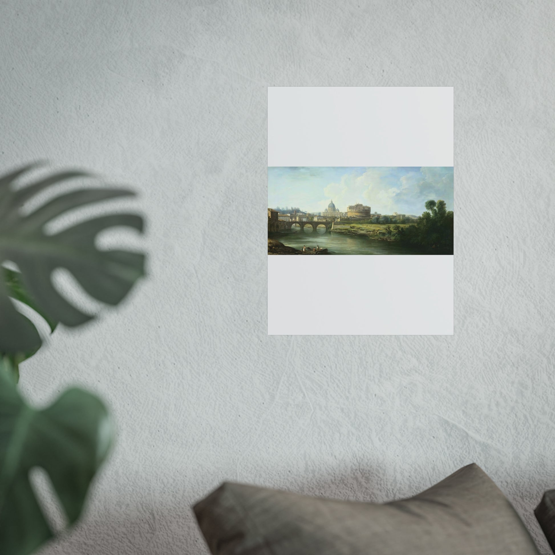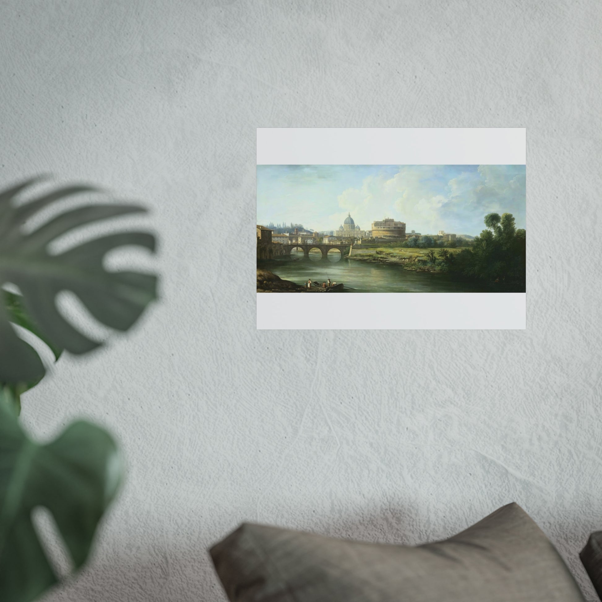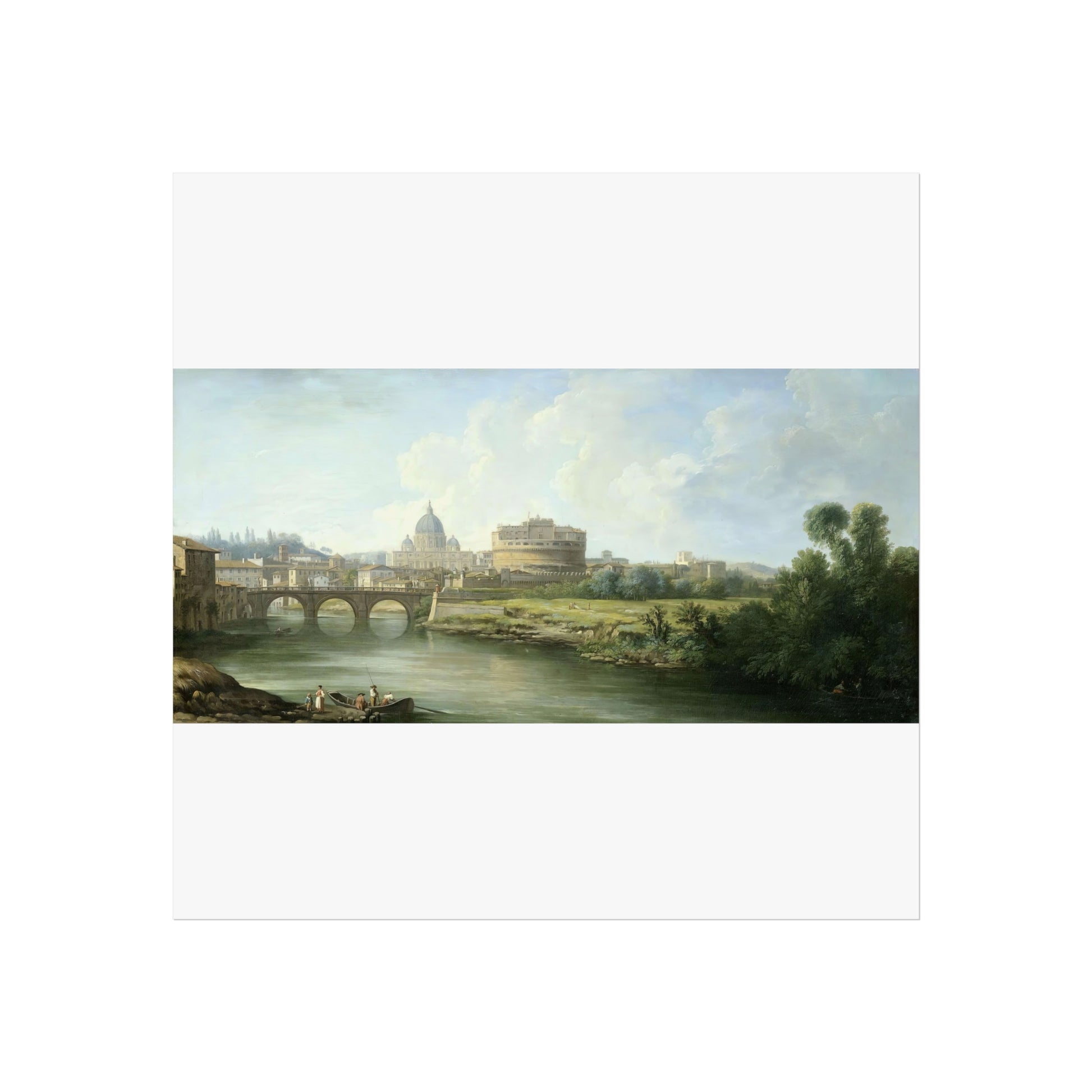 This captivating painting depicts a serene view of the Tiber River in Rome, leading the eye towards the majestic Castel Sant'Angelo and the iconic St. Peter's Basilica. In the foreground, lively figures are seen near a ferry or fishing boat, adding a touch of daily life to the scene. Further back, the Ponte Sant'Angelo gracefully spans the river, connecting both sides of this historic city.