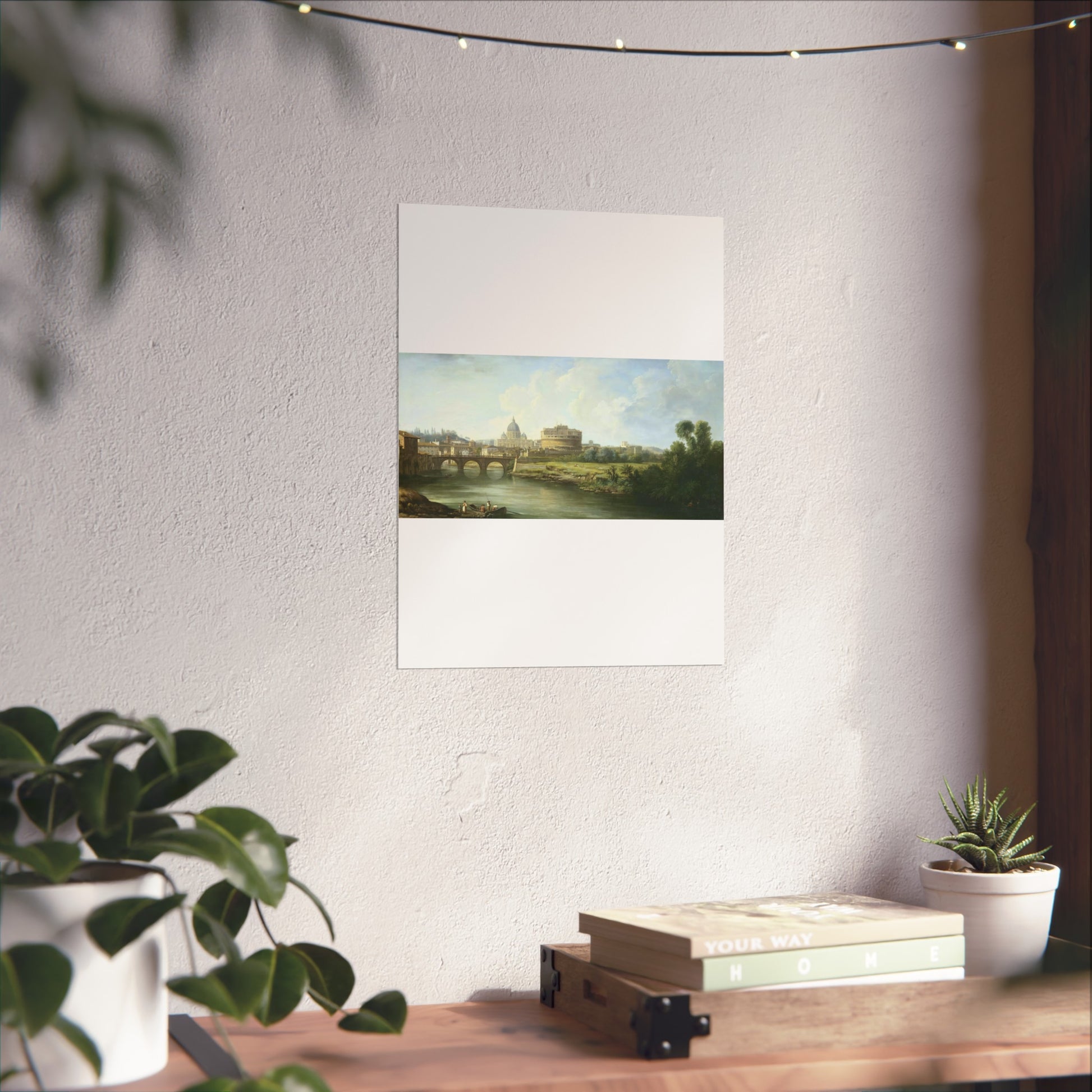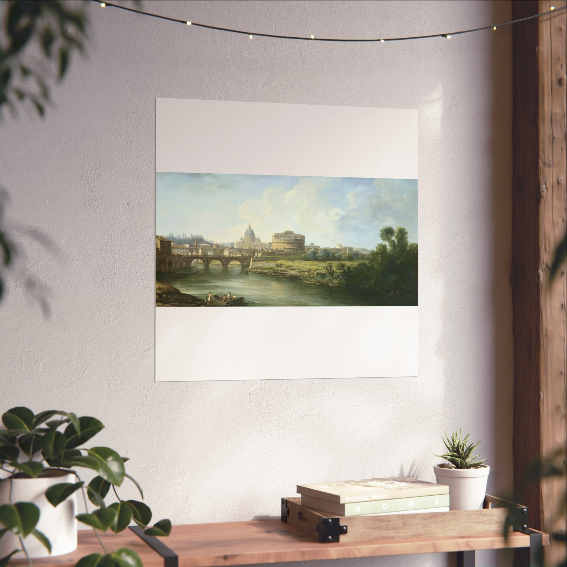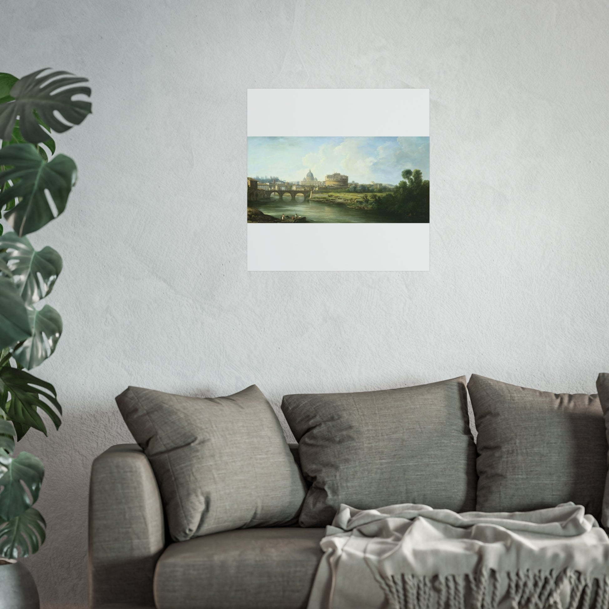 This captivating painting depicts a serene view of the Tiber River in Rome, leading the eye towards the majestic Castel Sant'Angelo and the iconic St. Peter's Basilica. In the foreground, lively figures are seen near a ferry or fishing boat, adding a touch of daily life to the scene. Further back, the Ponte Sant'Angelo gracefully spans the river, connecting both sides of this historic city.