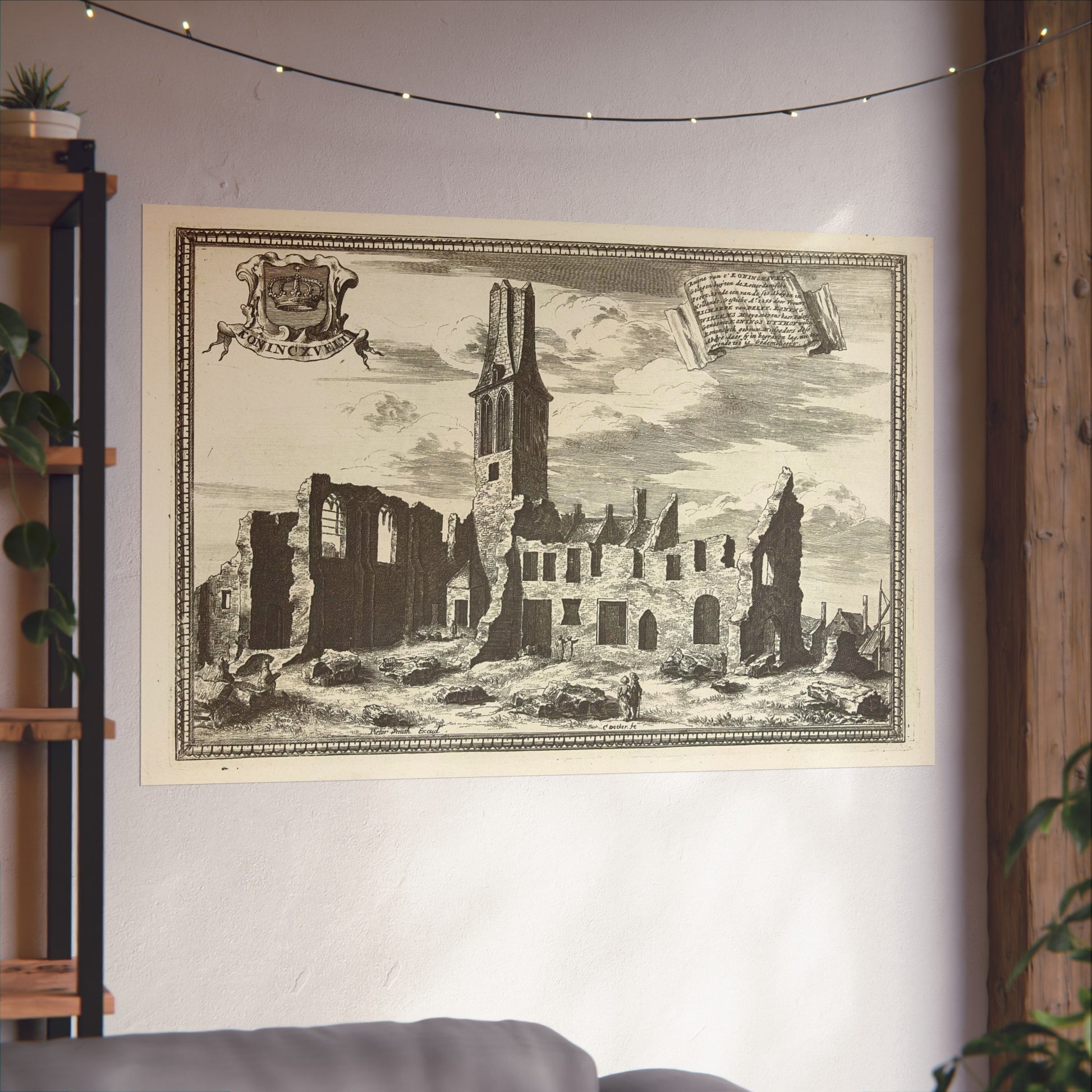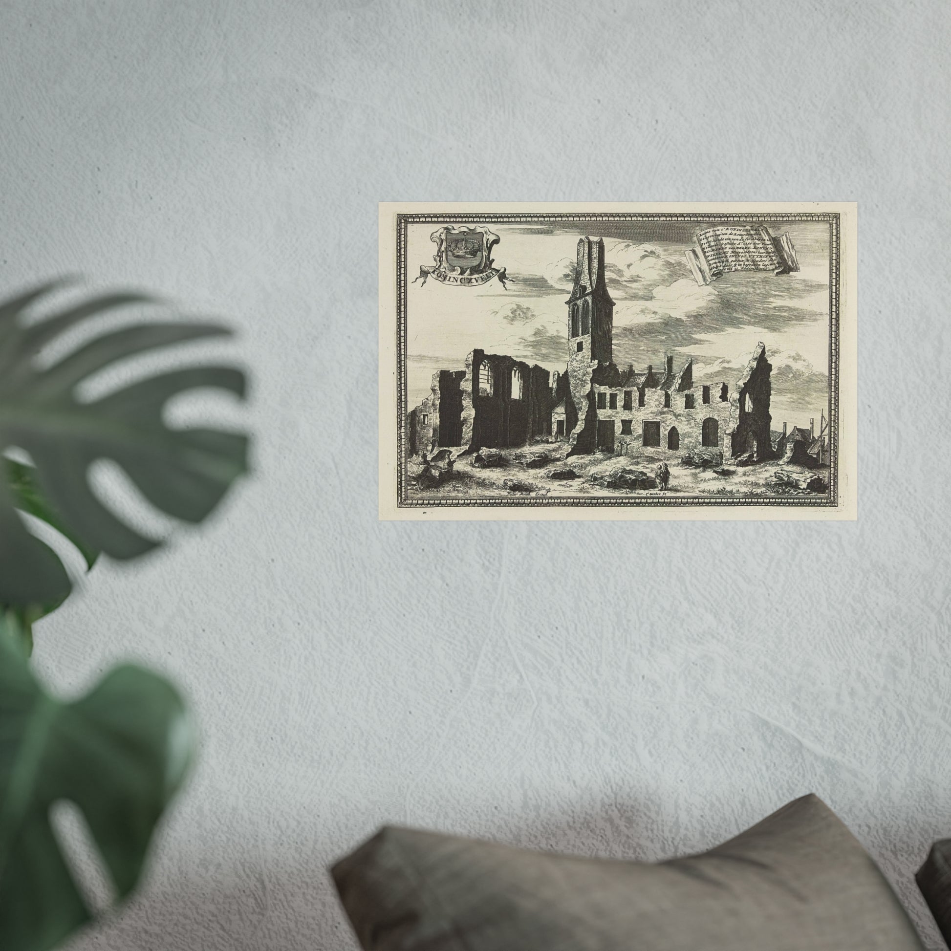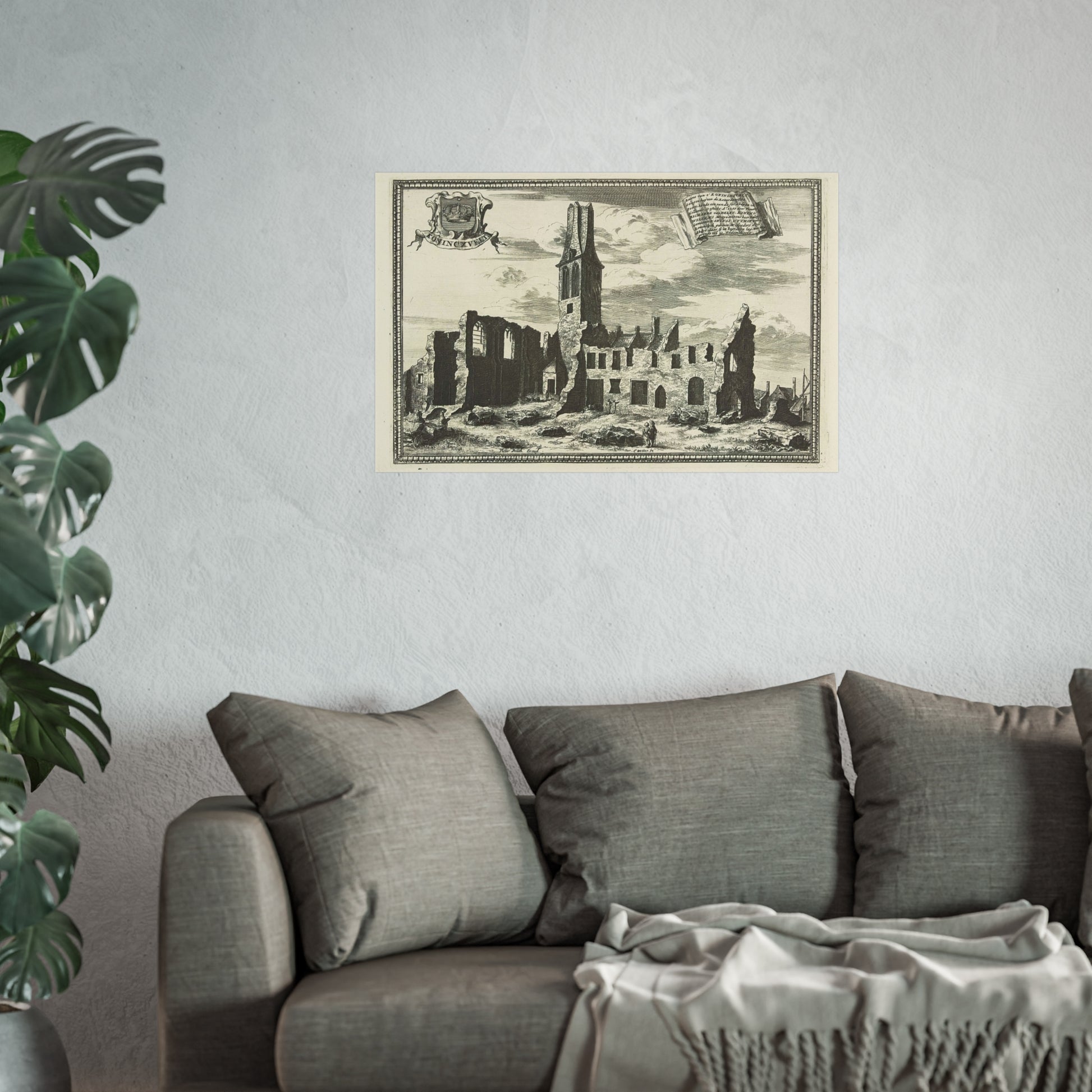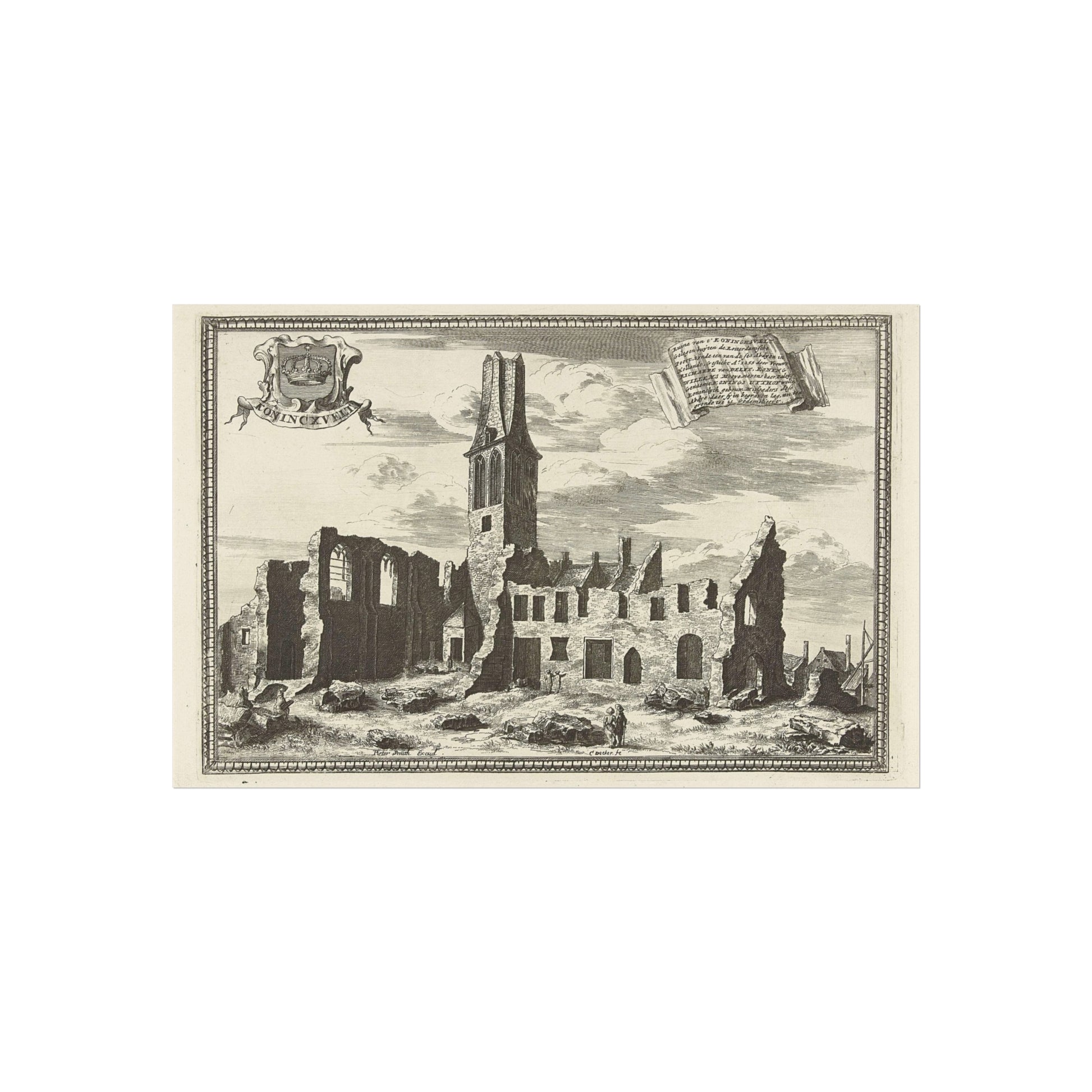 Behold the remnants of the once grand Koningsveld Monastery, tragically destroyed in 1572, nestled near Delft. The top left features a title and a coat of arms crowned with regality. The top right unfurls a banner, revealing intriguing details about the ruins.
