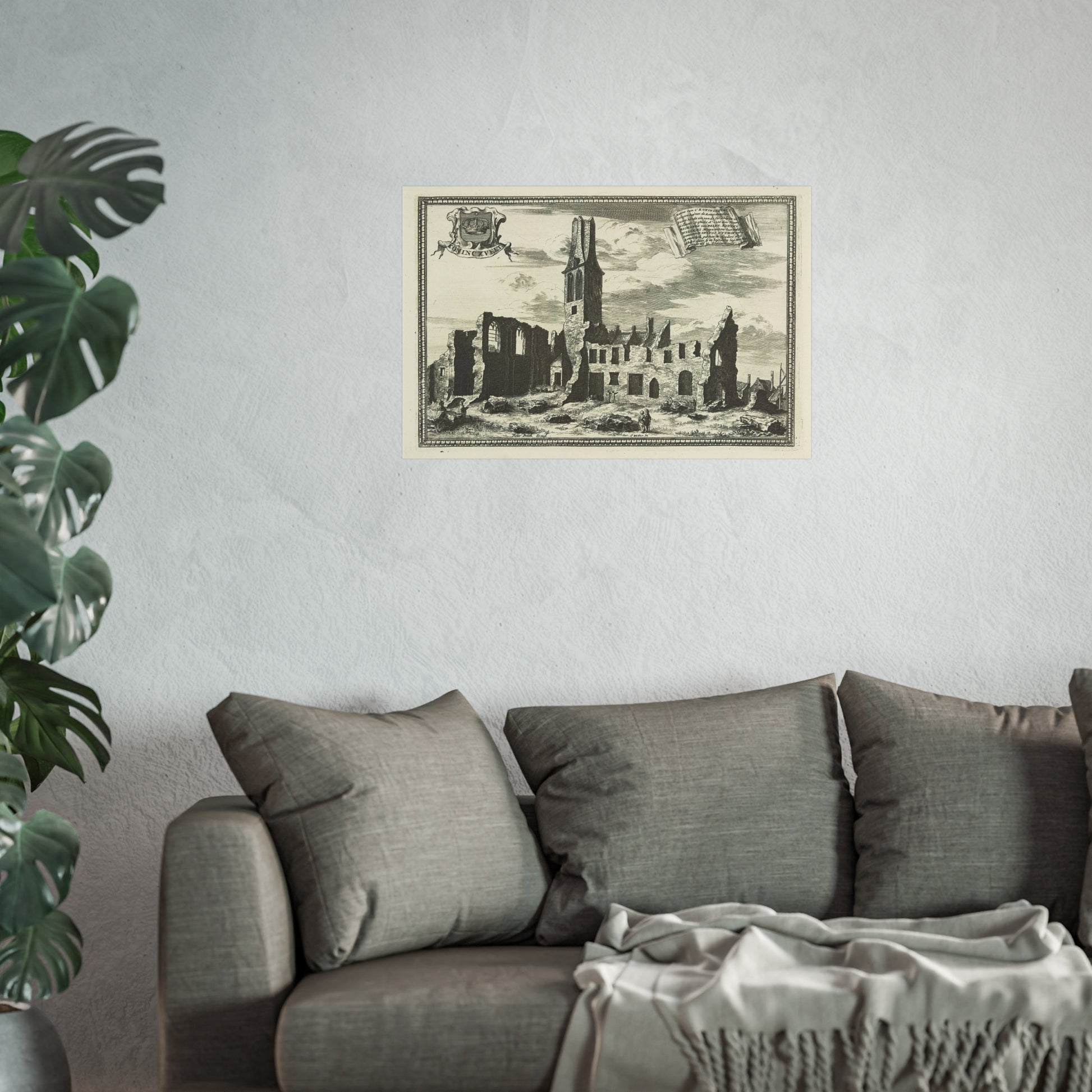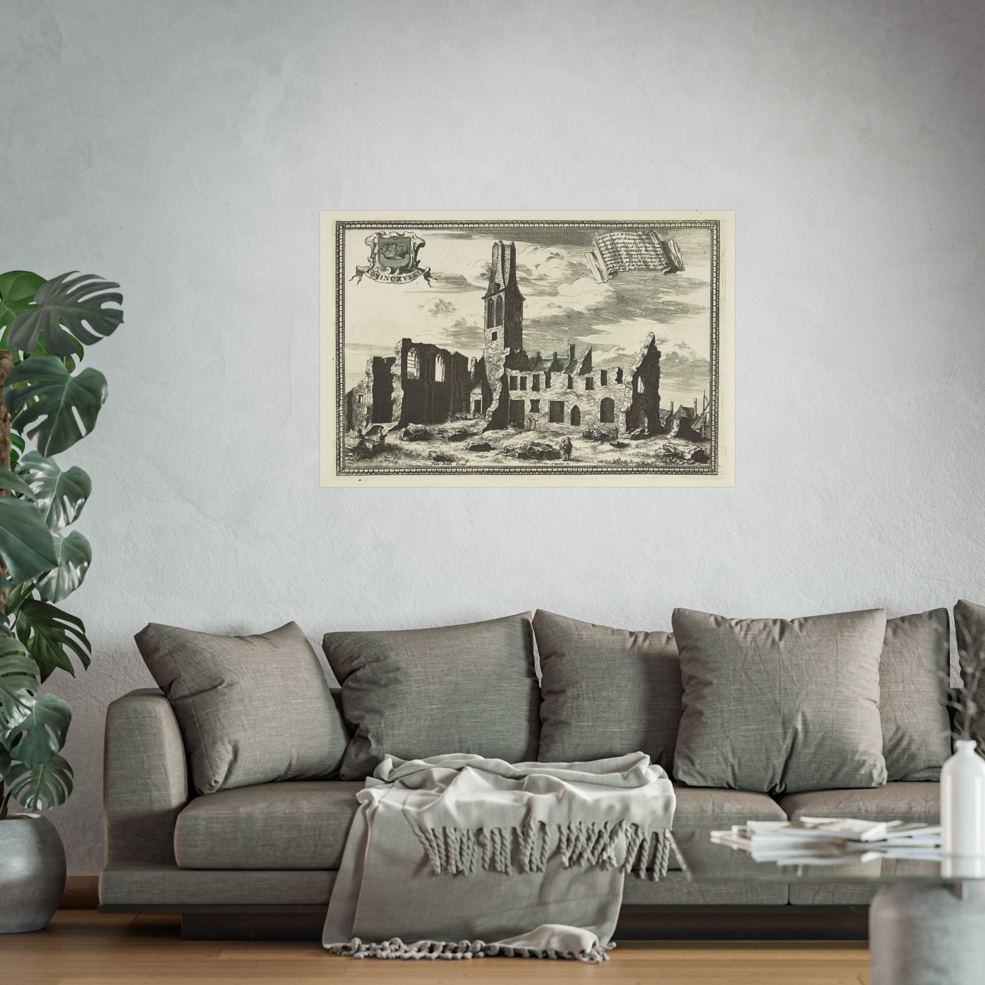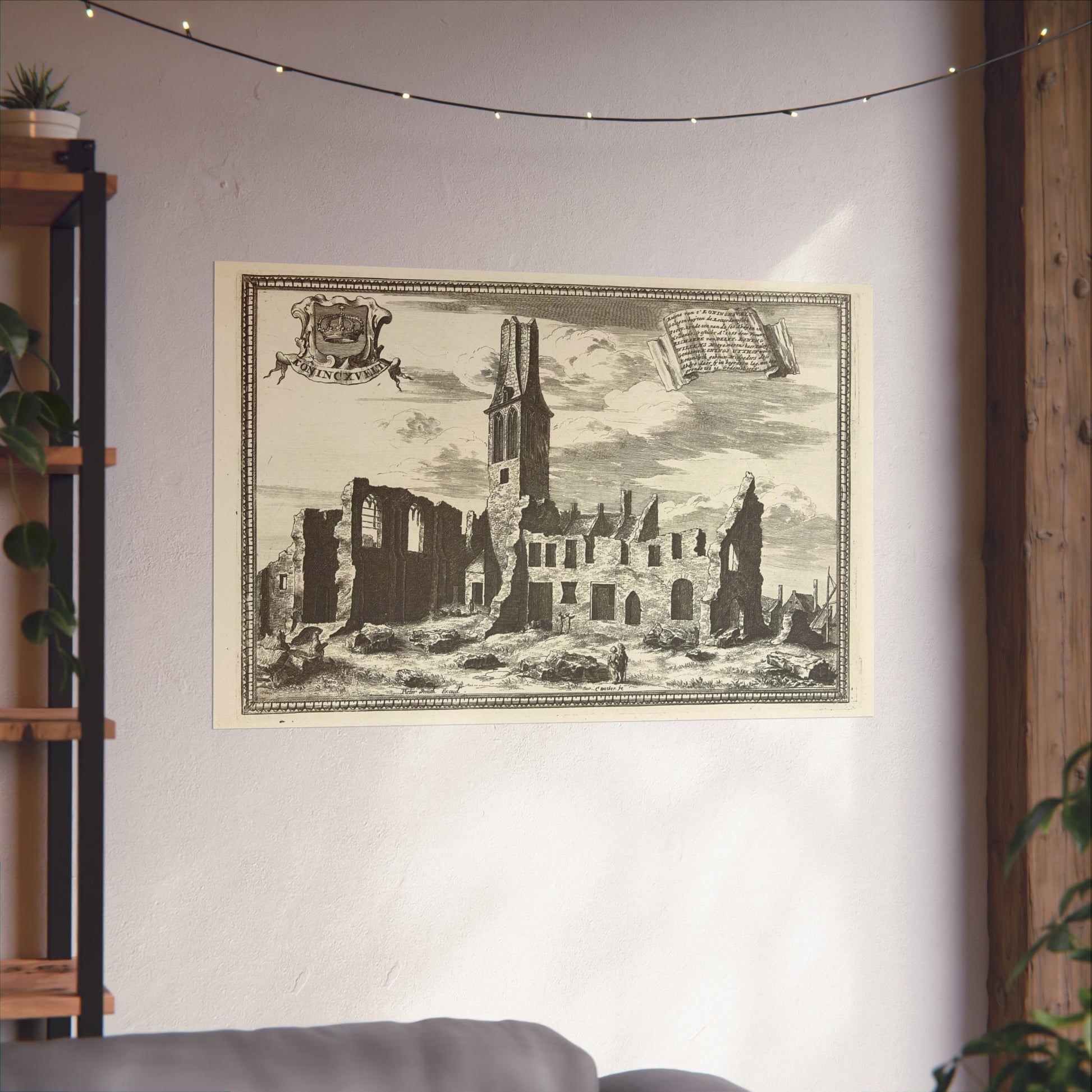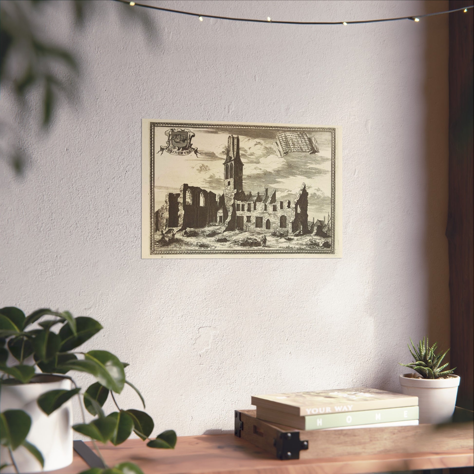 Behold the remnants of the once grand Koningsveld Monastery, tragically destroyed in 1572, nestled near Delft. The top left features a title and a coat of arms crowned with regality. The top right unfurls a banner, revealing intriguing details about the ruins.