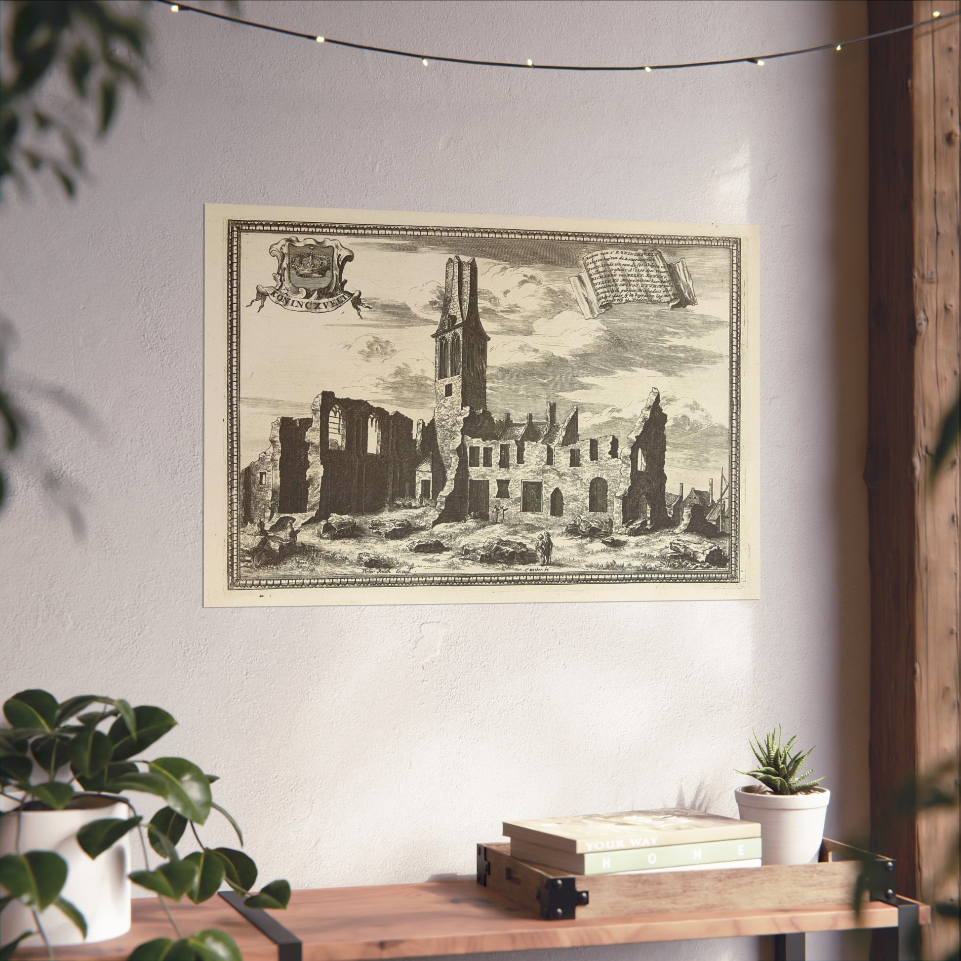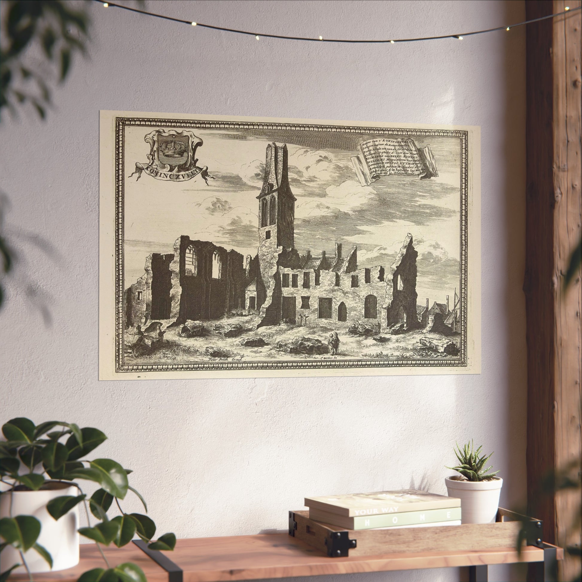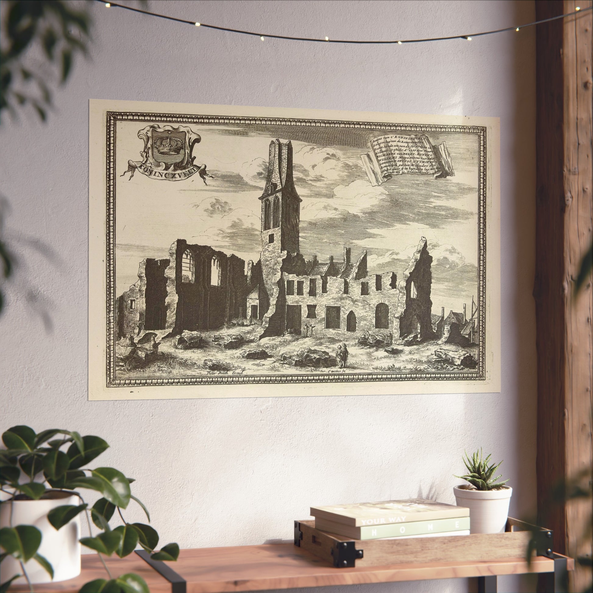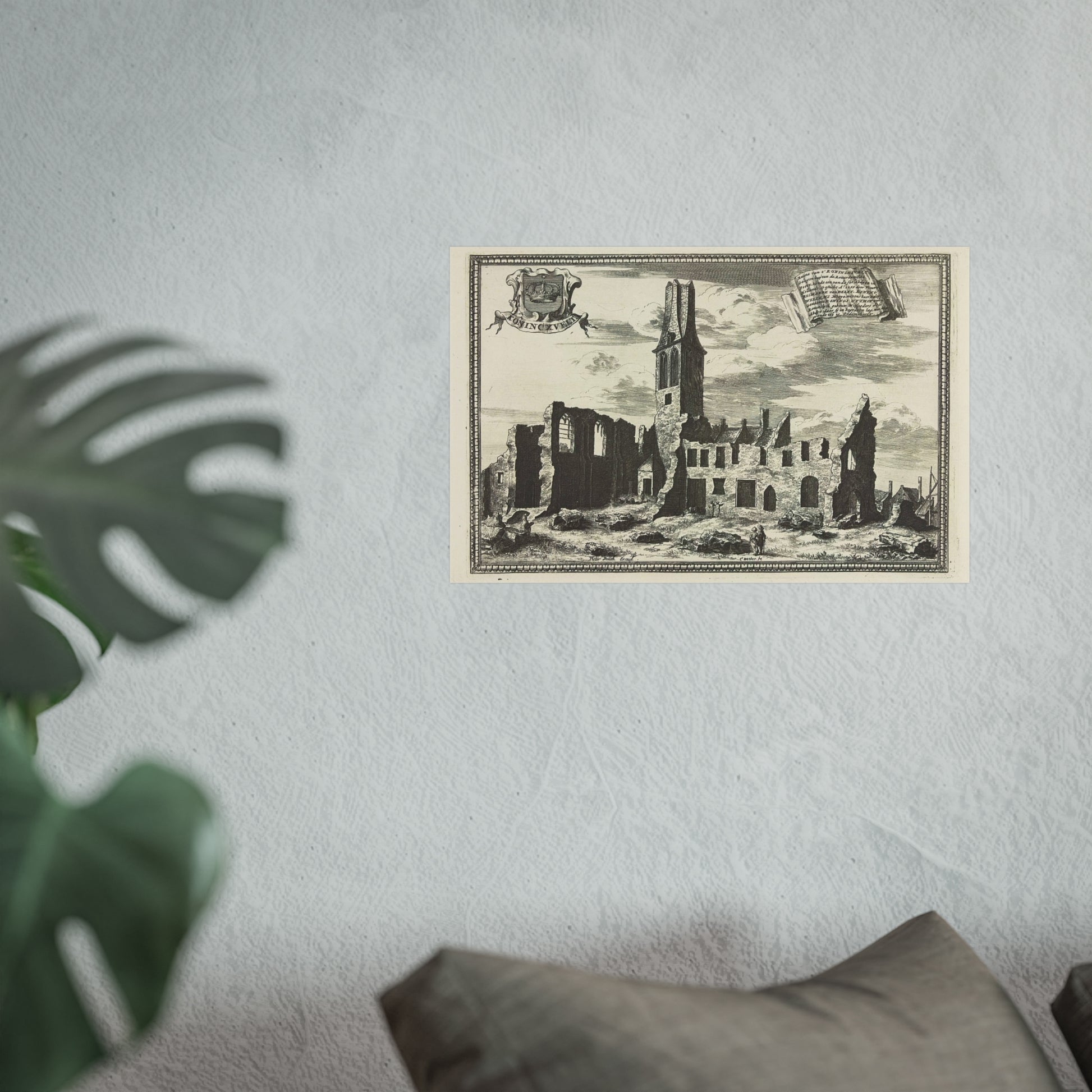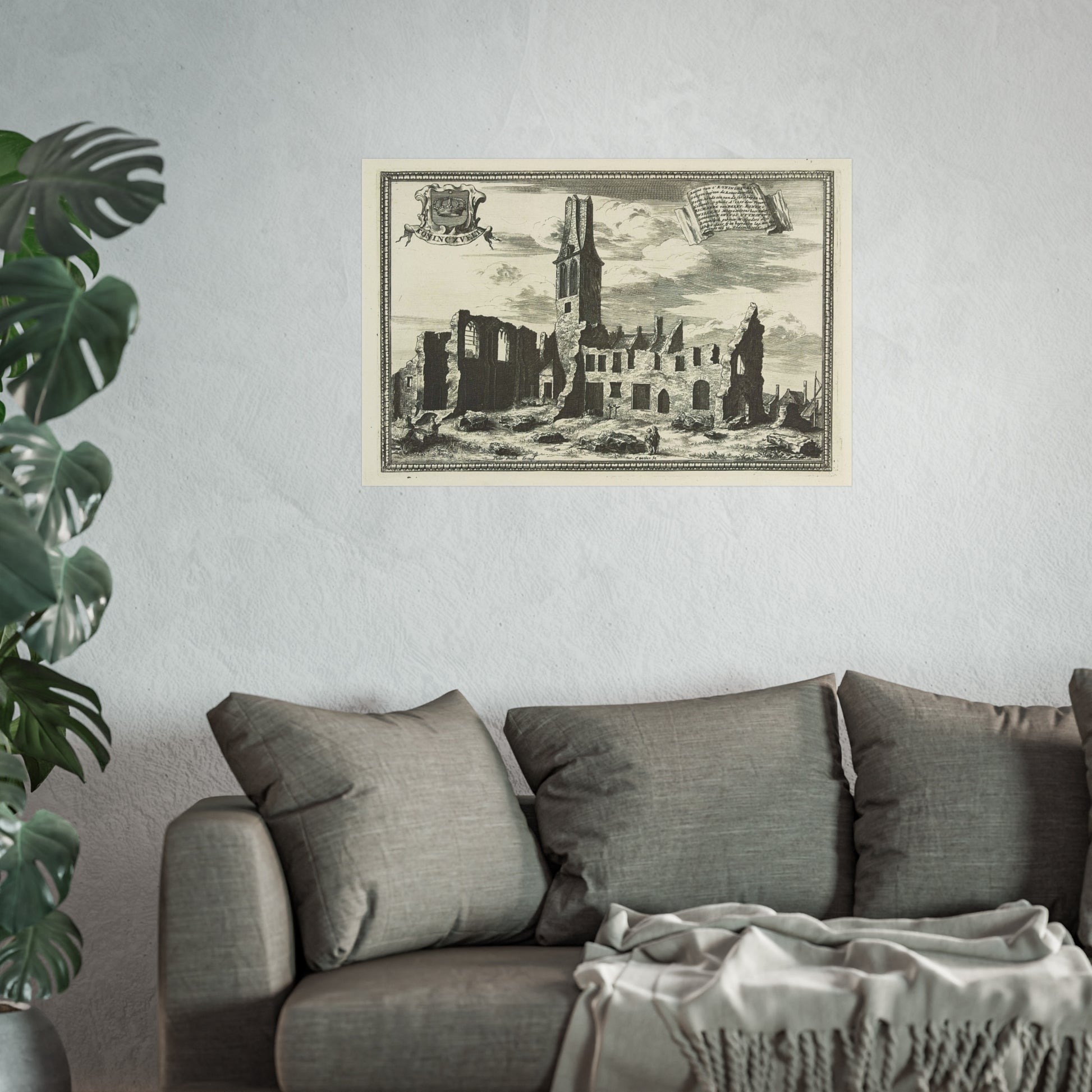 Behold the remnants of the once grand Koningsveld Monastery, tragically destroyed in 1572, nestled near Delft. The top left features a title and a coat of arms crowned with regality. The top right unfurls a banner, revealing intriguing details about the ruins.