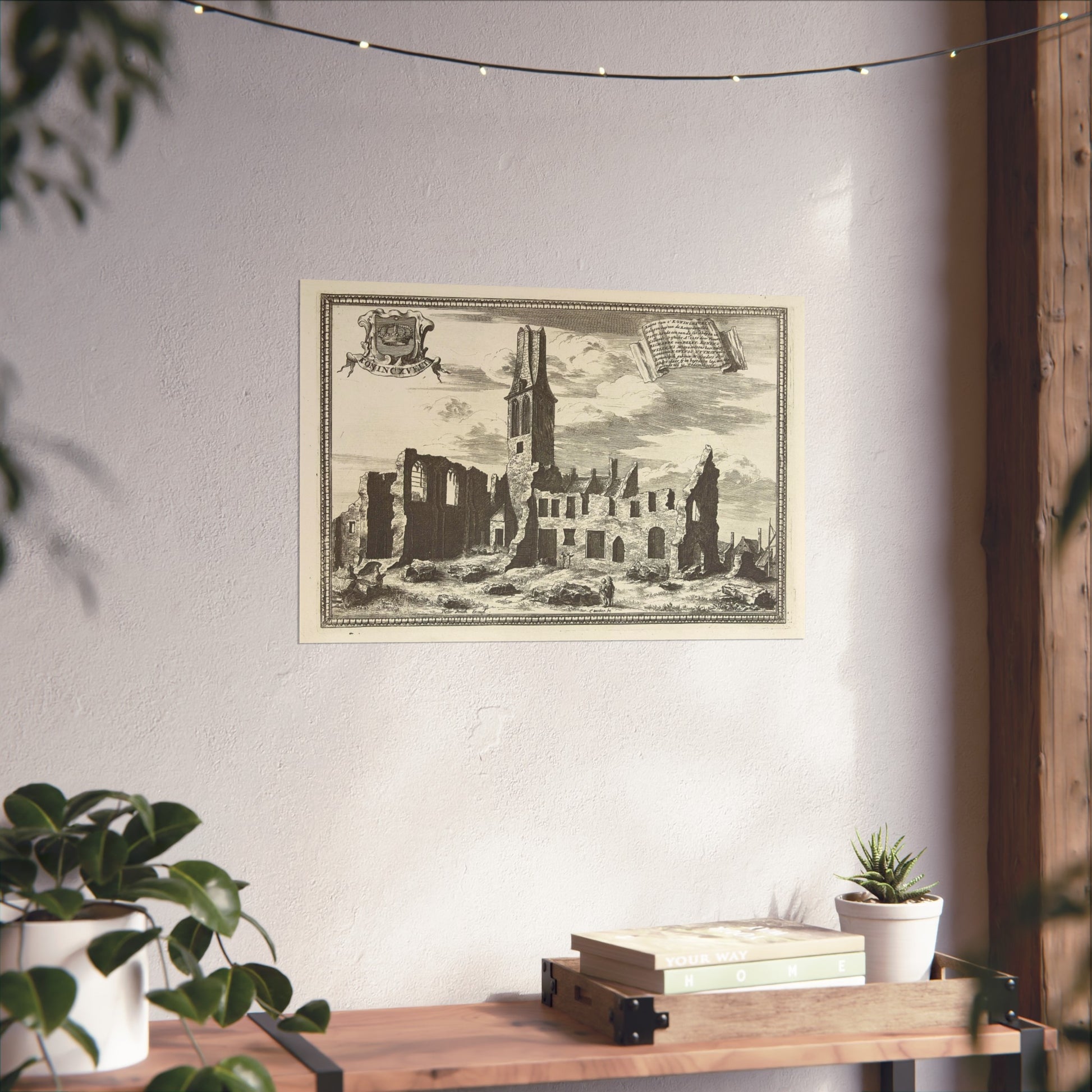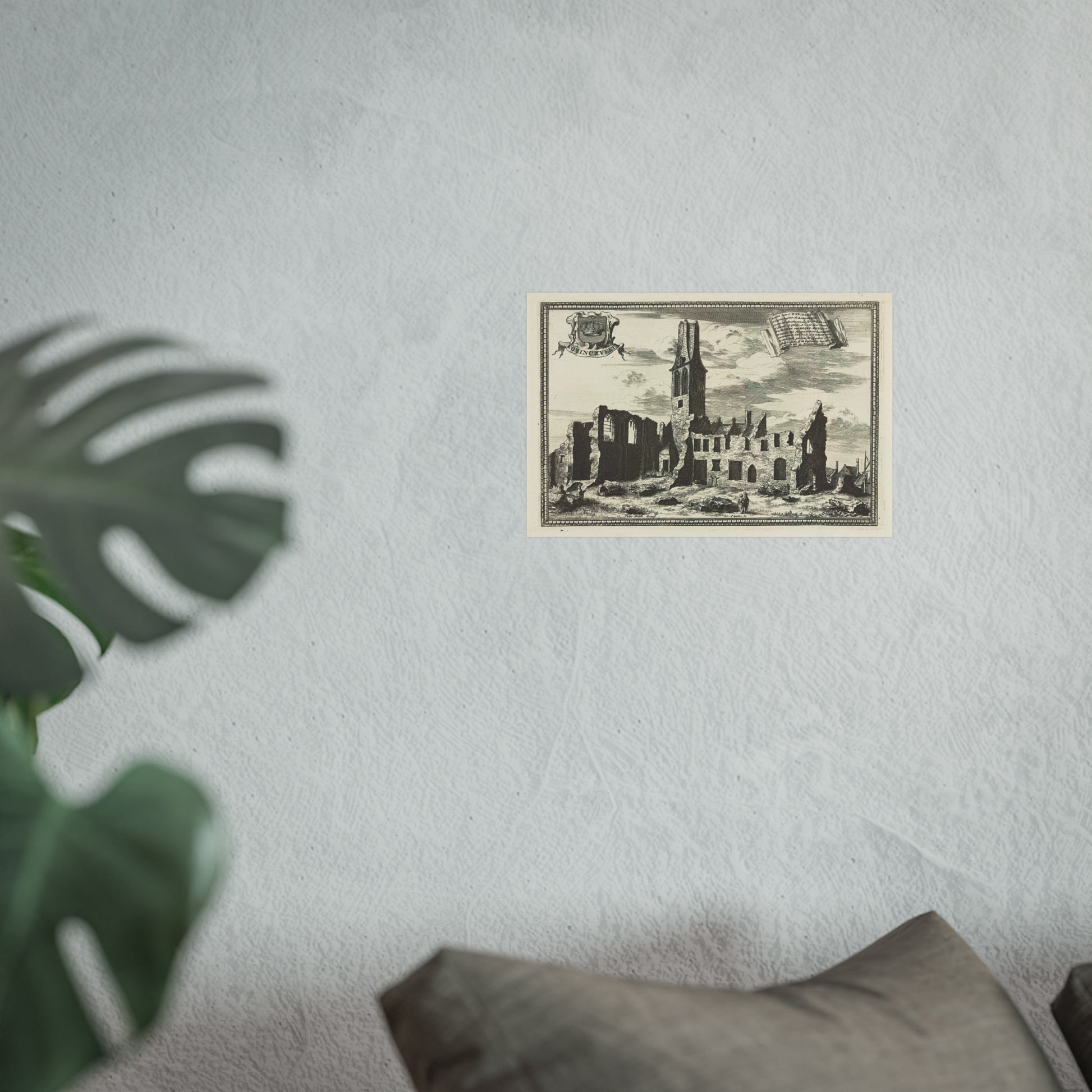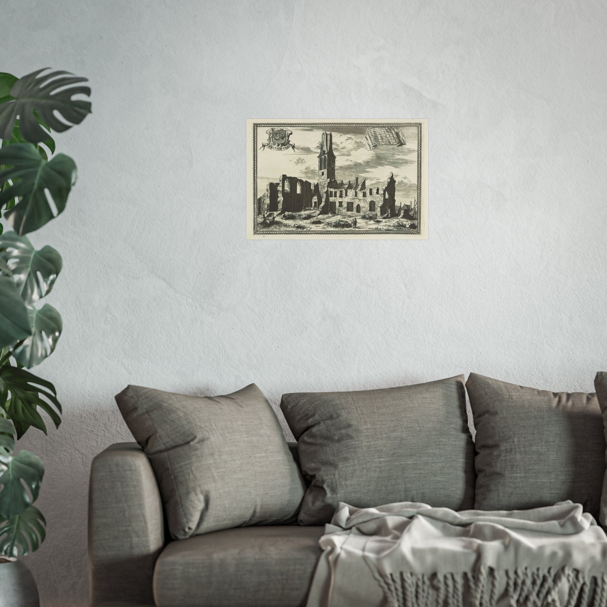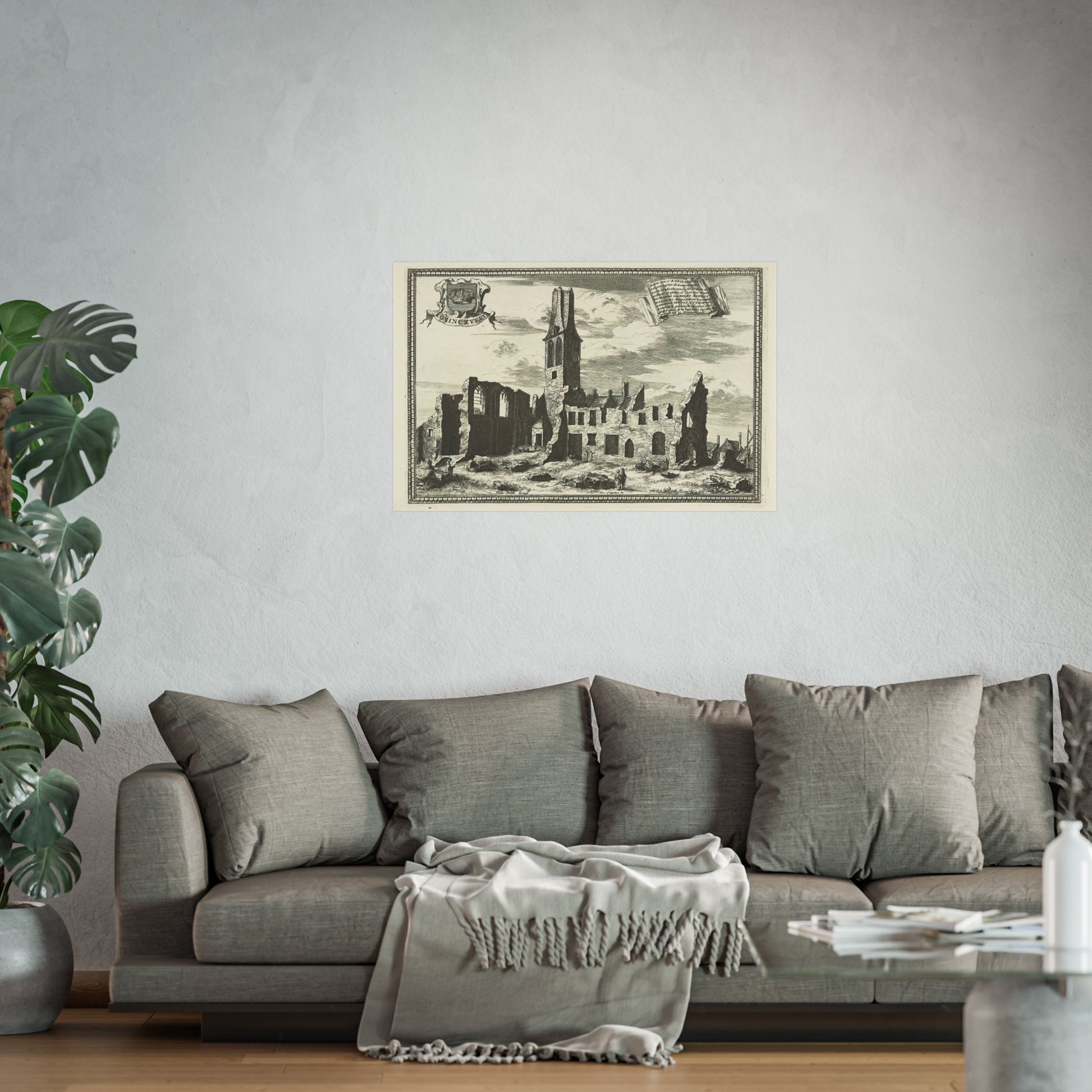 Behold the remnants of the once grand Koningsveld Monastery, tragically destroyed in 1572, nestled near Delft. The top left features a title and a coat of arms crowned with regality. The top right unfurls a banner, revealing intriguing details about the ruins.