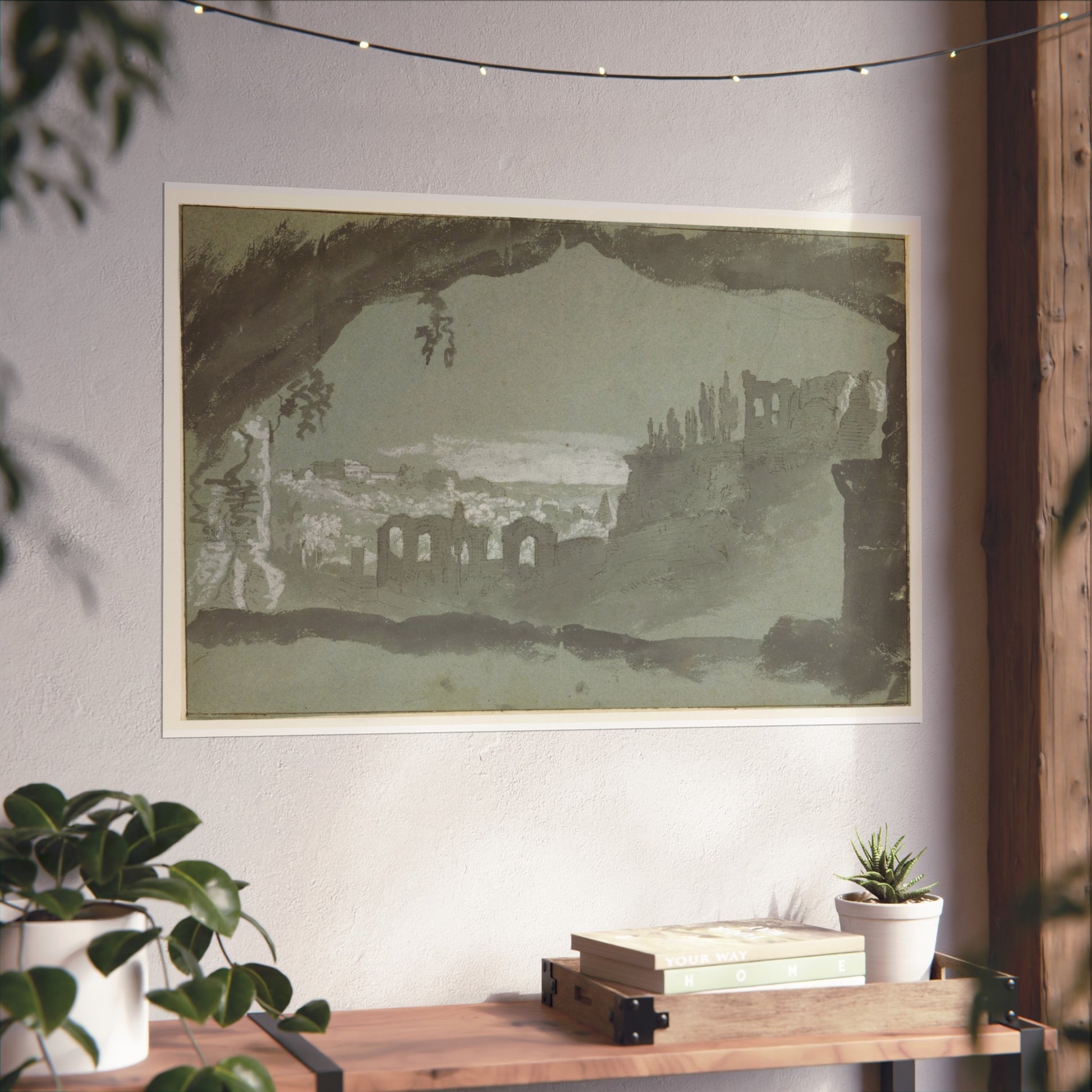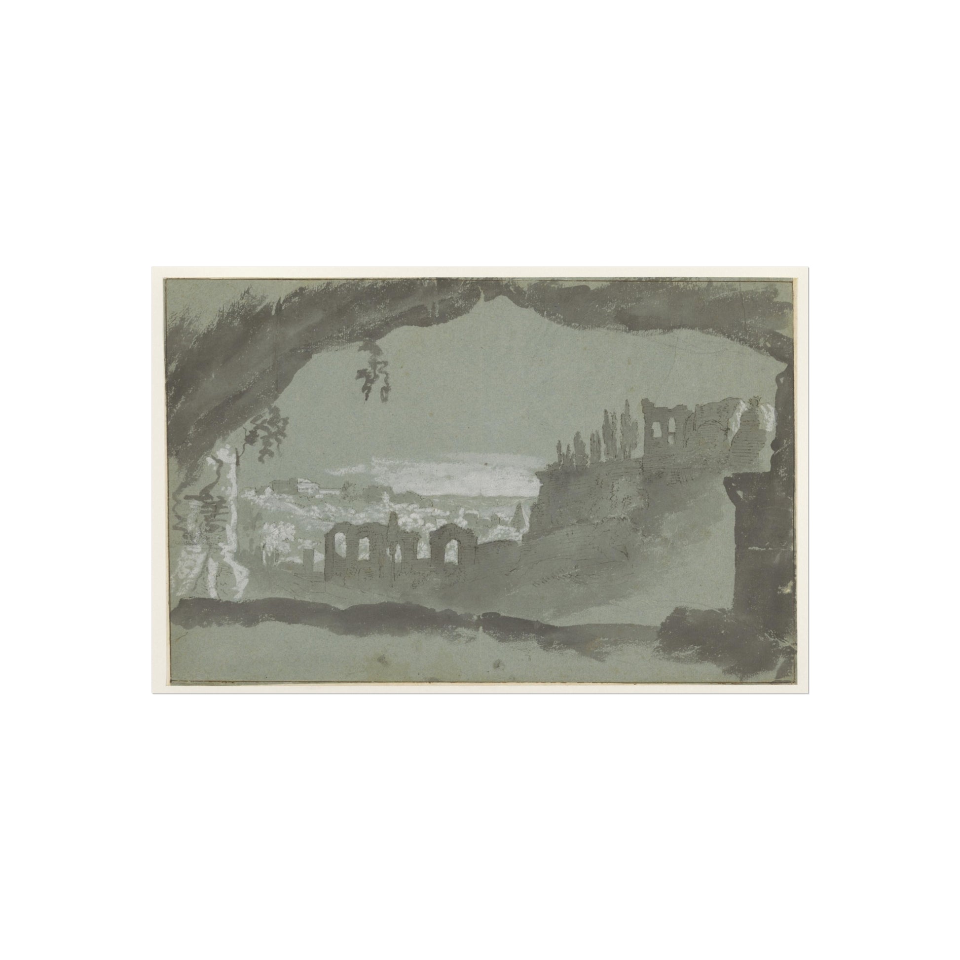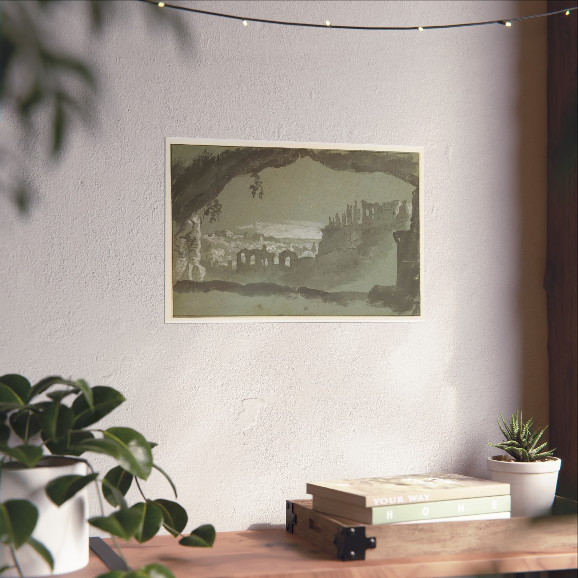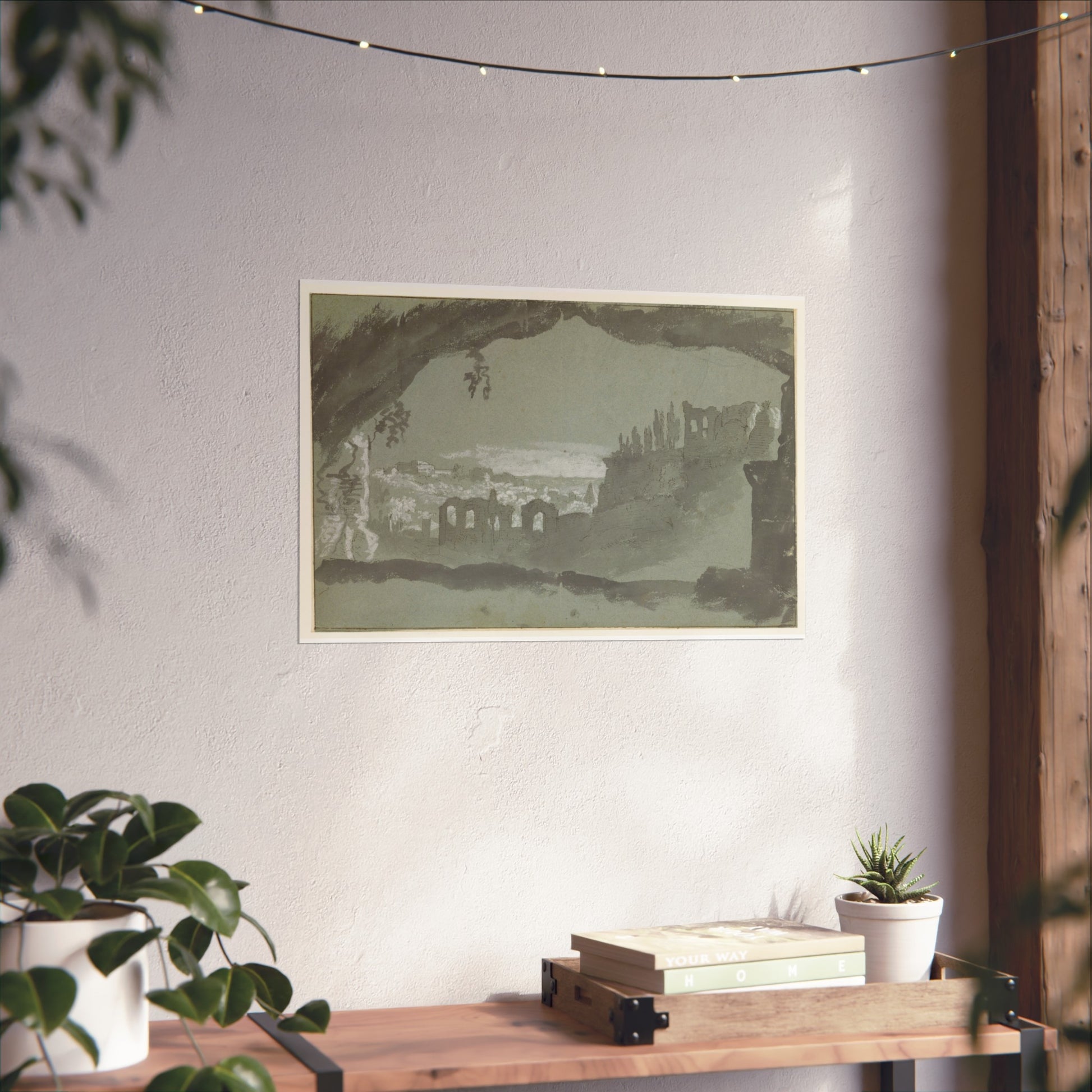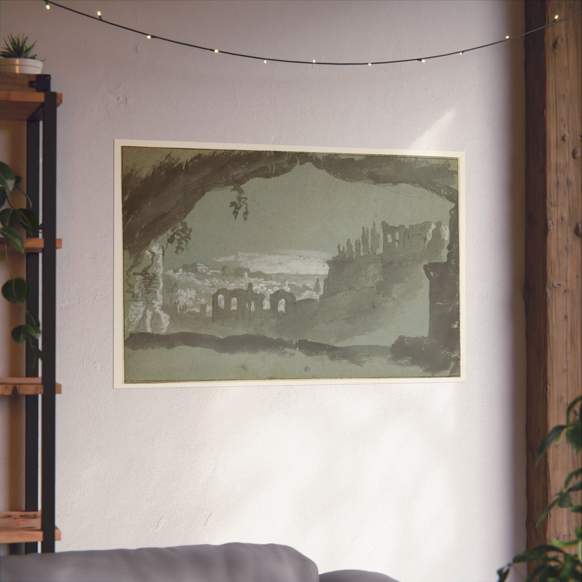 Behold the captivating panorama of Rome, featuring the majestic ruins of the palace on the Palatine Hill. To the left, your eyes will be drawn to the historic Santa Saba, while to the right, you can't miss the iconic Porta and Pyramid of Cestius. This artwork is an evocative journey through time, immersing you in the grandeur of ancient Rome.