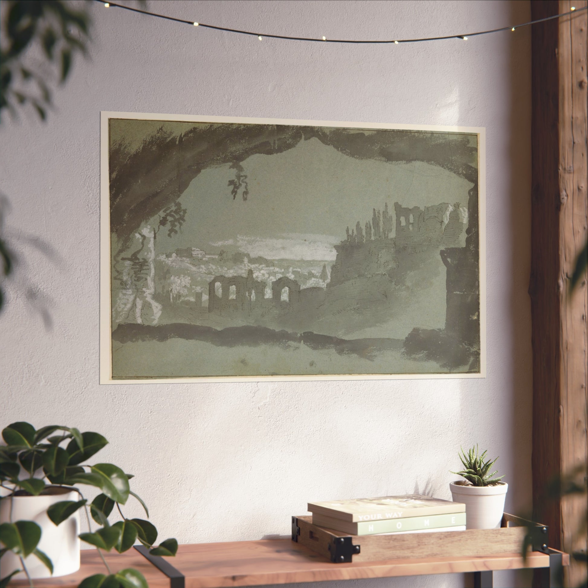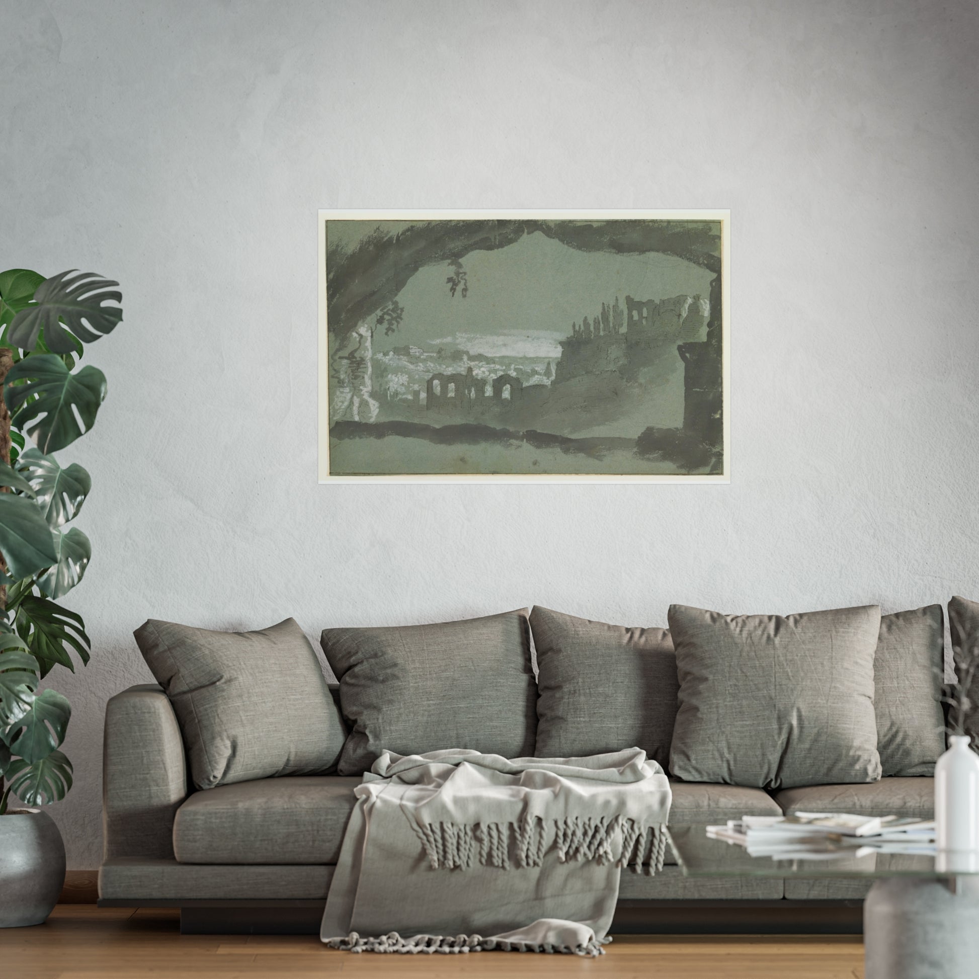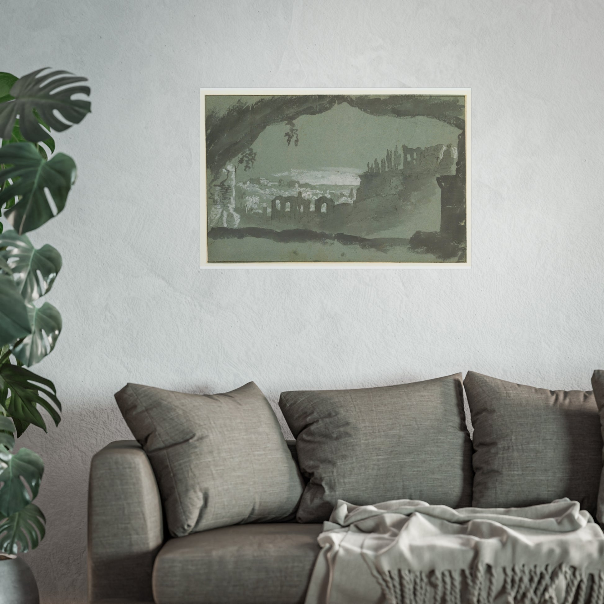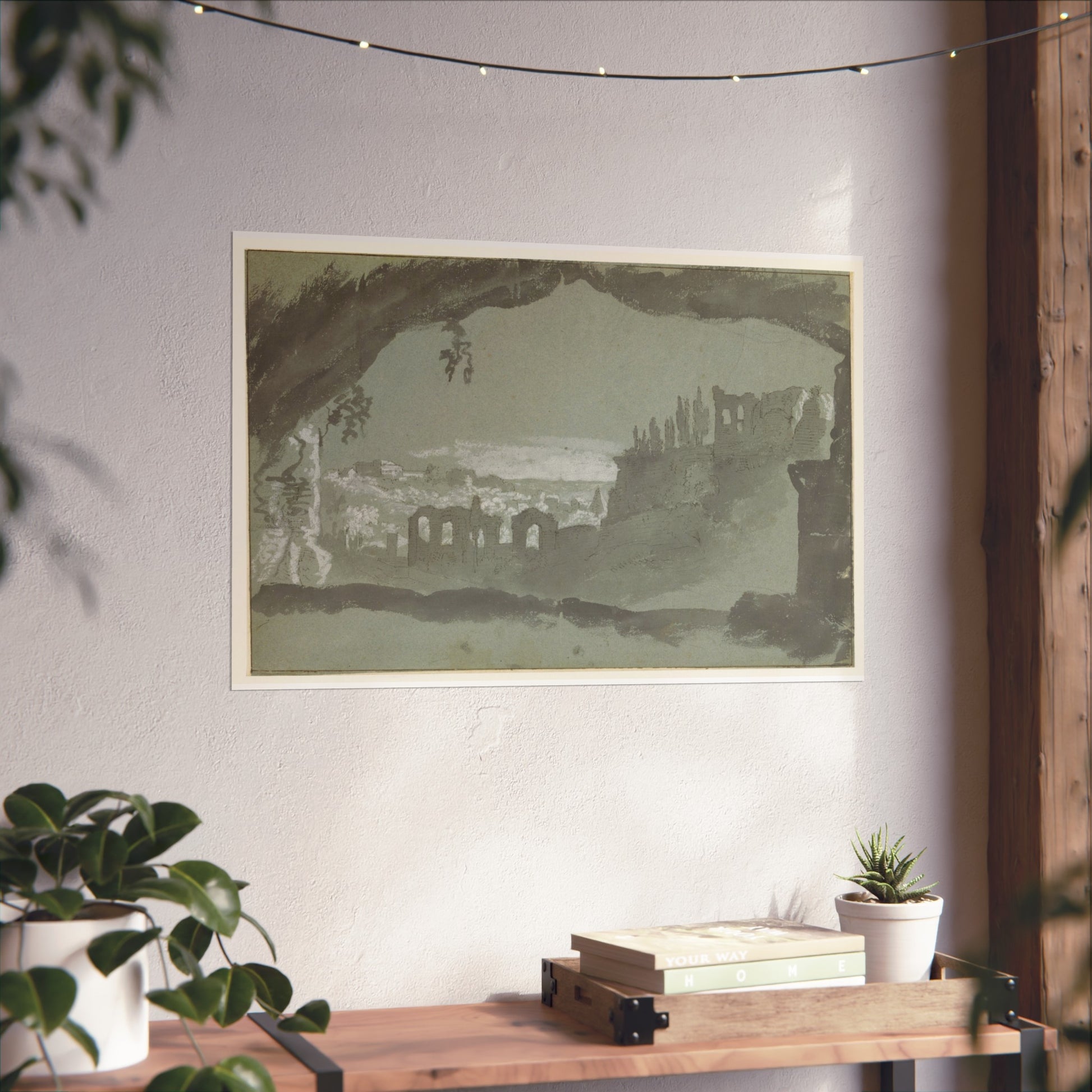 Behold the captivating panorama of Rome, featuring the majestic ruins of the palace on the Palatine Hill. To the left, your eyes will be drawn to the historic Santa Saba, while to the right, you can't miss the iconic Porta and Pyramid of Cestius. This artwork is an evocative journey through time, immersing you in the grandeur of ancient Rome.