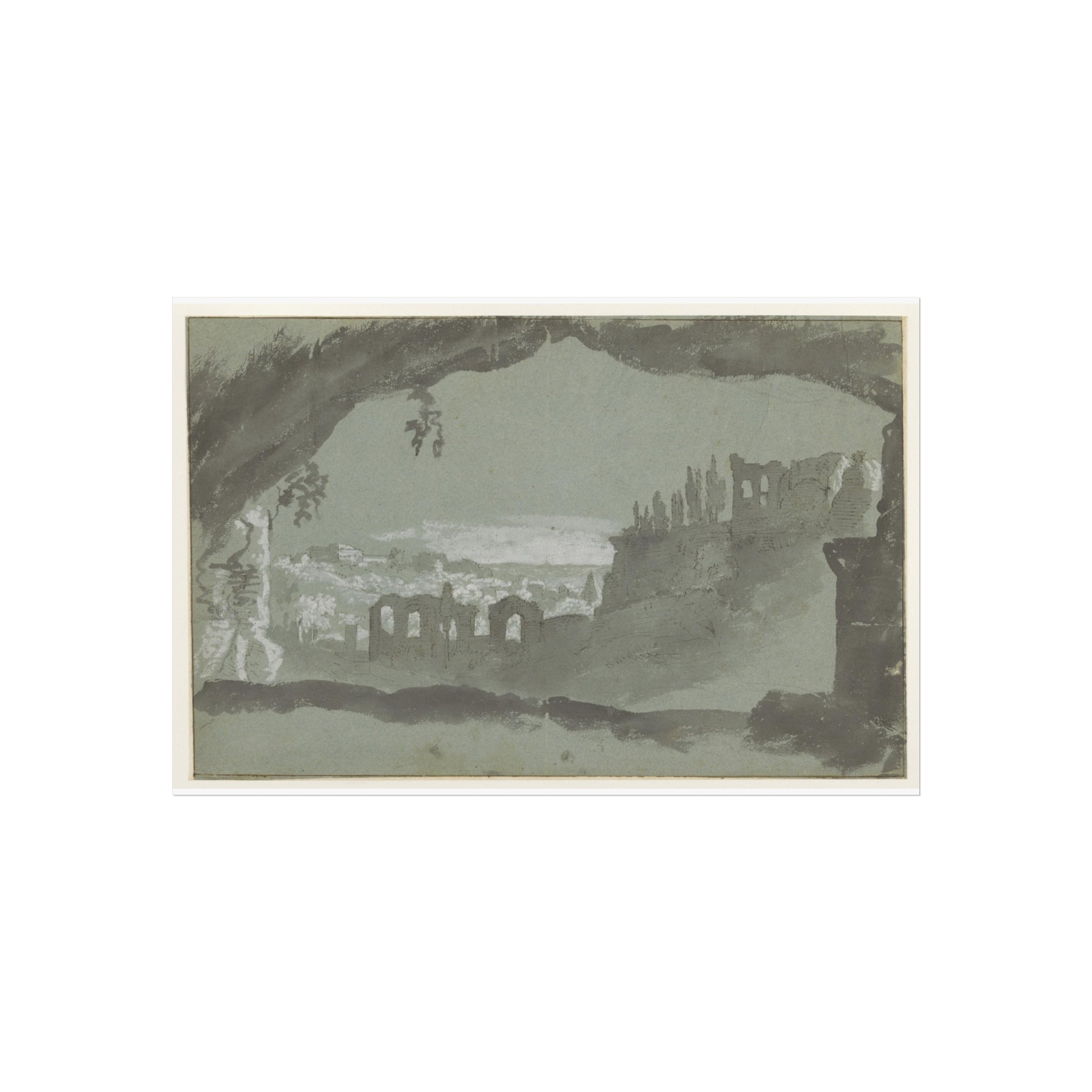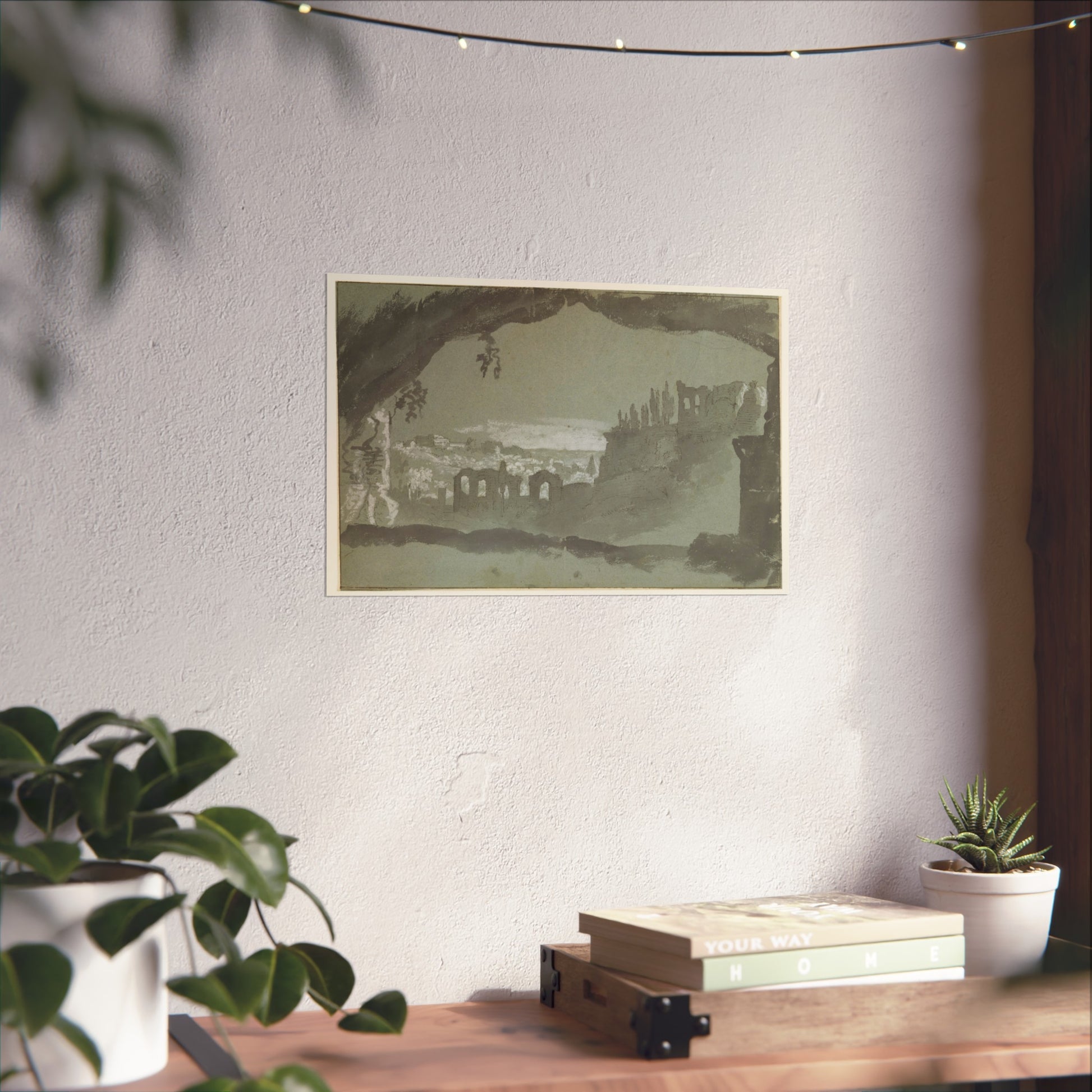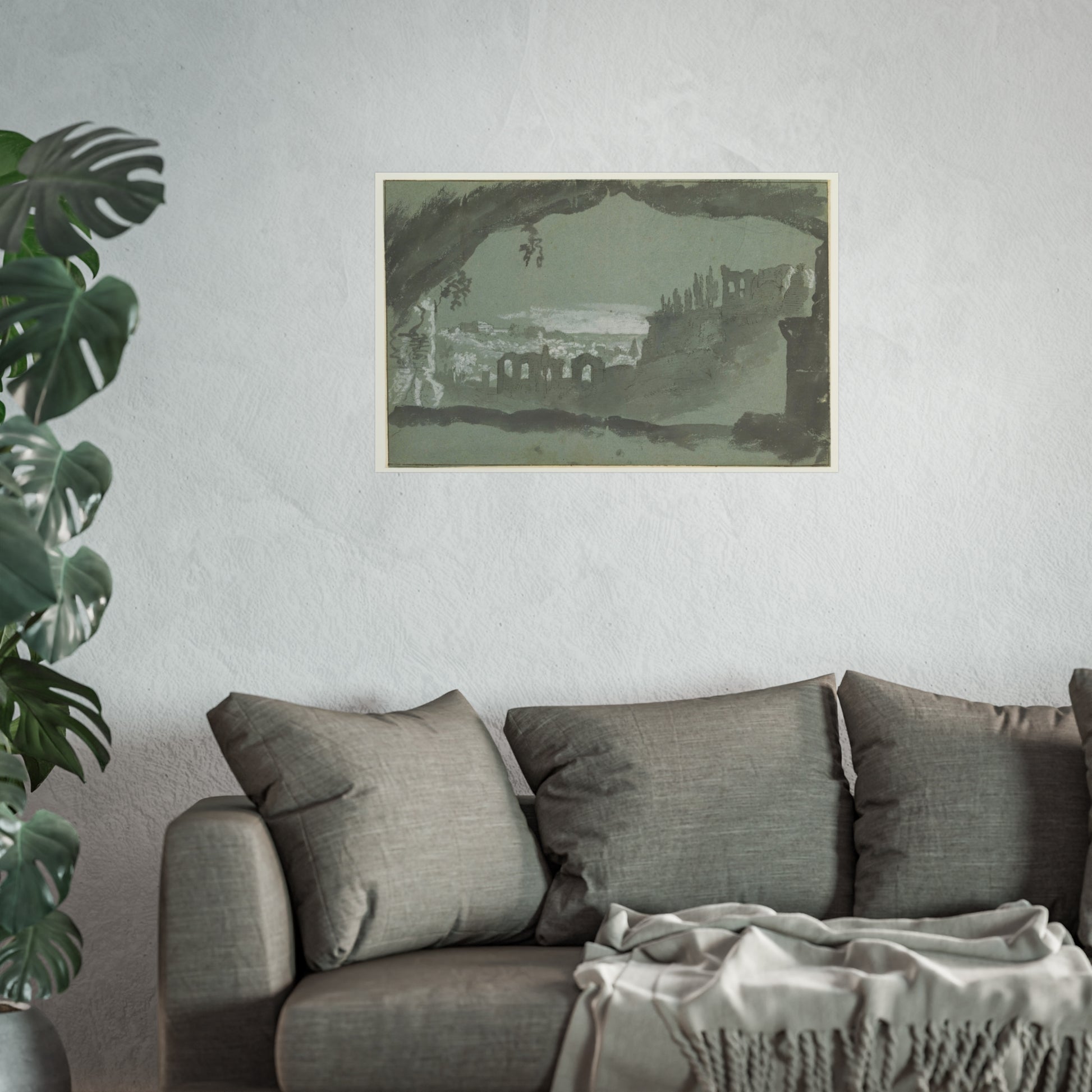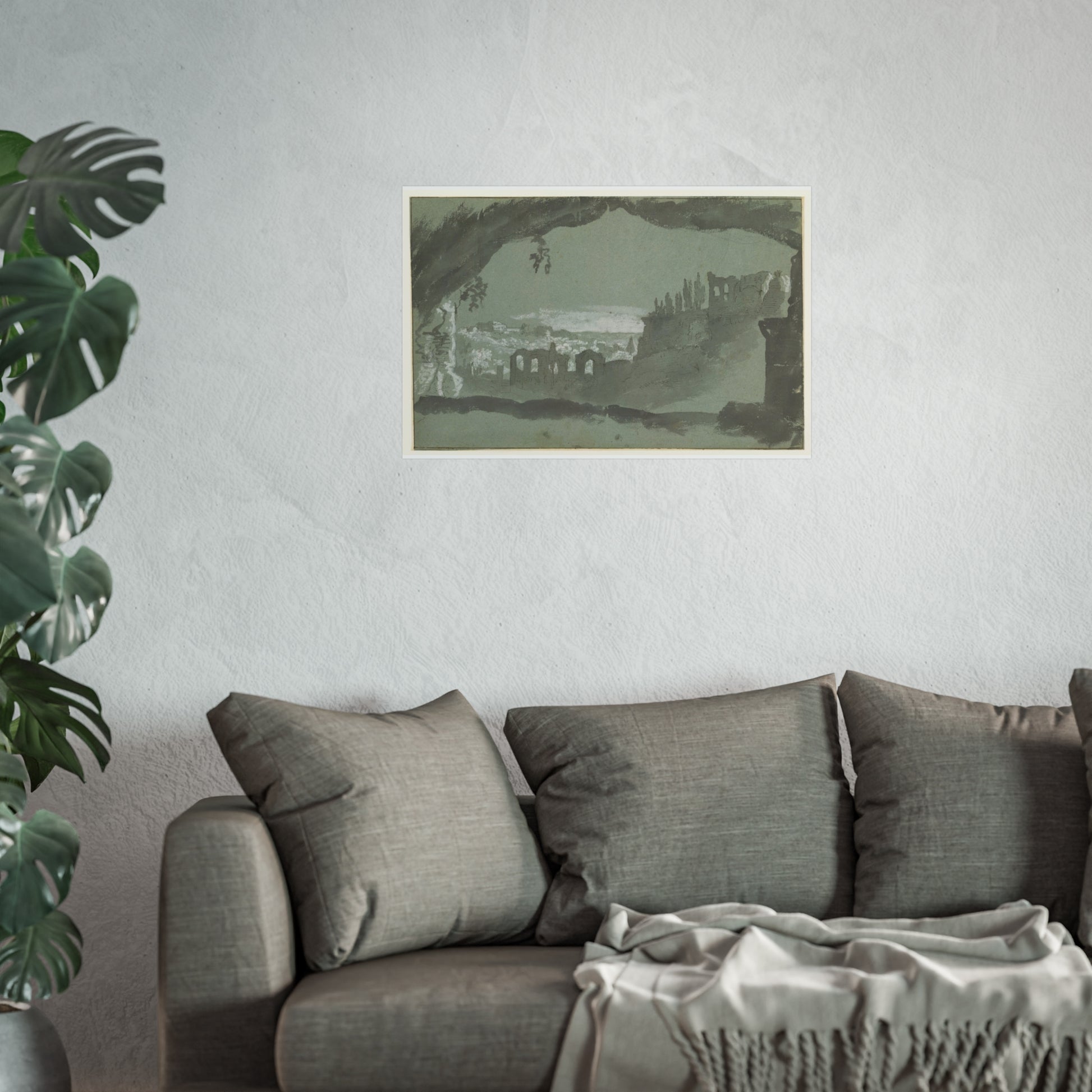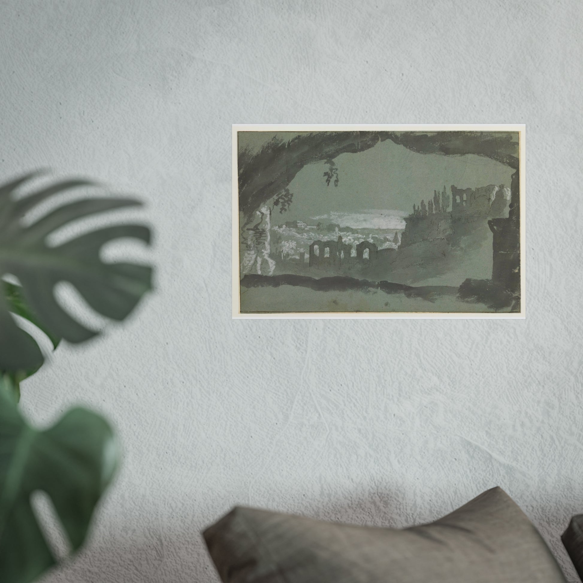 Behold the captivating panorama of Rome, featuring the majestic ruins of the palace on the Palatine Hill. To the left, your eyes will be drawn to the historic Santa Saba, while to the right, you can't miss the iconic Porta and Pyramid of Cestius. This artwork is an evocative journey through time, immersing you in the grandeur of ancient Rome.