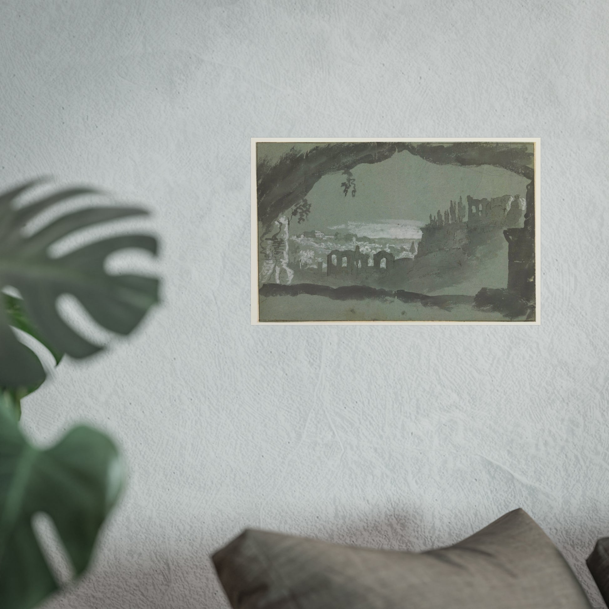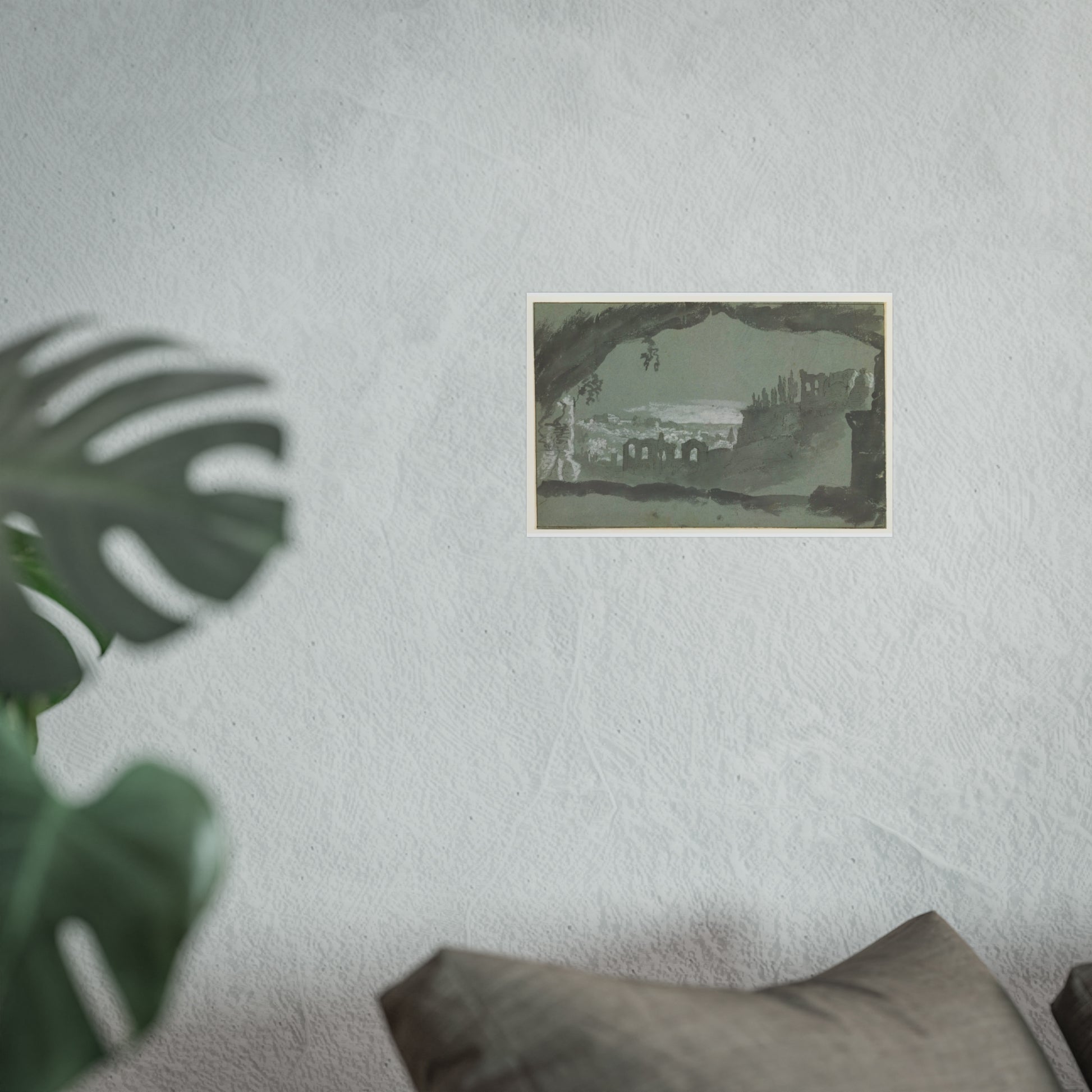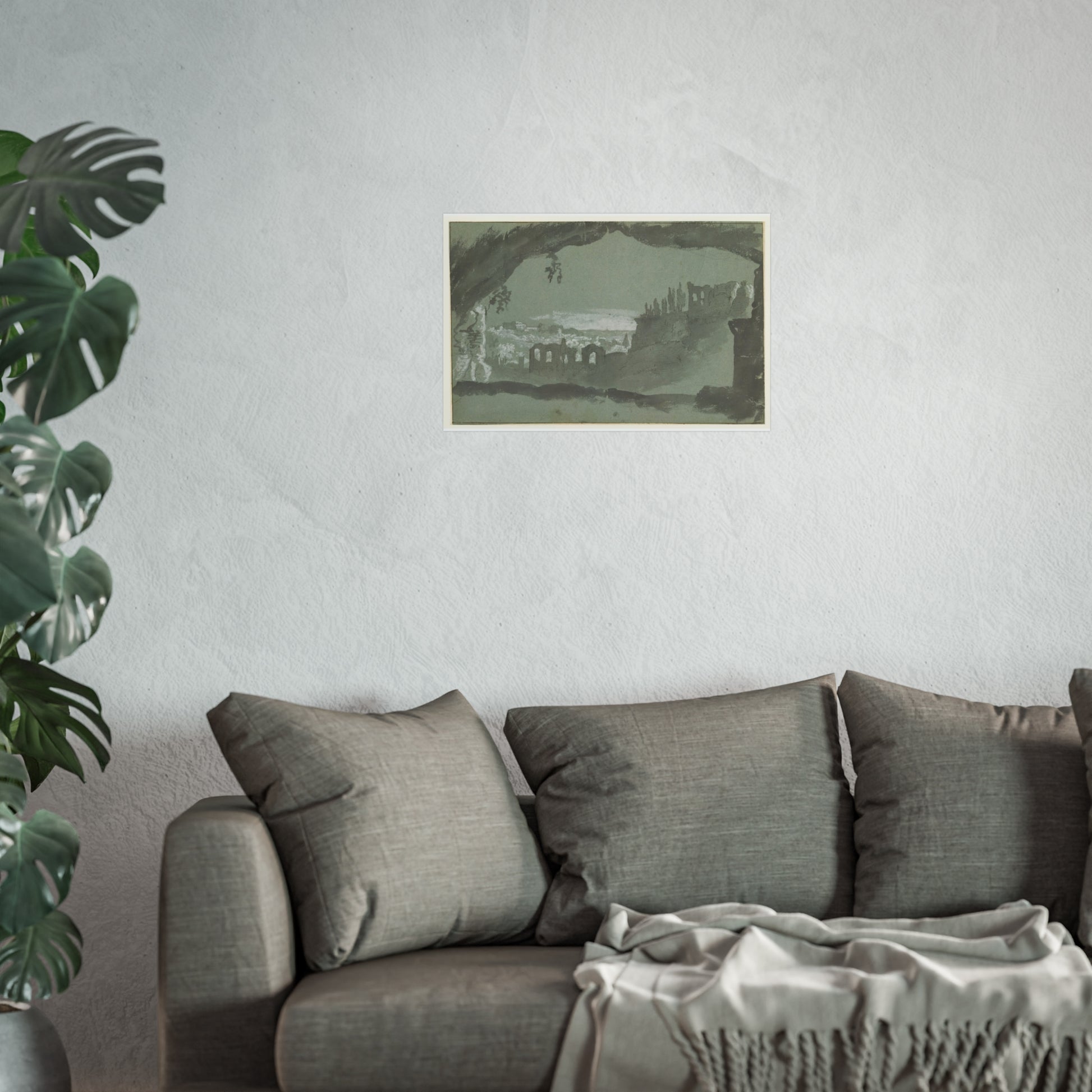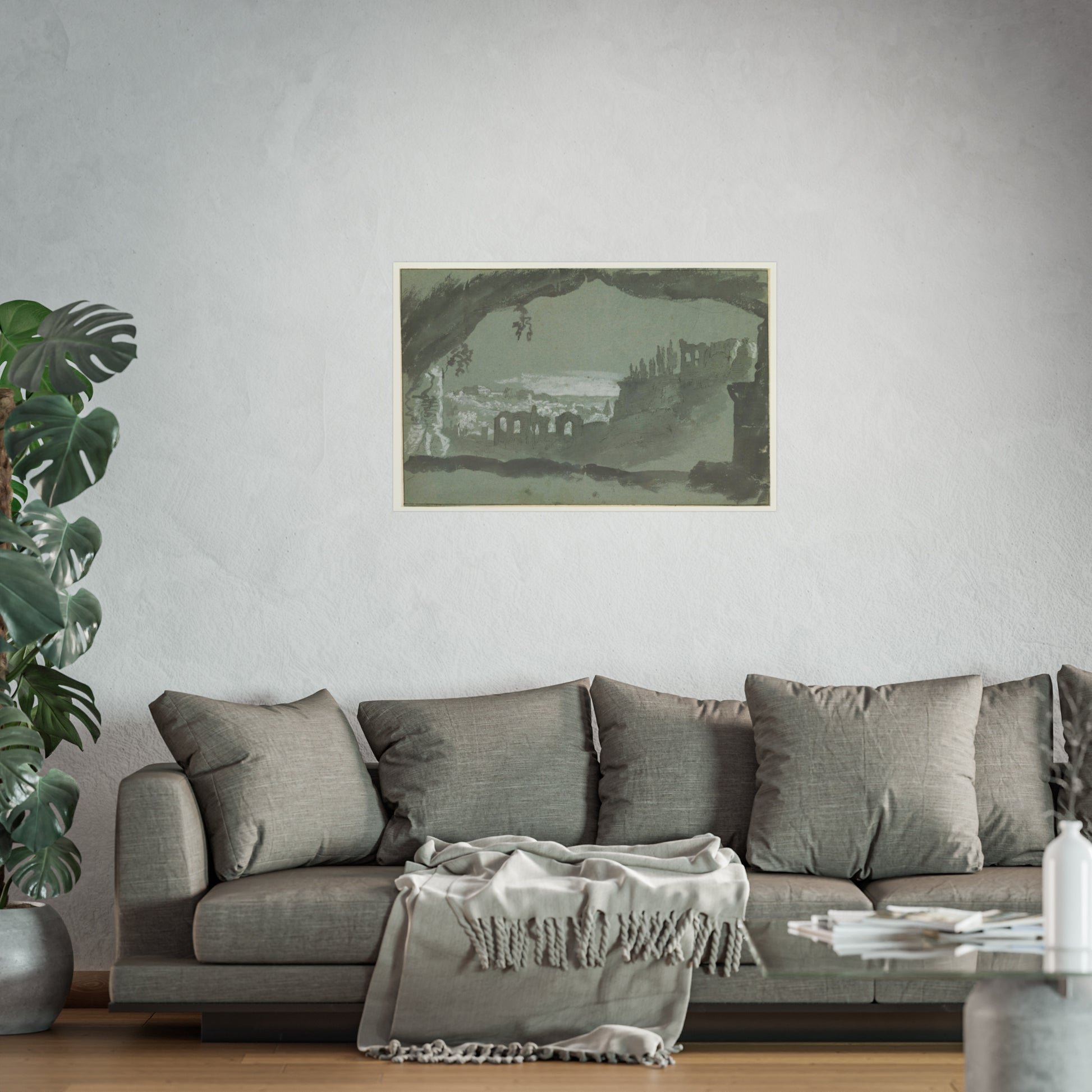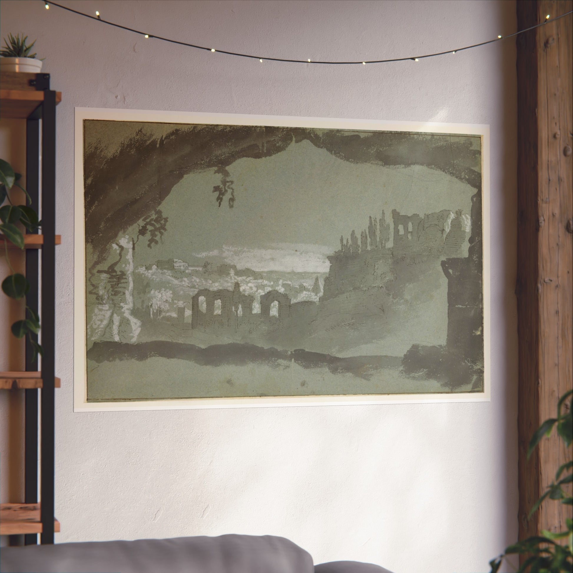 Behold the captivating panorama of Rome, featuring the majestic ruins of the palace on the Palatine Hill. To the left, your eyes will be drawn to the historic Santa Saba, while to the right, you can't miss the iconic Porta and Pyramid of Cestius. This artwork is an evocative journey through time, immersing you in the grandeur of ancient Rome.