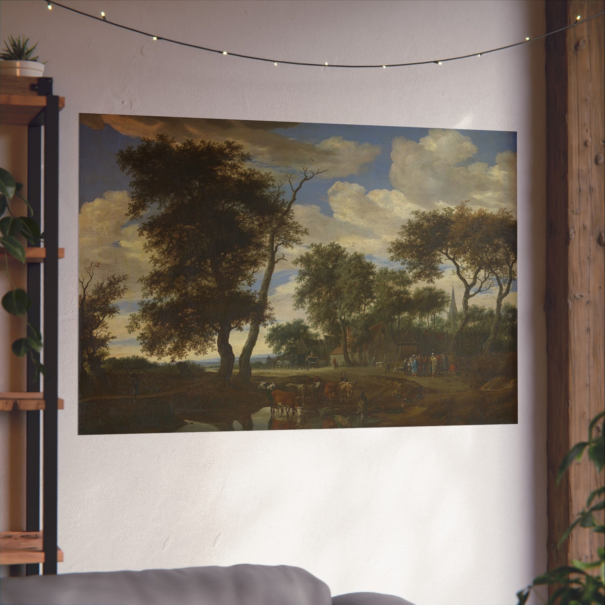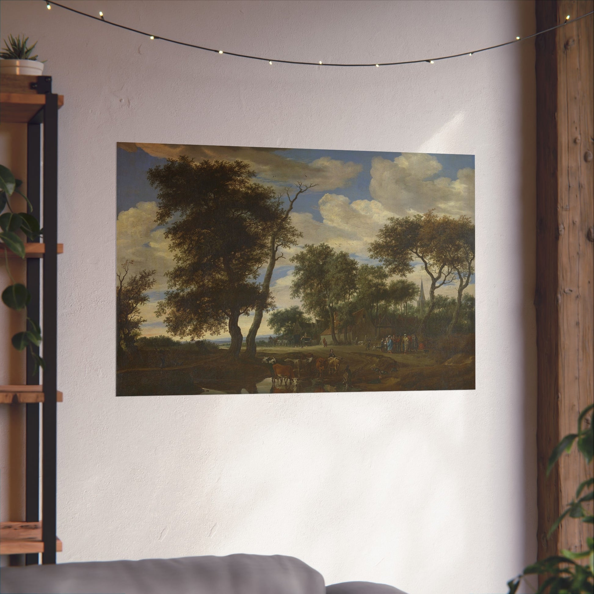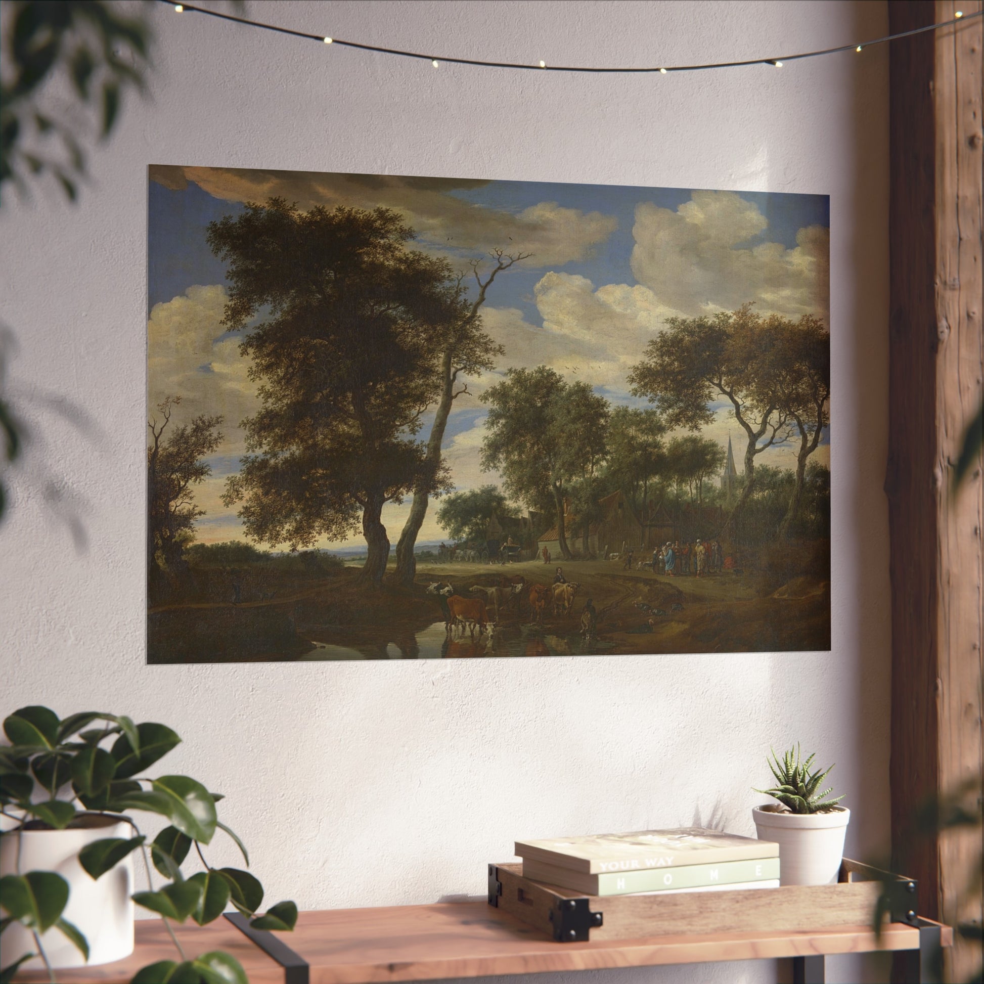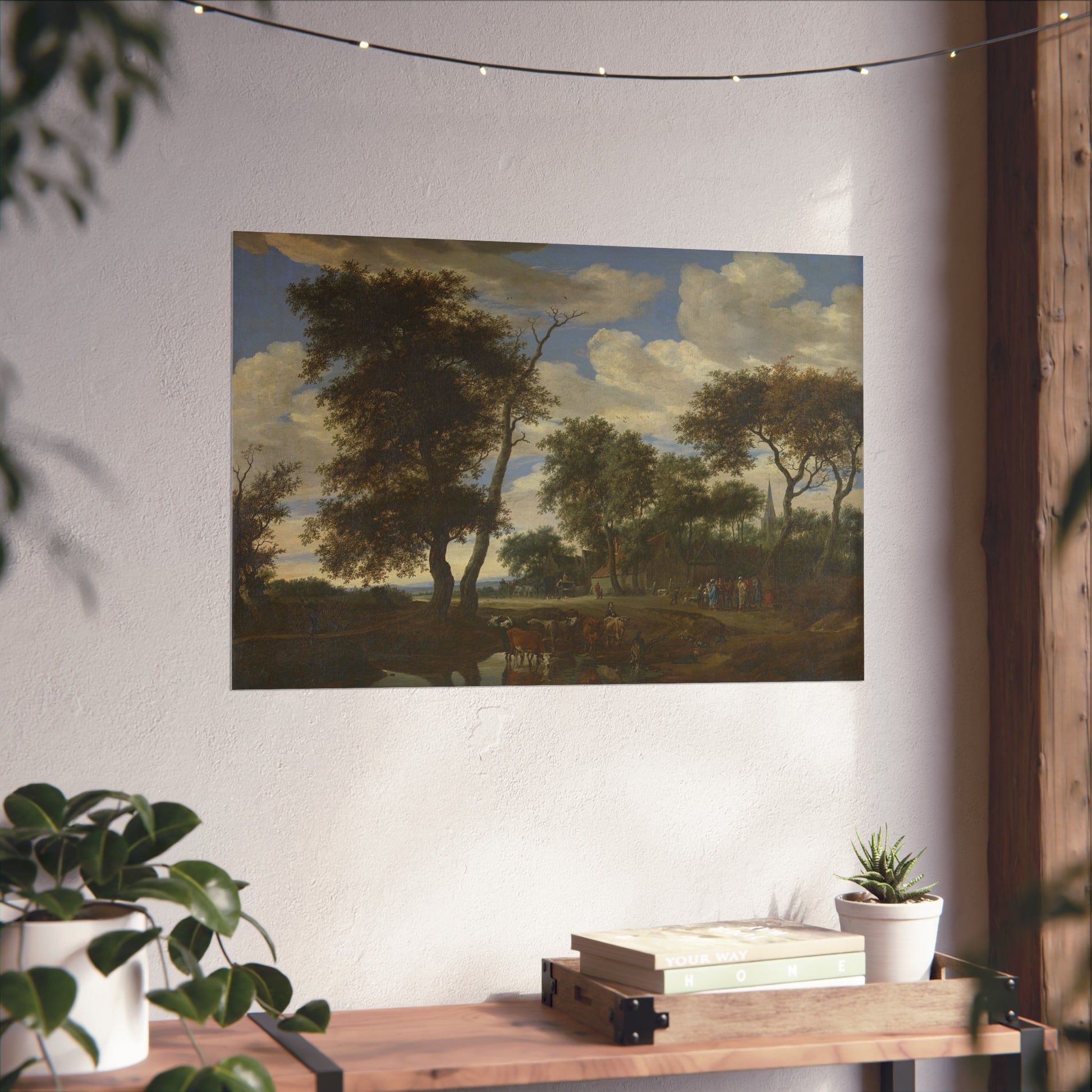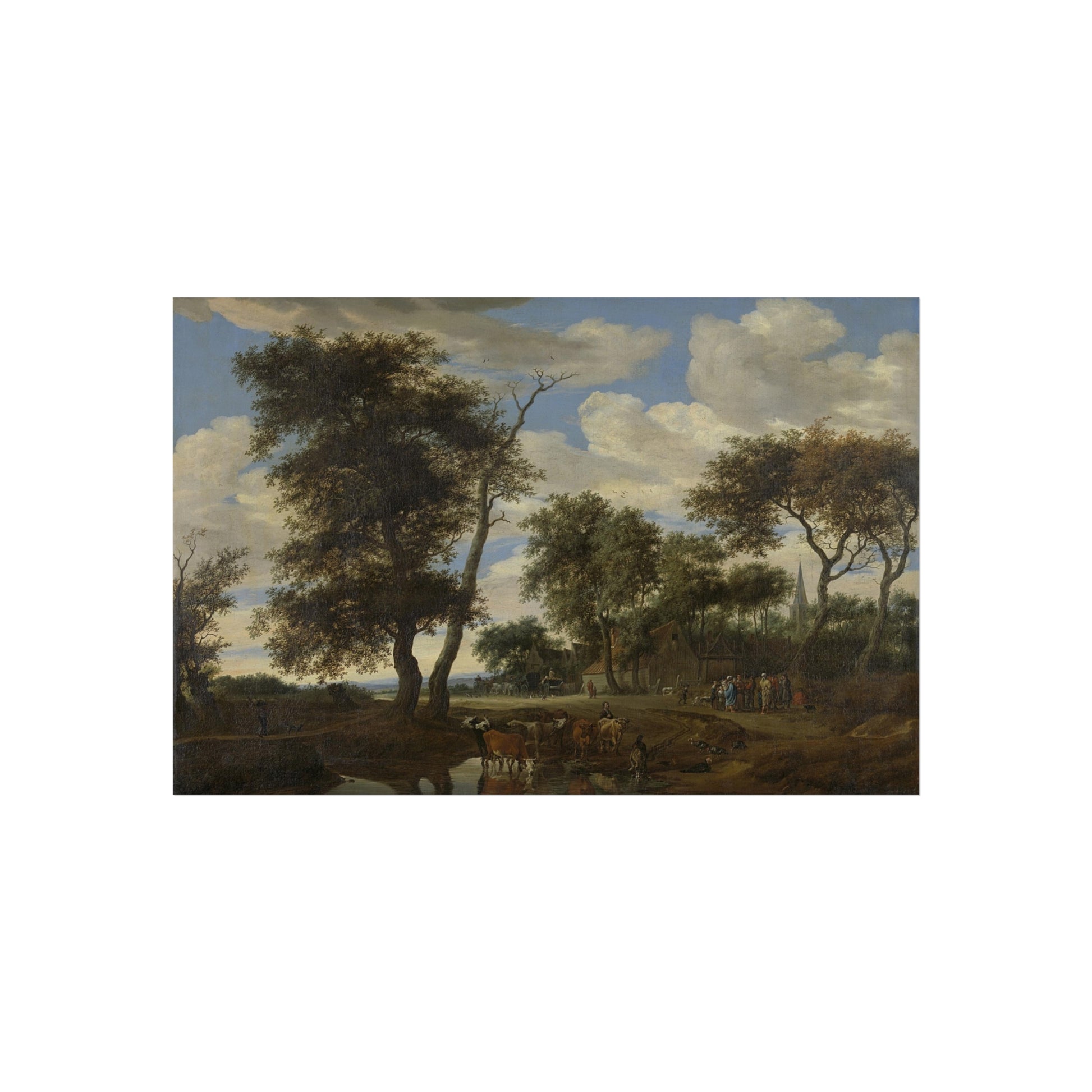 This picturesque scene captures the tranquility of rural life on the outskirts of a village. A couple of wagons have paused near an inn, while a gathering of villagers can be seen a little further down the road. The foreground is dominated by a herd of cows gathered around a pool under the sheltering boughs of towering trees.