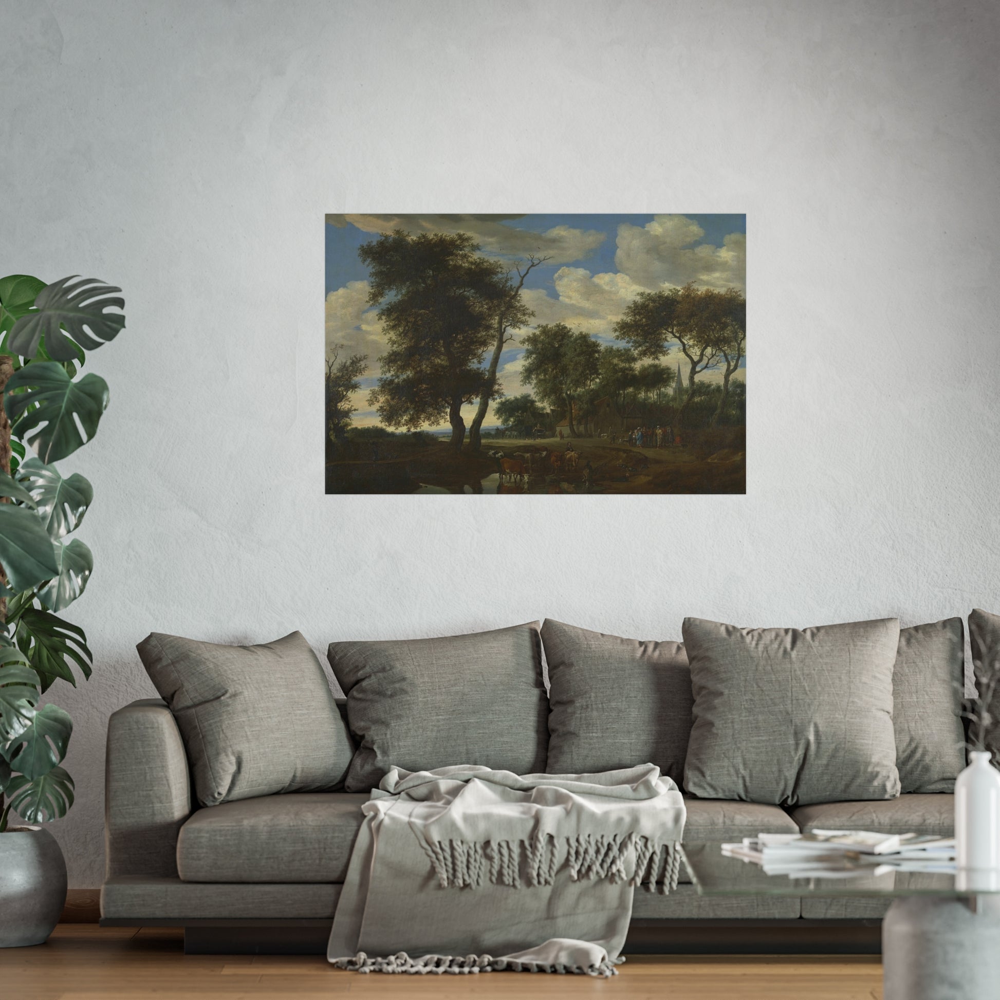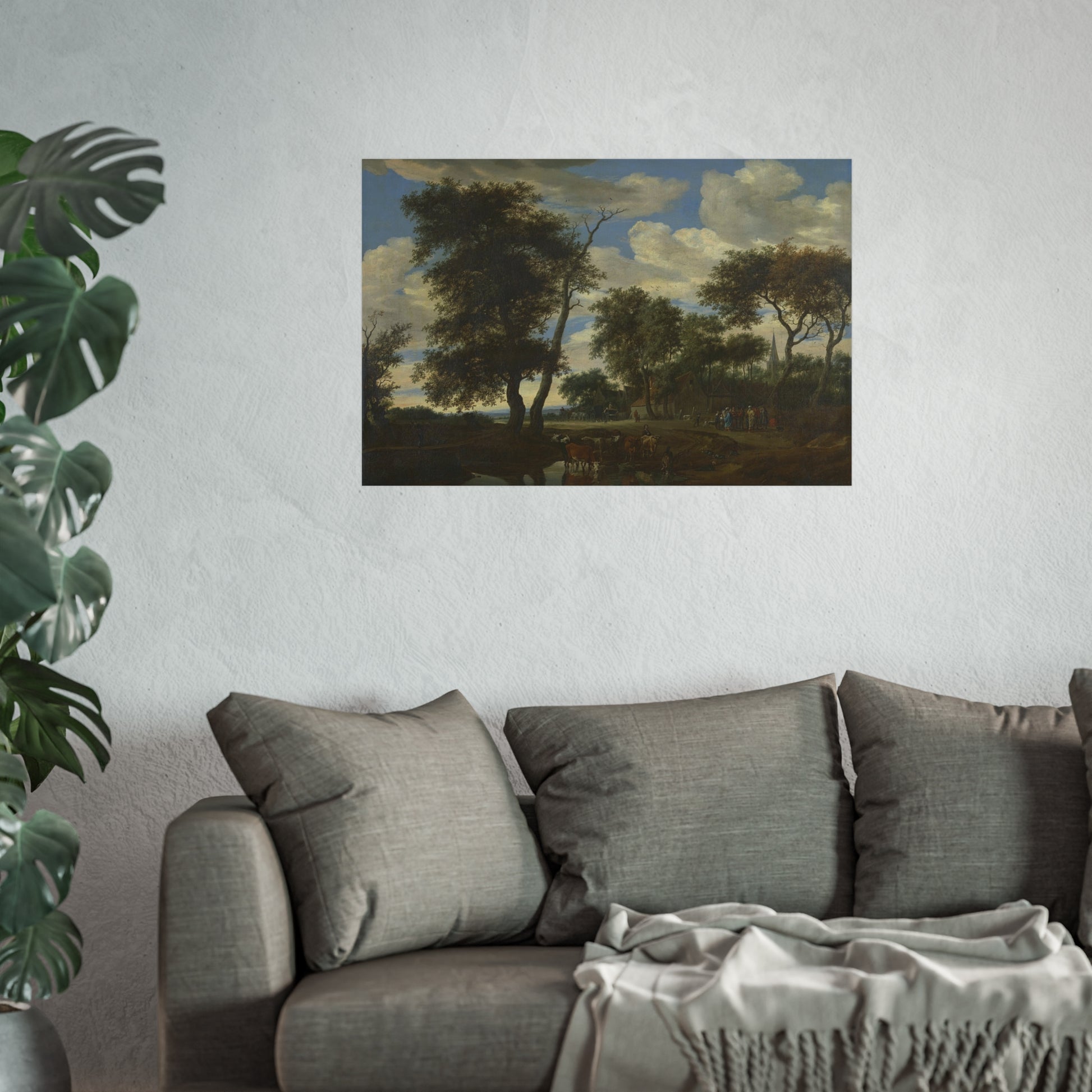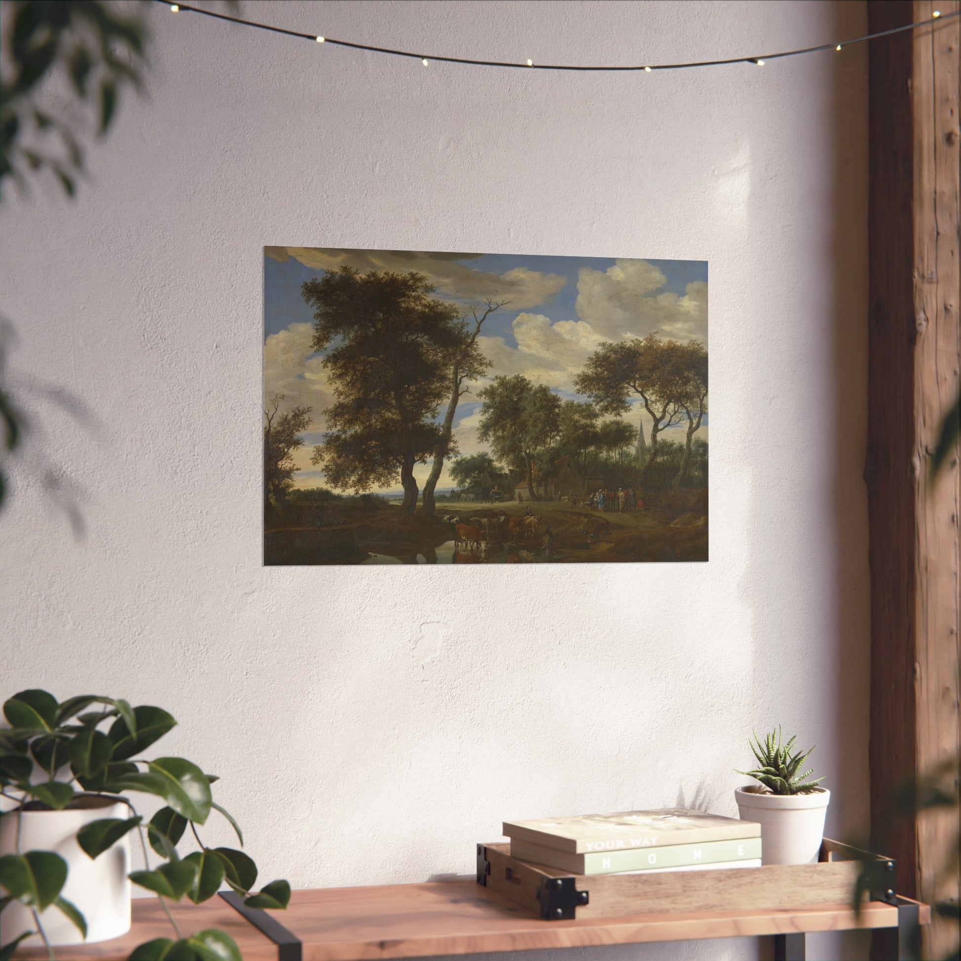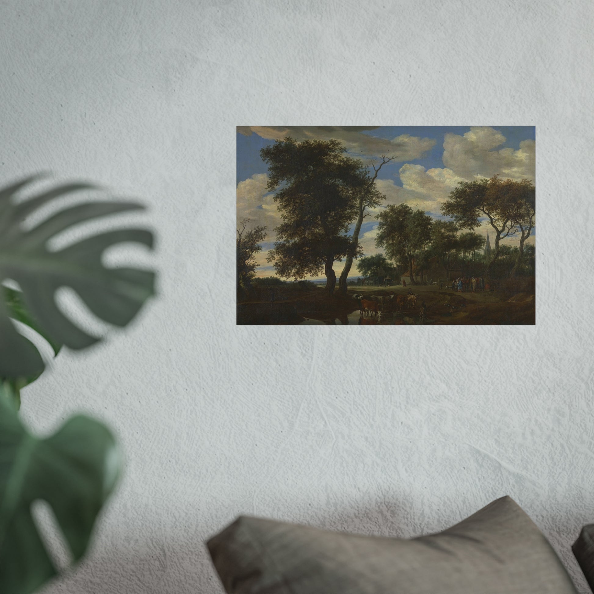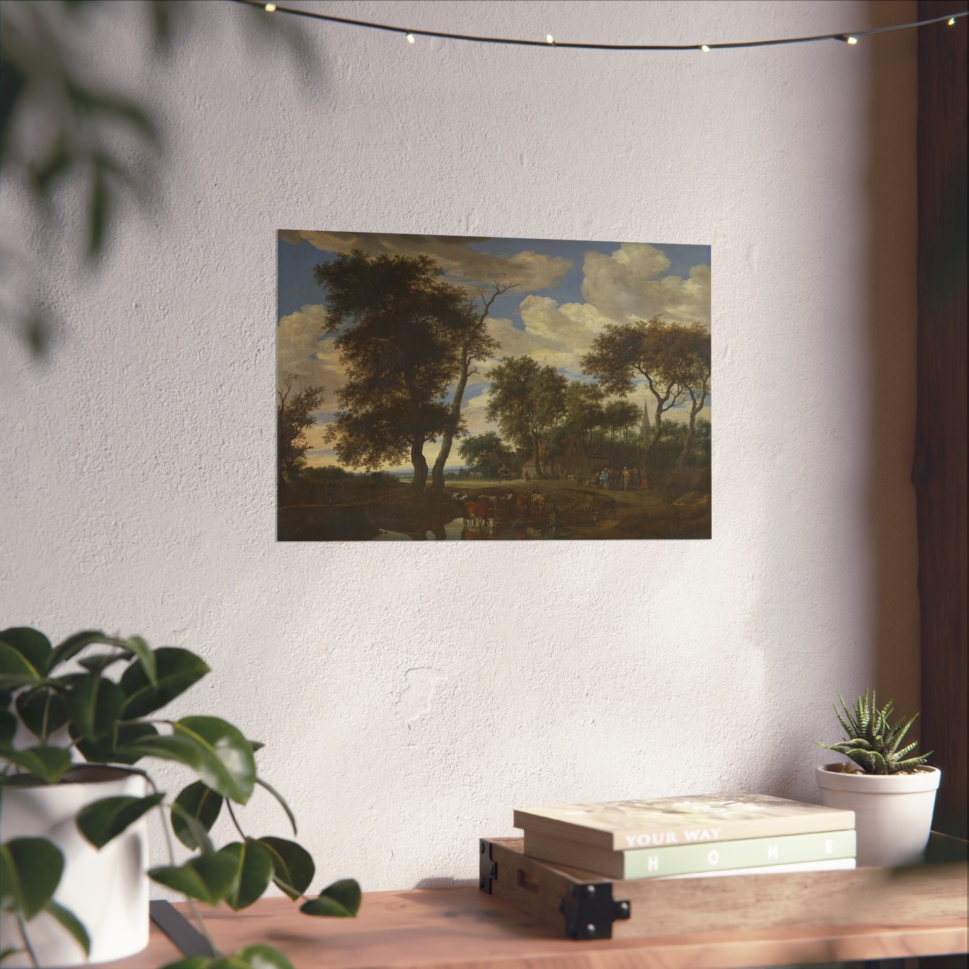 This picturesque scene captures the tranquility of rural life on the outskirts of a village. A couple of wagons have paused near an inn, while a gathering of villagers can be seen a little further down the road. The foreground is dominated by a herd of cows gathered around a pool under the sheltering boughs of towering trees.