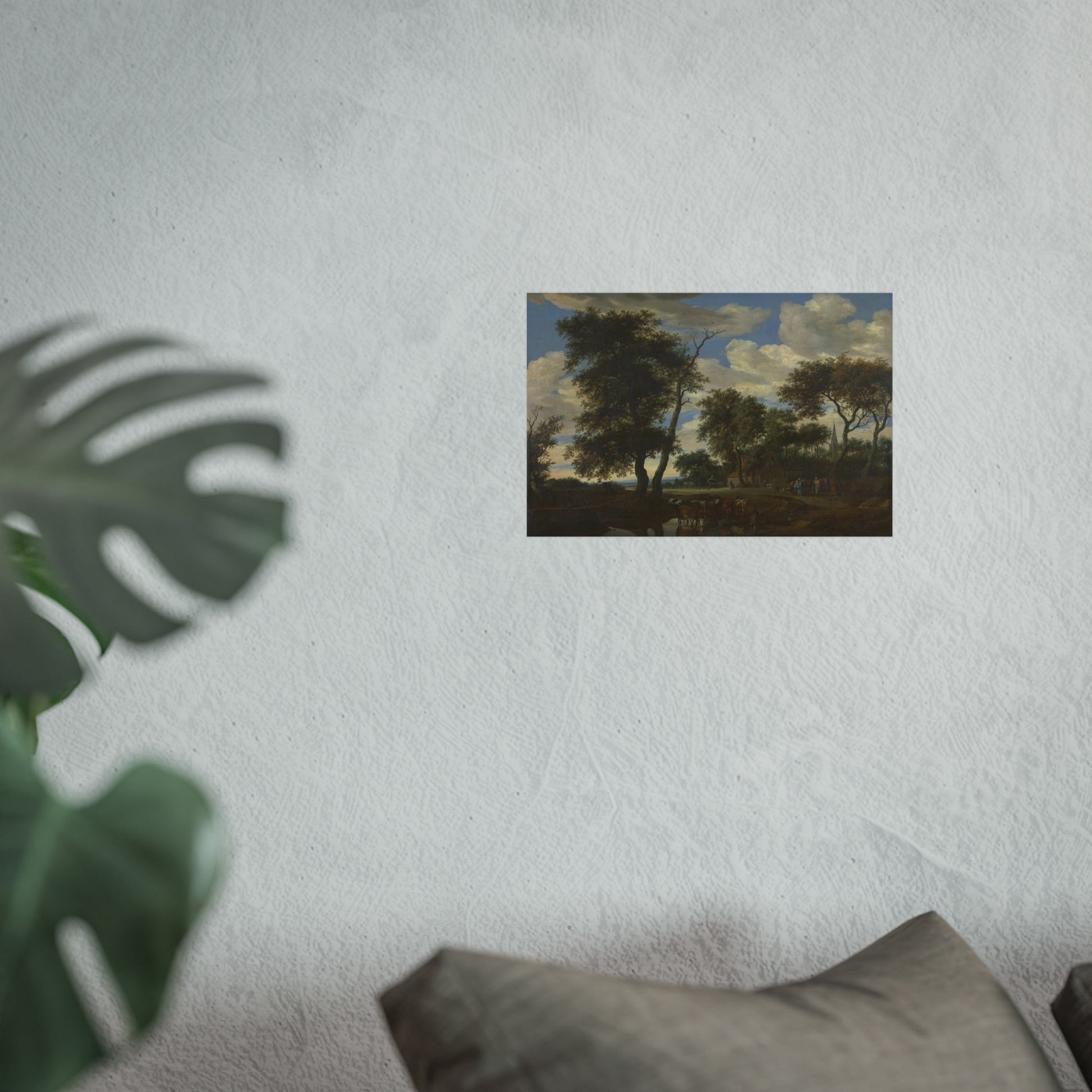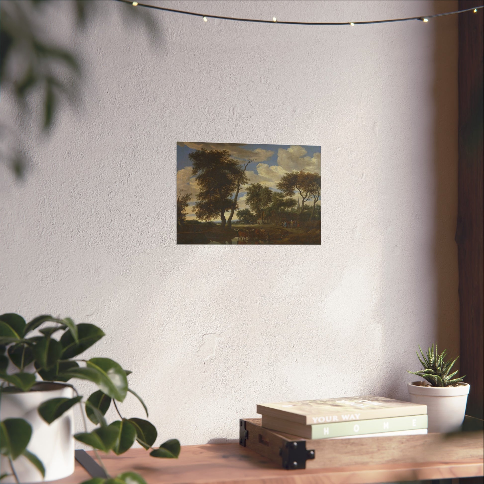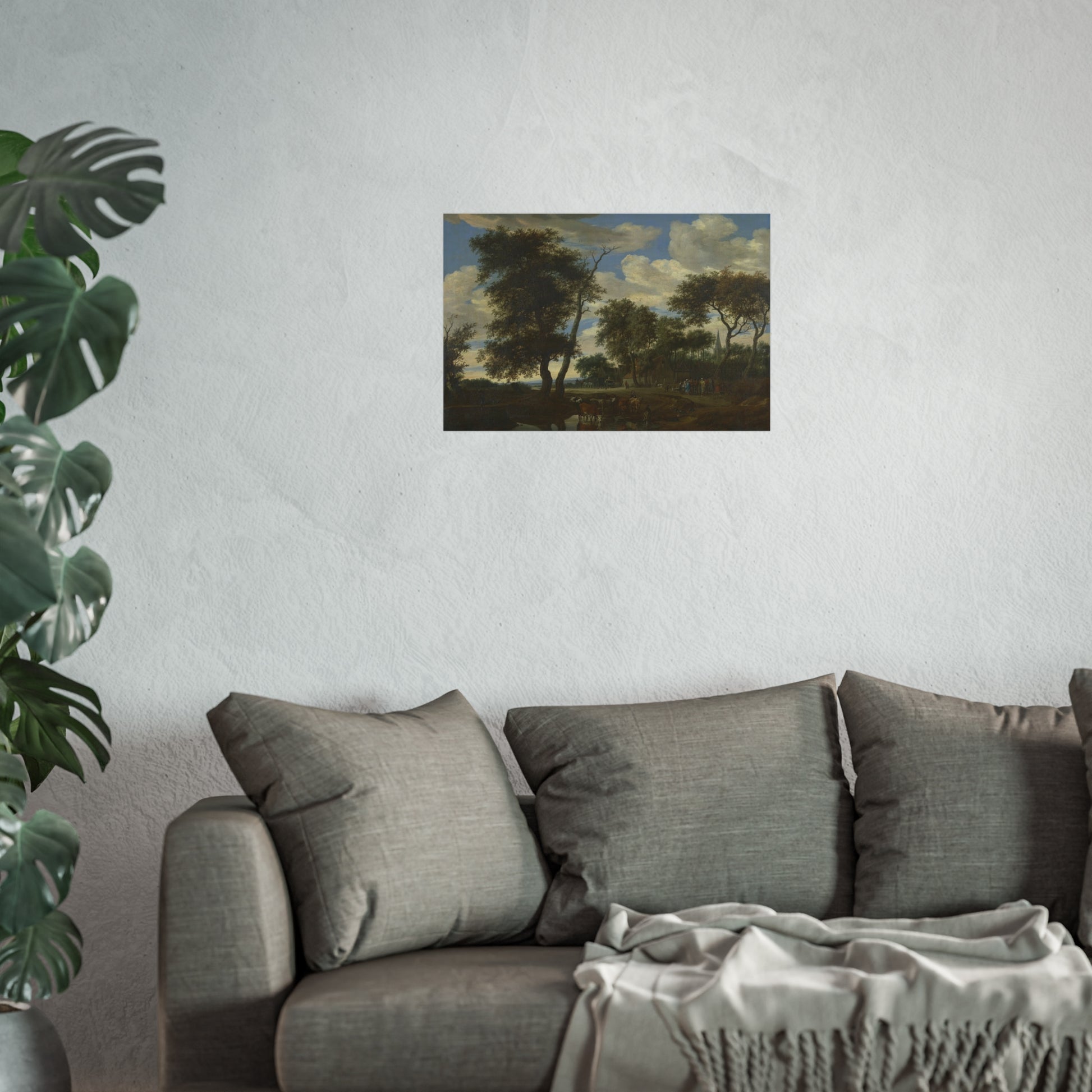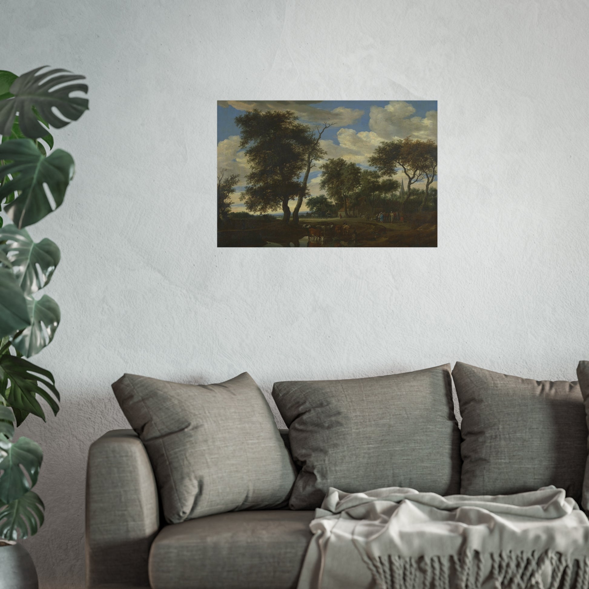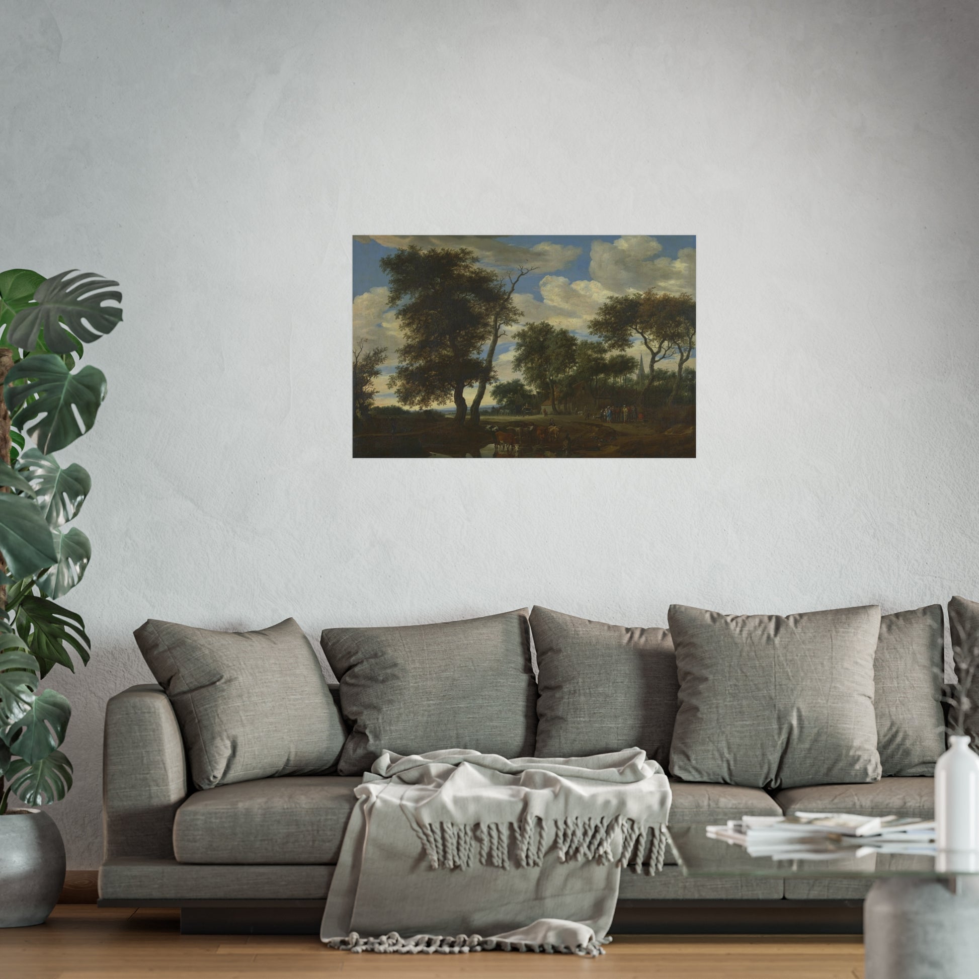 This picturesque scene captures the tranquility of rural life on the outskirts of a village. A couple of wagons have paused near an inn, while a gathering of villagers can be seen a little further down the road. The foreground is dominated by a herd of cows gathered around a pool under the sheltering boughs of towering trees.