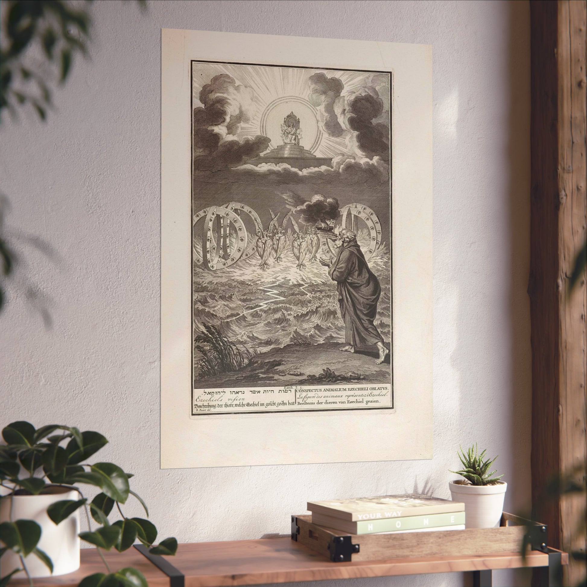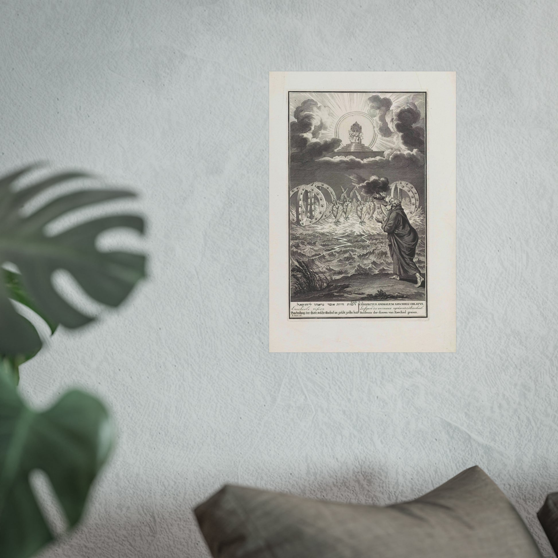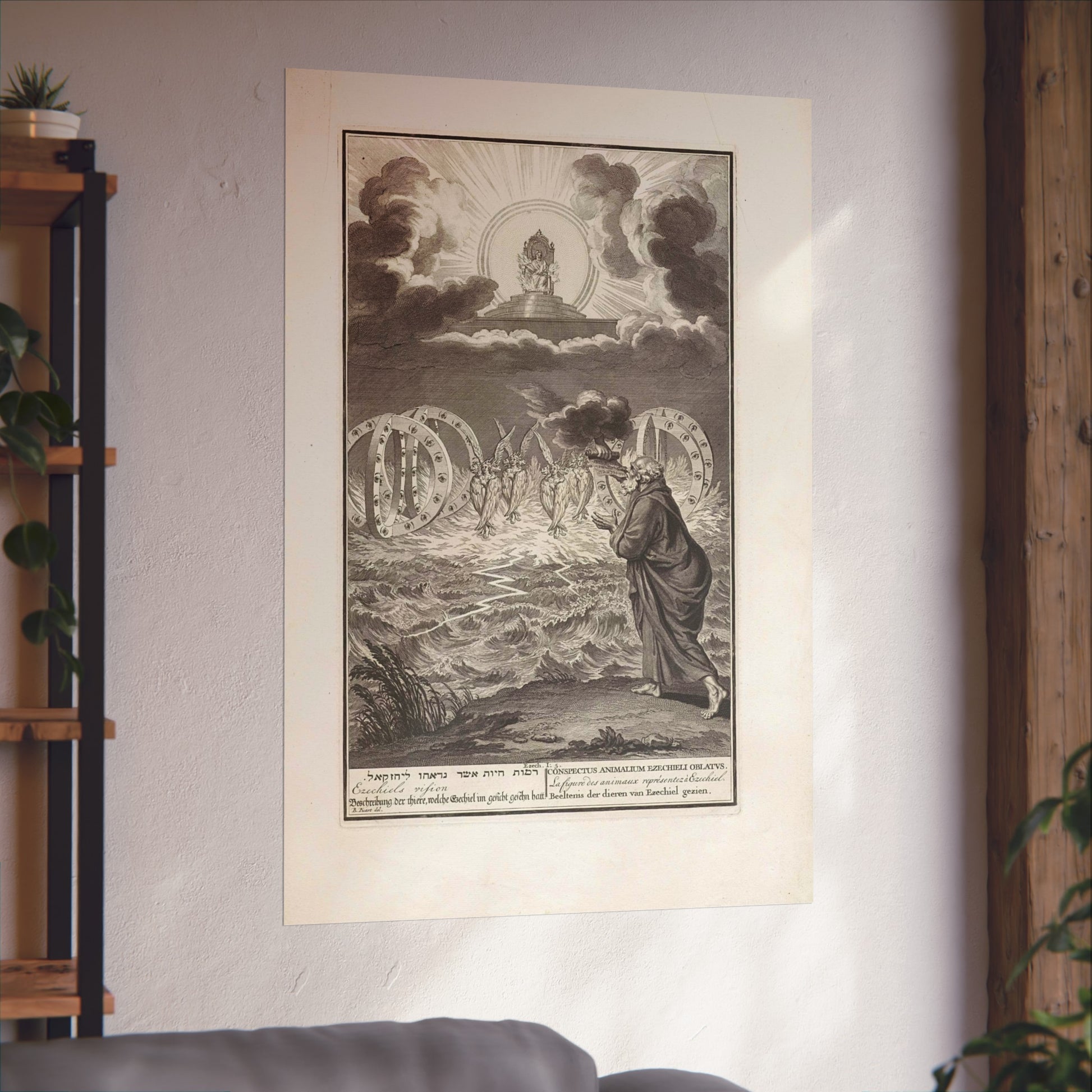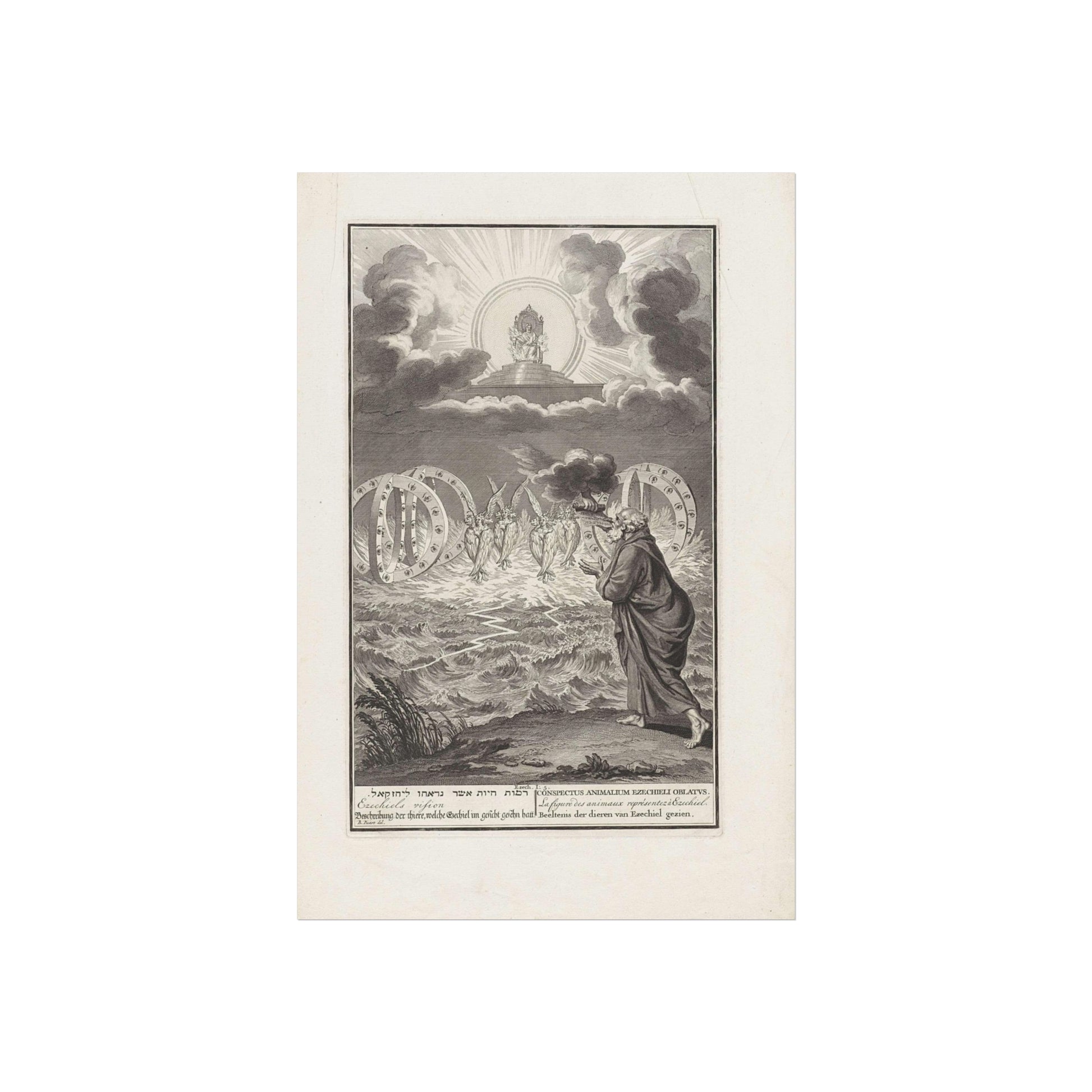This vivid artwork portrays the Vision of Prophet Ezekiel. The divine power of God is depicted seated on his throne, surrounded by flames and rays of light. Four tetramorphic creatures emerge from the water, each with four faces - that of an eagle, an ox, a human, and a lion - and four wings. Adjacent to each creature, there's a double wheel adorned with eyes. On the right, Ezekiel is seen receiving a scroll with Hebrew text from God's hand. At the bottom, there's a single-line title in Hebrew, English, German, Latin, French, and Dutch based on Ezekiel 1:5.