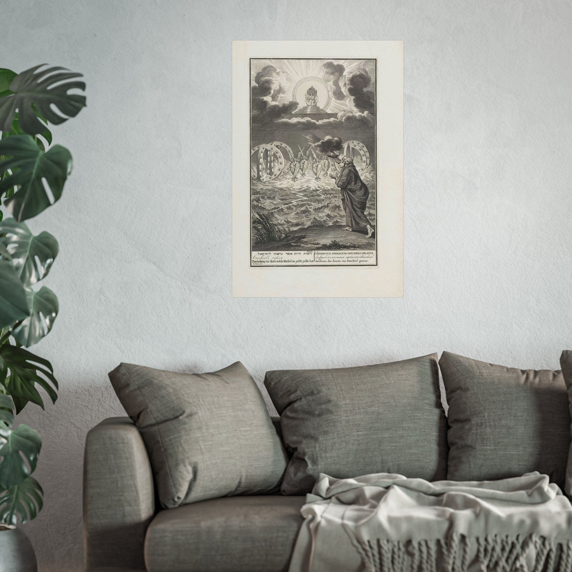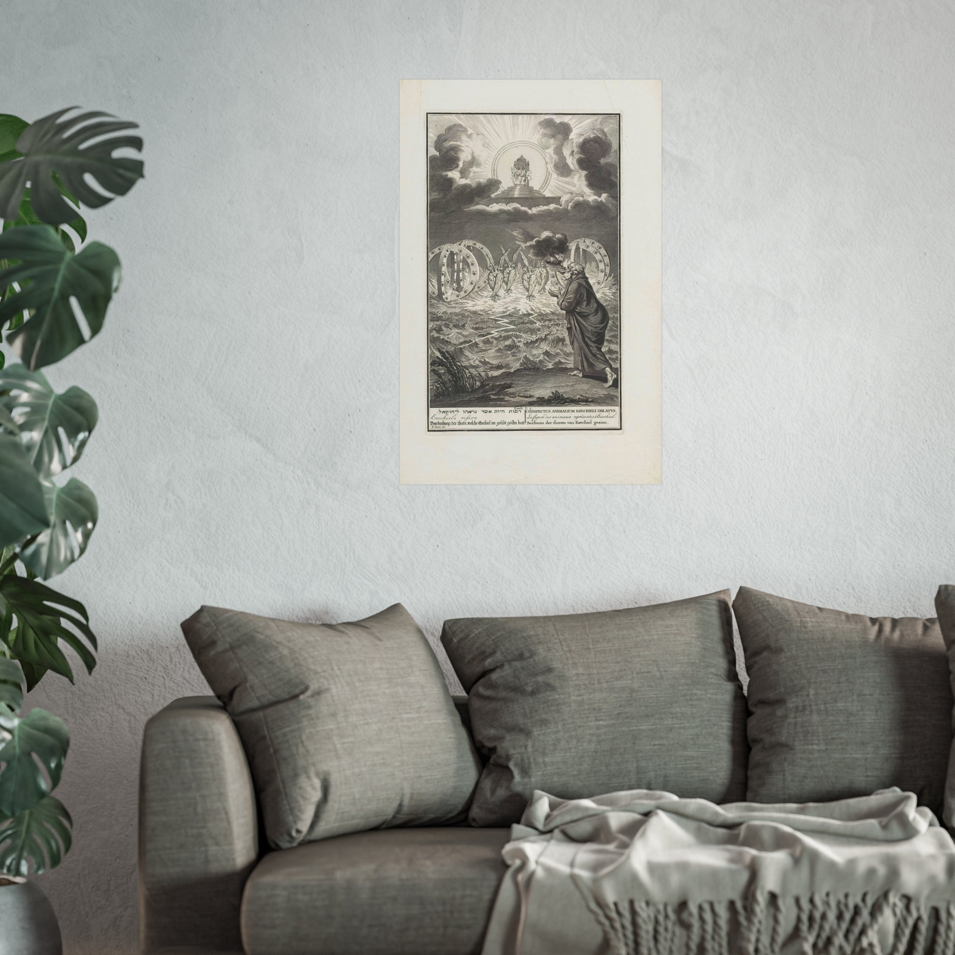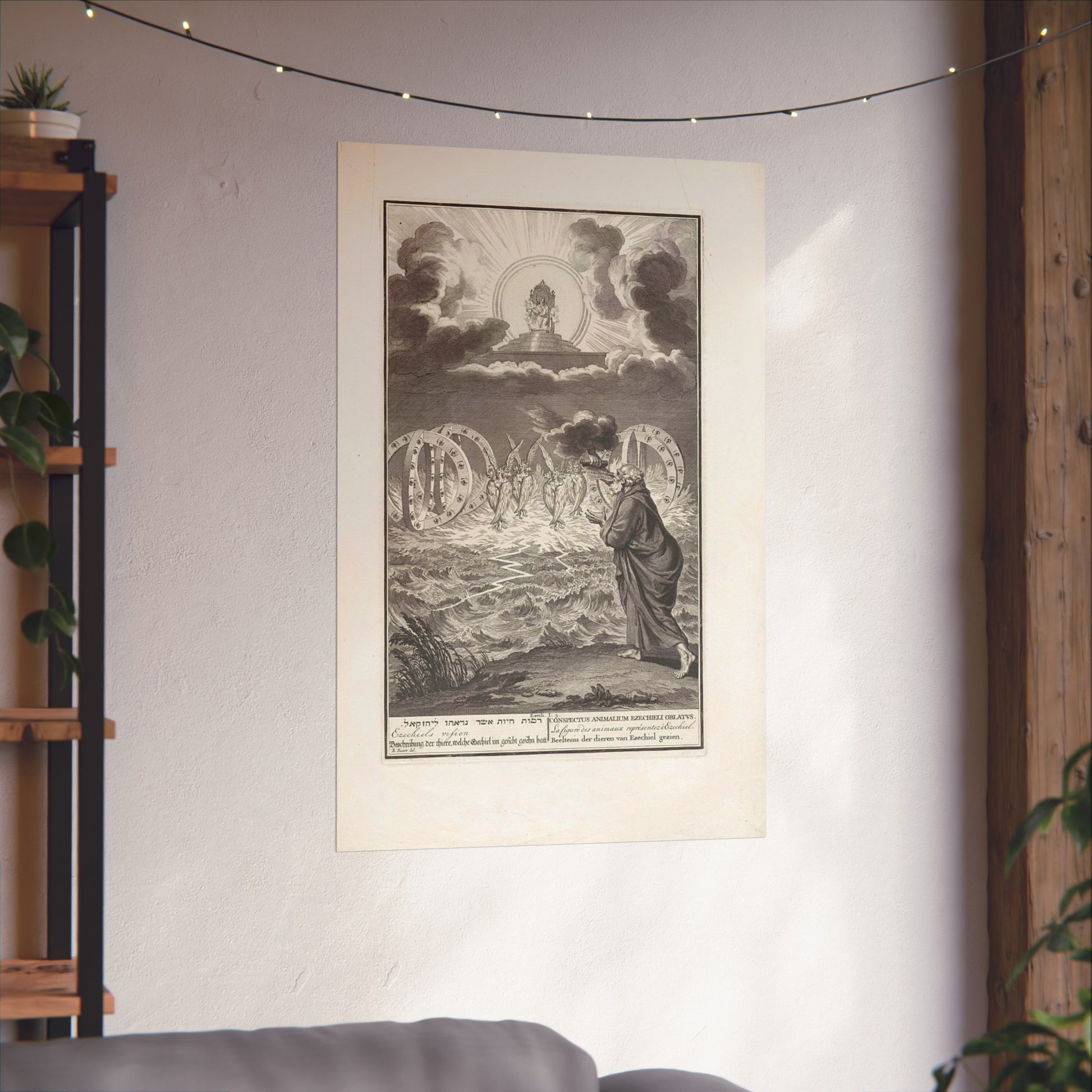 This vivid artwork portrays the Vision of Prophet Ezekiel. The divine power of God is depicted seated on his throne, surrounded by flames and rays of light. Four tetramorphic creatures emerge from the water, each with four faces - that of an eagle, an ox, a human, and a lion - and four wings. Adjacent to each creature, there's a double wheel adorned with eyes. On the right, Ezekiel is seen receiving a scroll with Hebrew text from God's hand. At the bottom, there's a single-line title in Hebrew, English, German, Latin, French, and Dutch based on Ezekiel 1:5.