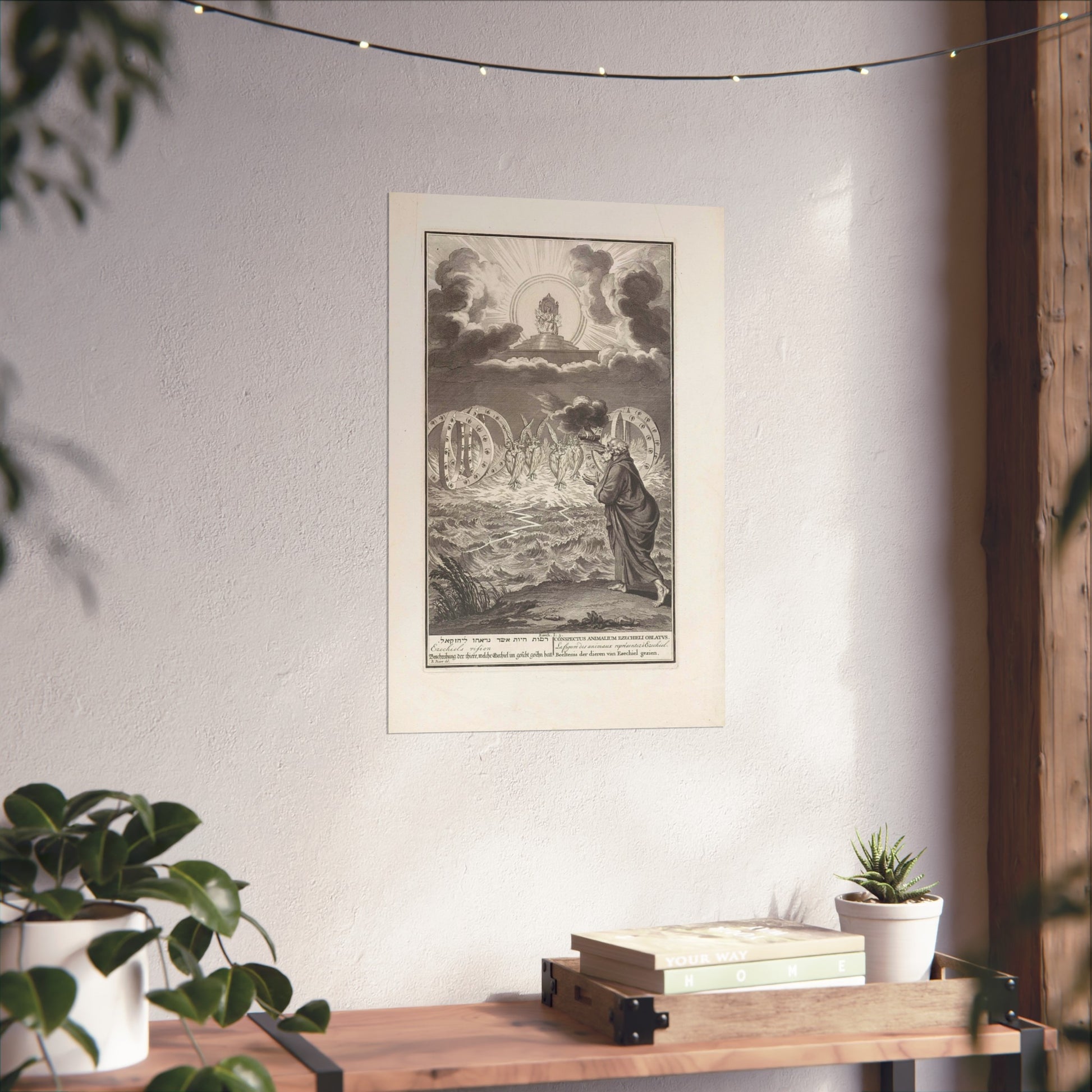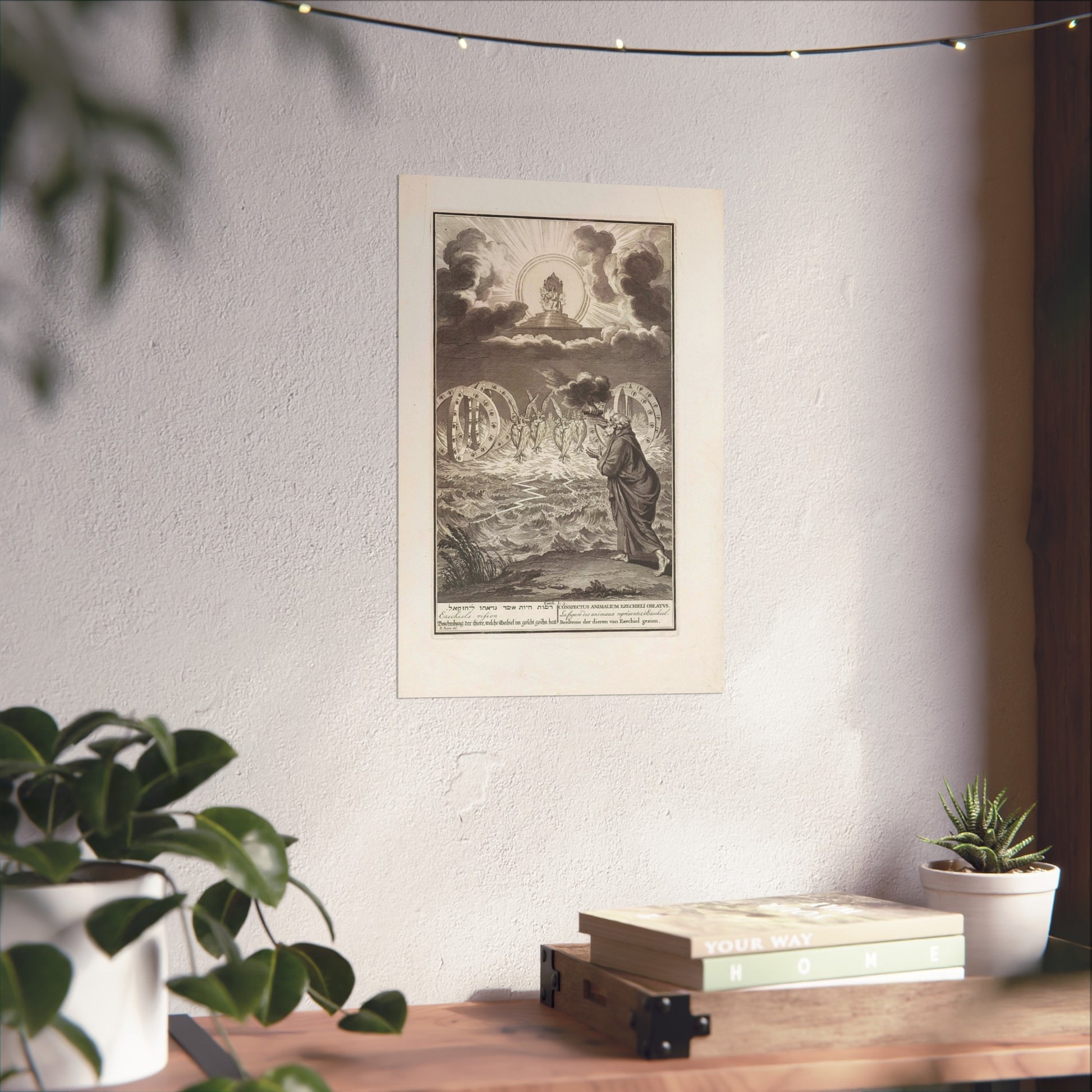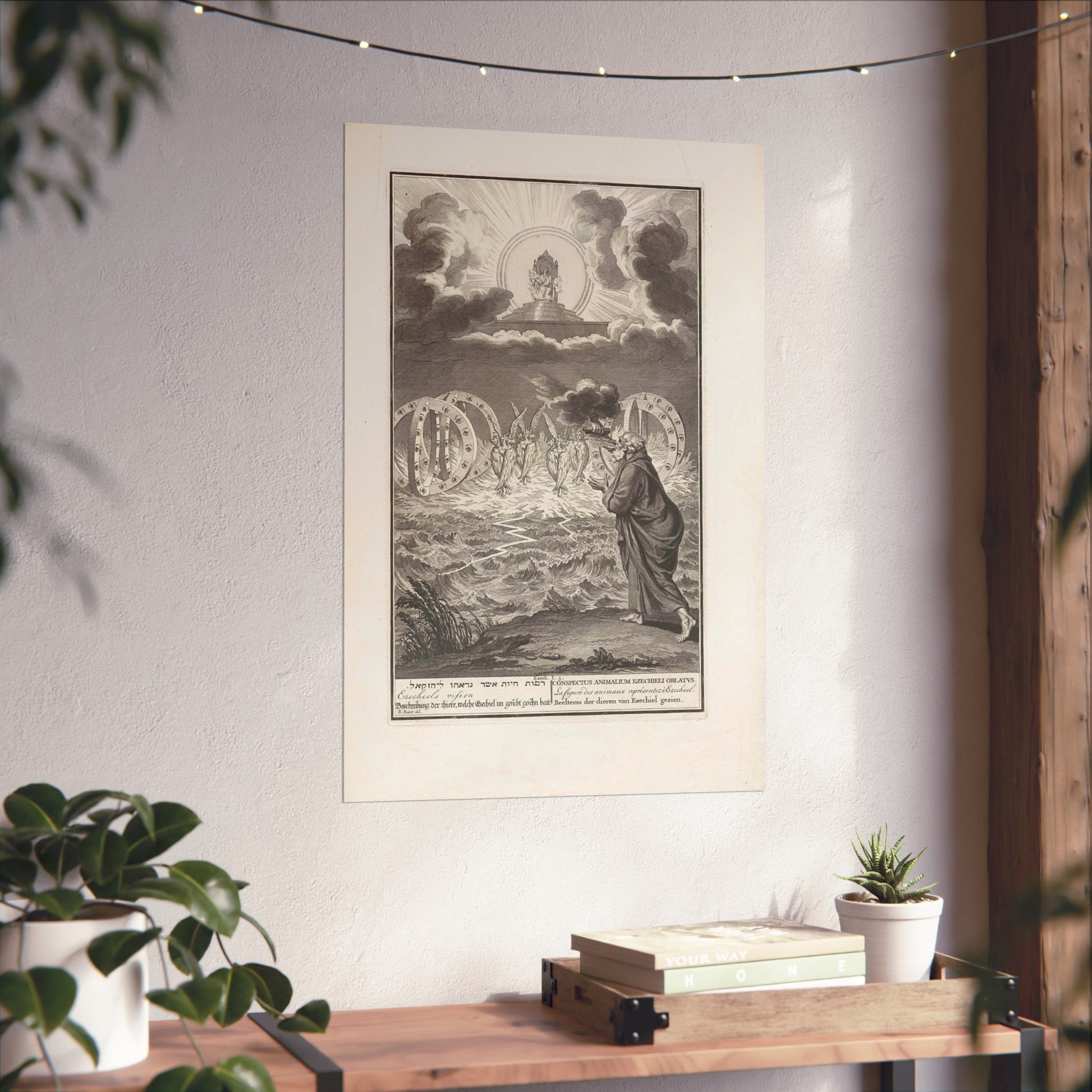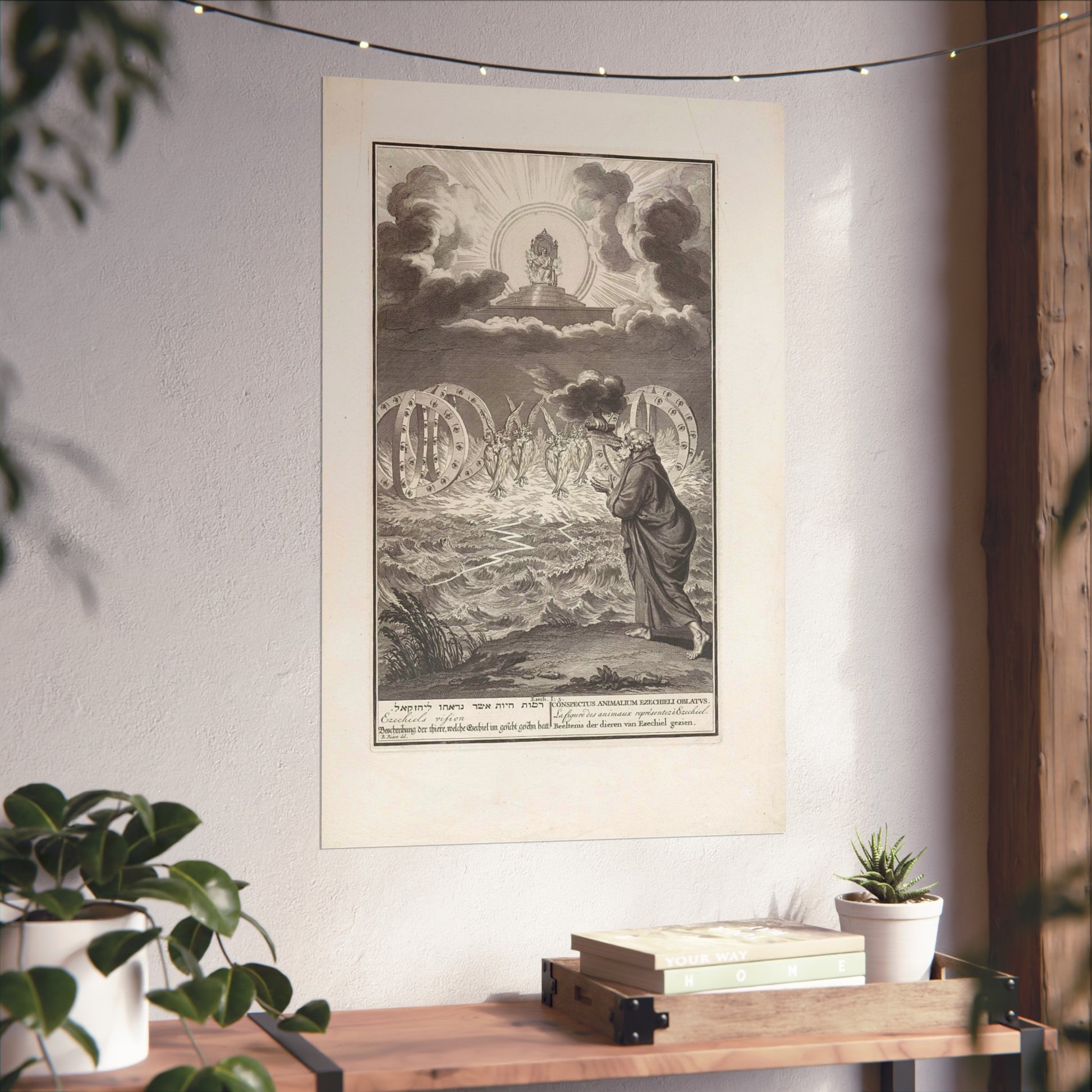 This vivid artwork portrays the Vision of Prophet Ezekiel. The divine power of God is depicted seated on his throne, surrounded by flames and rays of light. Four tetramorphic creatures emerge from the water, each with four faces - that of an eagle, an ox, a human, and a lion - and four wings. Adjacent to each creature, there's a double wheel adorned with eyes. On the right, Ezekiel is seen receiving a scroll with Hebrew text from God's hand. At the bottom, there's a single-line title in Hebrew, English, German, Latin, French, and Dutch based on Ezekiel 1:5.