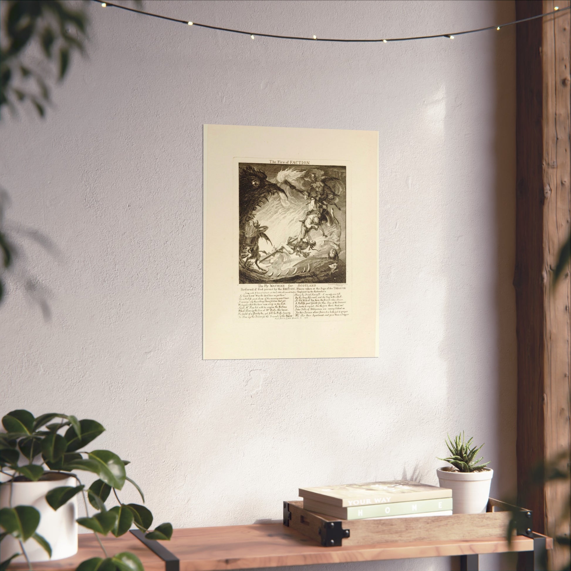 Depicted in this captivating artwork is a colossal flying burin, mounted by a devil and four humans, who are about to enter the gaping maw of a monstrous creature. The scene is set against an English text backdrop in the lower margin.