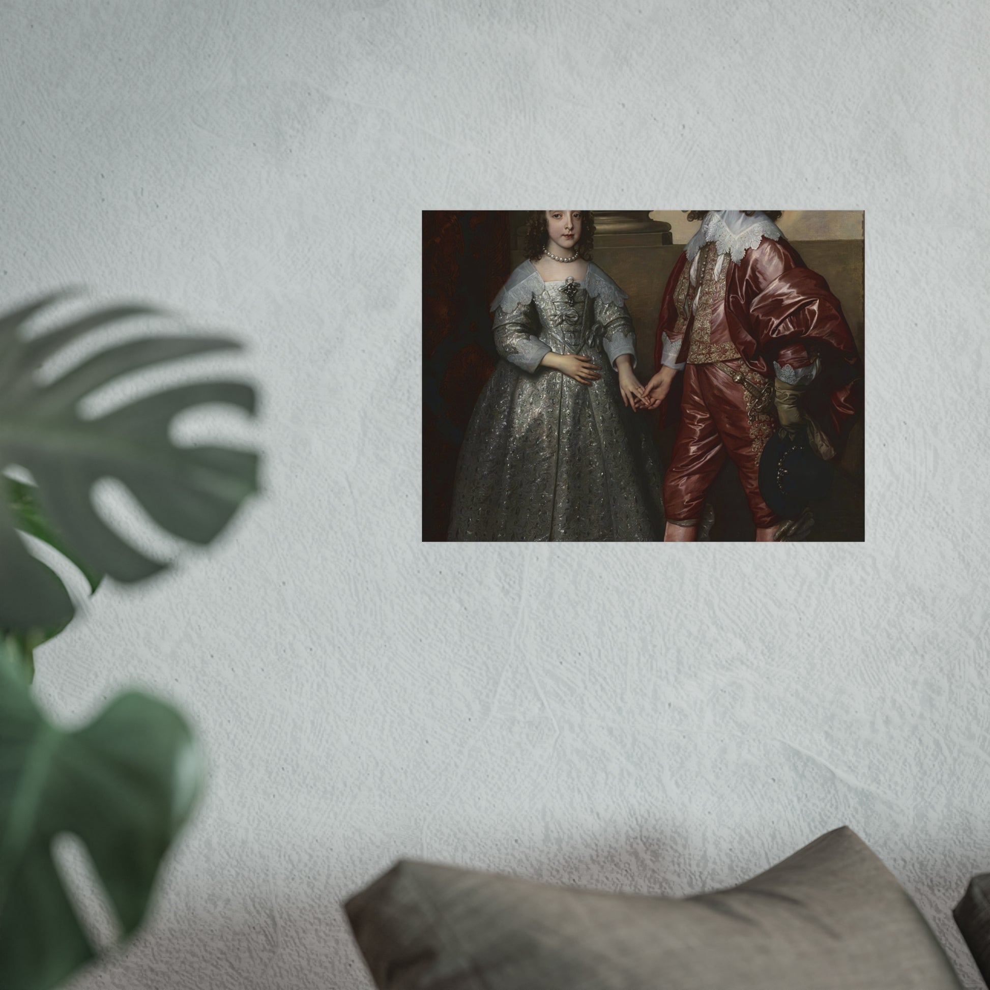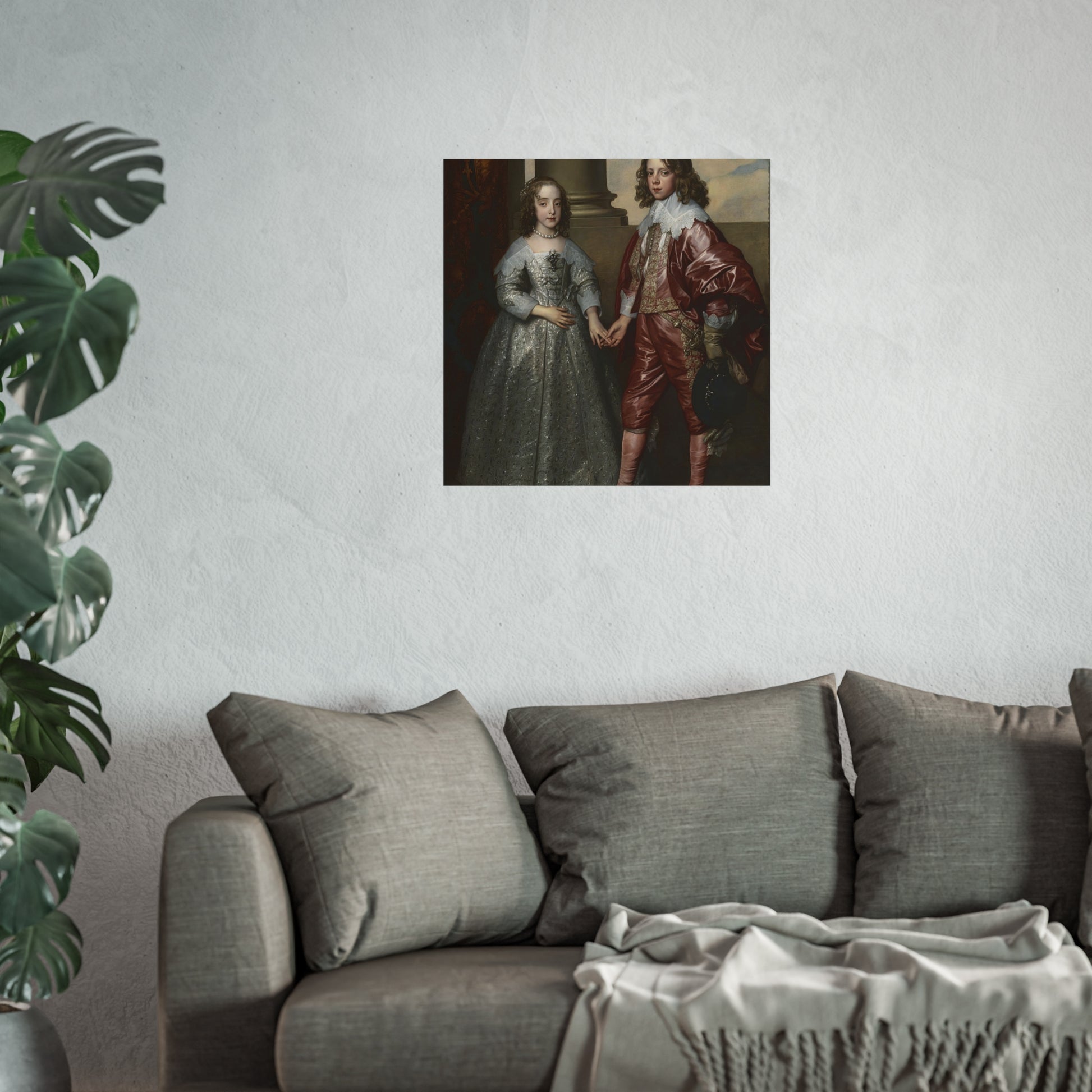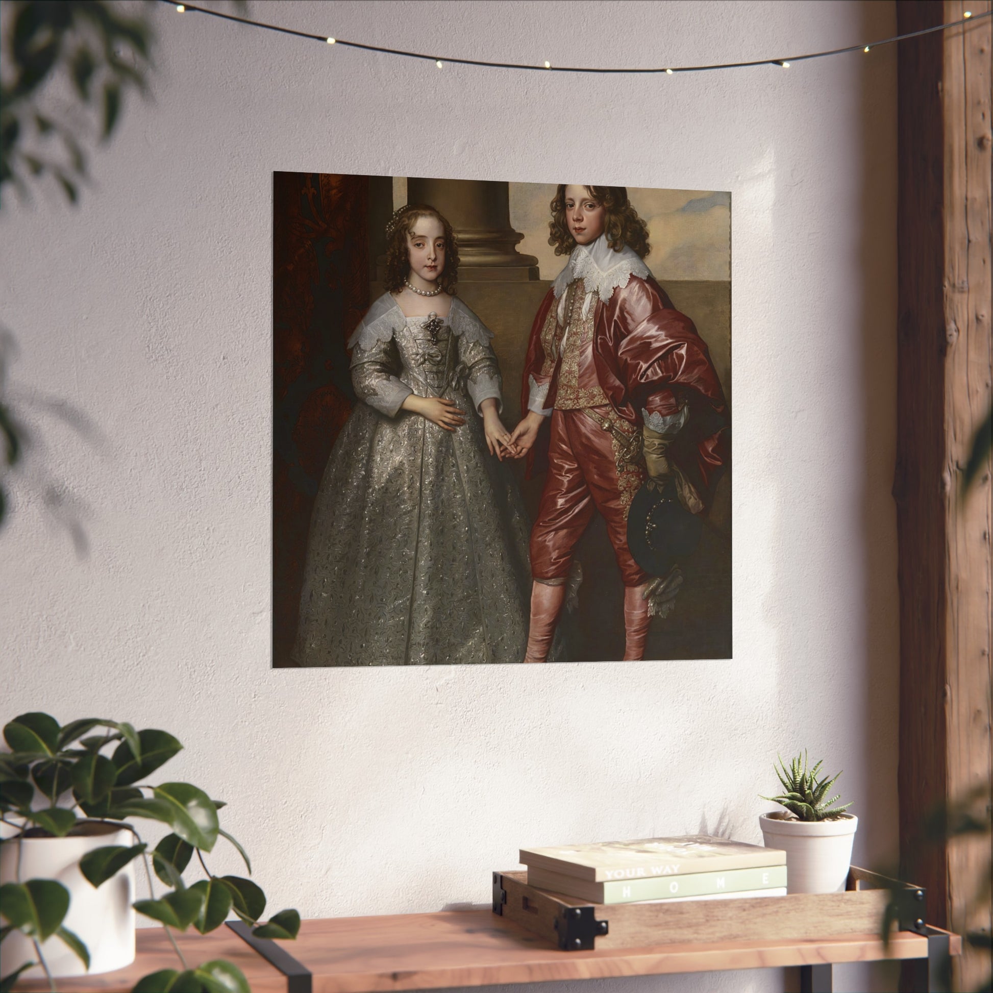This captivating portrait features William II, Prince of Orange, and his bride, Mary Stuart, daughter of King Charles I of England. The couple stands full-length, hand in hand, in front of a grand column. This masterpiece was created to commemorate their marriage on May 12, 1641.