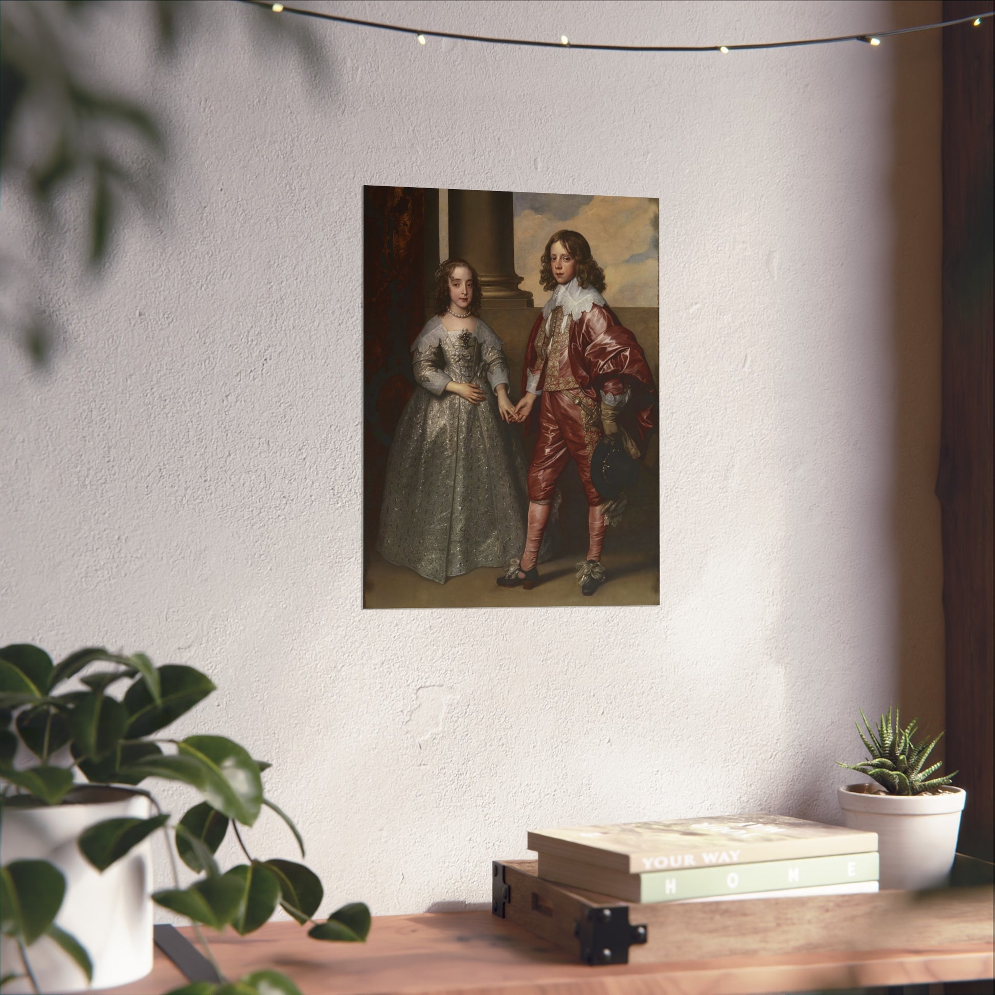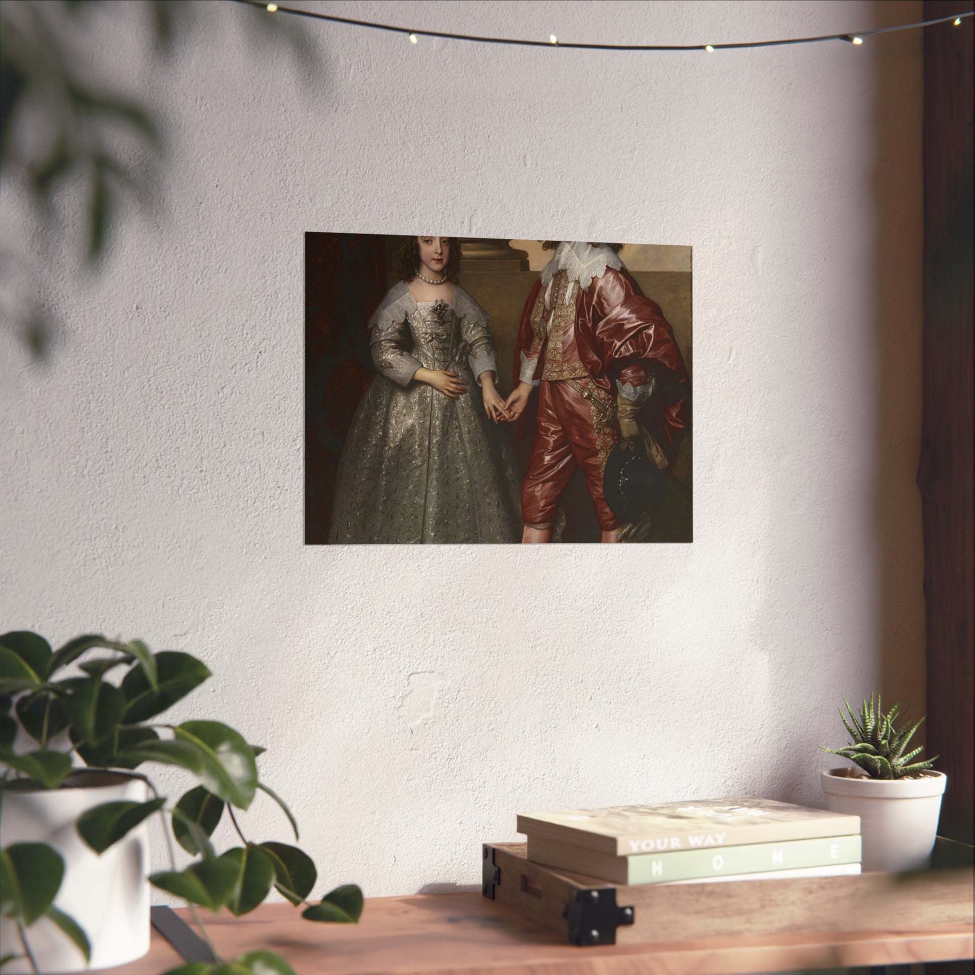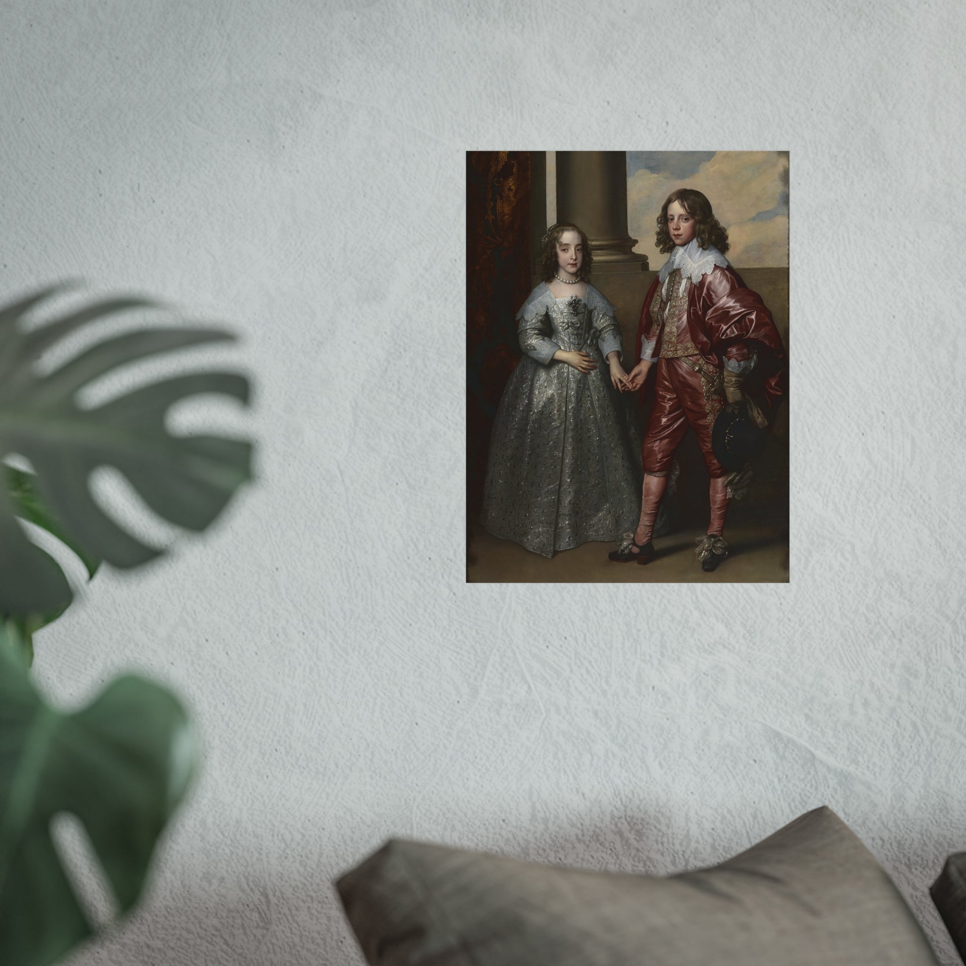 This captivating portrait features William II, Prince of Orange, and his bride, Mary Stuart, daughter of King Charles I of England. The couple stands full-length, hand in hand, in front of a grand column. This masterpiece was created to commemorate their marriage on May 12, 1641.