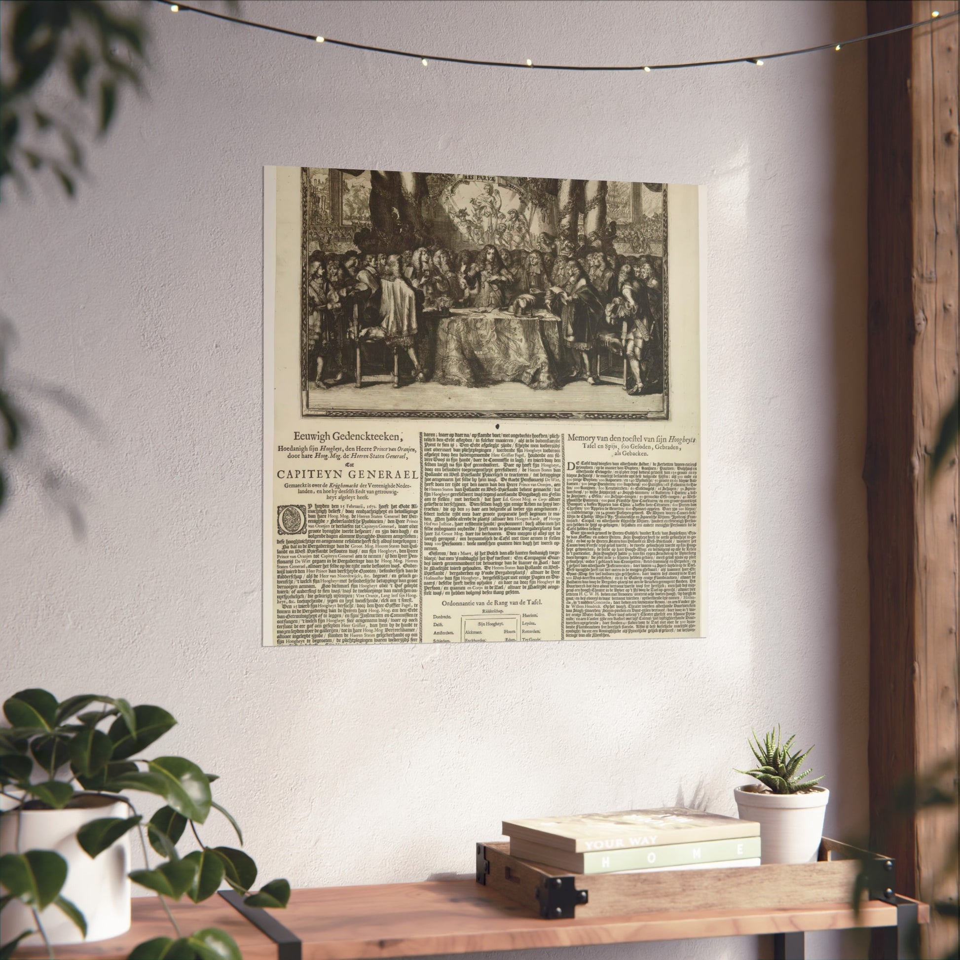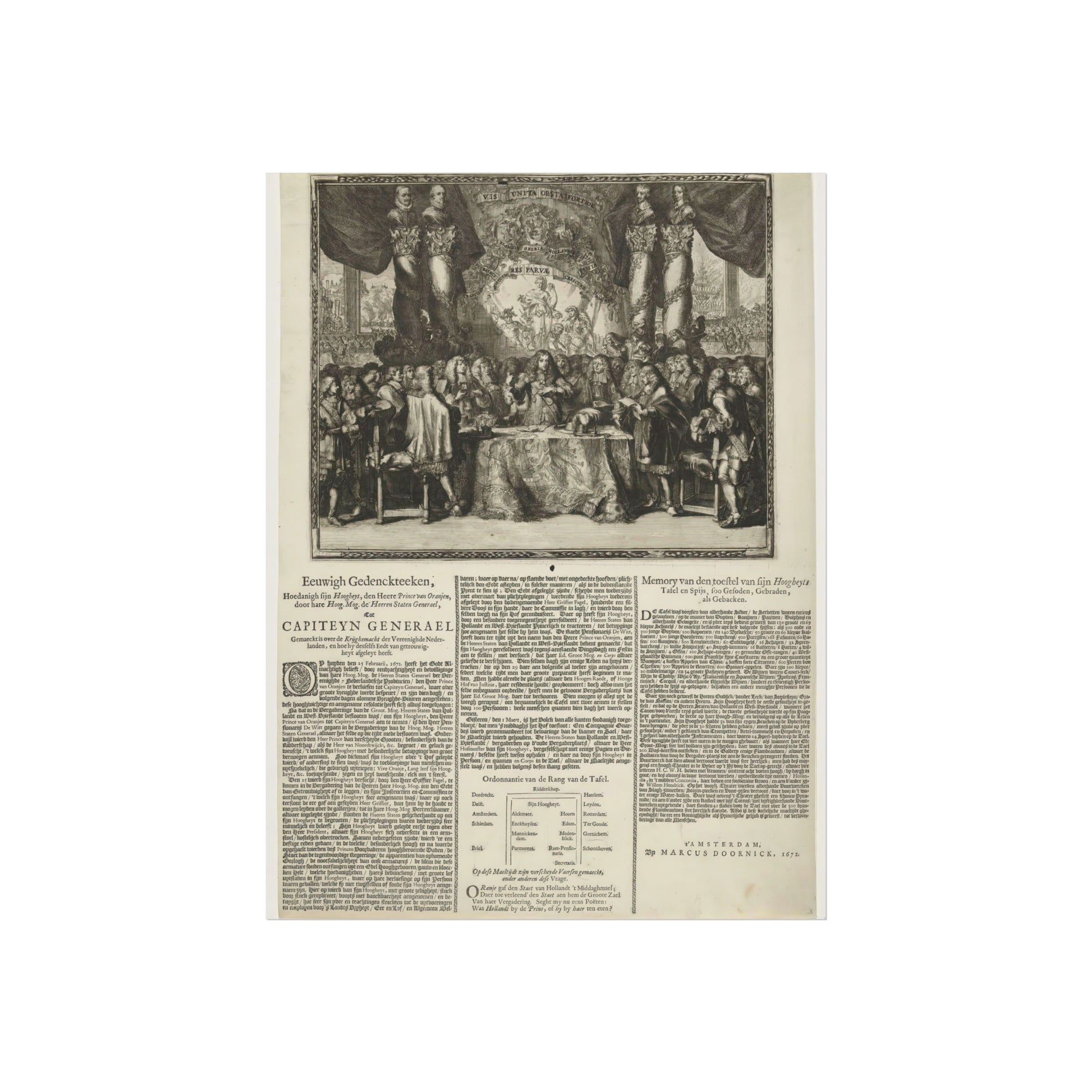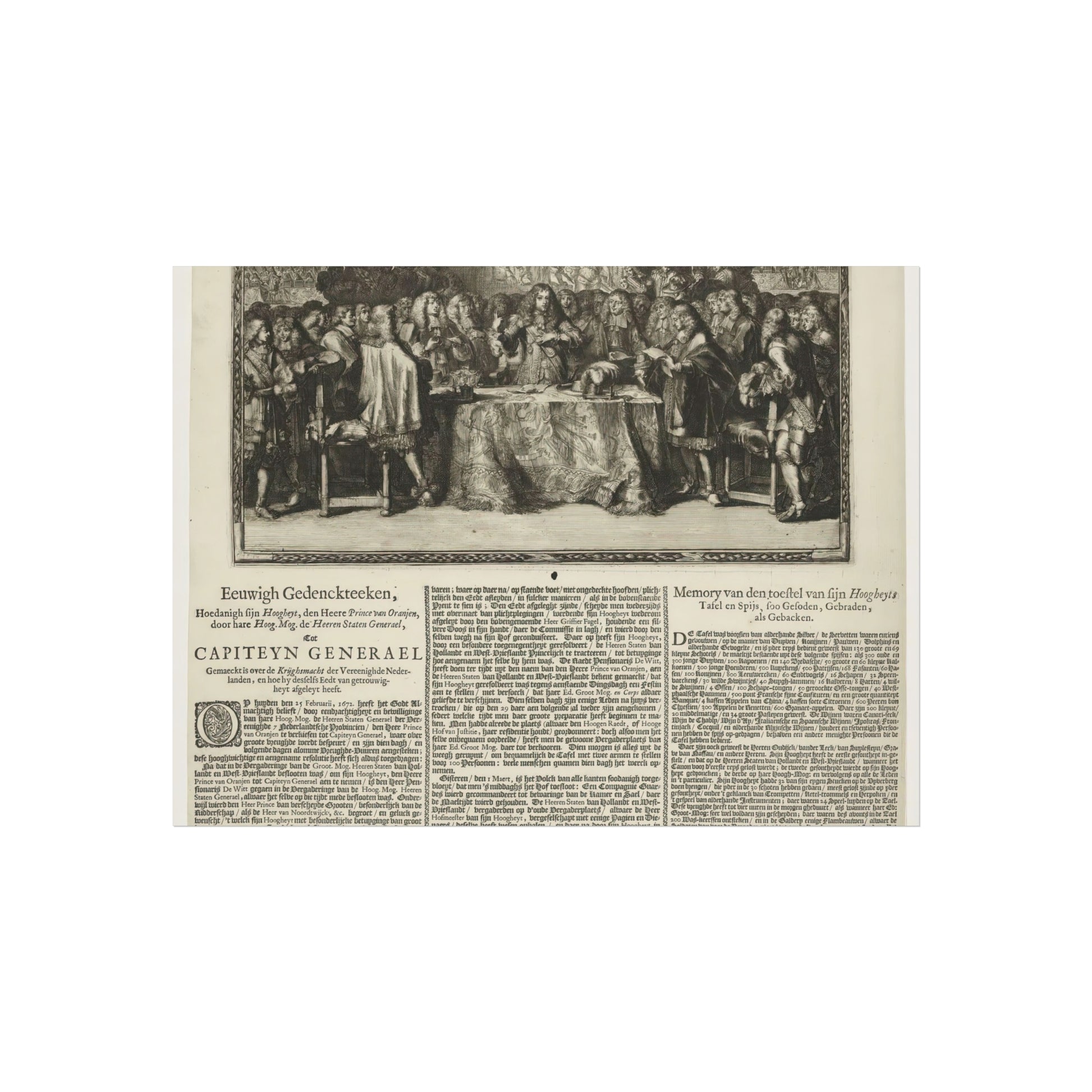 A dramatic depiction capturing the moment Prince William III is sworn in as Captain-General of the Dutch armed forces. The scene shows the prince taking the oath of loyalty in front of Gaspar Fagel, the clerk of the States-General. Behind them, a grand tapestry portrays the Dutch Maiden in the Garden of Holland, flanked by columns with busts of William of Orange, Prince Maurice, Frederick Henry, and William II. In the background, two smaller scenes illustrate a banquet and fireworks held in honor of the prince's appointment. Below the main image, a printed text in three columns describes the inauguration and feast, complete with a seating plan and an explanation of the scene., William III takes the oath as Captain-General of the Dutch armed forces, 1672.