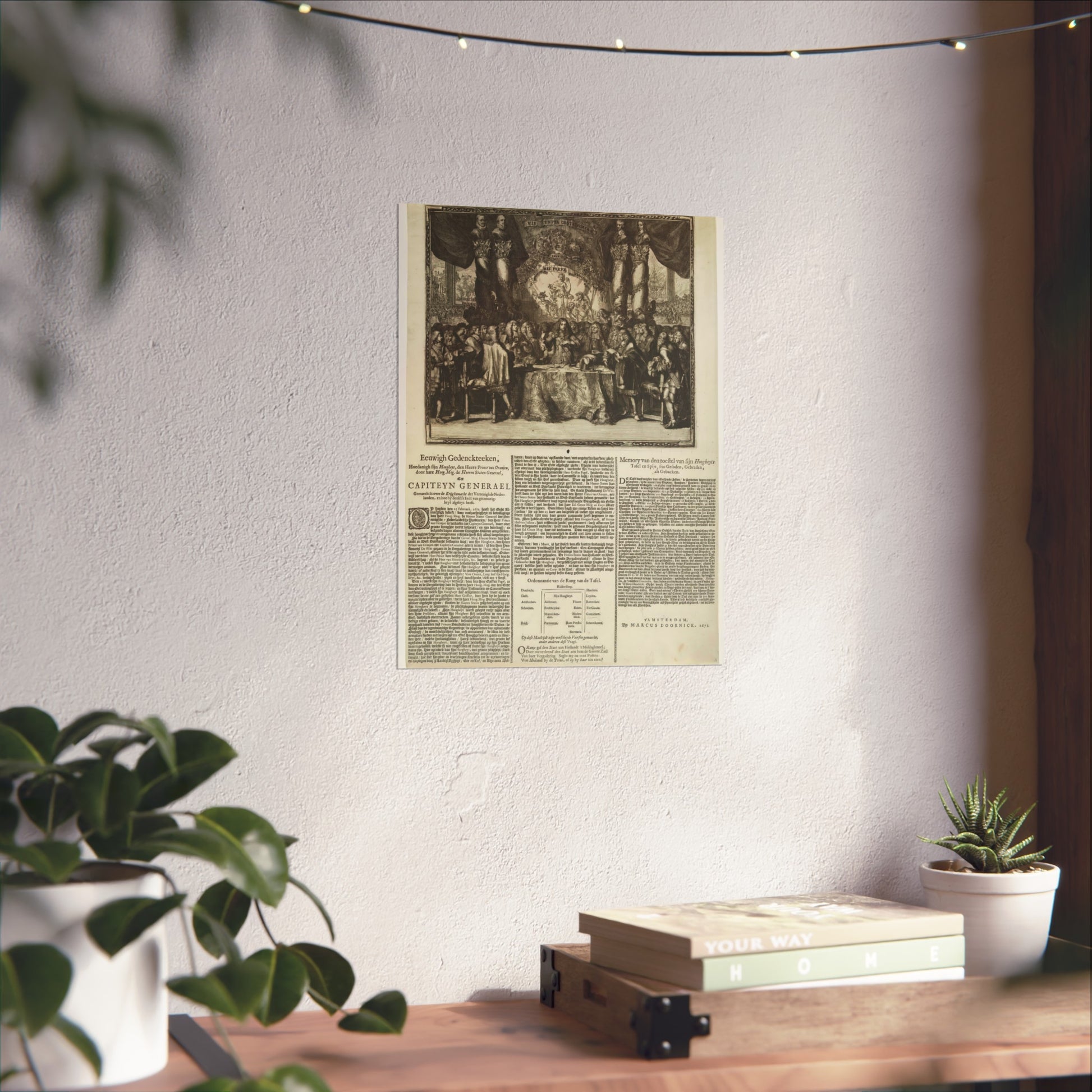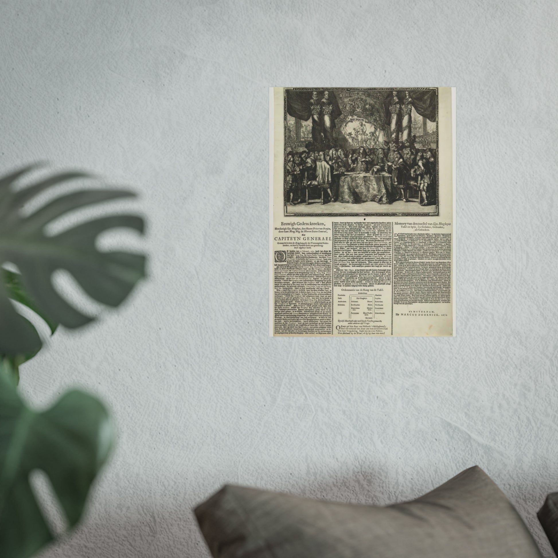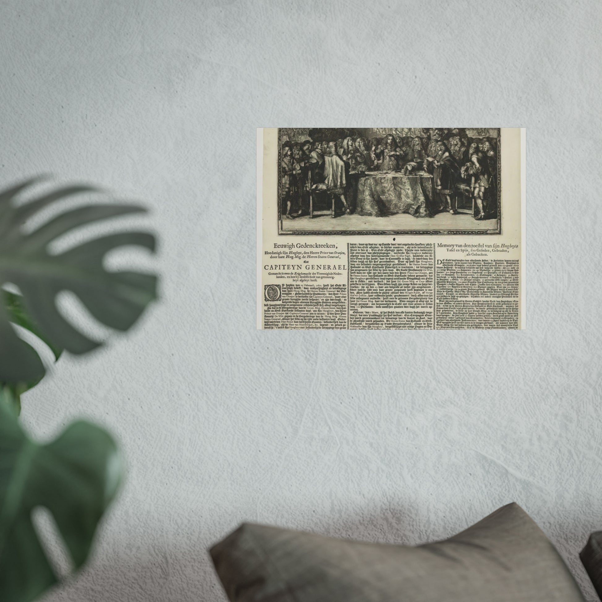 A dramatic depiction capturing the moment Prince William III is sworn in as Captain-General of the Dutch armed forces. The scene shows the prince taking the oath of loyalty in front of Gaspar Fagel, the clerk of the States-General. Behind them, a grand tapestry portrays the Dutch Maiden in the Garden of Holland, flanked by columns with busts of William of Orange, Prince Maurice, Frederick Henry, and William II. In the background, two smaller scenes illustrate a banquet and fireworks held in honor of the prince's appointment. Below the main image, a printed text in three columns describes the inauguration and feast, complete with a seating plan and an explanation of the scene., William III takes the oath as Captain-General of the Dutch armed forces, 1672.
