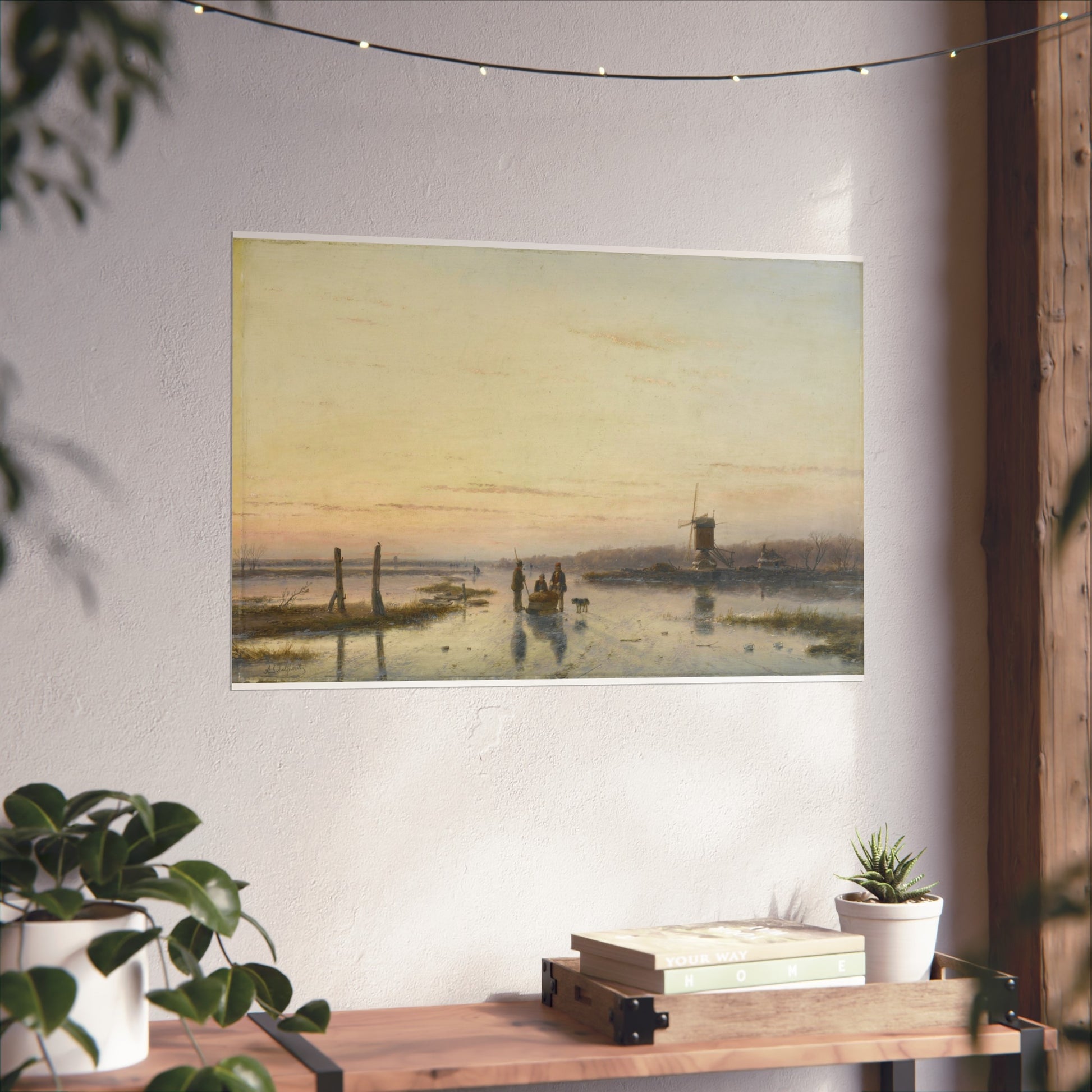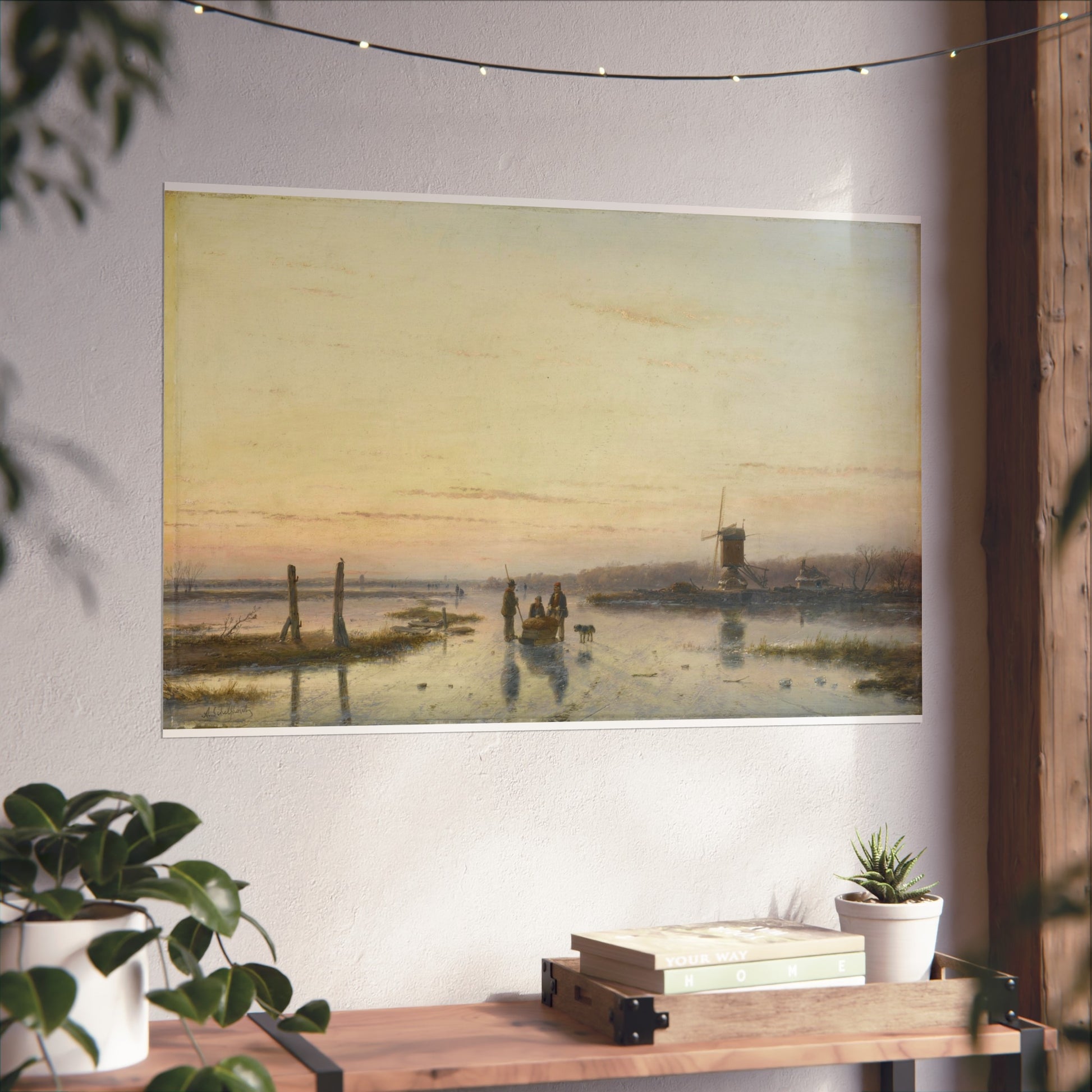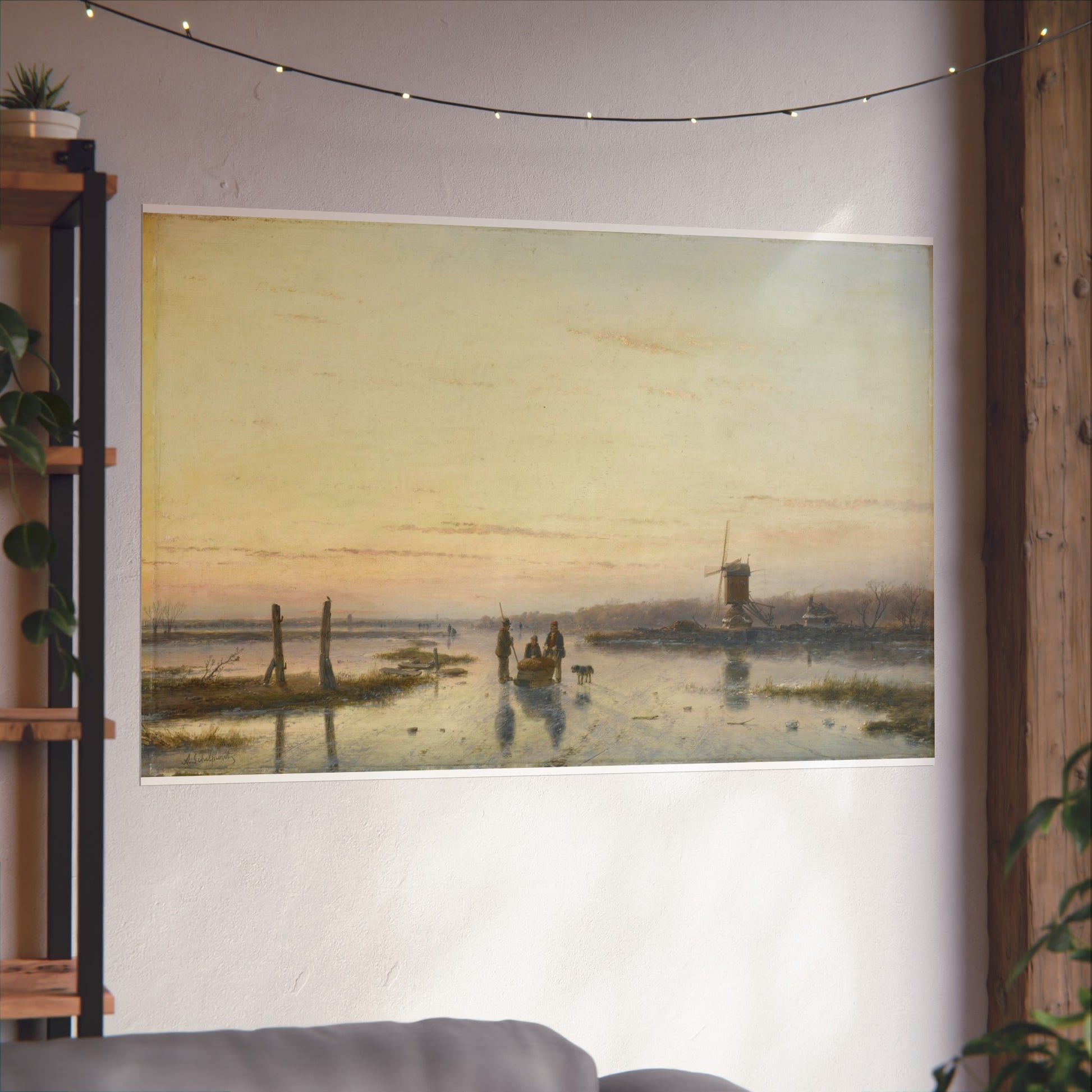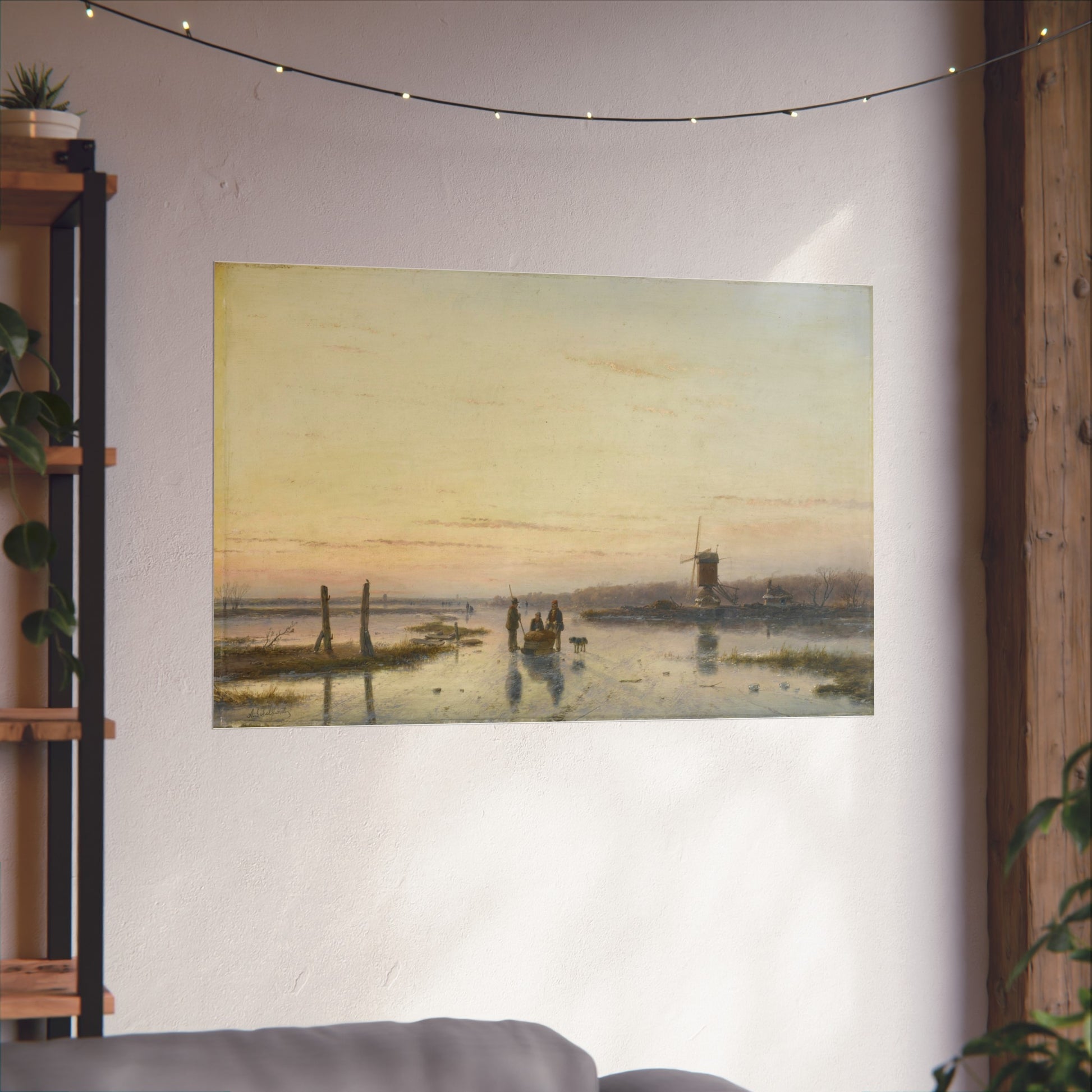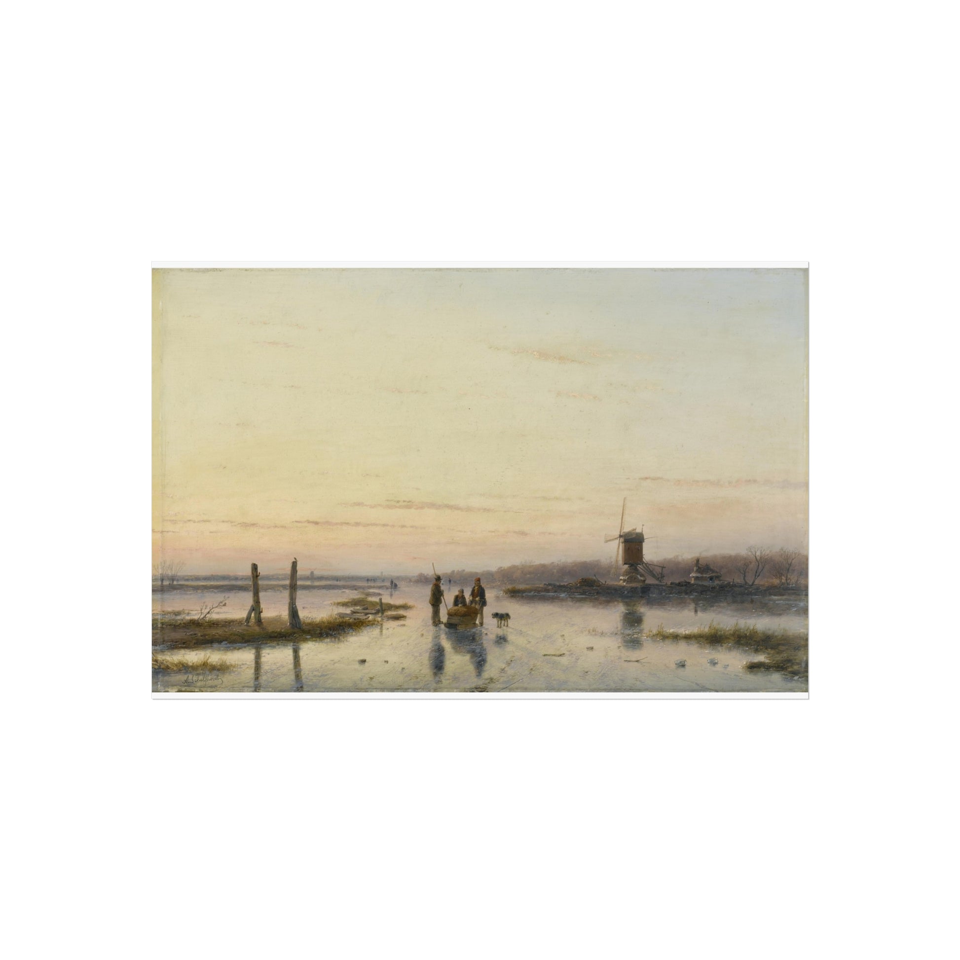 Experience the chill of winter in this evocative scene by Andreas Schelfhout. Three figures gather around a sled on the frozen surface of a river, with a windmill standing sentinel to the right. In the distance, the ice is alive with skaters, their tiny forms adding life to the serene landscape.