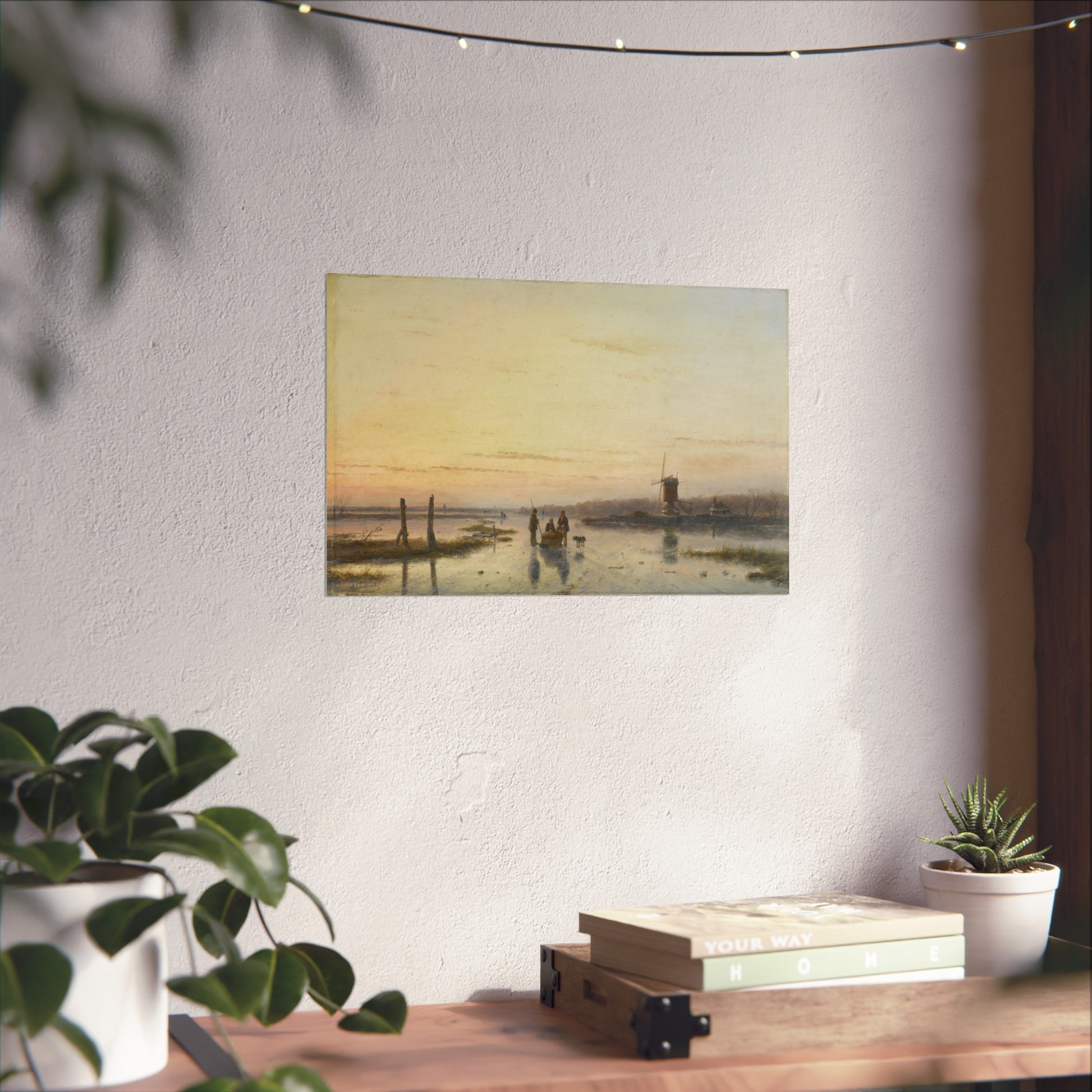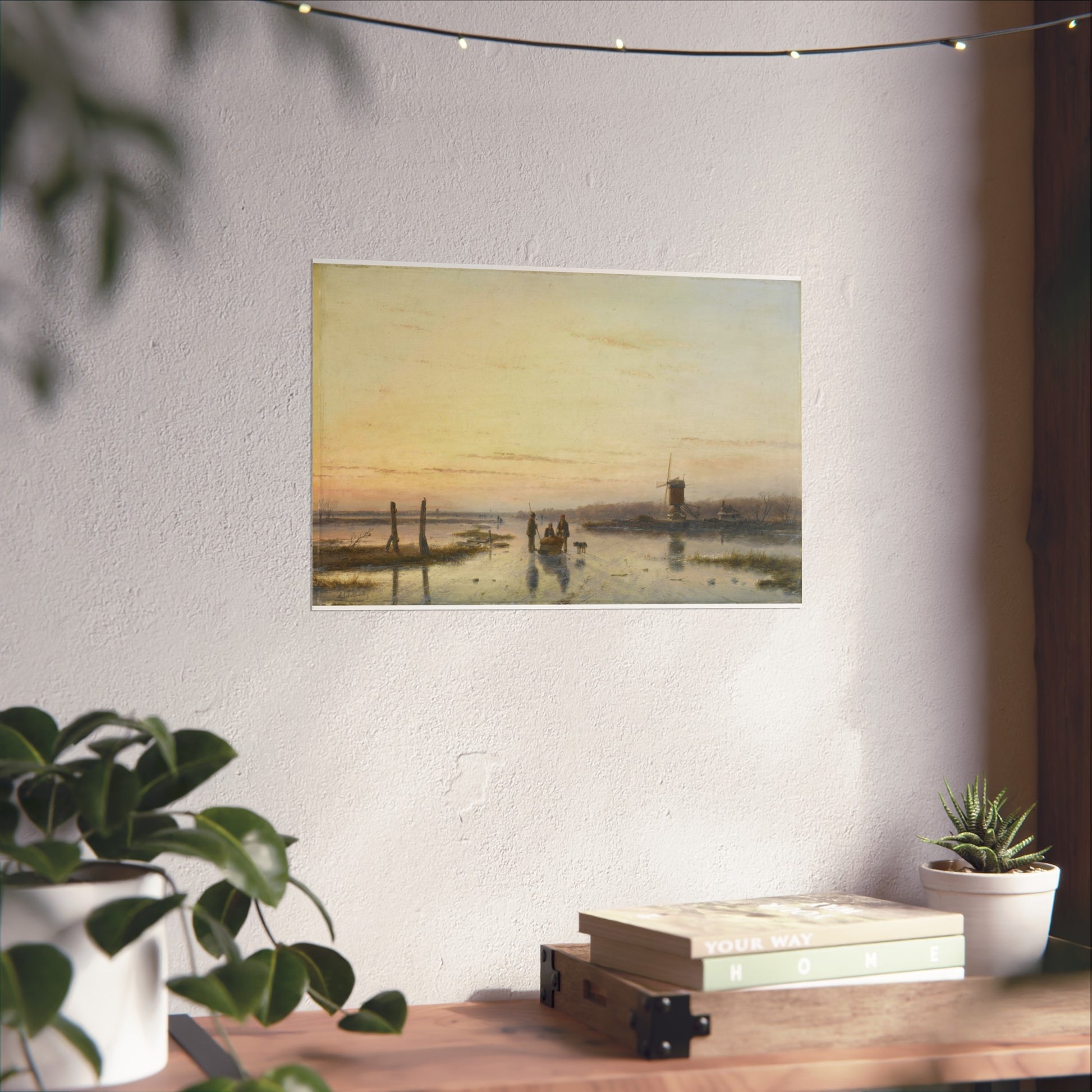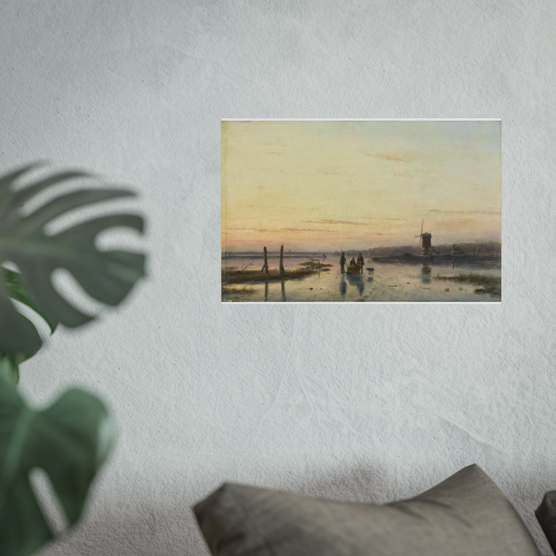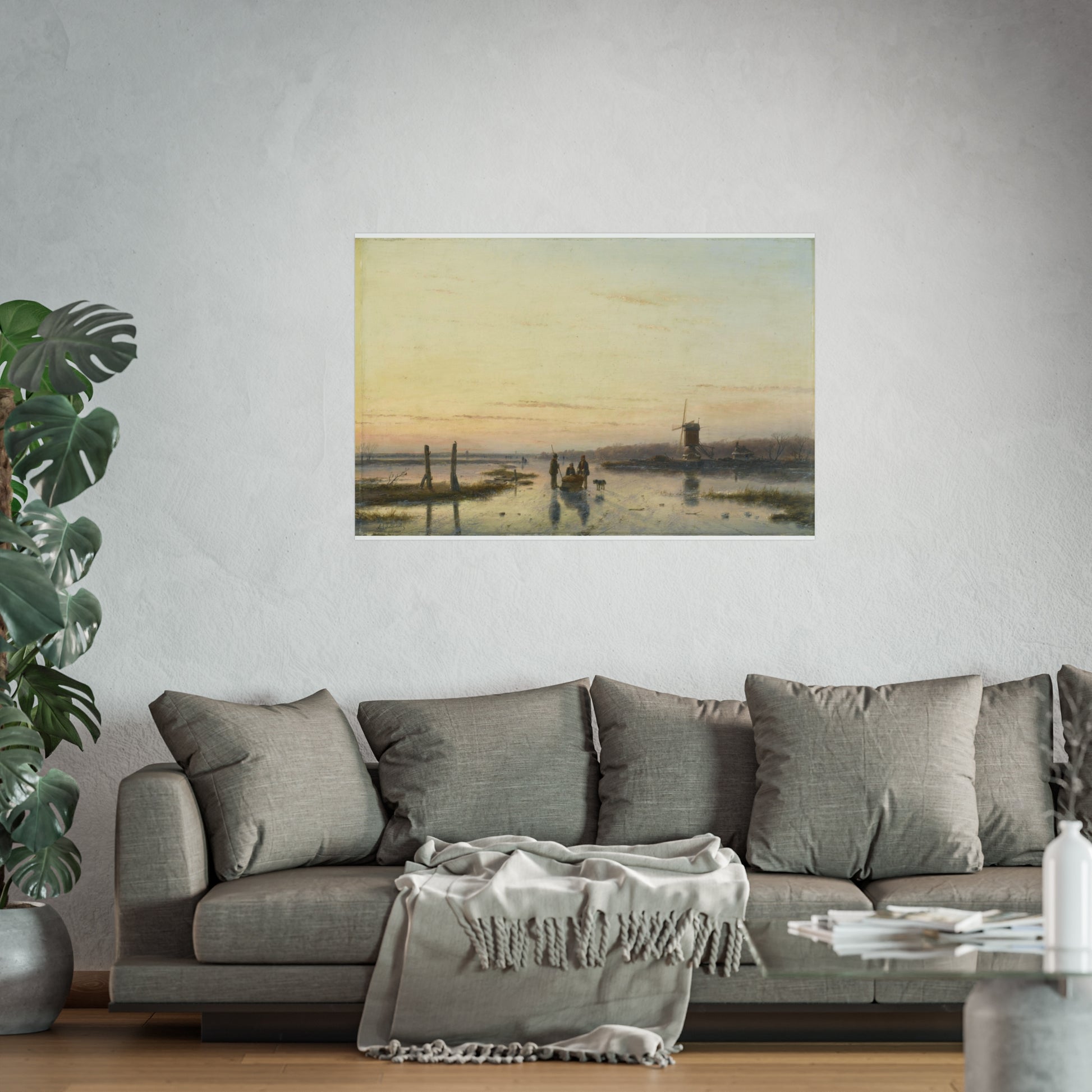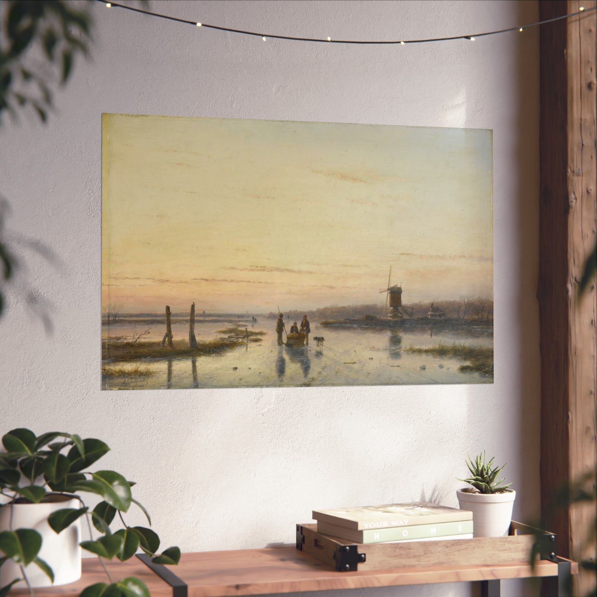 Experience the chill of winter in this evocative scene by Andreas Schelfhout. Three figures gather around a sled on the frozen surface of a river, with a windmill standing sentinel to the right. In the distance, the ice is alive with skaters, their tiny forms adding life to the serene landscape.