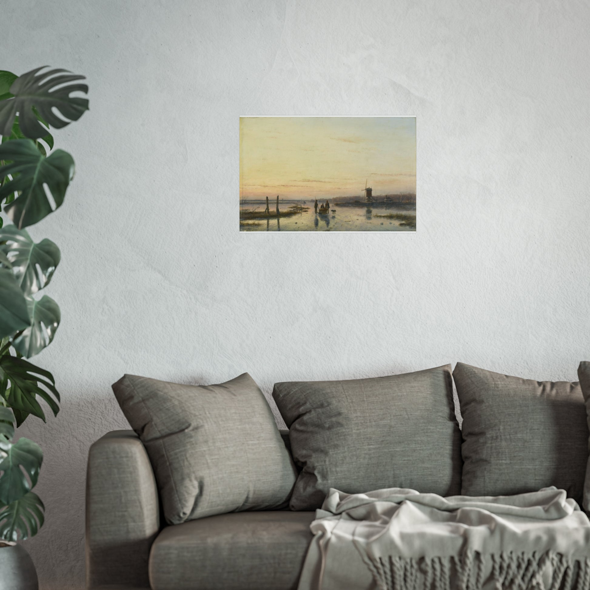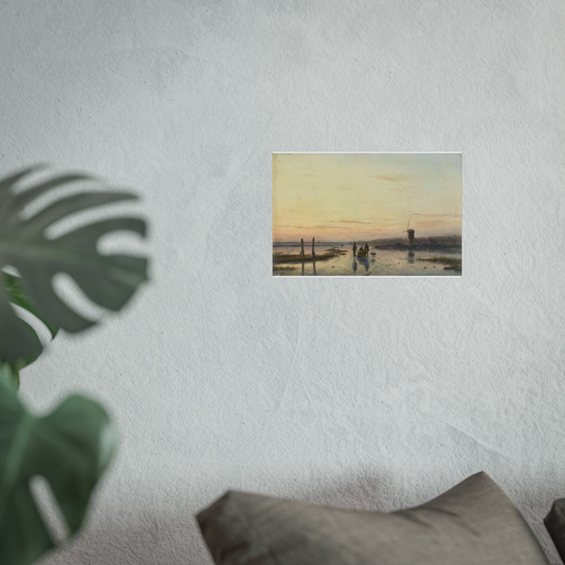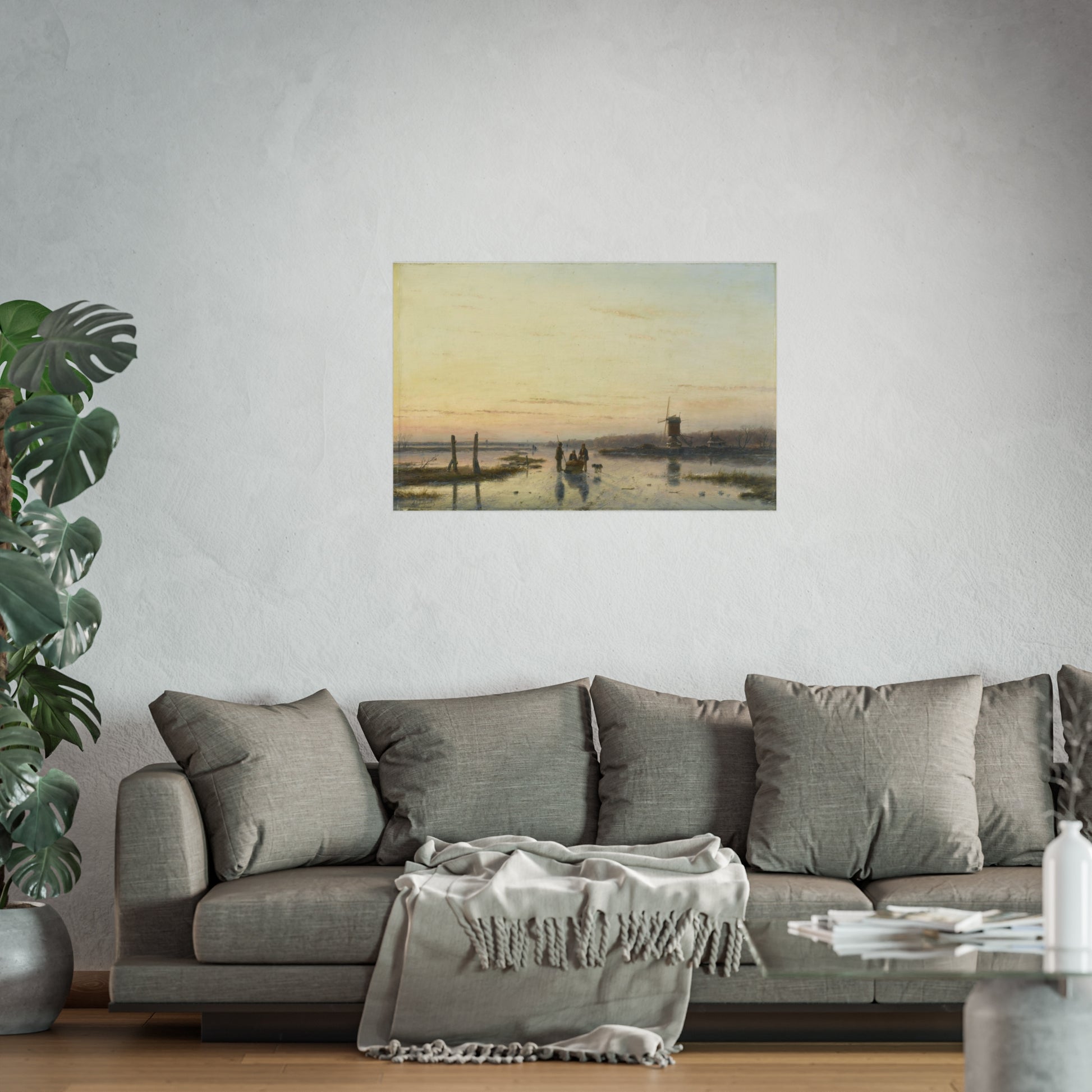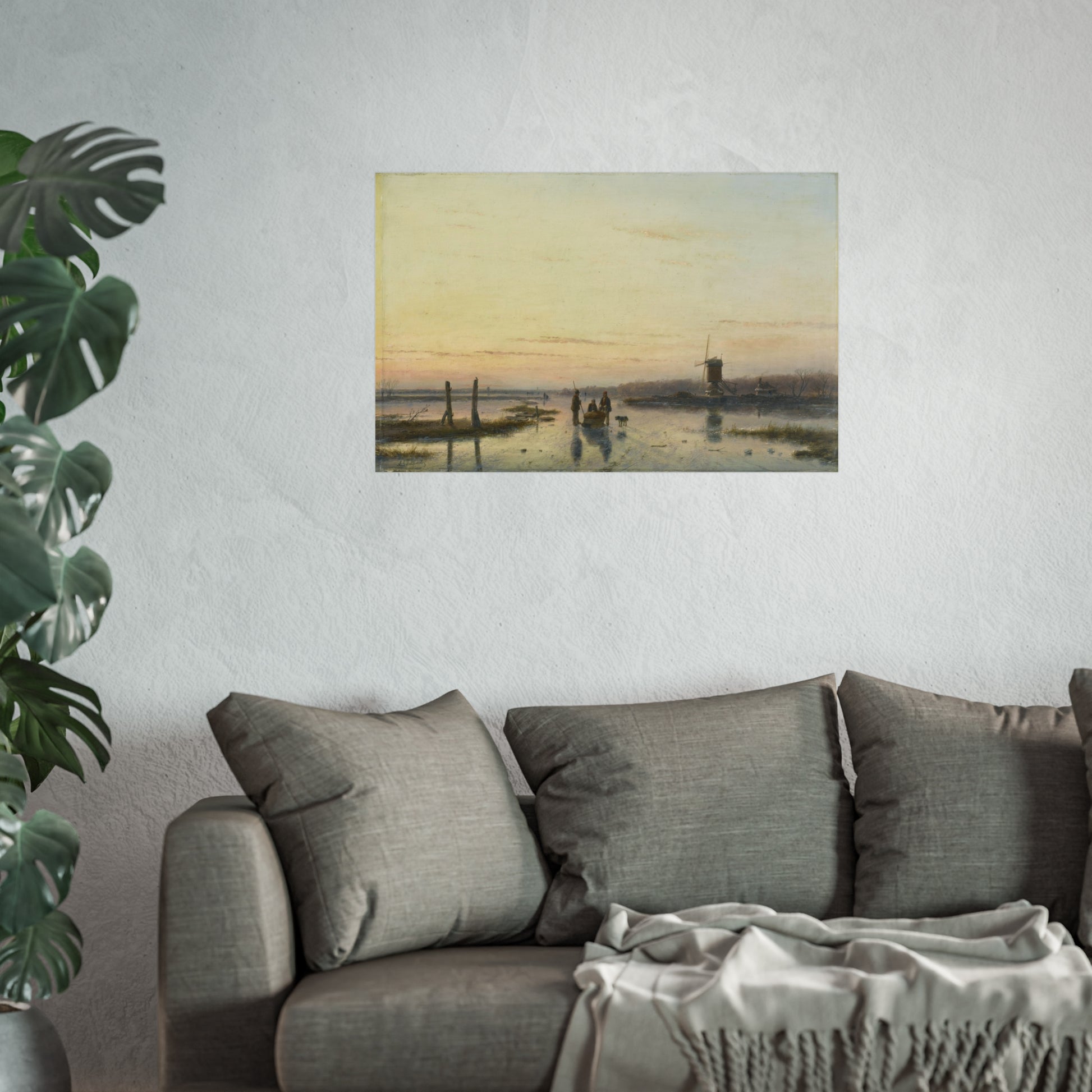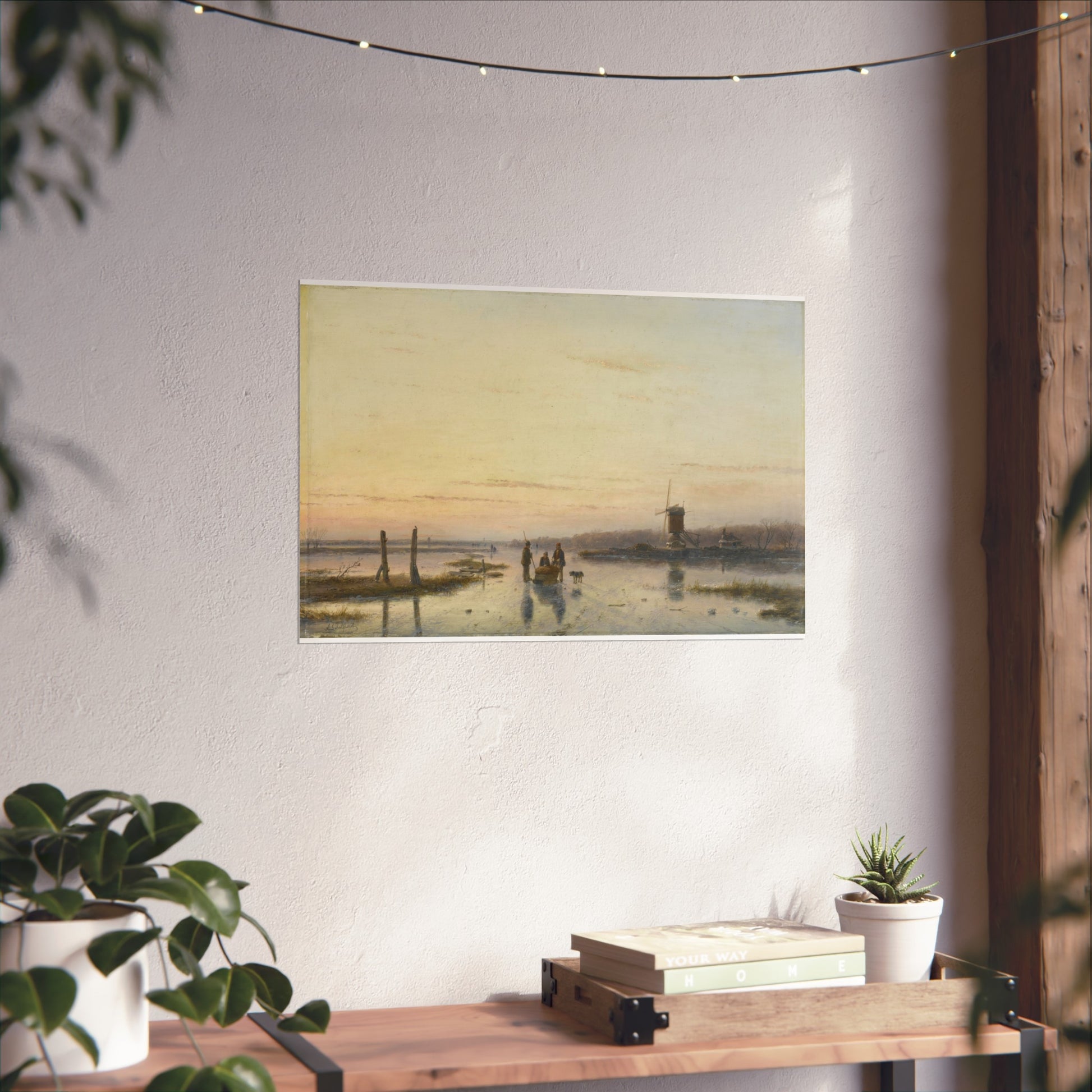 Experience the chill of winter in this evocative scene by Andreas Schelfhout. Three figures gather around a sled on the frozen surface of a river, with a windmill standing sentinel to the right. In the distance, the ice is alive with skaters, their tiny forms adding life to the serene landscape.