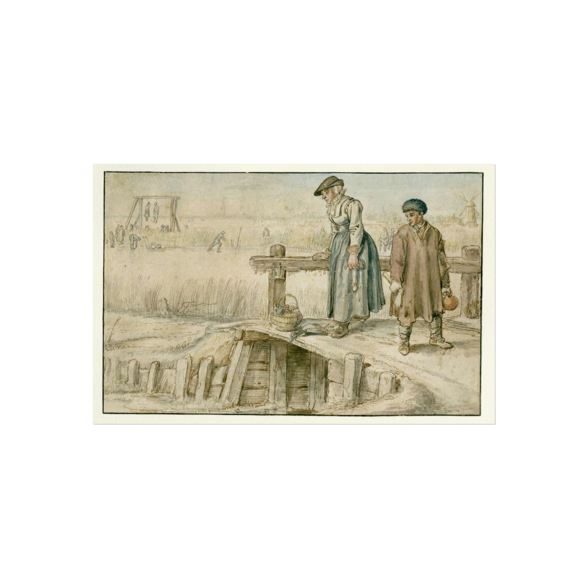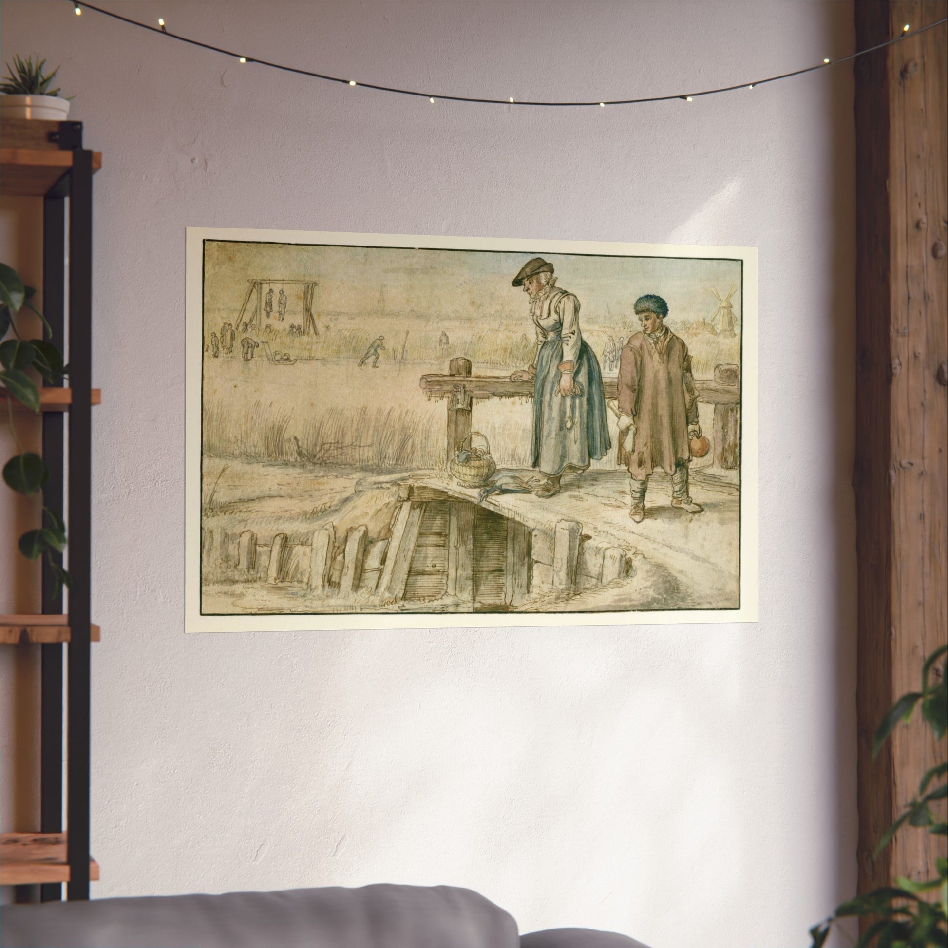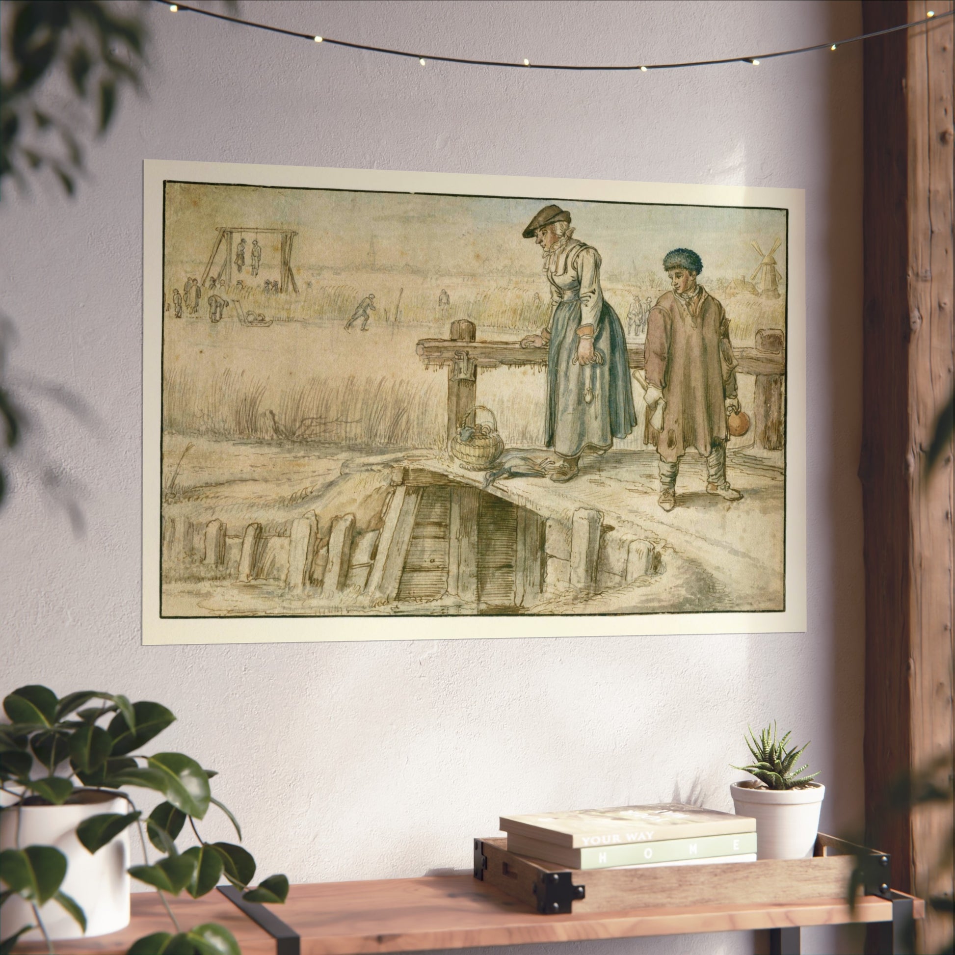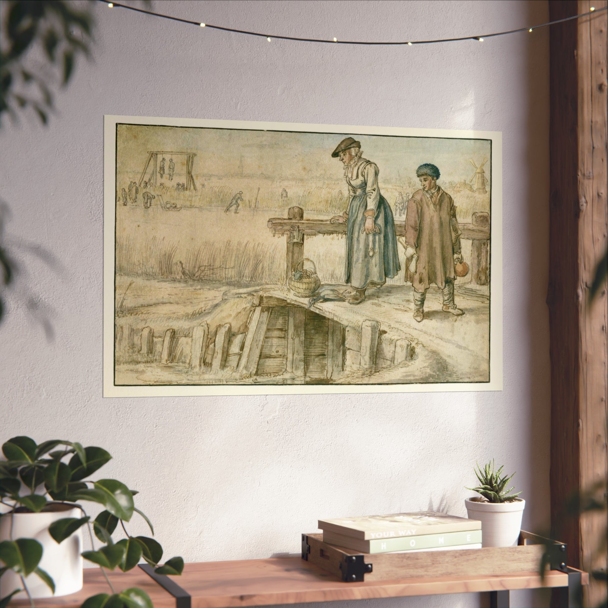 Winter Landscape with a Woman and a Youth on a Small Bridge, Skaters and a Gallows in the Distance, 1620