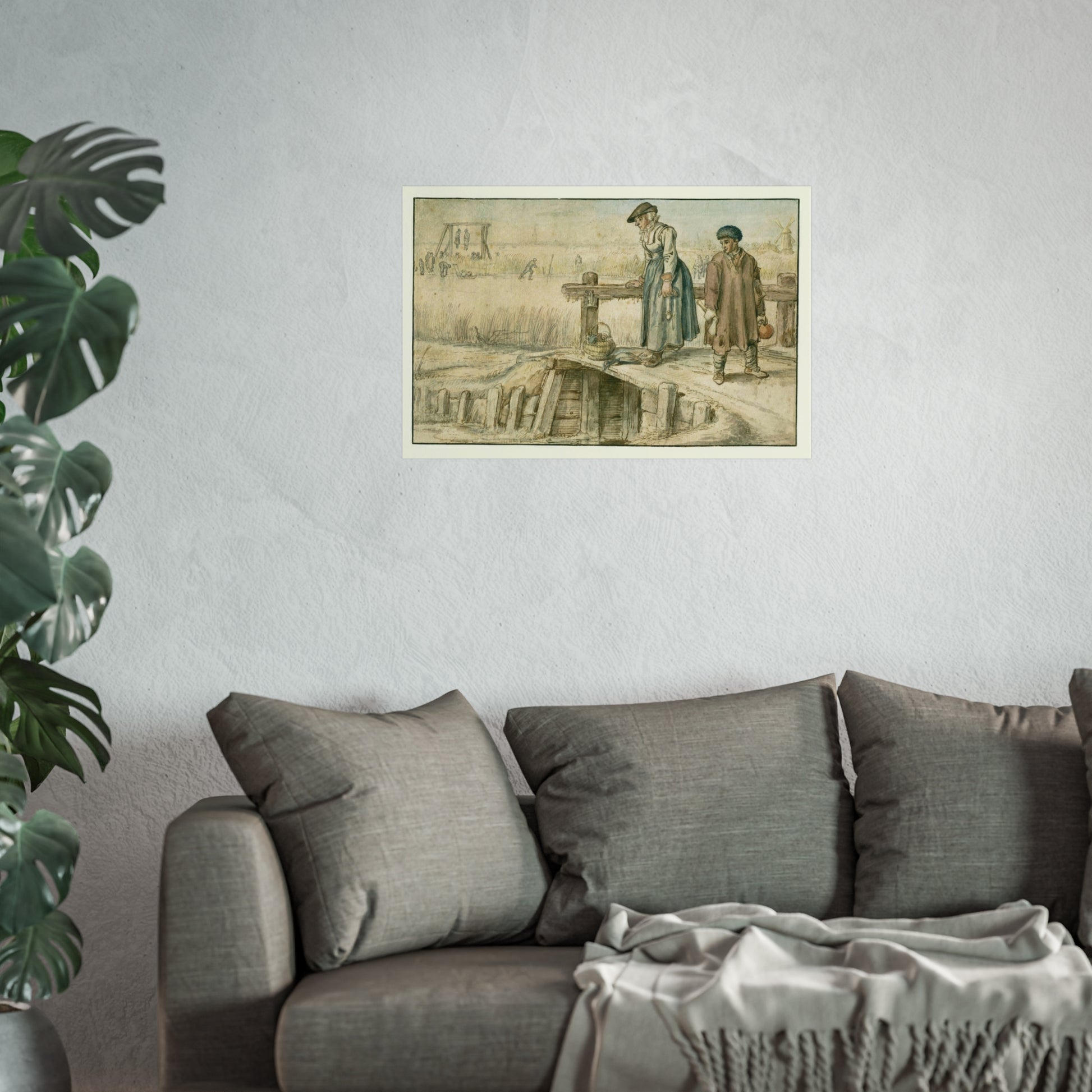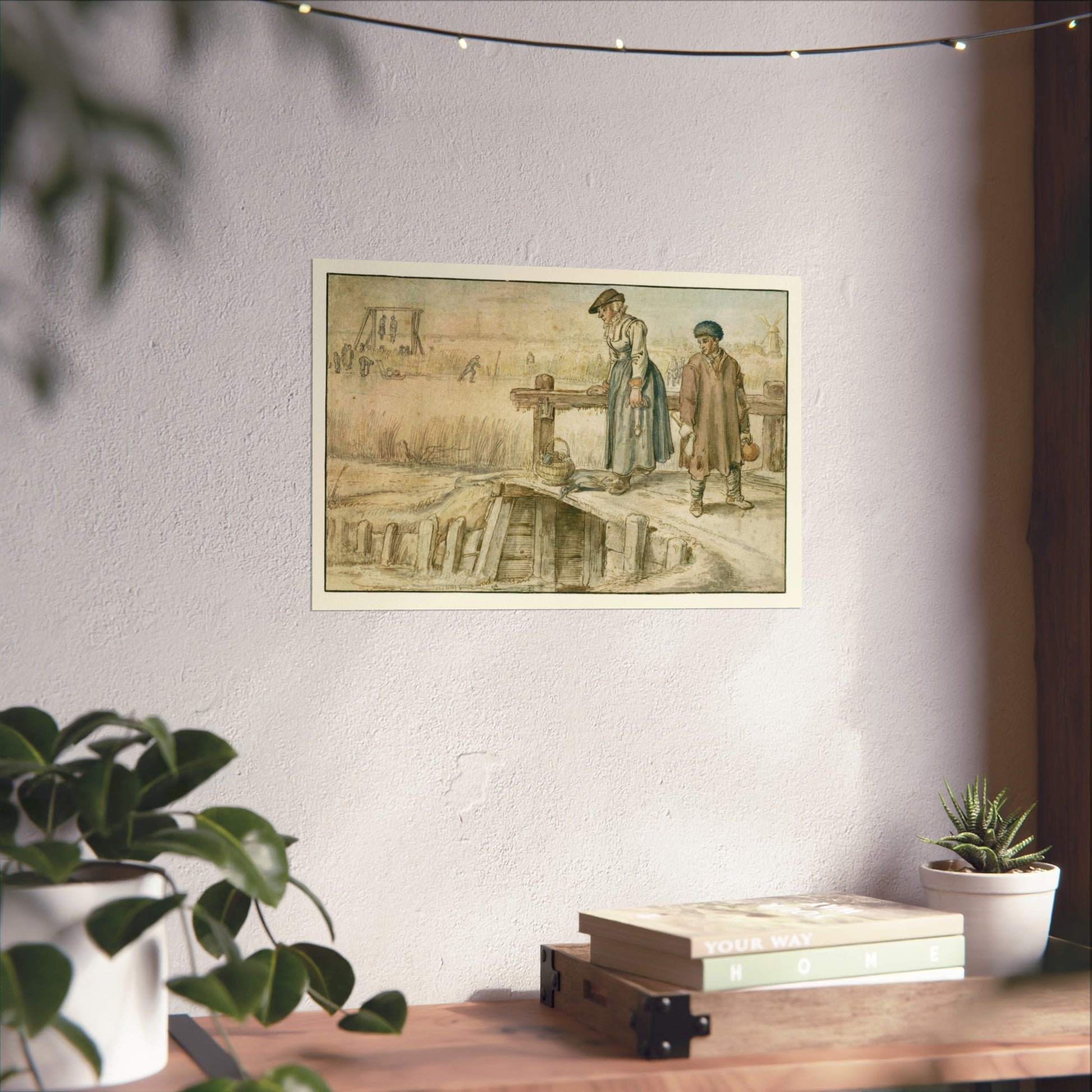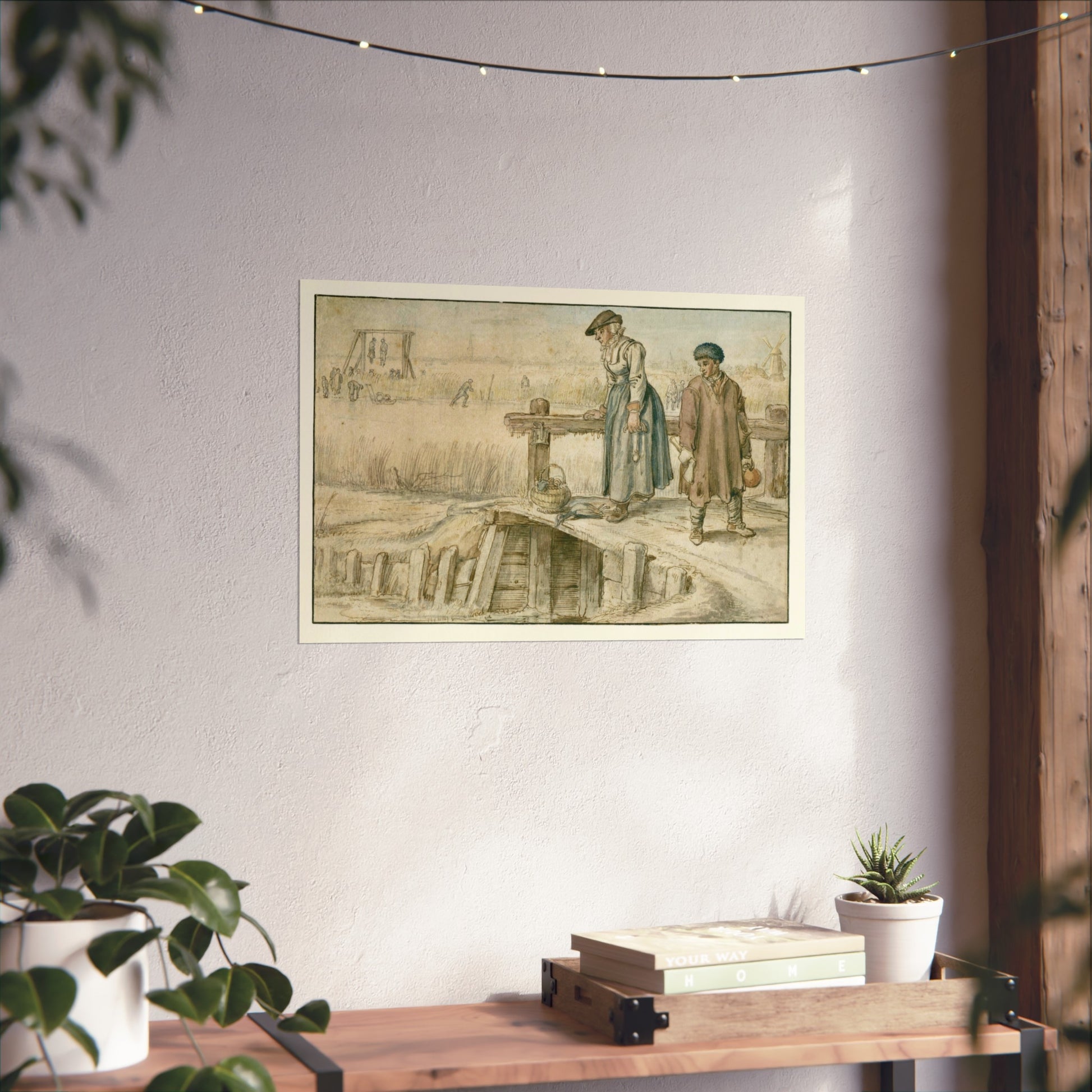 Winter Landscape with a Woman and a Youth on a Small Bridge, Skaters and a Gallows in the Distance, 1620