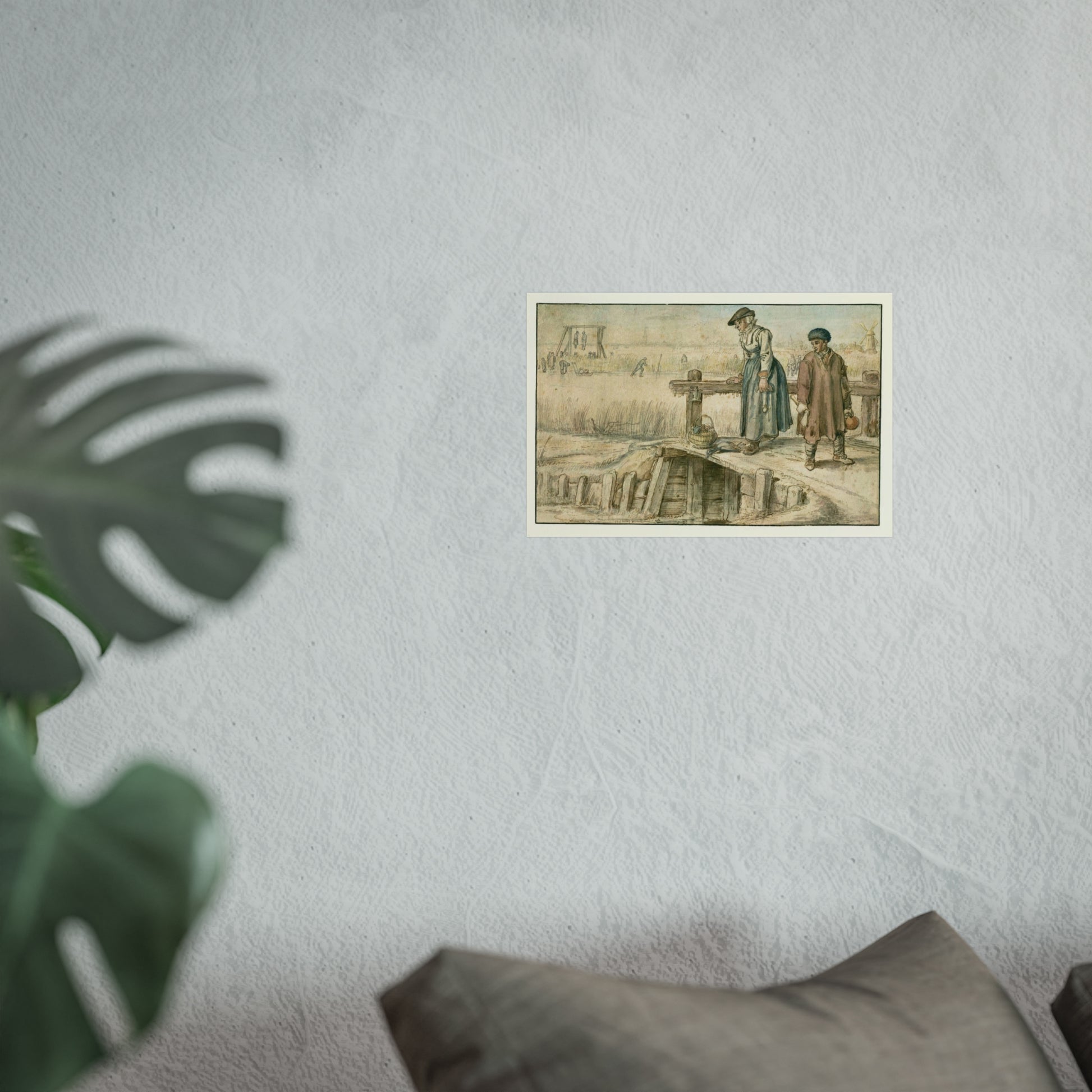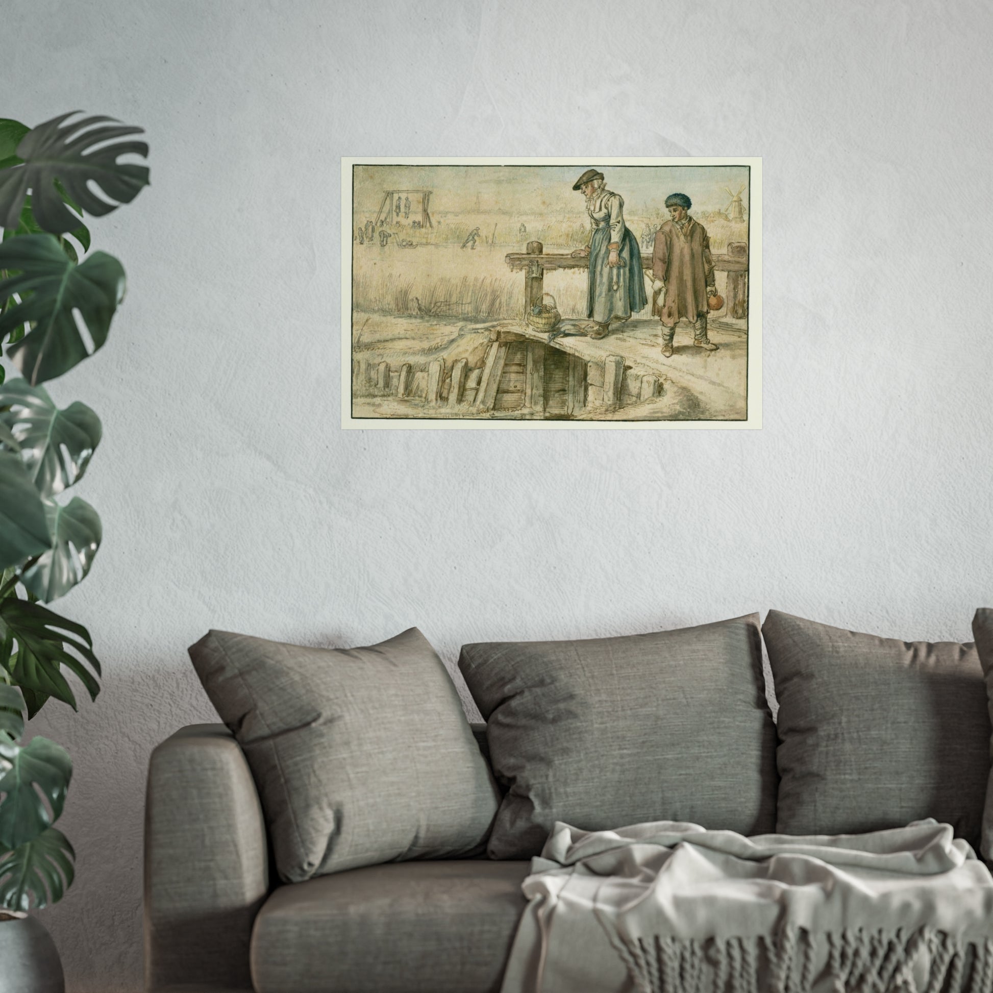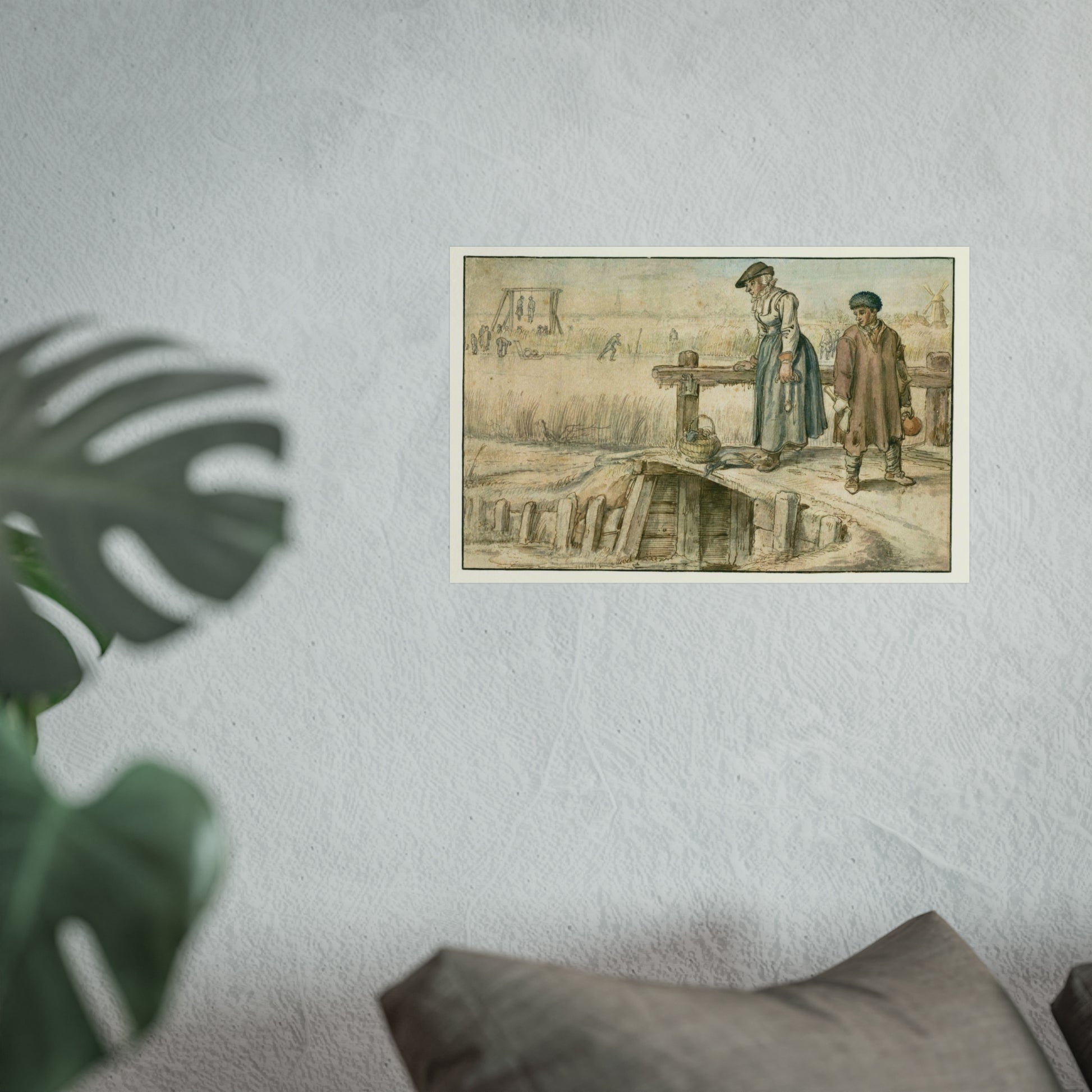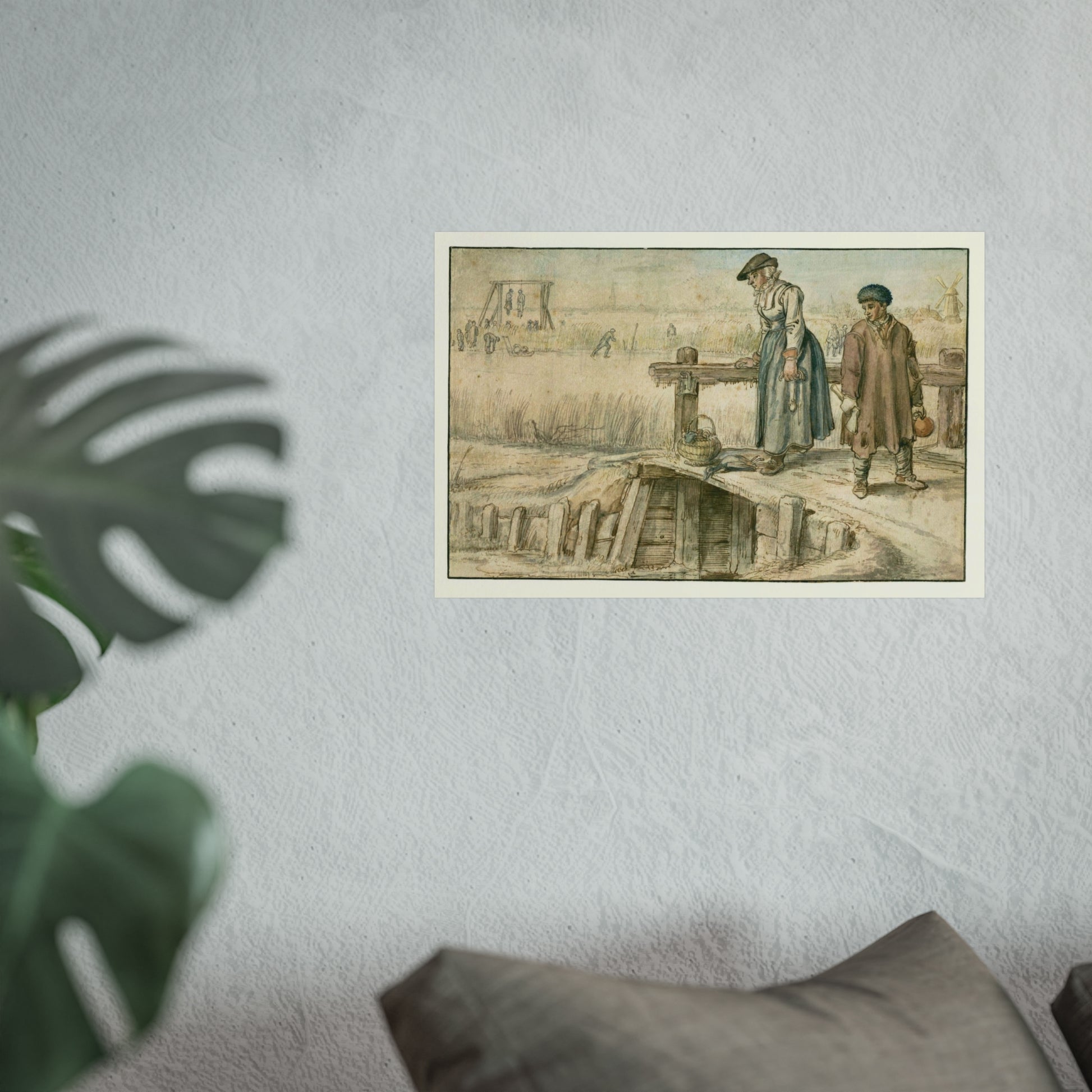 Winter Landscape with a Woman and a Youth on a Small Bridge, Skaters and a Gallows in the Distance, 1620
