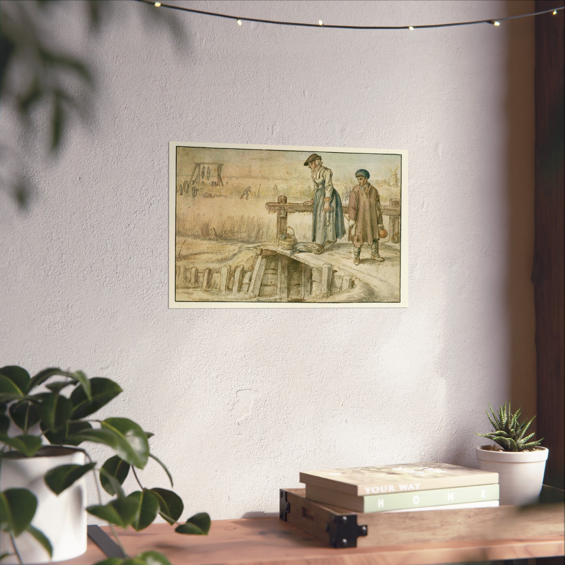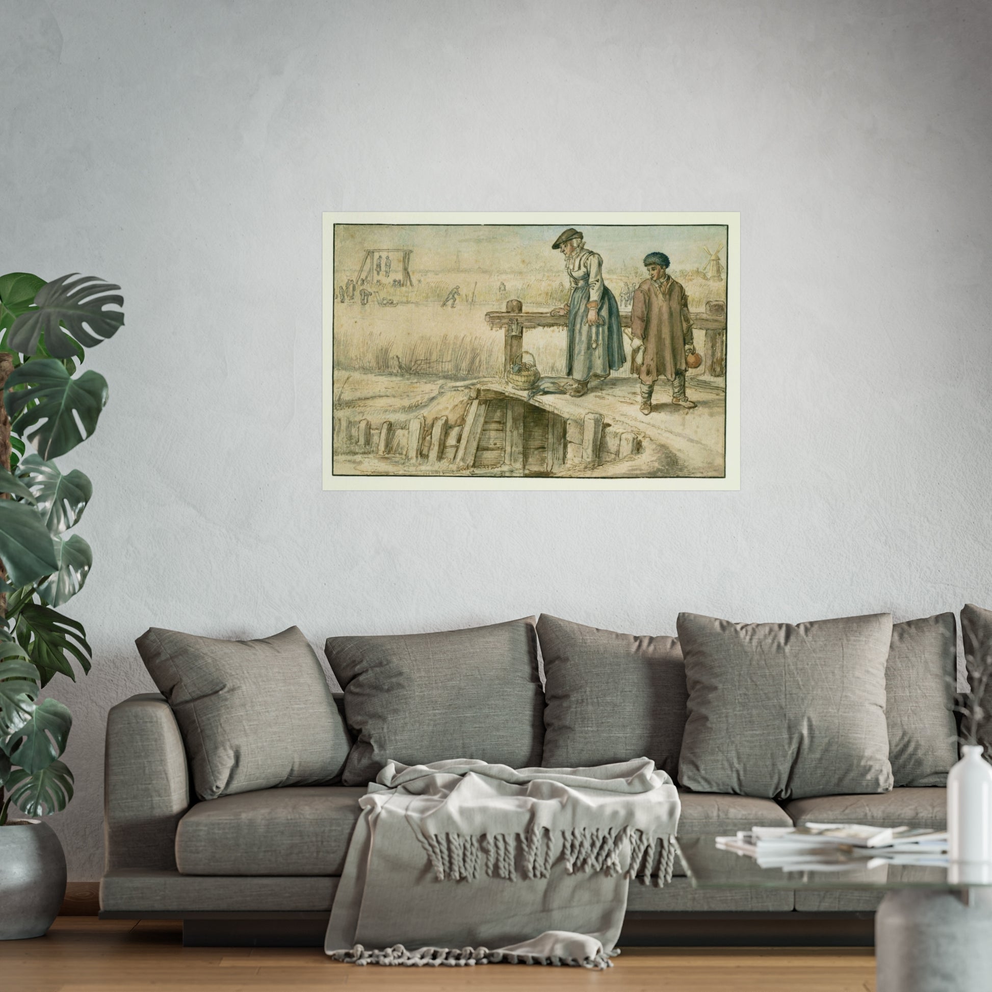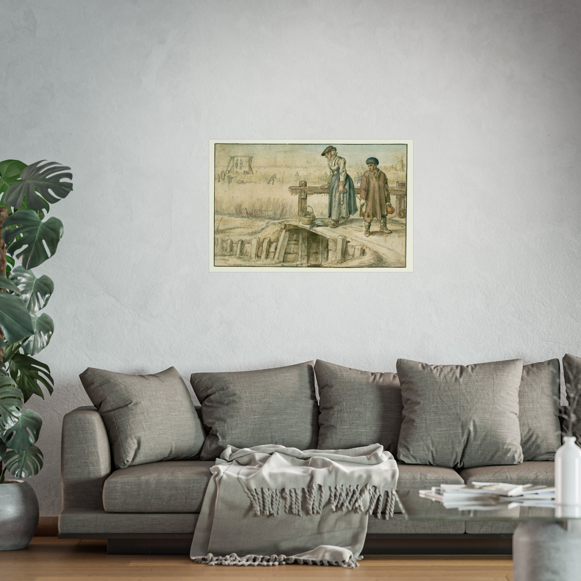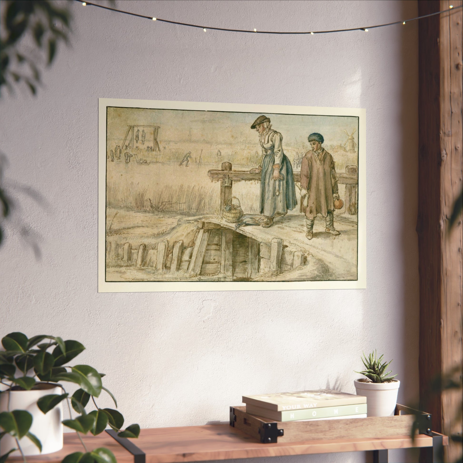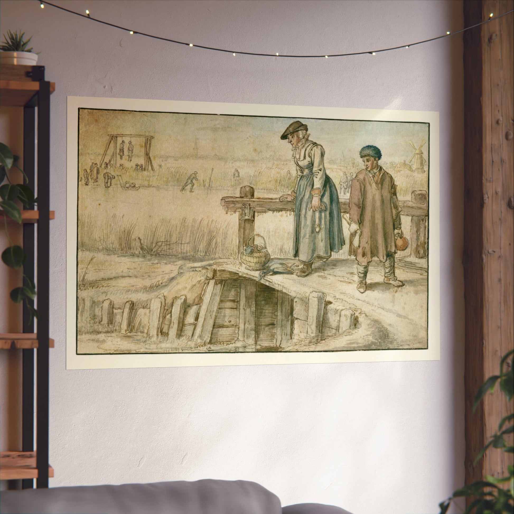 Immerse yourself in a captivating winter scene. On the right, a woman and a man share a quiet moment on a small bridge, their breath fogging up in the cold air. Further away, skaters glide gracefully across a frozen river, their laughter echoing in the crisp air. In the distance, an eerie sight of a gallows with two hanging figures adds a chilling contrast to the otherwise peaceful landscape.